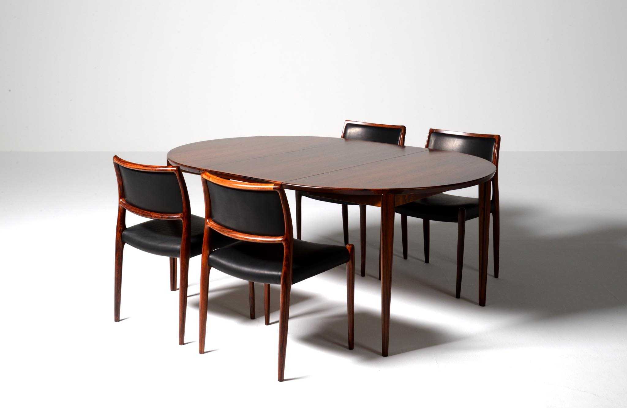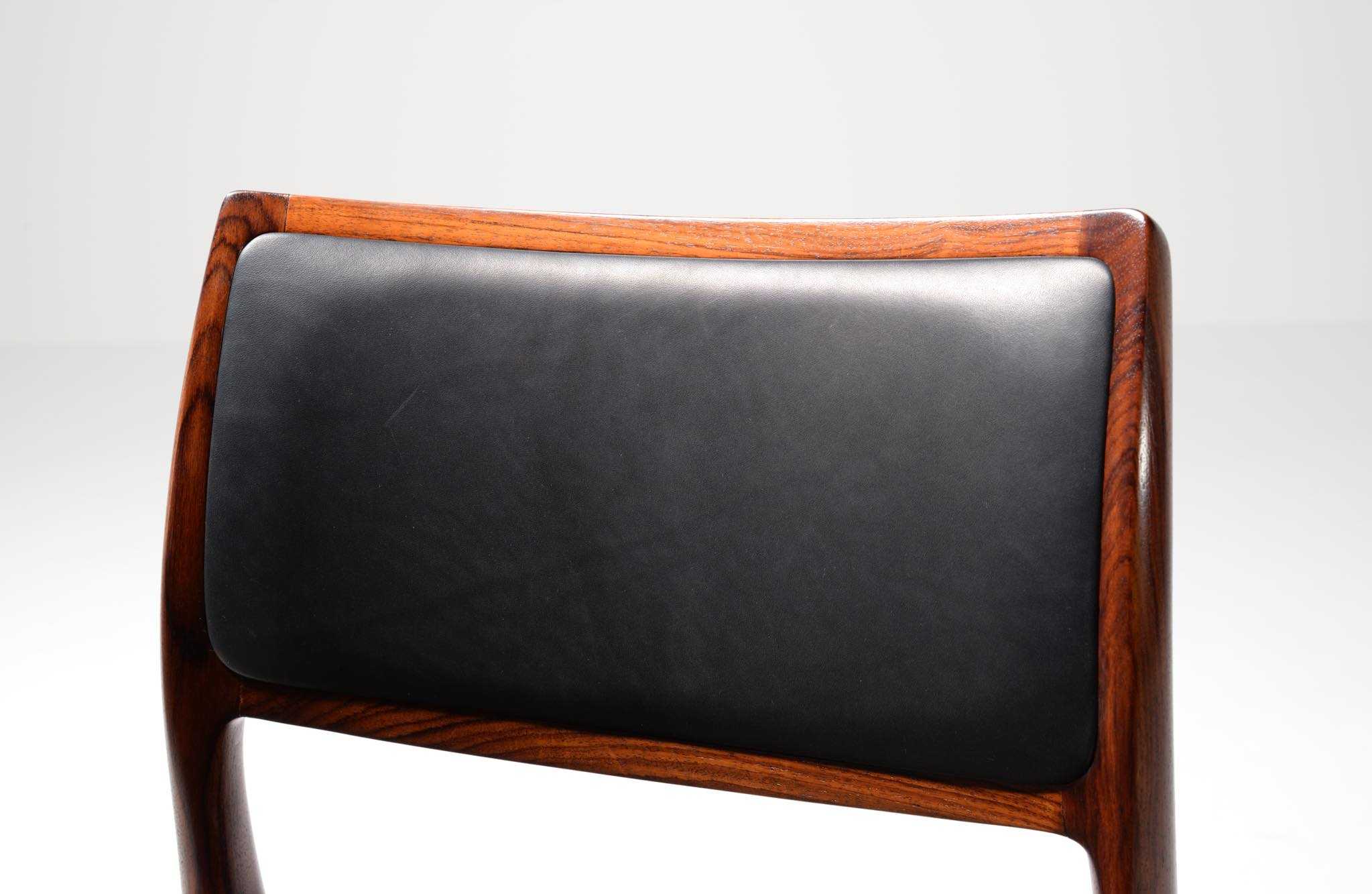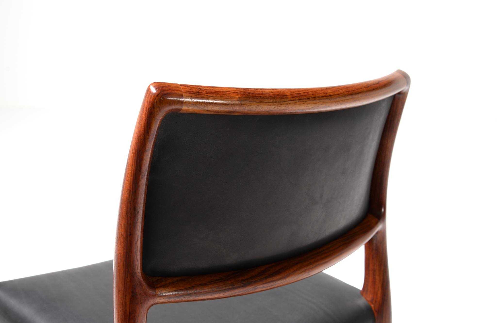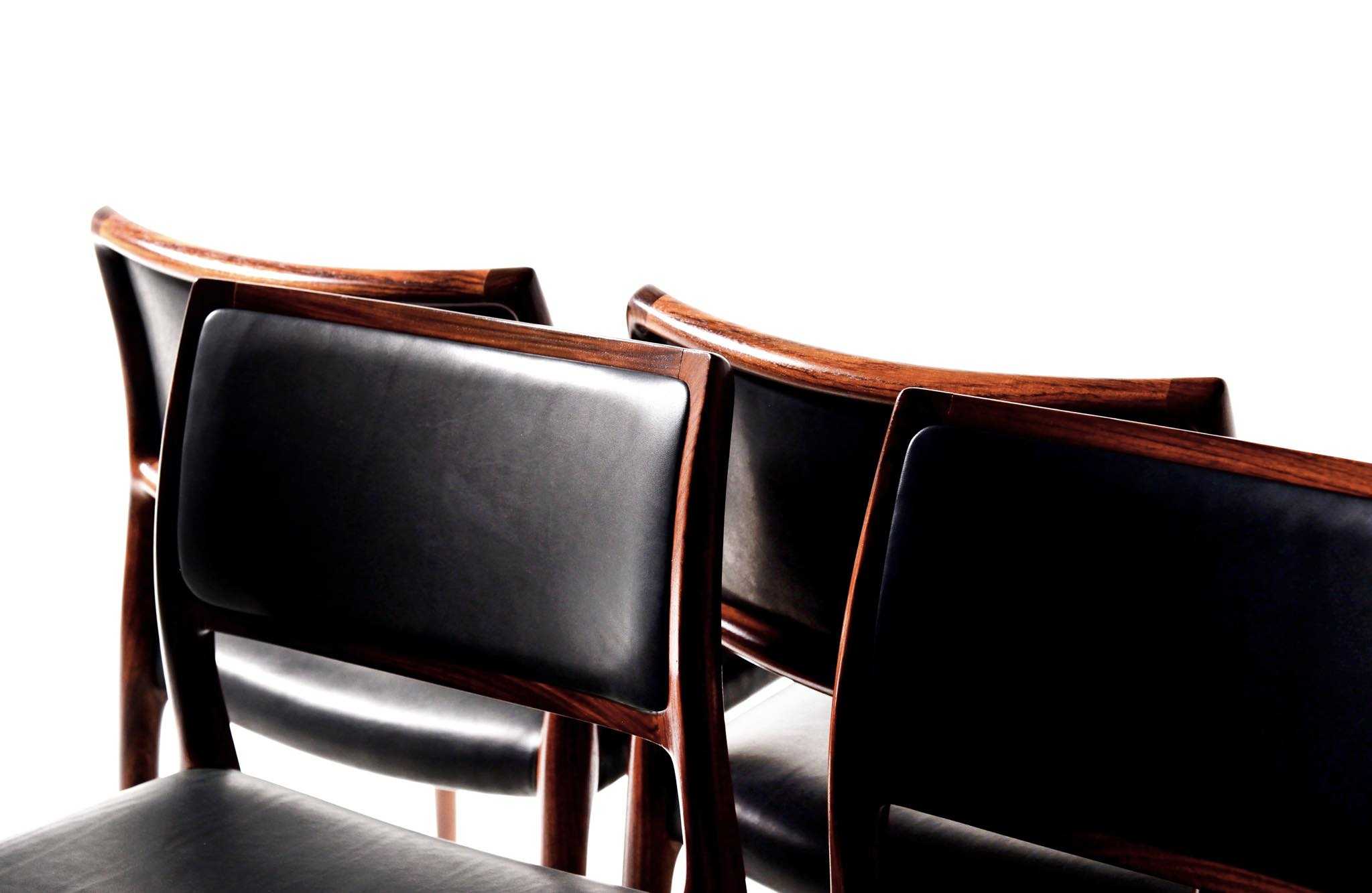 デンマークの家具工房、J.L. Møller/J.L.モラーによるダイニングチェア "Model 80" 4脚セットです。創業者のN.O. Moller/ニルス・オット・モラーによって1968年に発表されたモデルで、こちらはその頃に作られたものでしょう。背もたれにも張り込みのあるモデルで、背あたりが柔らかく、とても座りやすい設計です。木目文様に見応えのあるローズウッドが使われており、座面はデンマークの皮革メーカー”CAMO leather” の黒色皮革にて張り替えました。こちらは4脚セットでの販売となります。