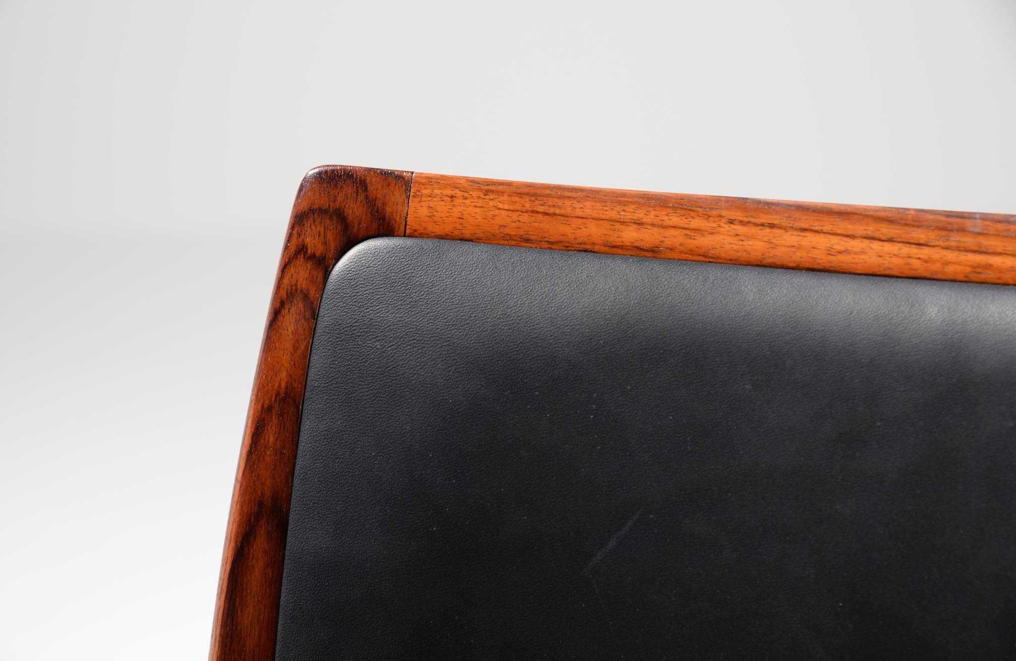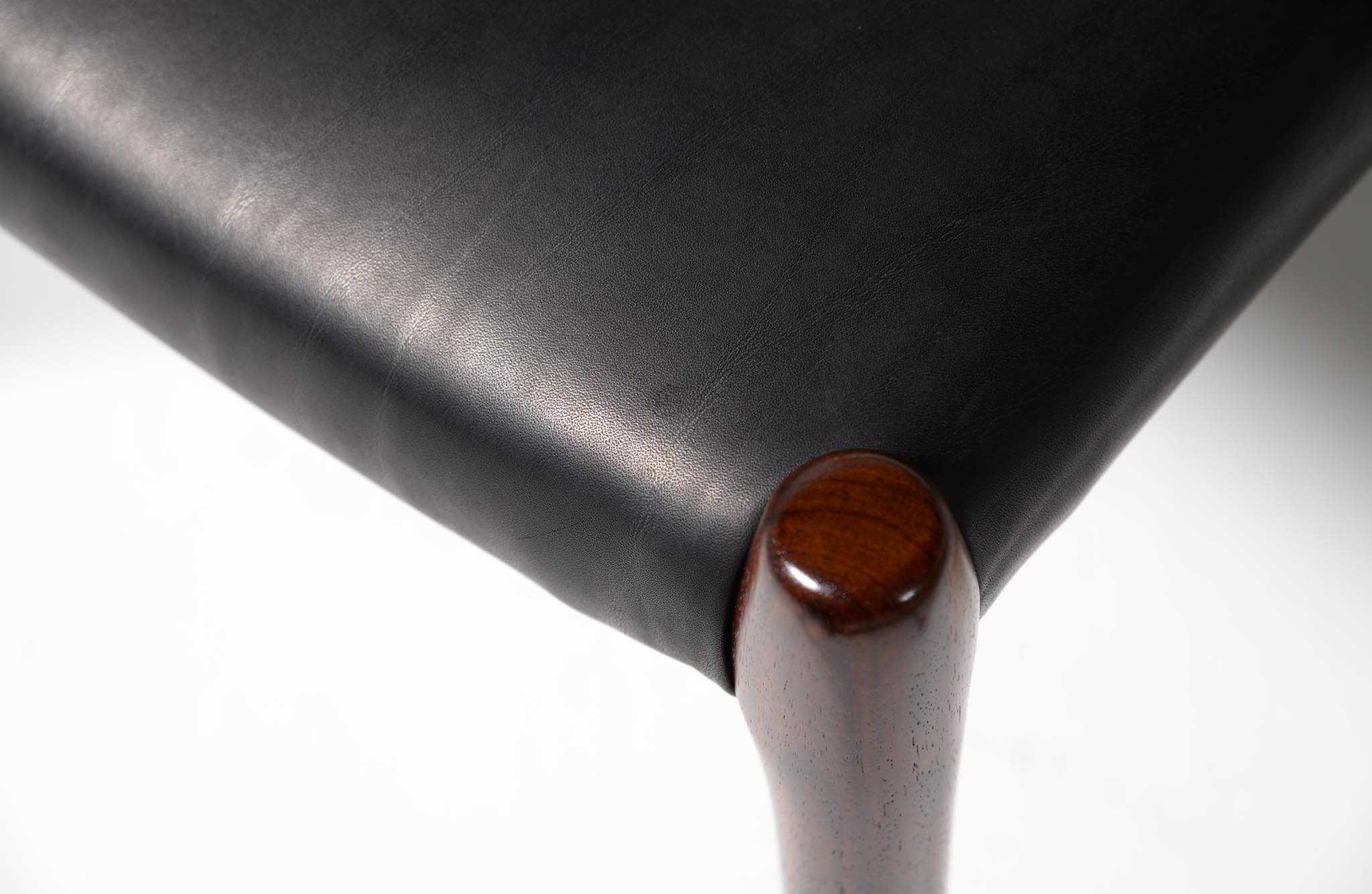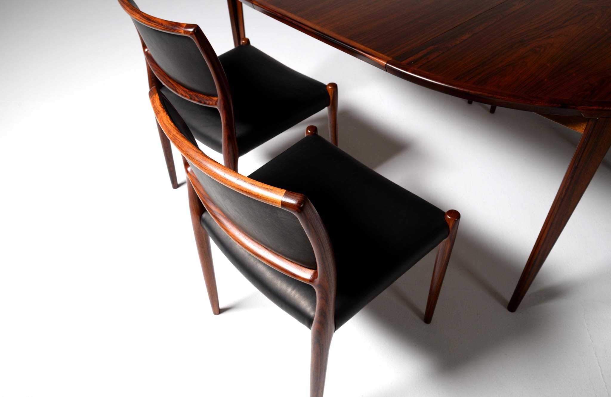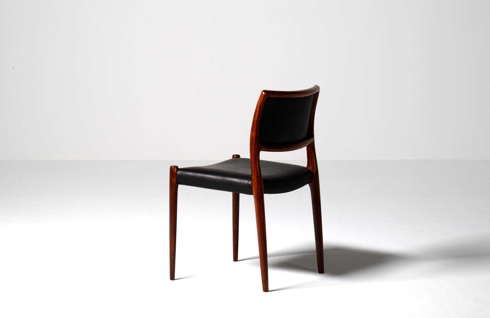 デンマークの家具工房、J.L. Møller/J.L.モラーによるダイニングチェア "Model 80" 4脚セットです。創業者のN.O. Moller/ニルス・オット・モラーによって1968年に発表されたモデルで、こちらはその頃に作られたものでしょう。背もたれにも張り込みのあるモデルで、背あたりが柔らかく、とても座りやすい設計です。木目文様に見応えのあるローズウッドが使われており、座面はデンマークの皮革メーカー”CAMO leather” の黒色皮革にて張り替えました。こちらは4脚セットでの販売となります。