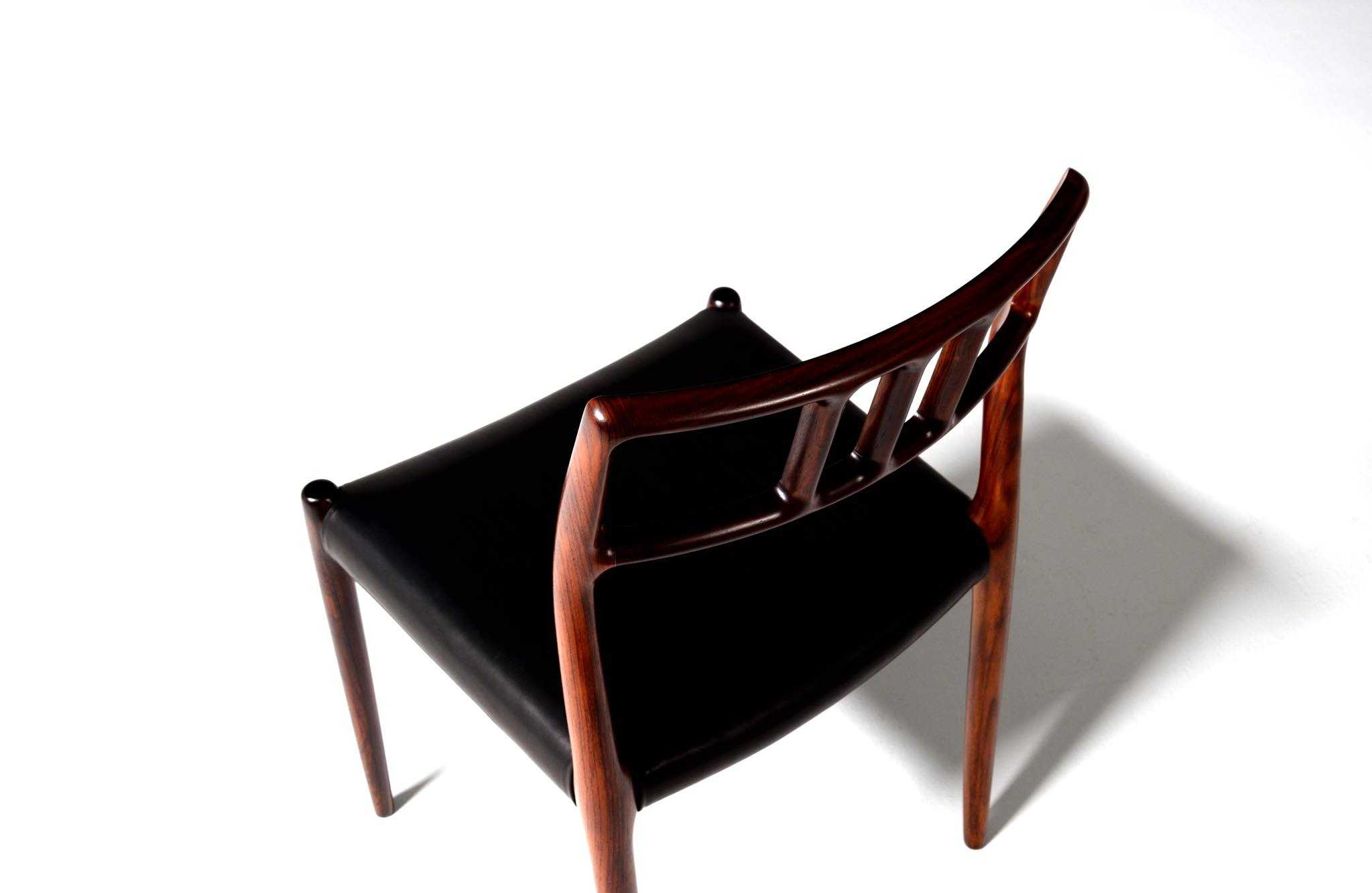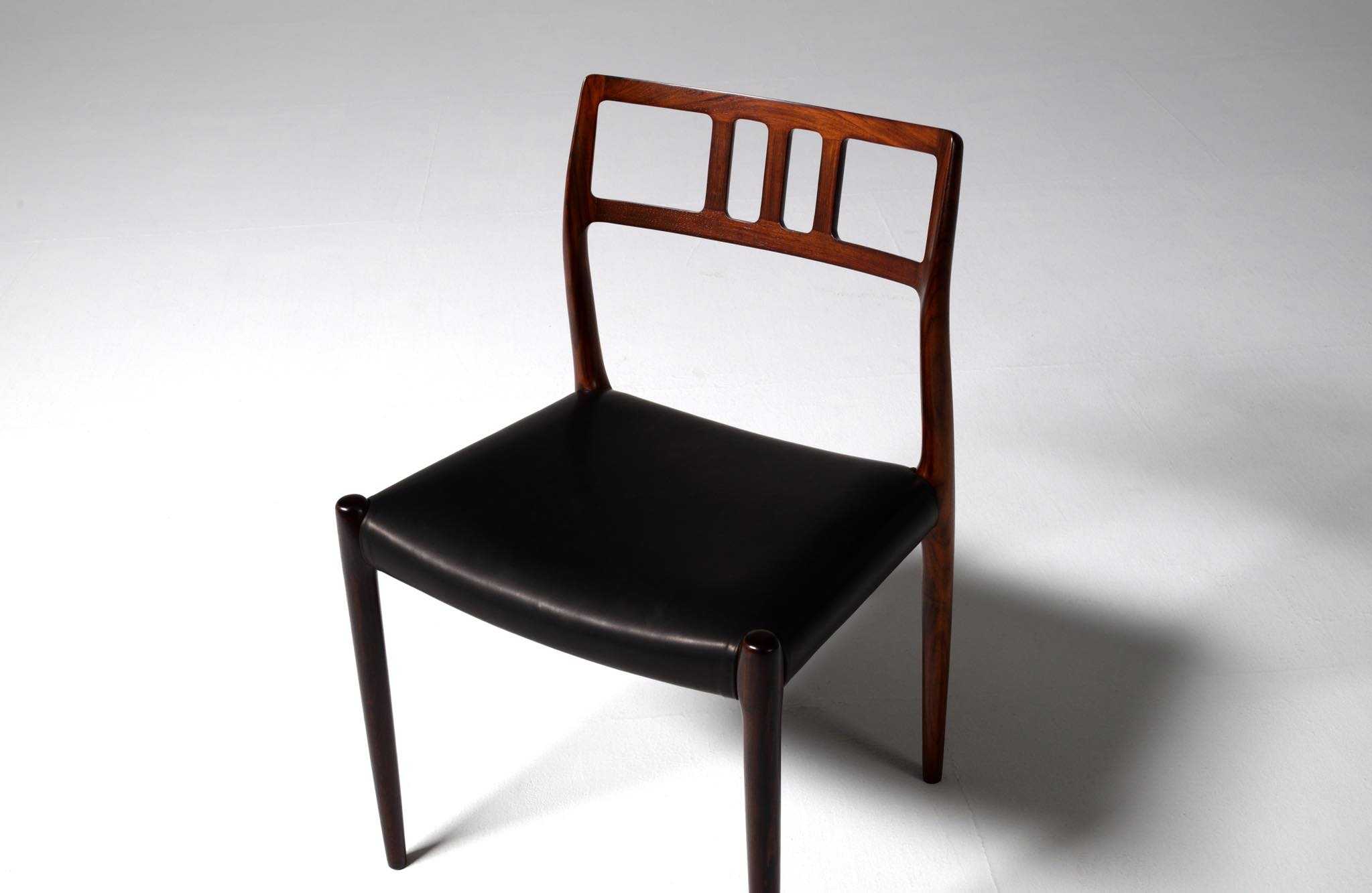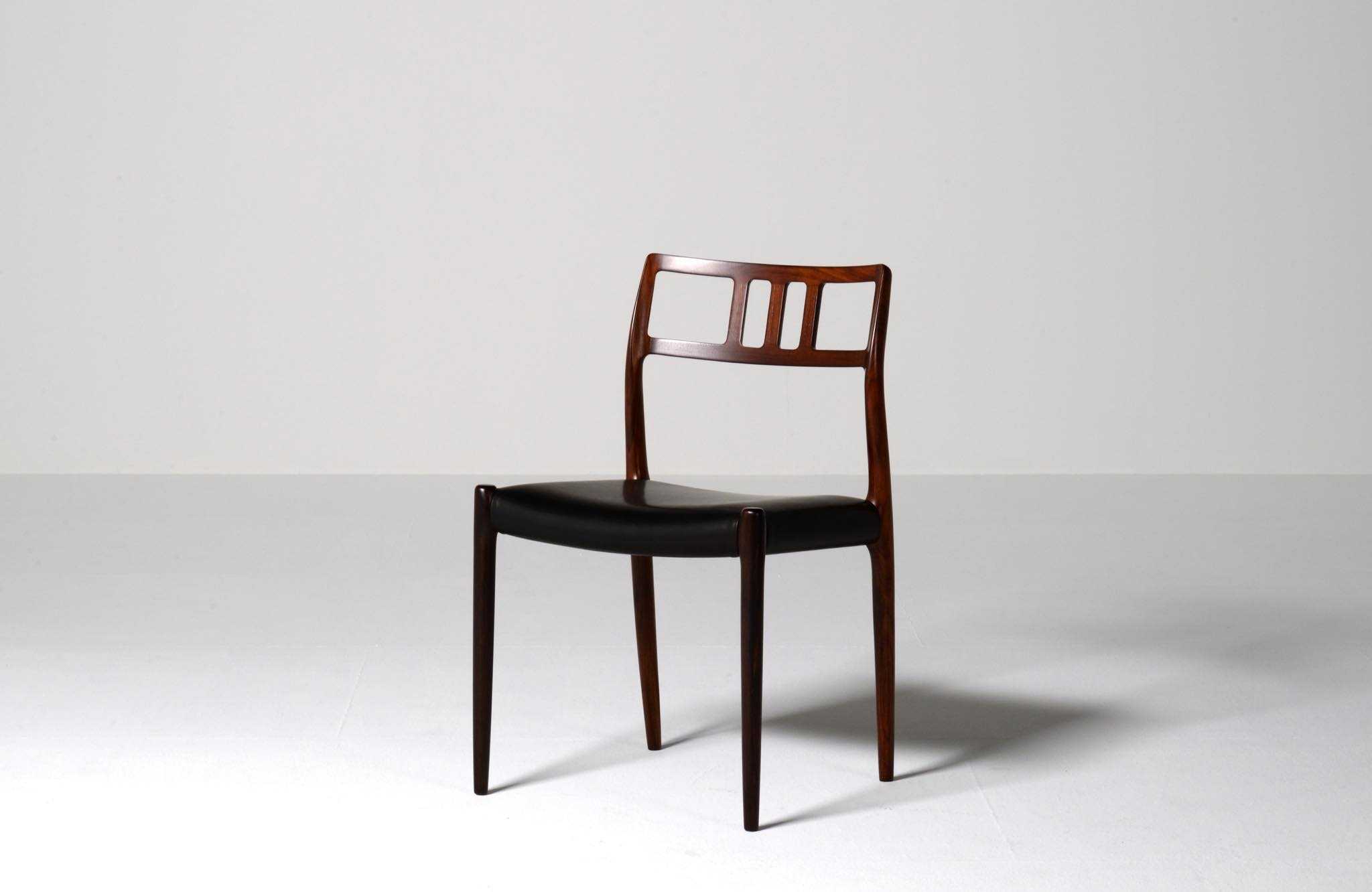 デンマークの家具工房、J.L. Møller/J.L.モラーによるダイニングチェア "Model 79" です。創業者のN.O. Moller/ニルス・オット・モラーによってデザインされたモデルで、こちらは1960年代頃に作られたヴィンテージ品となります。ブラジル原産と思しき良質なローズウッド材が用いられています。天然木が用いられていたこの当時の作品は、木材そのものに強度があったため、現行モデルに比べ細く作られているようです。座面はデンマークの皮革メーカー”CAMO leather” の黒色皮革にて張り替えました。こちらは単体での販売となります。