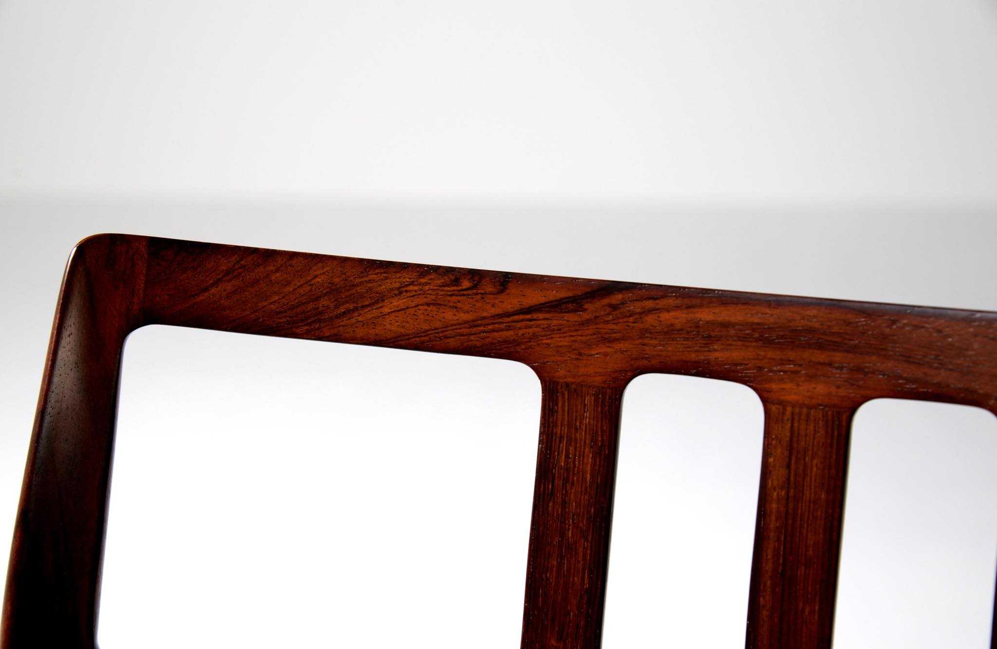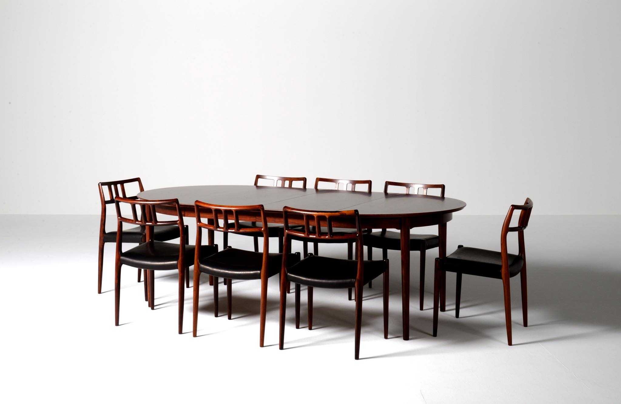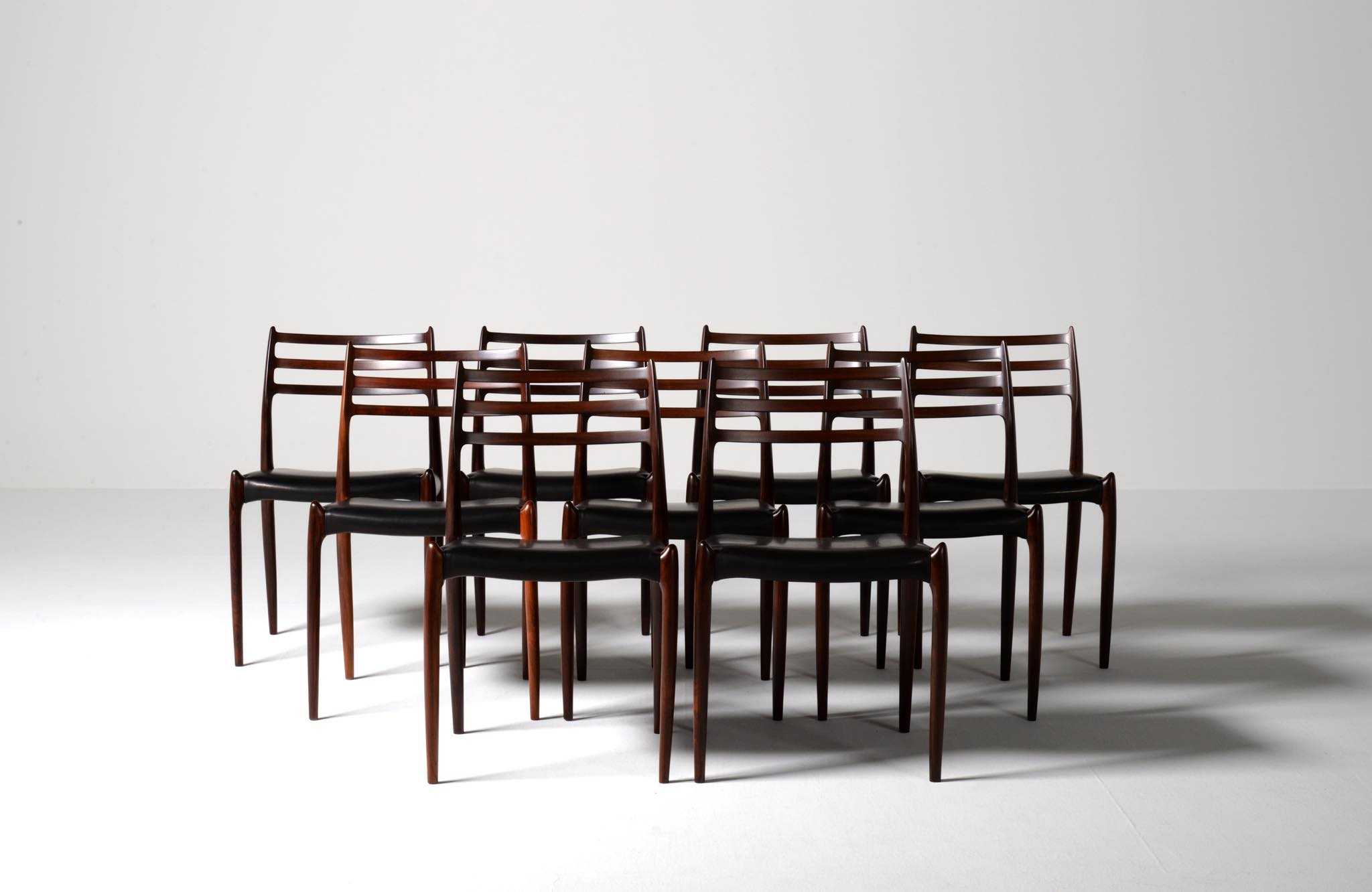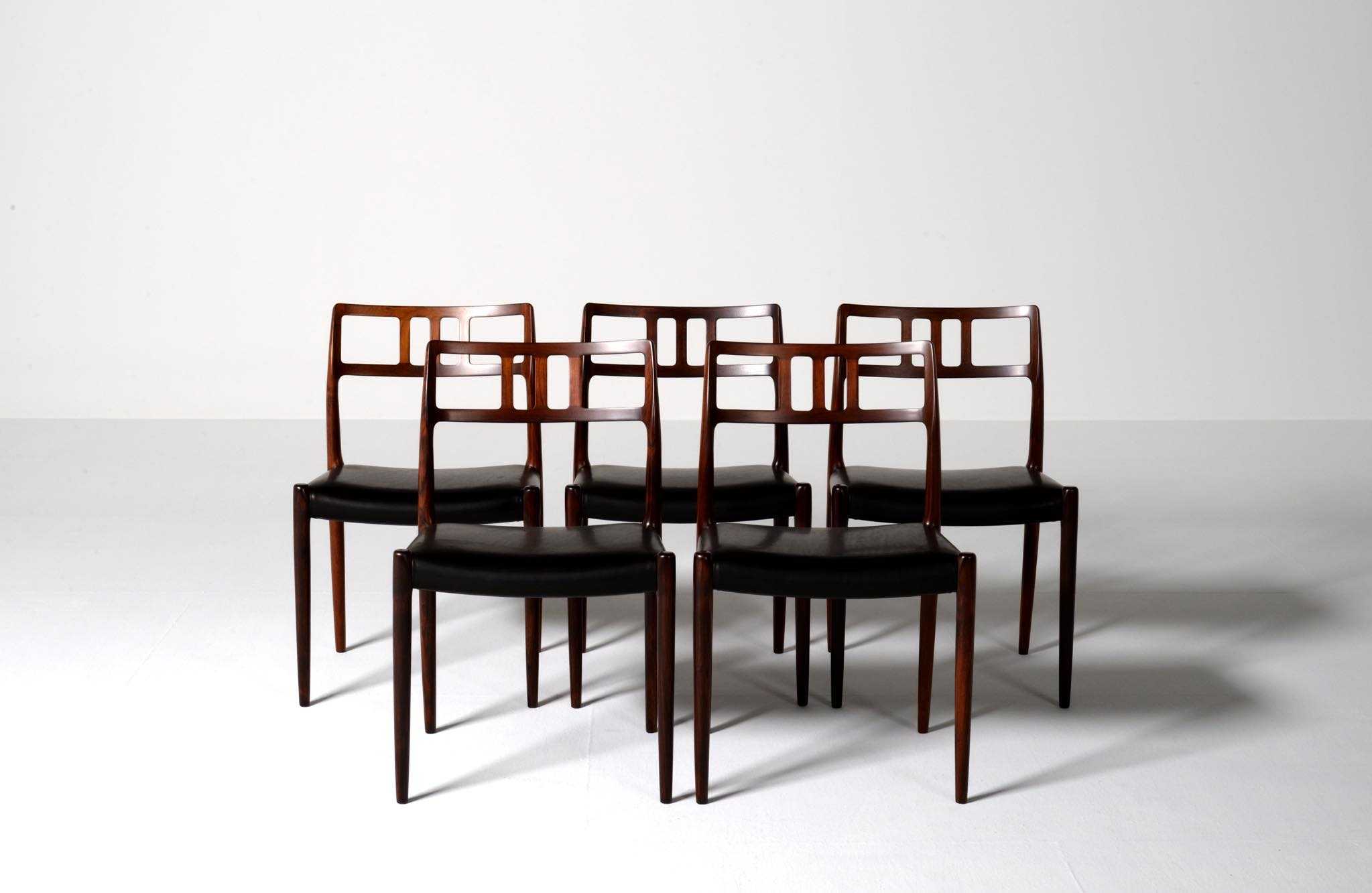 デンマークの家具工房、J.L. Møller/J.L.モラーによるダイニングチェア "Model 79" です。創業者のN.O. Moller/ニルス・オット・モラーによってデザインされたモデルで、こちらは1960年代頃に作られたヴィンテージ品となります。ブラジル原産と思しき良質なローズウッド材が用いられています。天然木が用いられていたこの当時の作品は、木材そのものに強度があったため、現行モデルに比べ細く作られているようです。座面はデンマークの皮革メーカー”CAMO leather” の黒色皮革にて張り替えました。こちらは単体での販売となります。