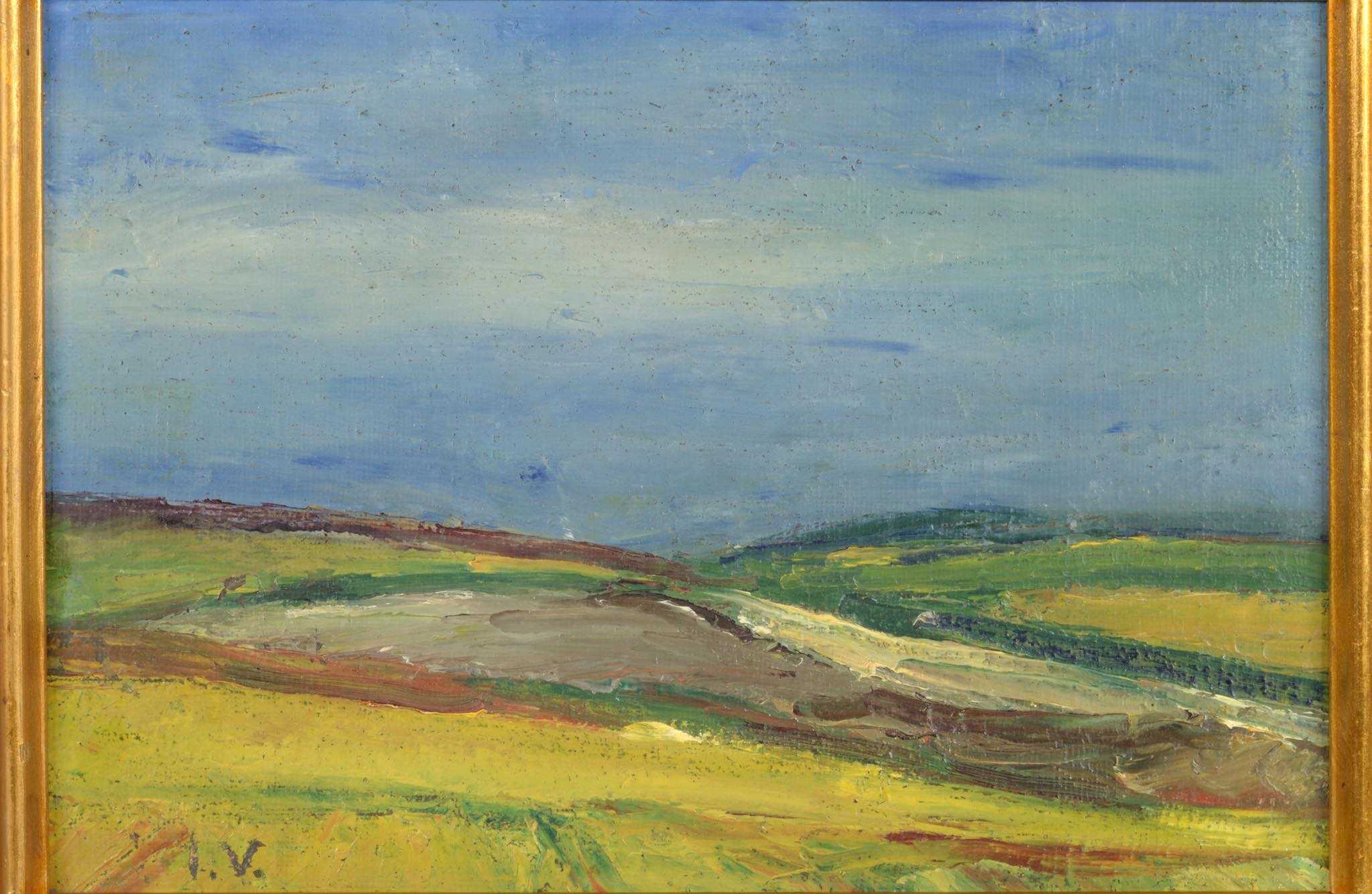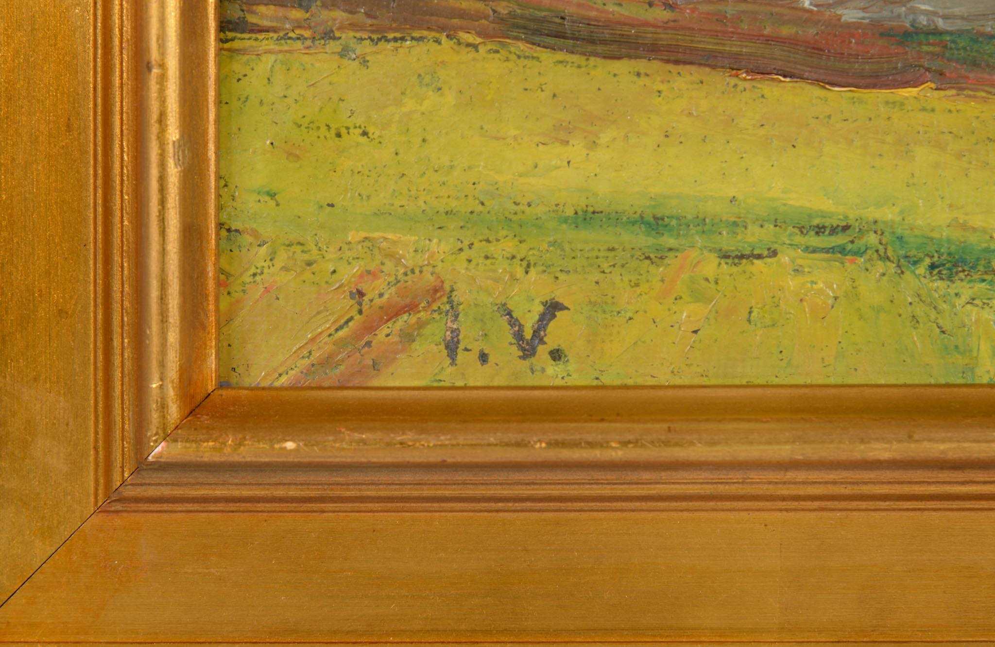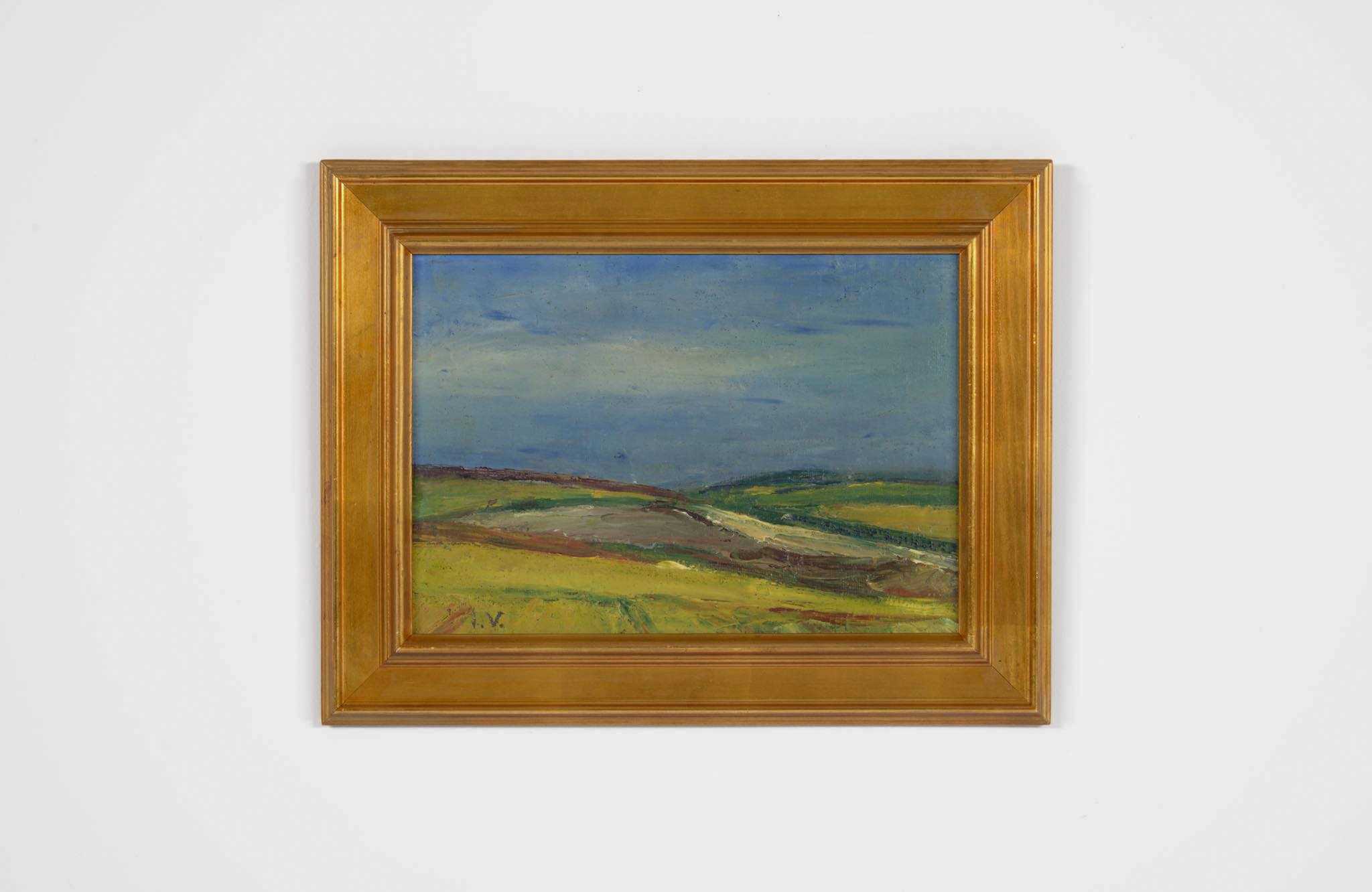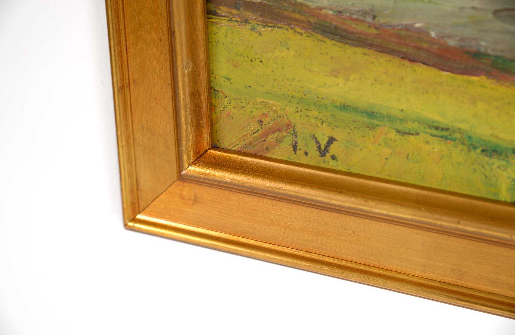 20世紀中葉のデンマークで活躍した画家、Jeppe Vontillius/イェッペ・ヴォンティリウスによる油彩風景画作品です。キャンバスをボードに貼り付けて描かれており、筆致からみて比較的古い時代に描かれたようです。春の訪れを感じさせる田園風景を流れるような筆使いで描いています。氏が好んで描いていたシェラン島北部の丘陵地域がモチーフと思われます。金箔のフレームはオリジナルのようで、背面の押さえ板は新たに作成しました。コンディションは良好です。
