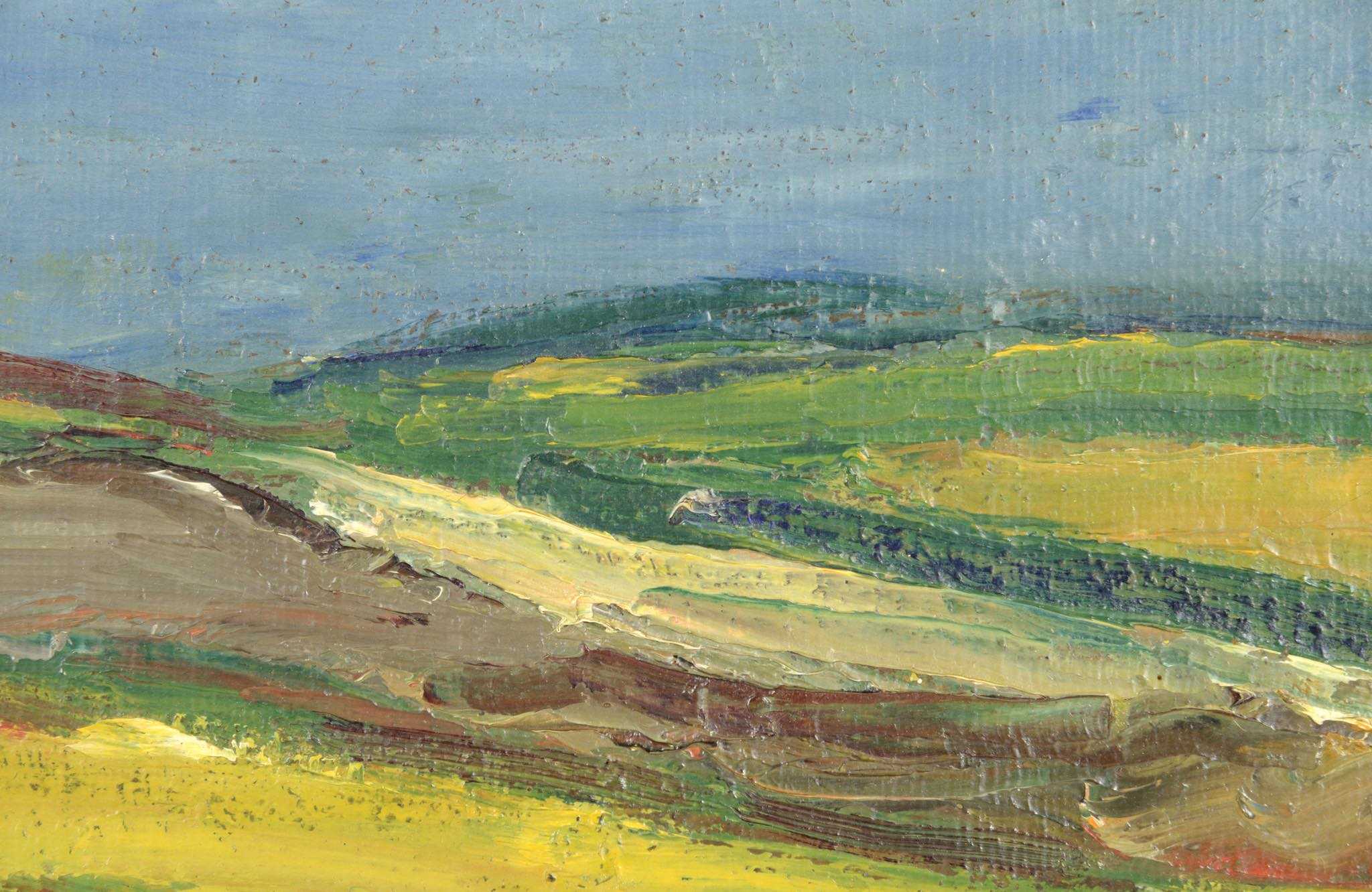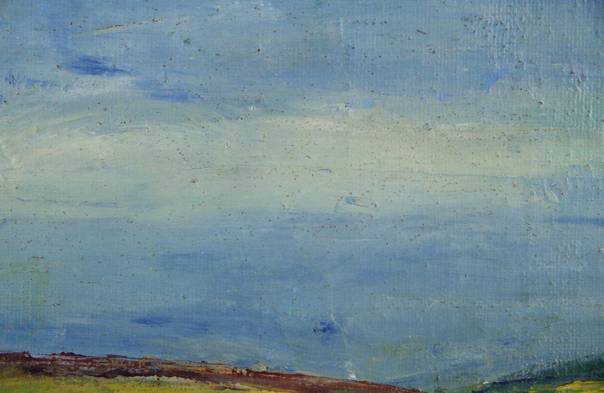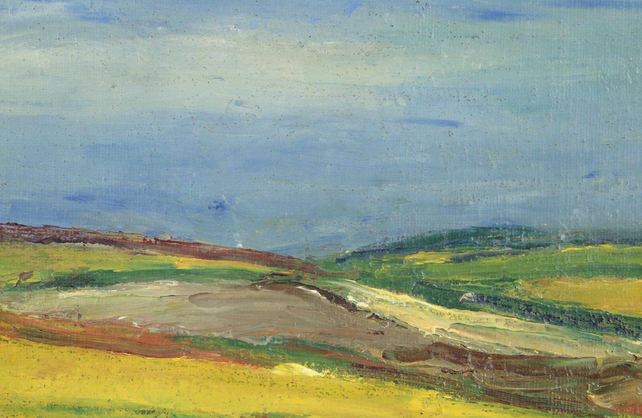 20世紀中葉のデンマークで活躍した画家、Jeppe Vontillius/イェッペ・ヴォンティリウスによる油彩風景画作品です。キャンバスをボードに貼り付けて描かれており、筆致からみて比較的古い時代に描かれたようです。春の訪れを感じさせる田園風景を流れるような筆使いで描いています。氏が好んで描いていたシェラン島北部の丘陵地域がモチーフと思われます。金箔のフレームはオリジナルのようで、背面の押さえ板は新たに作成しました。コンディションは良好です。
