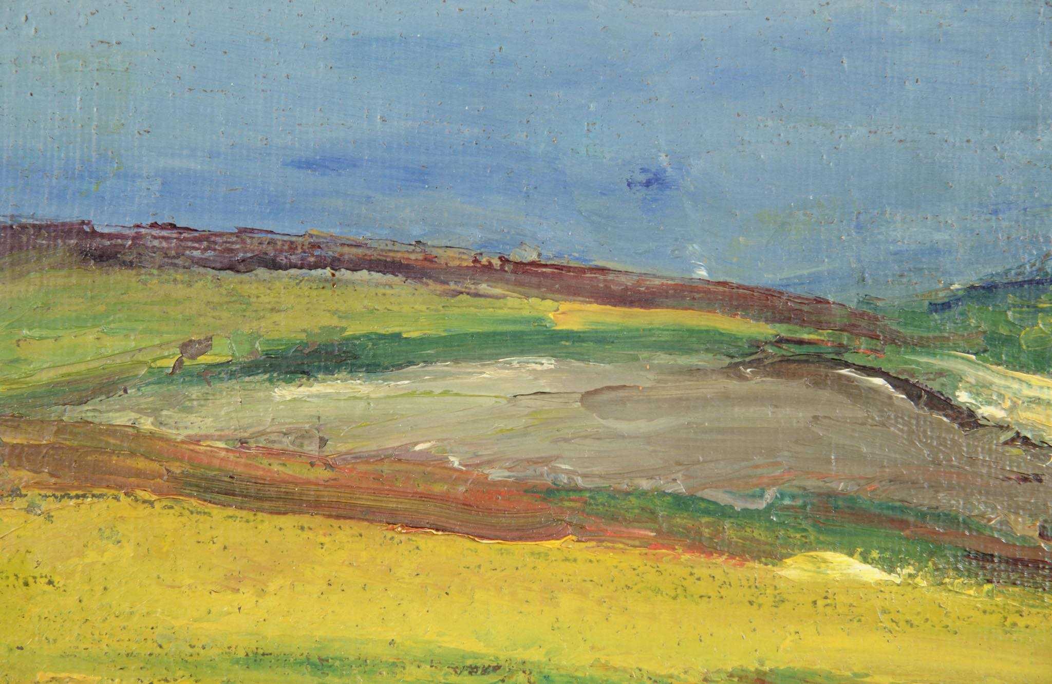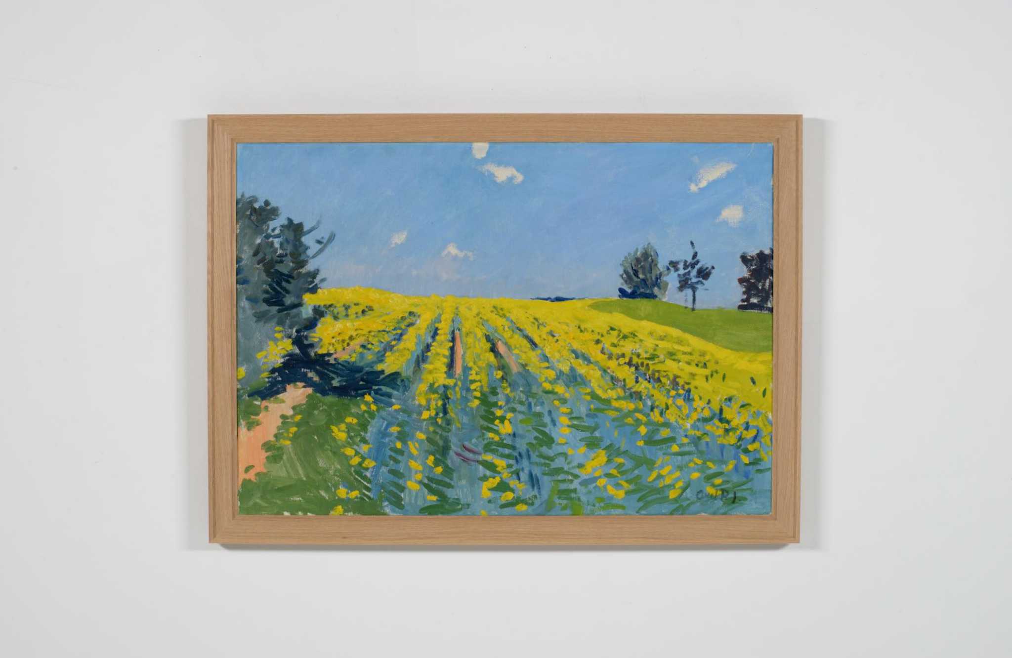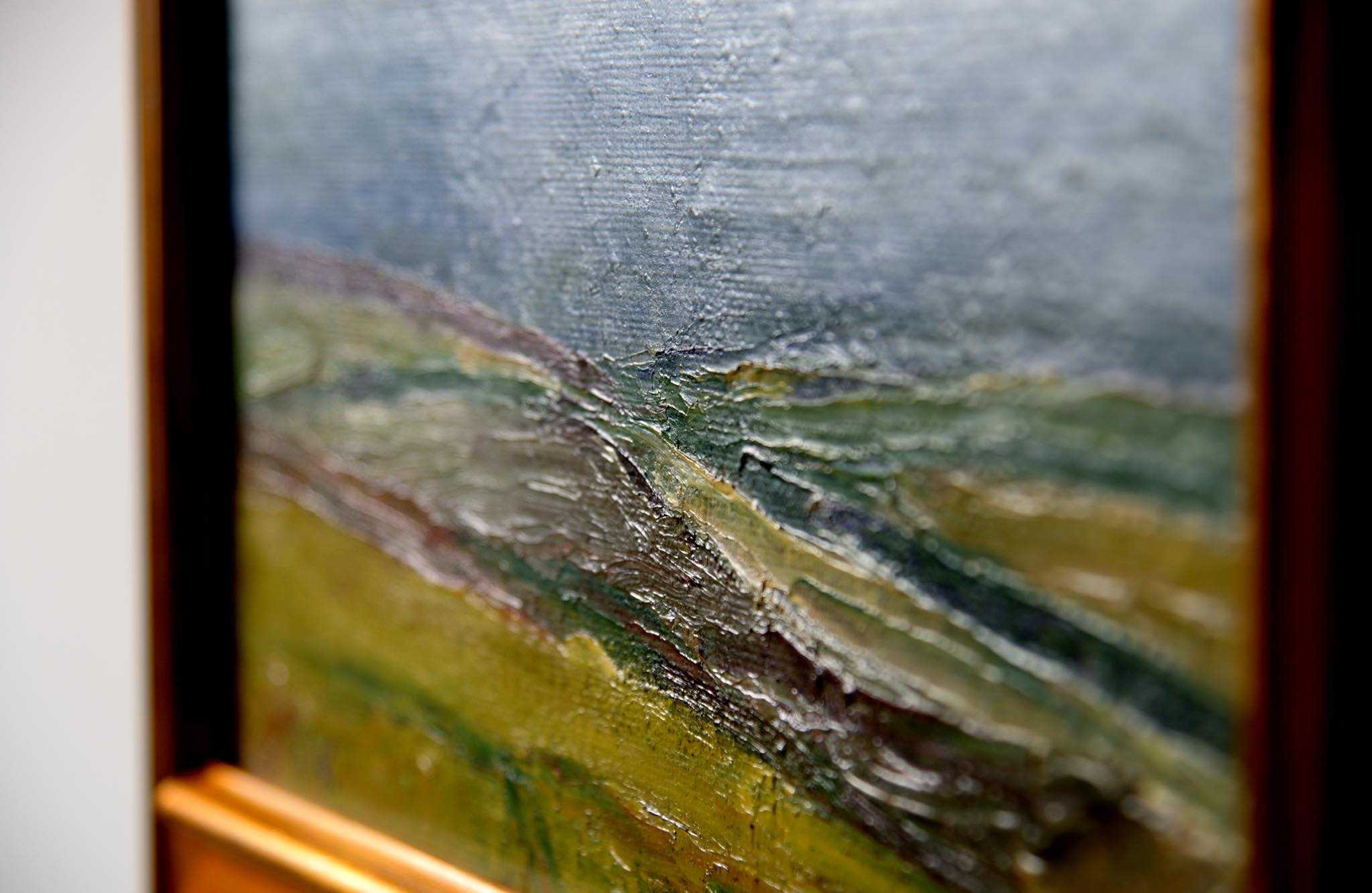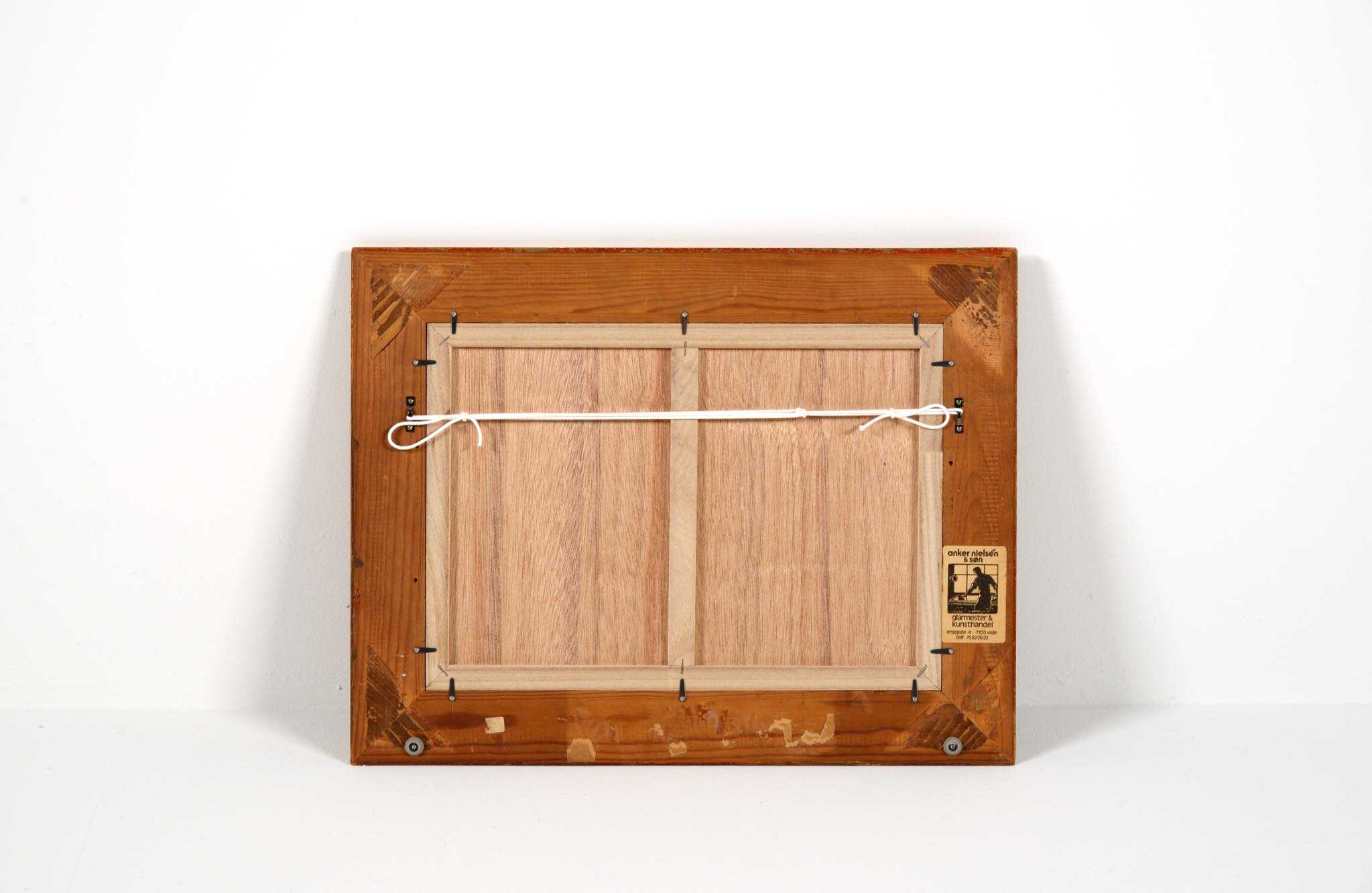 20世紀中葉のデンマークで活躍した画家、Jeppe Vontillius/イェッペ・ヴォンティリウスによる油彩風景画作品です。キャンバスをボードに貼り付けて描かれており、筆致からみて比較的古い時代に描かれたようです。春の訪れを感じさせる田園風景を流れるような筆使いで描いています。氏が好んで描いていたシェラン島北部の丘陵地域がモチーフと思われます。金箔のフレームはオリジナルのようで、背面の押さえ板は新たに作成しました。コンディションは良好です。