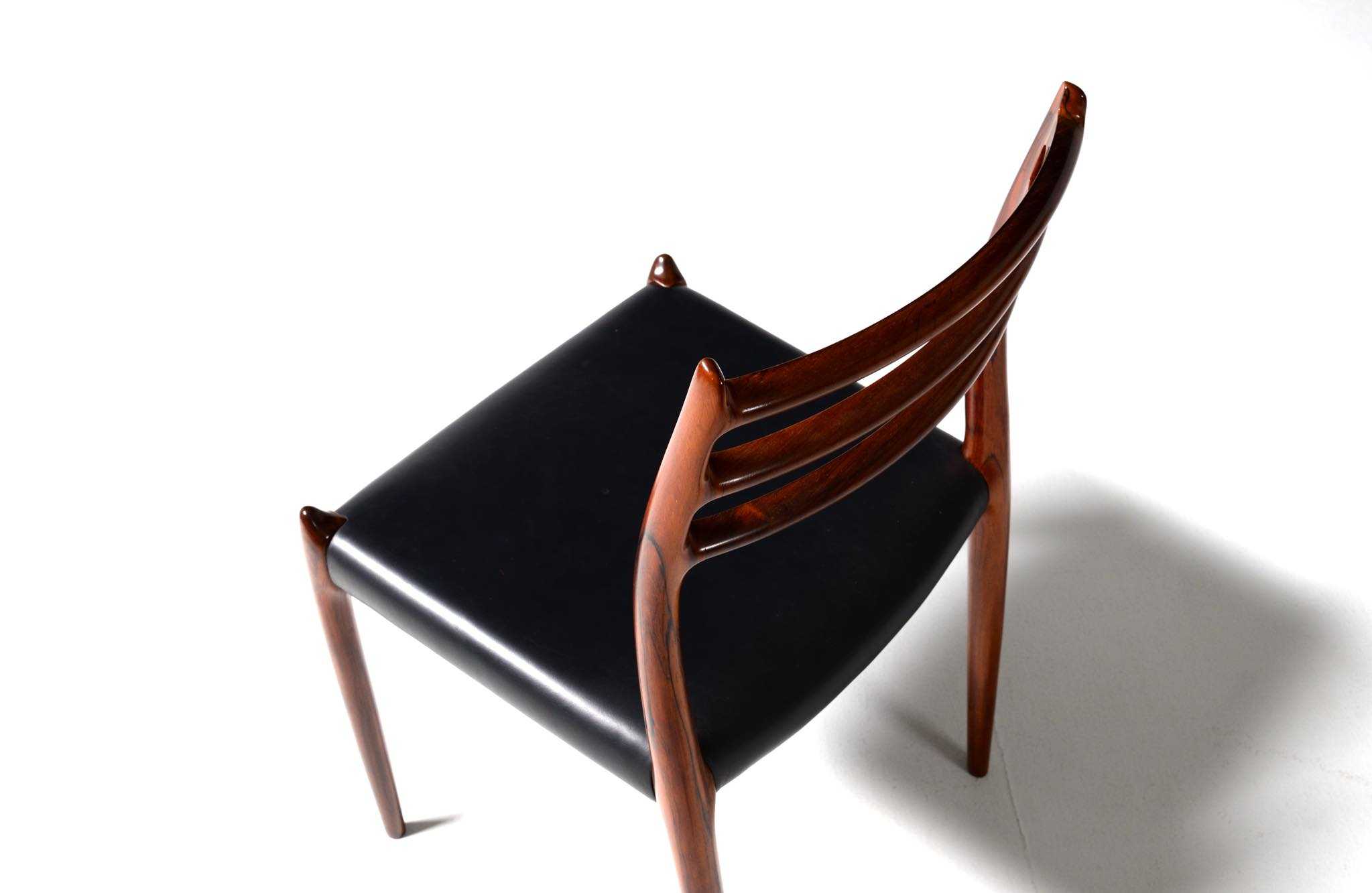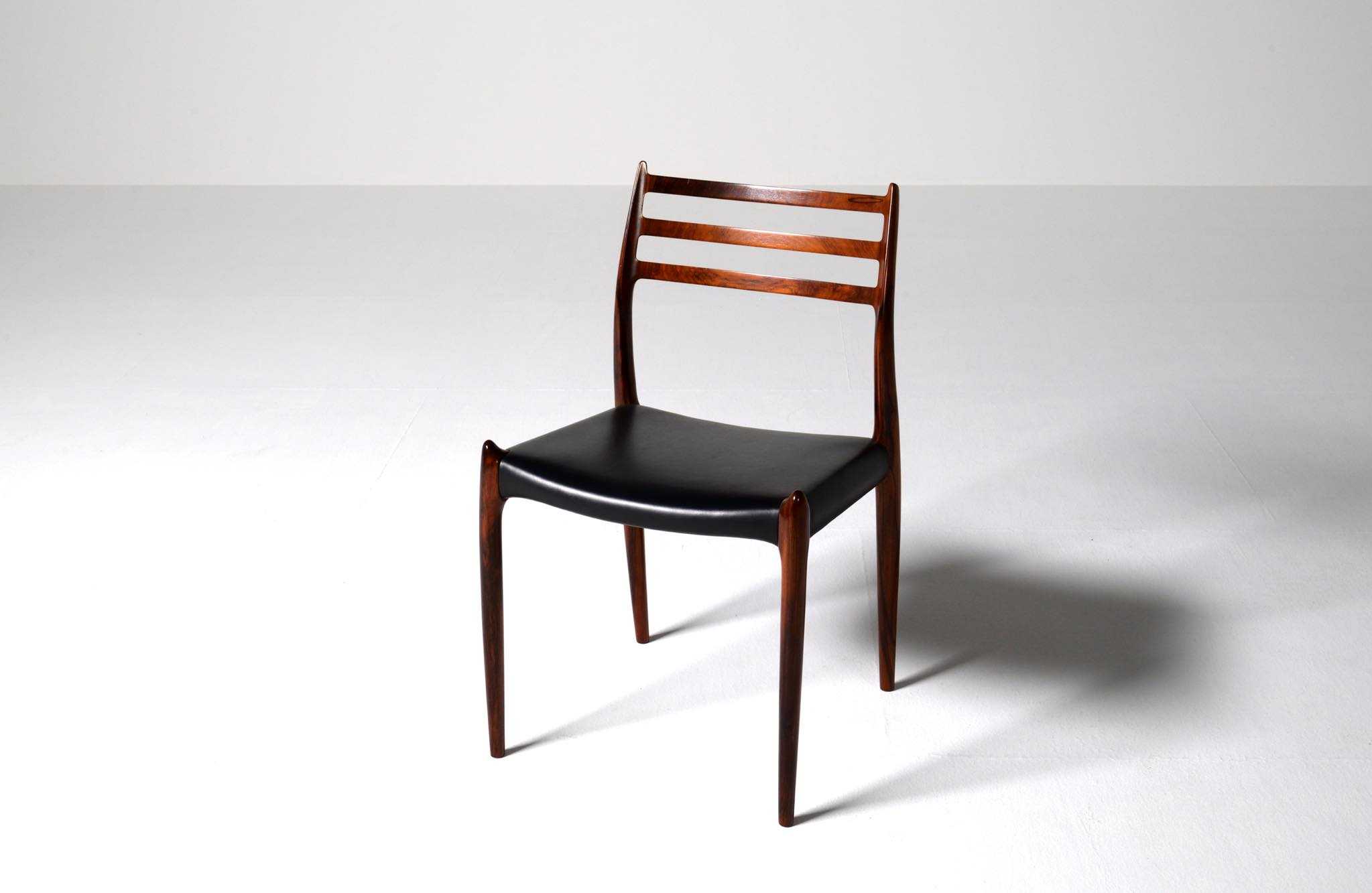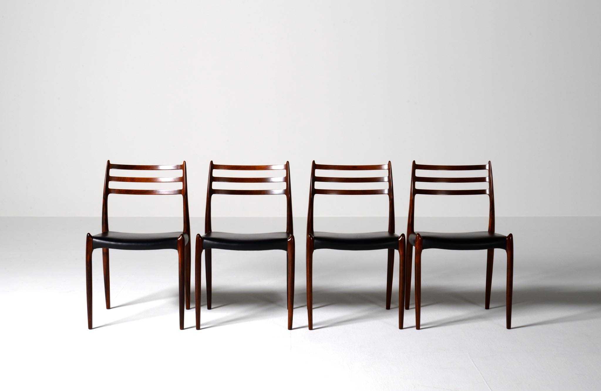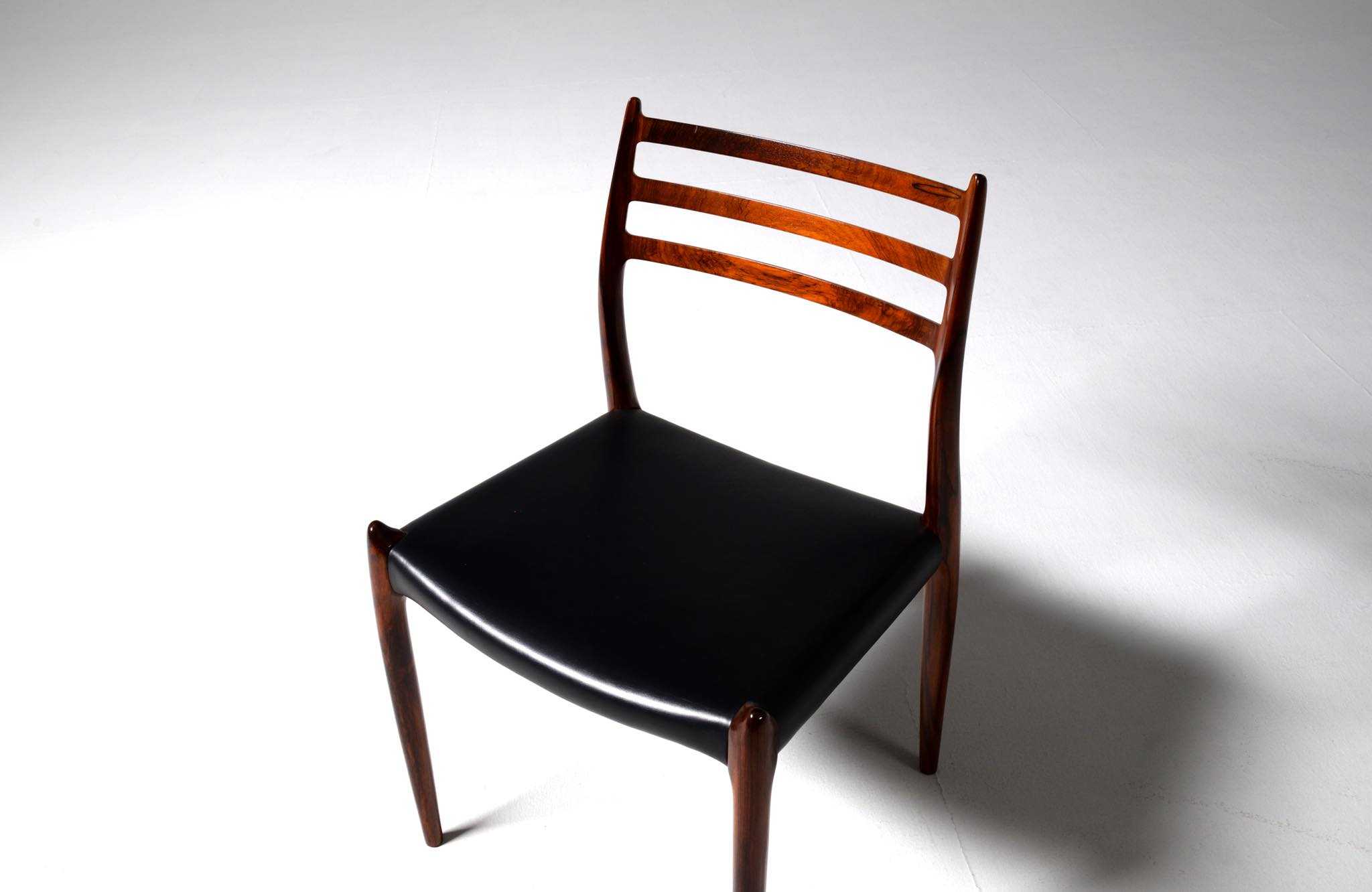 デンマークの家具工房、J.L.Møller/J.L.モラーによるダイニングチェア "model 78" 4脚セットです。創業者のN.O. Moller/ニルス・オット・モラーによってデザインされ、三本笠木が人気を博したモデルです。1960年代頃に作られたものでしょう。良質なローズウッドが用いられており、綺麗な木目文様が現れています。天然木が用いられていたこの当時の作品は、木材そのものに強度があったため、現行モデルに比べ細く作られているようです。座面はモラー社によって近年張り替えられているようです。コンディションは良好です。こちらは4脚セットでの販売です。