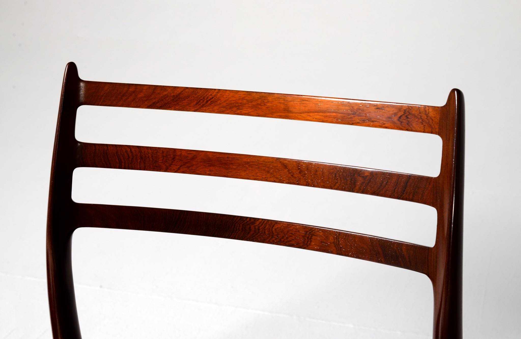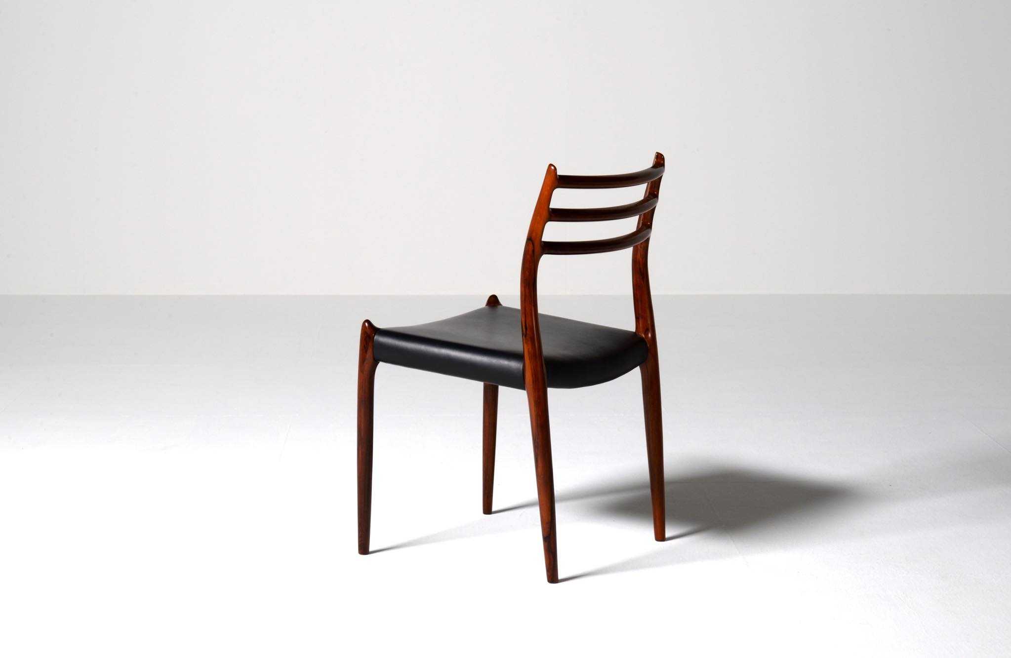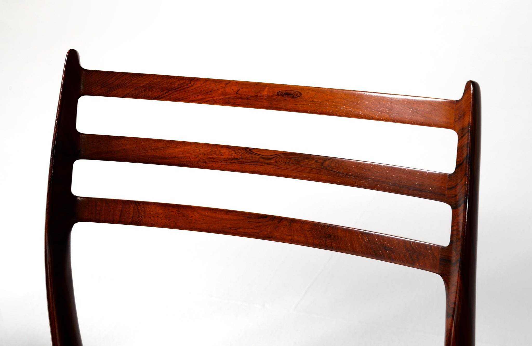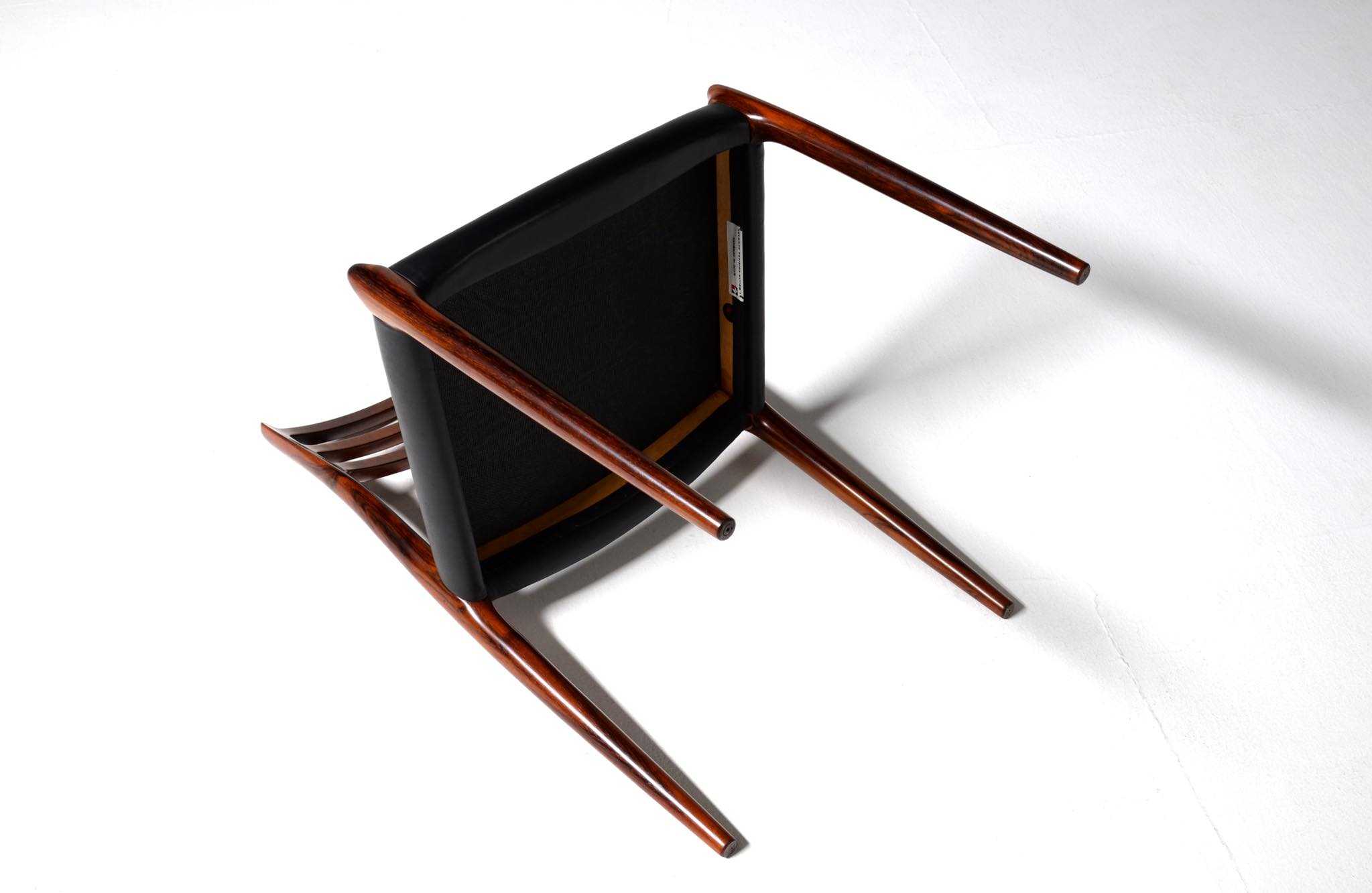 デンマークの家具工房、J.L.Møller/J.L.モラーによるダイニングチェア "model 78" 4脚セットです。創業者のN.O. Moller/ニルス・オット・モラーによってデザインされ、三本笠木が人気を博したモデルです。1960年代頃に作られたものでしょう。良質なローズウッドが用いられており、綺麗な木目文様が現れています。天然木が用いられていたこの当時の作品は、木材そのものに強度があったため、現行モデルに比べ細く作られているようです。座面はモラー社によって近年張り替えられているようです。コンディションは良好です。こちらは4脚セットでの販売です。