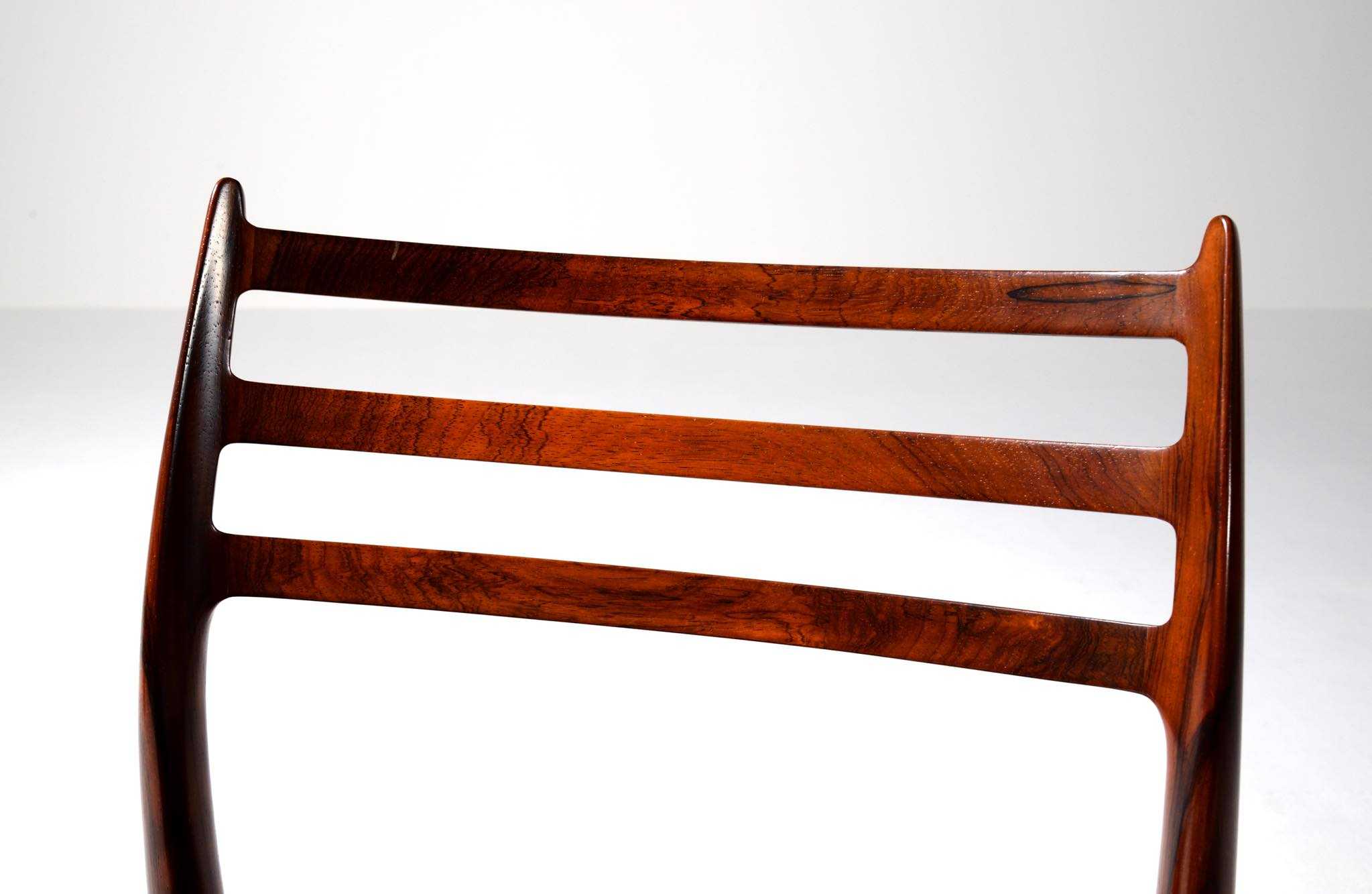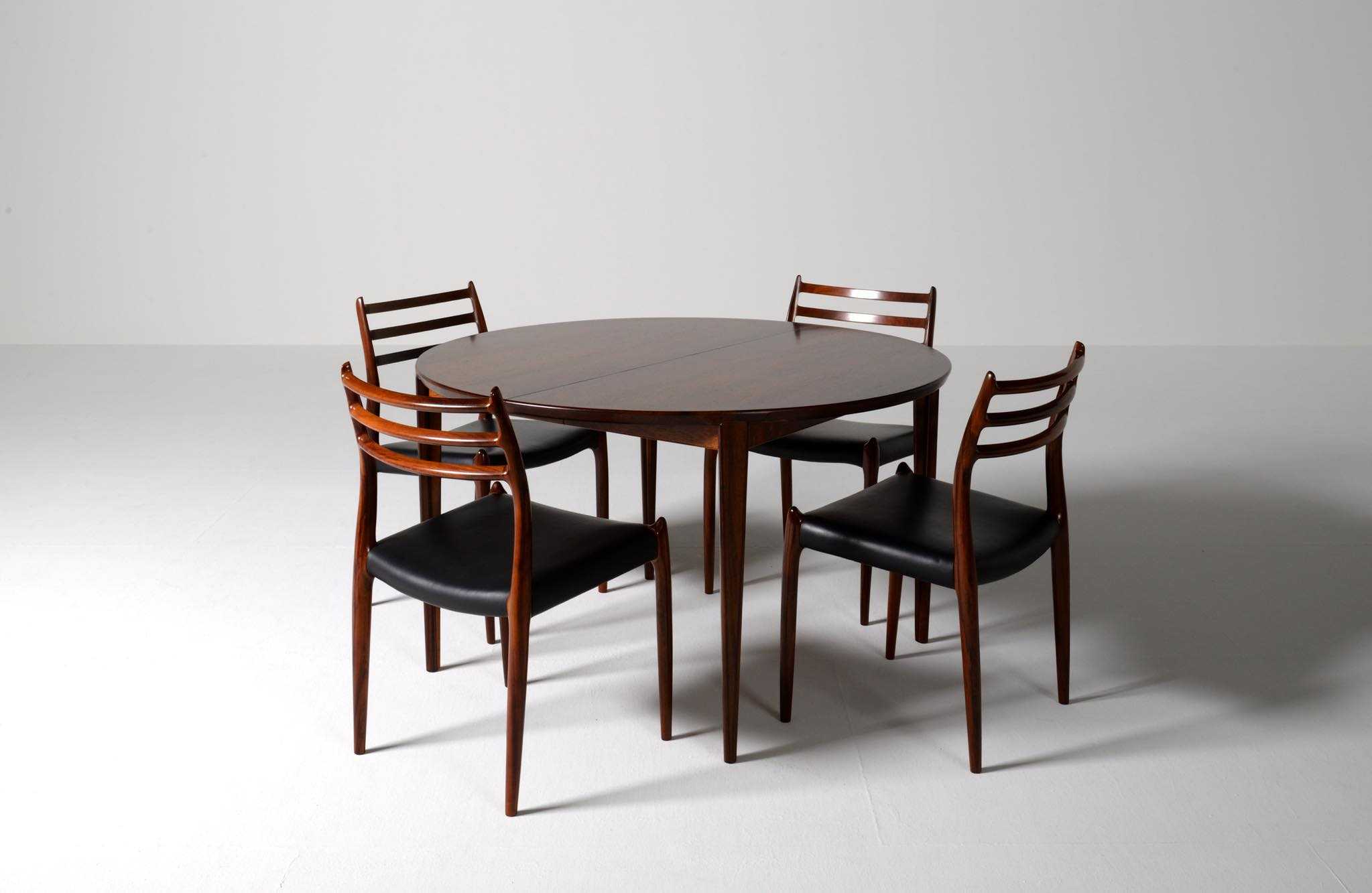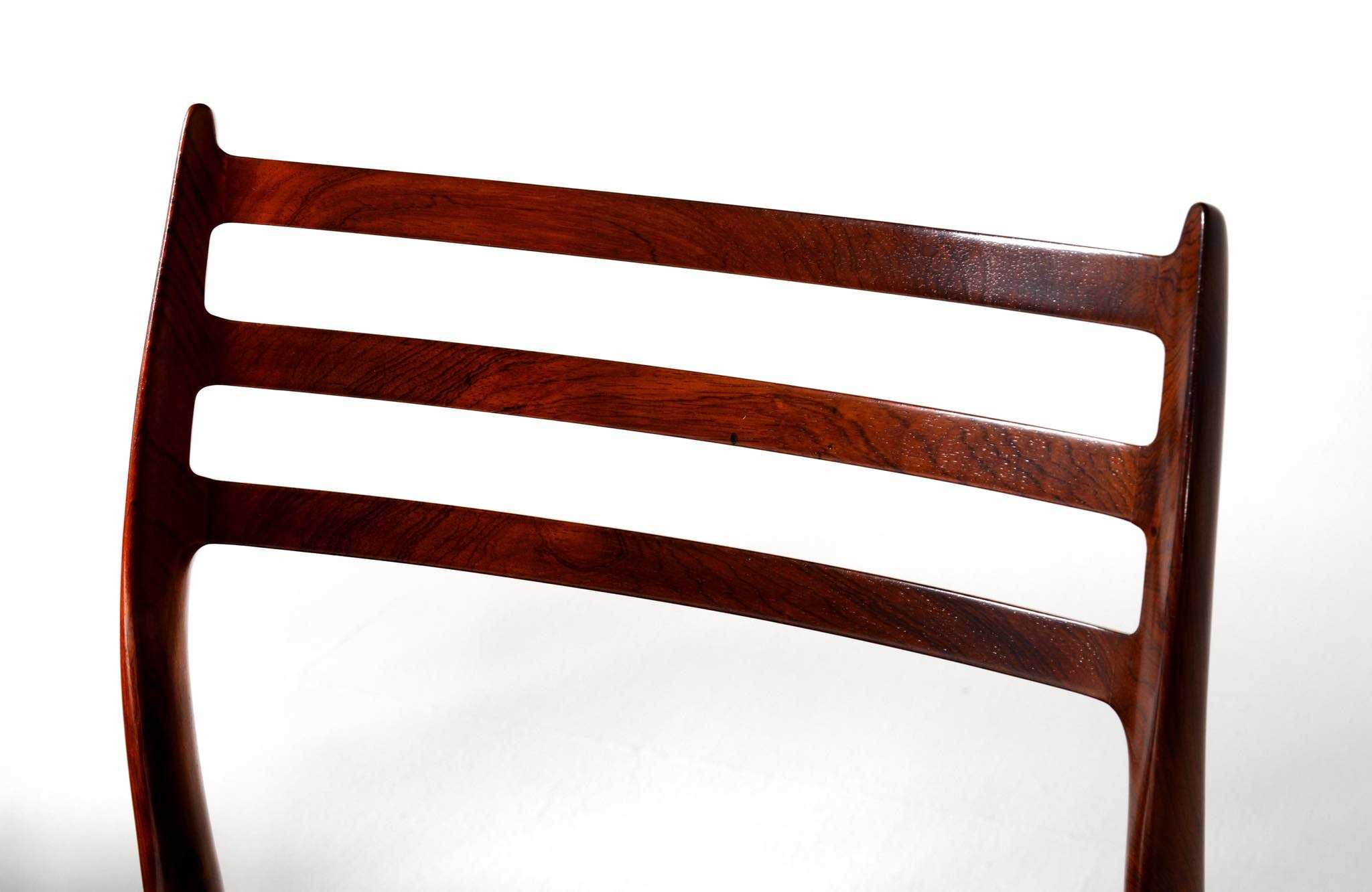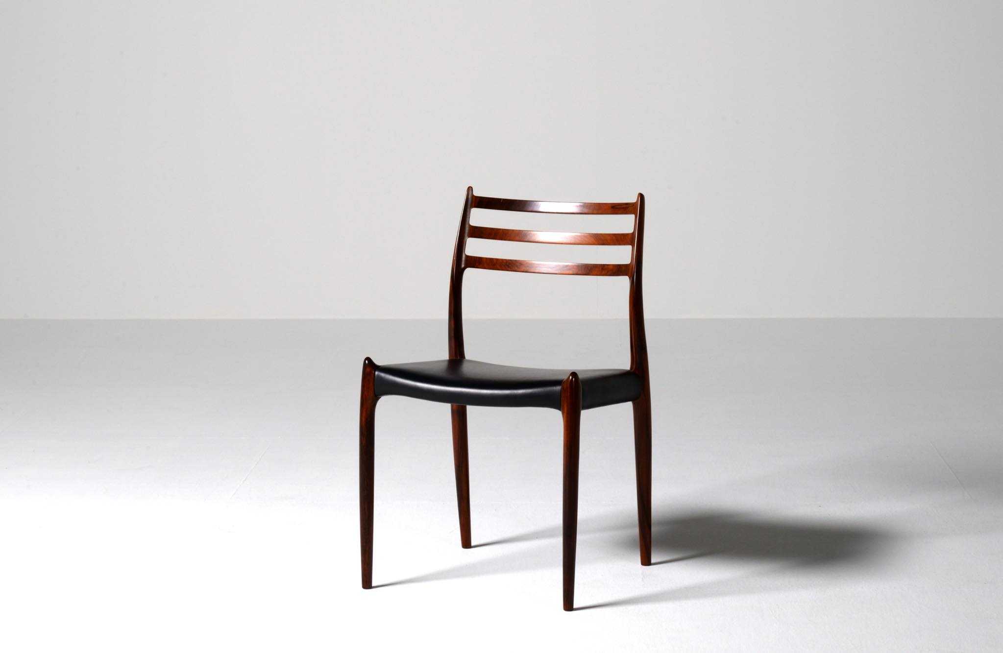 デンマークの家具工房、J.L.Møller/J.L.モラーによるダイニングチェア "model 78" 4脚セットです。創業者のN.O. Moller/ニルス・オット・モラーによってデザインされ、三本笠木が人気を博したモデルです。1960年代頃に作られたものでしょう。良質なローズウッドが用いられており、綺麗な木目文様が現れています。天然木が用いられていたこの当時の作品は、木材そのものに強度があったため、現行モデルに比べ細く作られているようです。座面はモラー社によって近年張り替えられているようです。コンディションは良好です。こちらは4脚セットでの販売です。