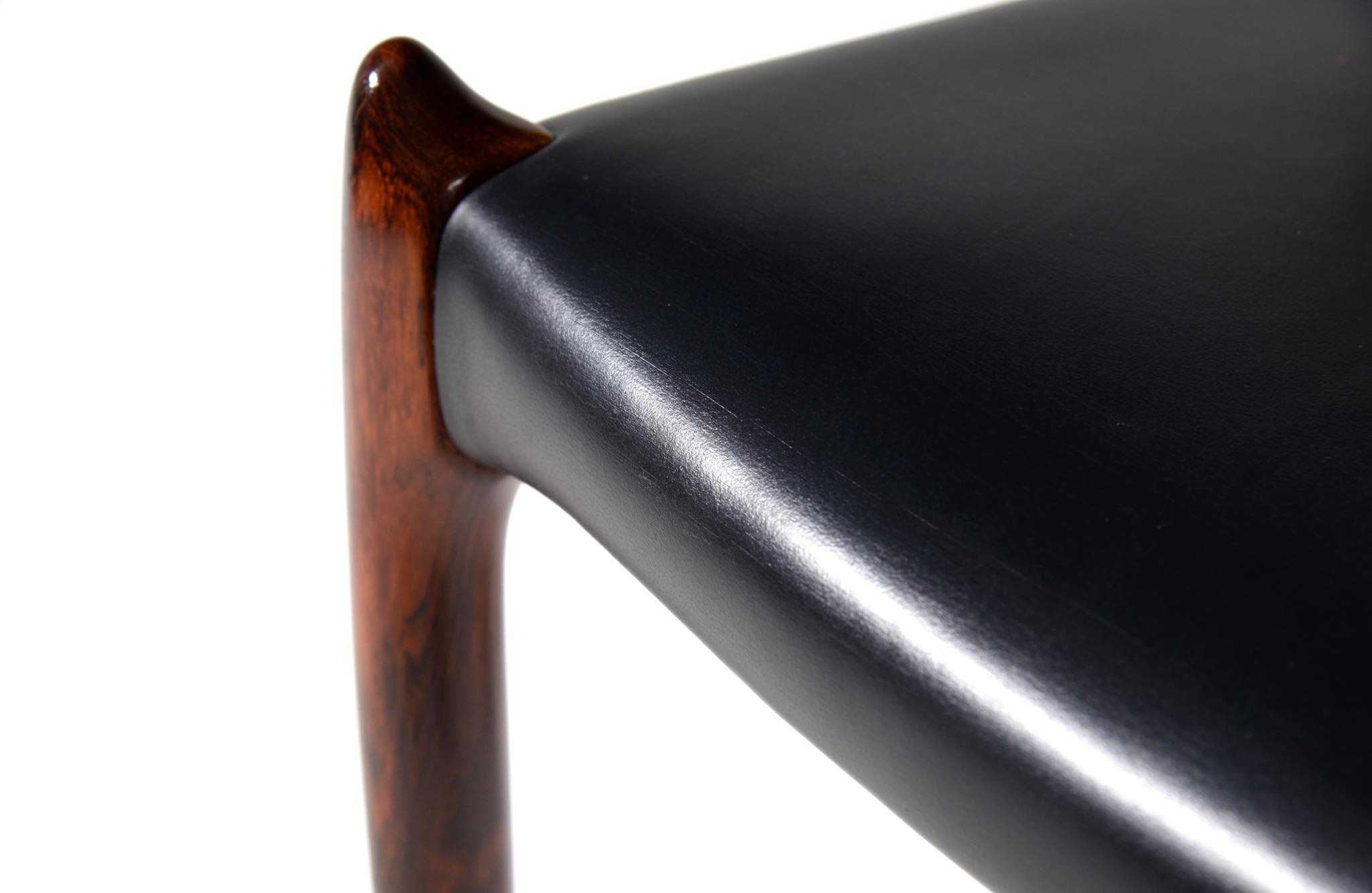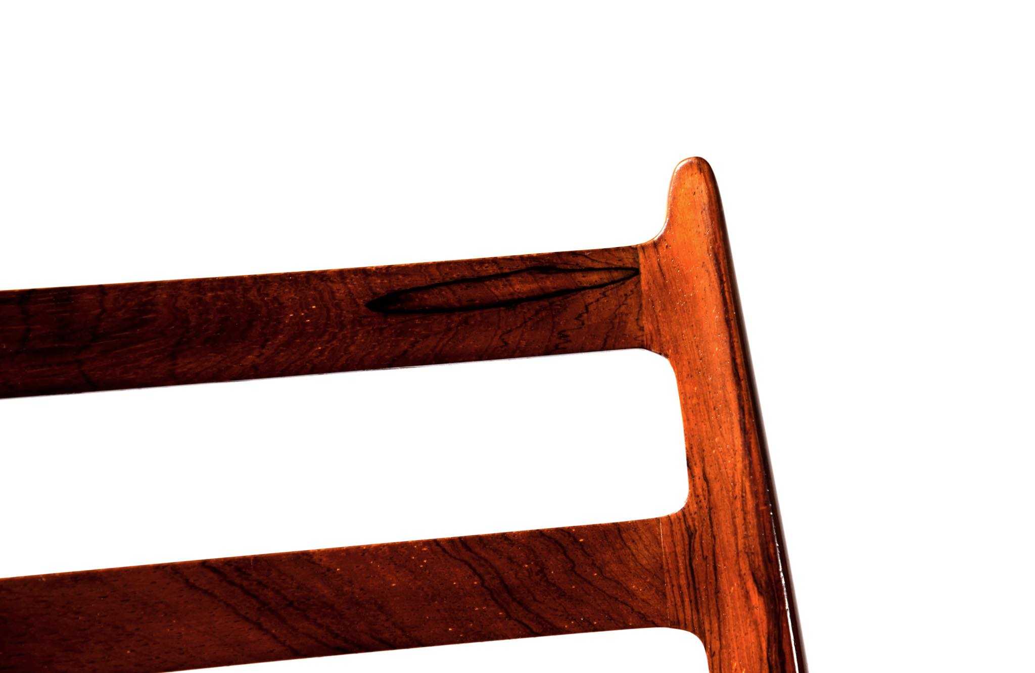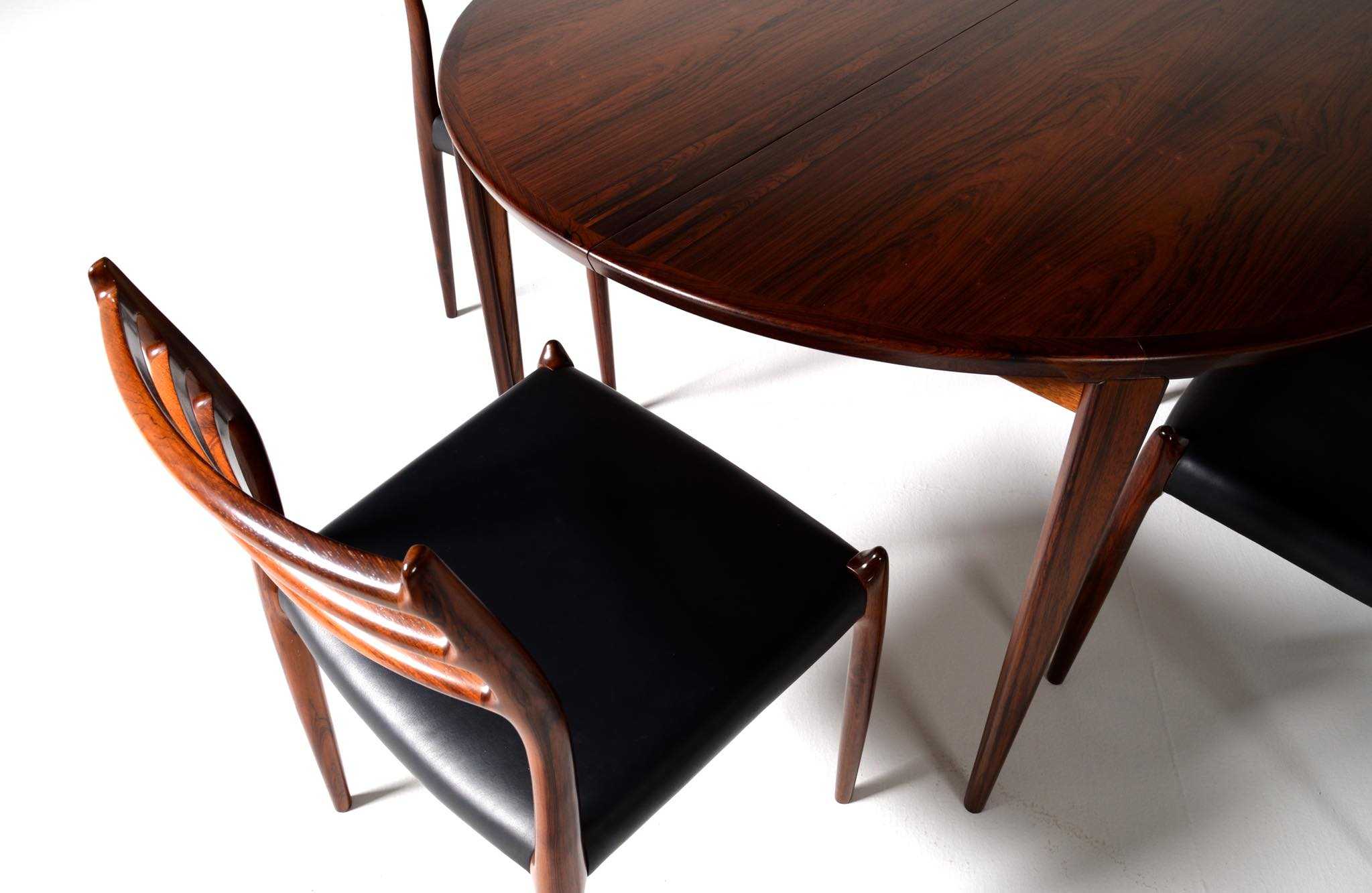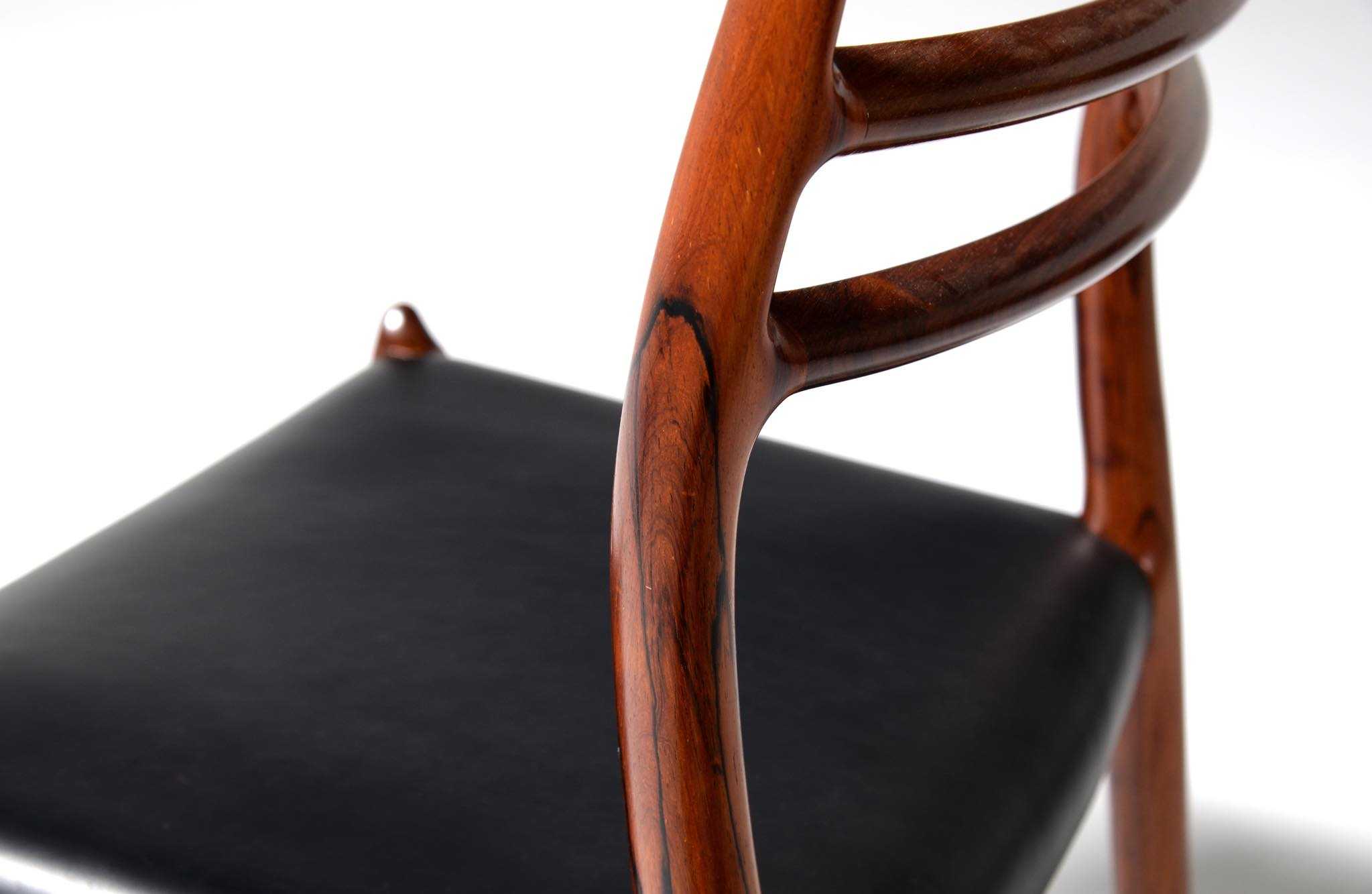 デンマークの家具工房、J.L.Møller/J.L.モラーによるダイニングチェア "model 78" 4脚セットです。創業者のN.O. Moller/ニルス・オット・モラーによってデザインされ、三本笠木が人気を博したモデルです。1960年代頃に作られたものでしょう。良質なローズウッドが用いられており、綺麗な木目文様が現れています。天然木が用いられていたこの当時の作品は、木材そのものに強度があったため、現行モデルに比べ細く作られているようです。座面はモラー社によって近年張り替えられているようです。コンディションは良好です。こちらは4脚セットでの販売です。