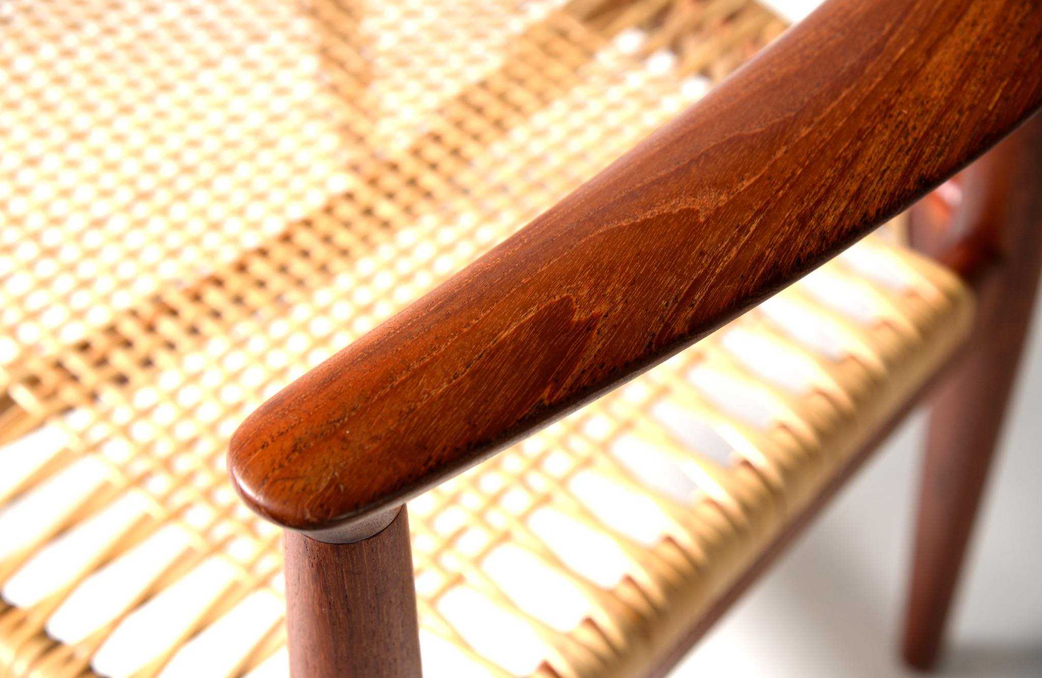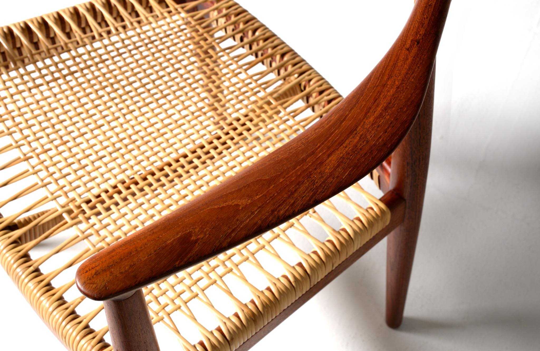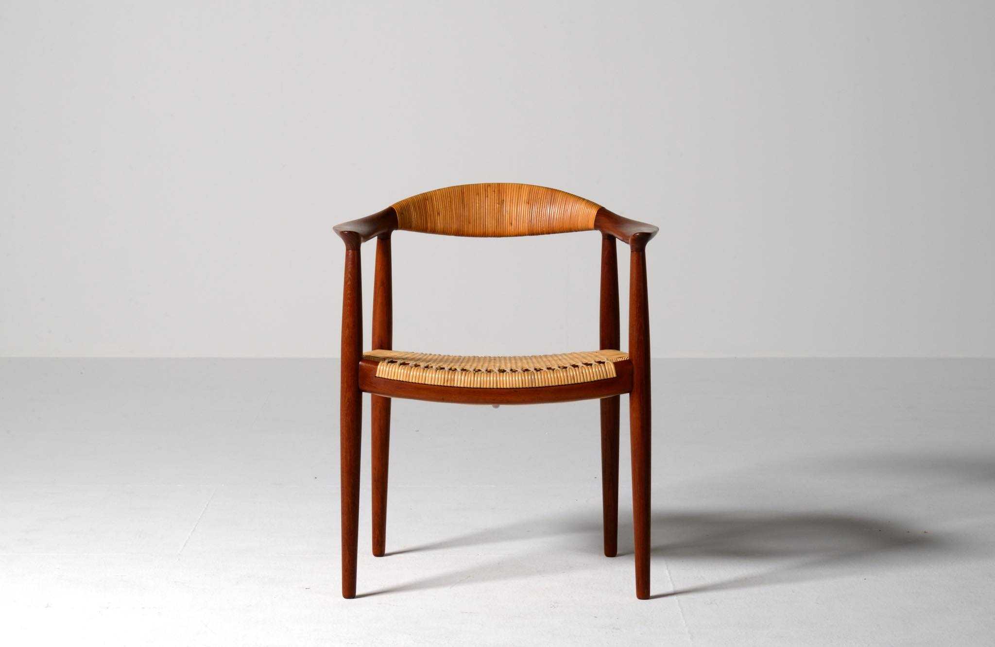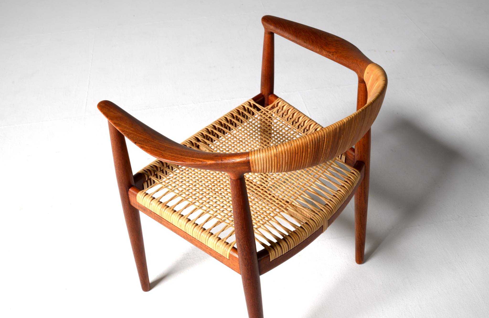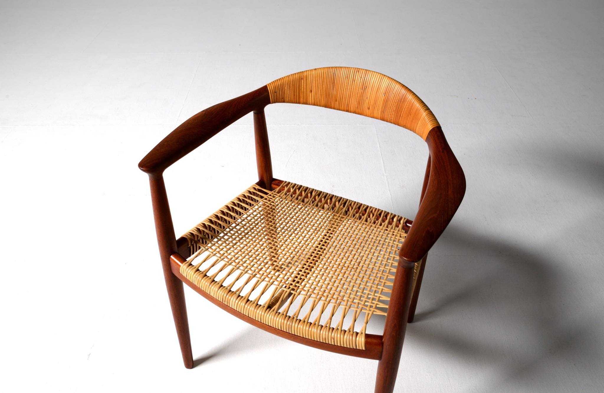 デンマークを代表する家具デザイナーのHans J. Wegner/ハンス・ウェグナーによる、名作椅子JH501、通称 ”The Chair” チーク材xラタンシート、ラタンバックの仕様です。1950年〜60年代頃に作られたものでしょう。タイ国原産と思しき良質なチーク材が用いられており、アームの先端など規則的に現れた木目文様は、恒常的で安定したタイの気候を現しています。背はオリジナル、座はおそらく数年前に張り替えられたものですが、経年により馴染んでくるでしょう。