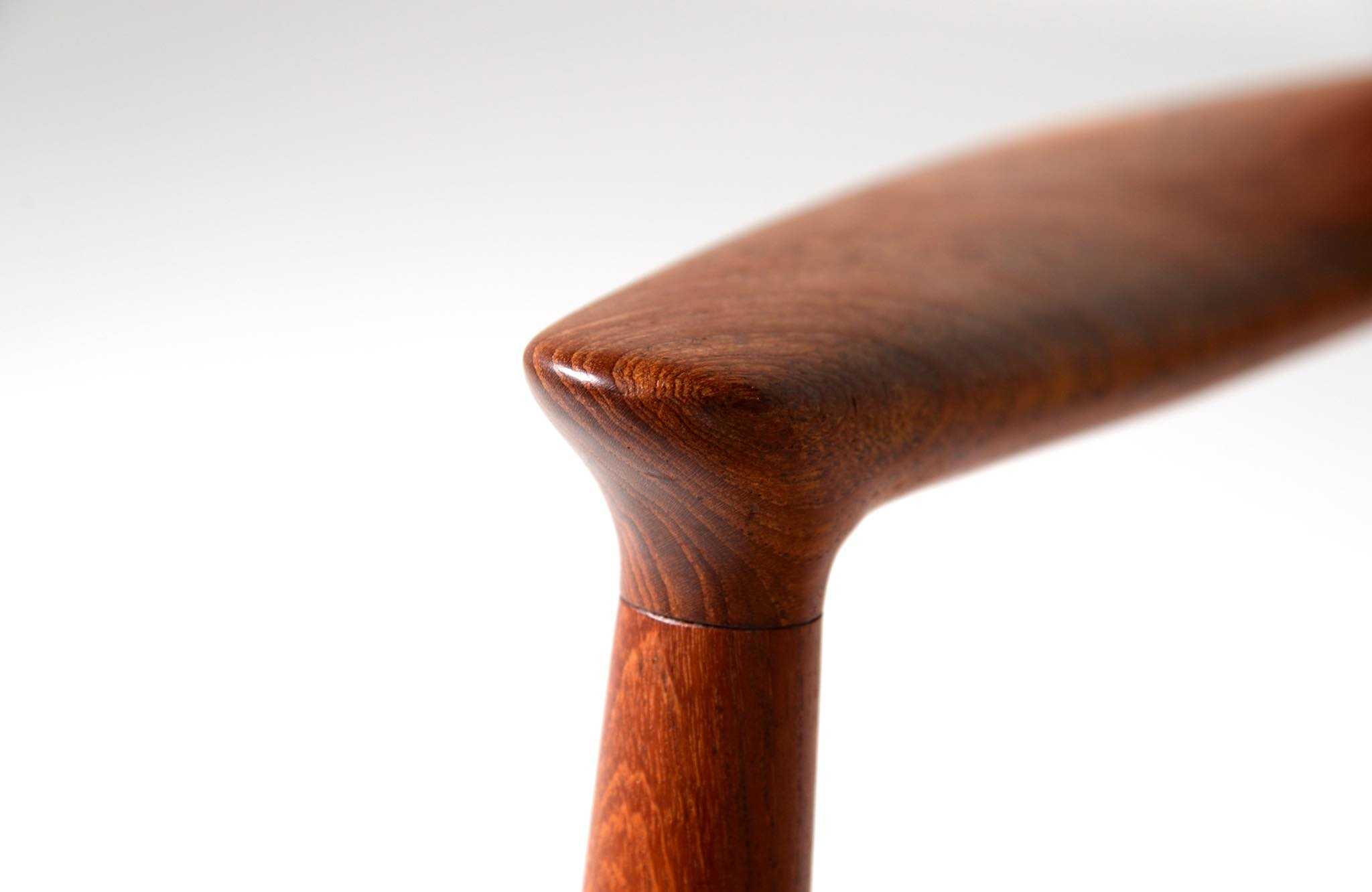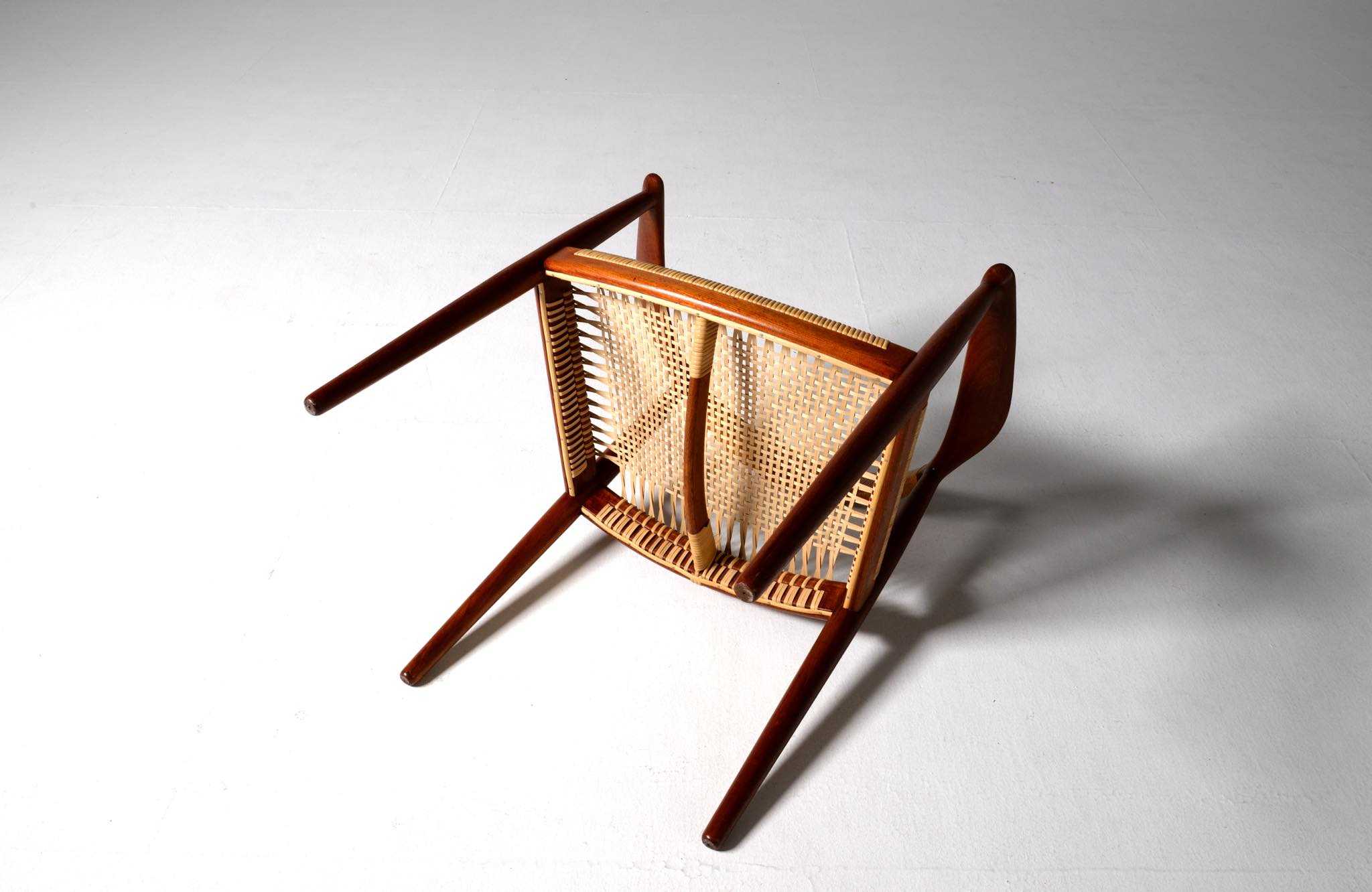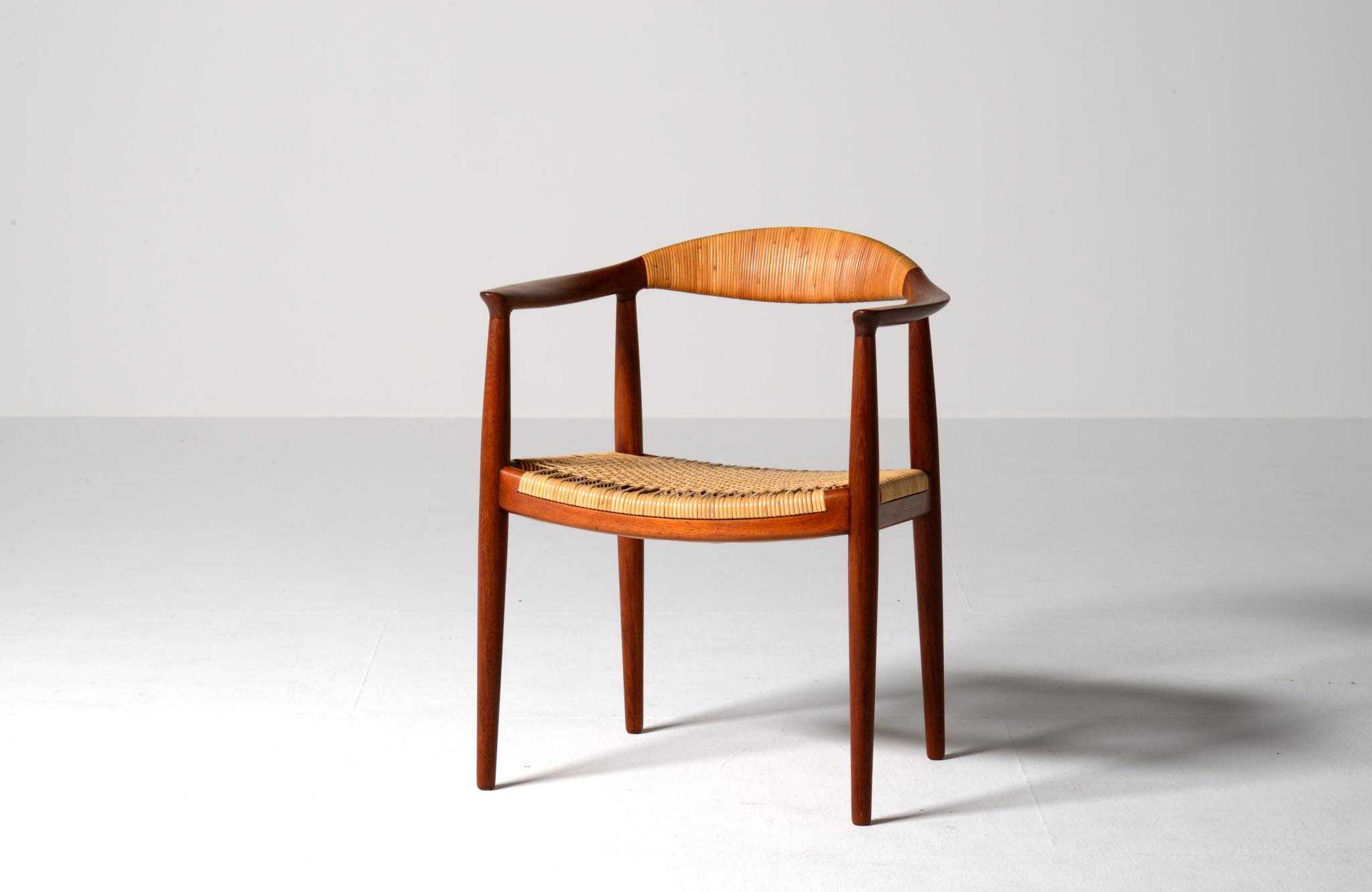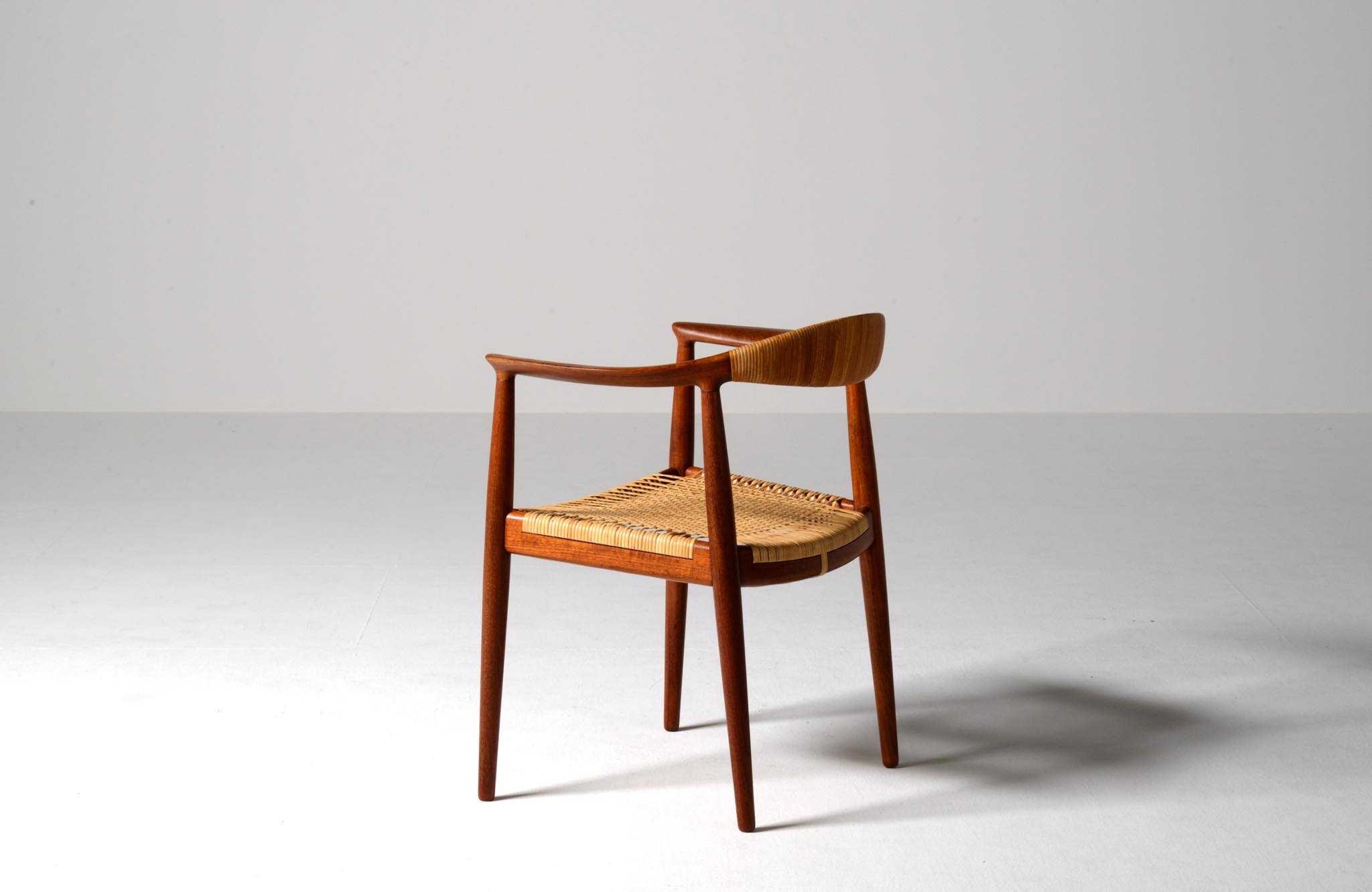 デンマークを代表する家具デザイナーのHans J. Wegner/ハンス・ウェグナーによる、名作椅子JH501、通称 ”The Chair” チーク材xラタンシート、ラタンバックの仕様です。1950年〜60年代頃に作られたものでしょう。タイ国原産と思しき良質なチーク材が用いられており、アームの先端など規則的に現れた木目文様は、恒常的で安定したタイの気候を現しています。背はオリジナル、座はおそらく数年前に張り替えられたものですが、経年により馴染んでくるでしょう。