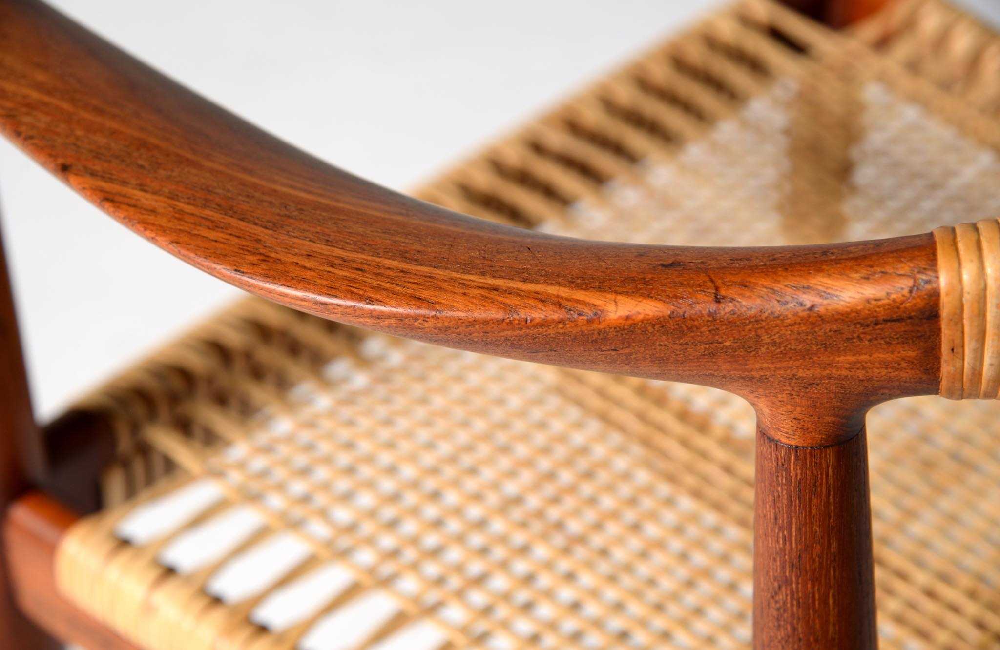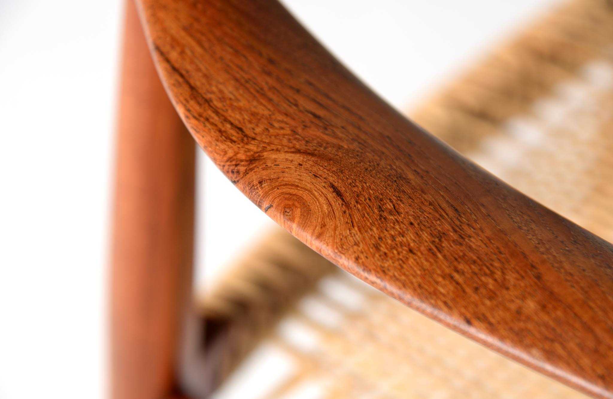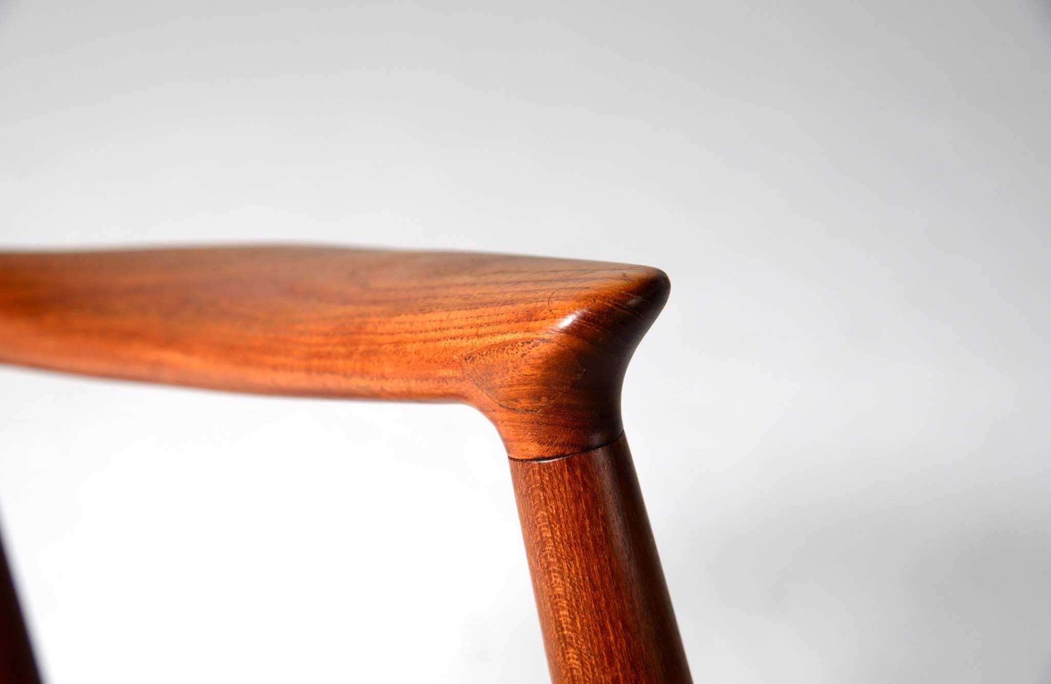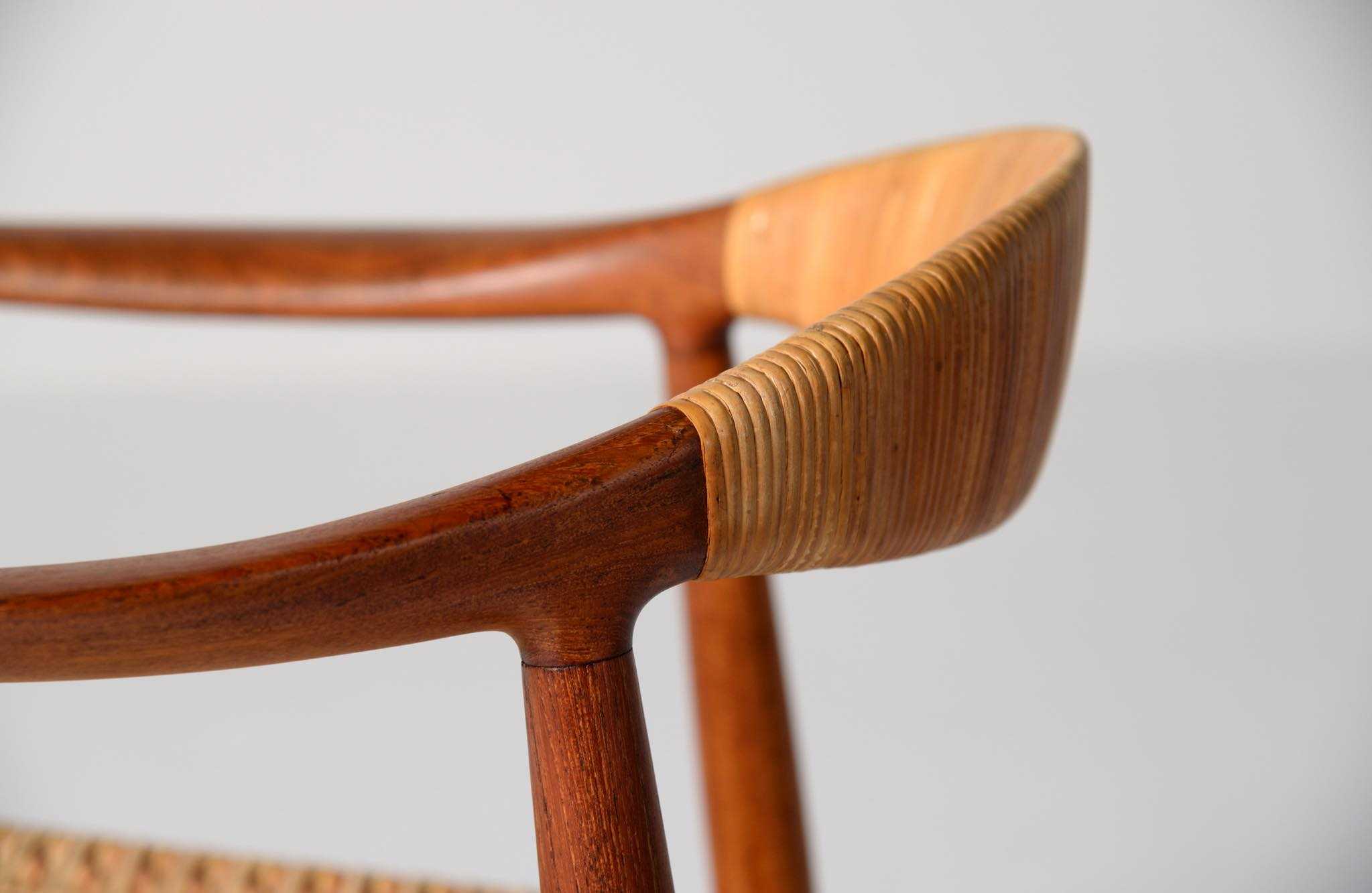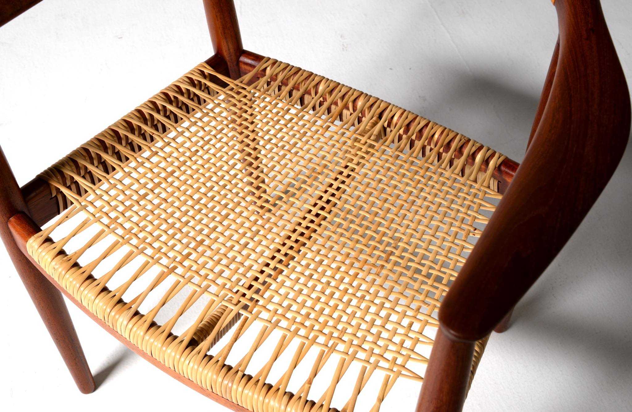 デンマークを代表する家具デザイナーのHans J. Wegner/ハンス・ウェグナーによる、名作椅子JH501、通称 ”The Chair” チーク材xラタンシート、ラタンバックの仕様です。1950年〜60年代頃に作られたものでしょう。タイ国原産と思しき良質なチーク材が用いられており、アームの先端など規則的に現れた木目文様は、恒常的で安定したタイの気候を現しています。背はオリジナル、座はおそらく数年前に張り替えられたものですが、経年により馴染んでくるでしょう。