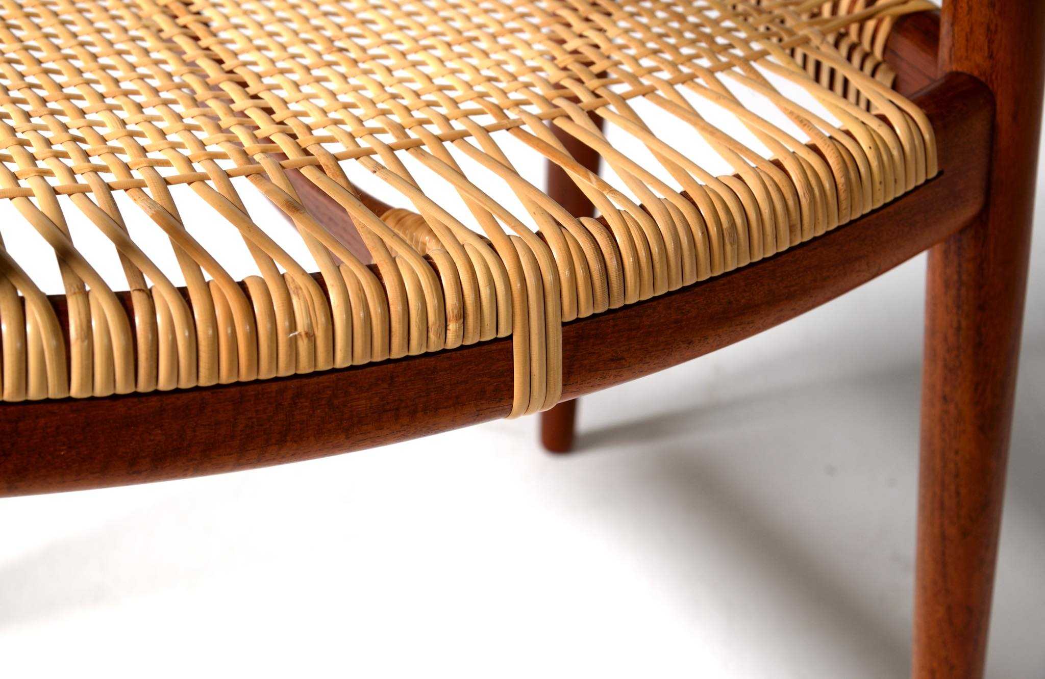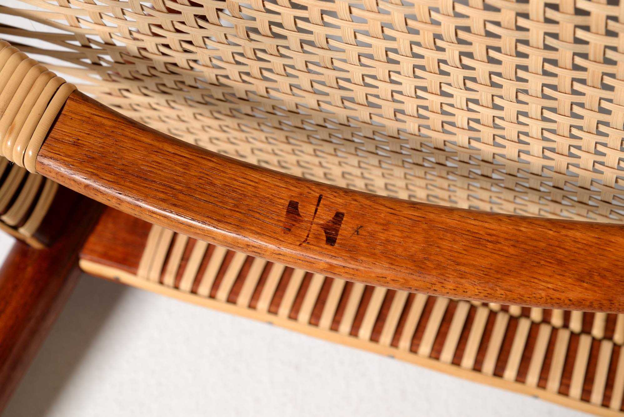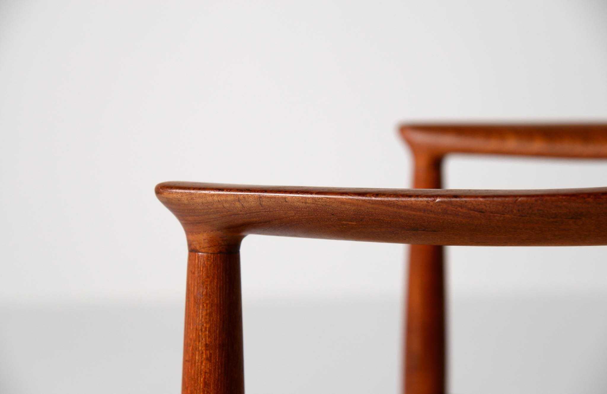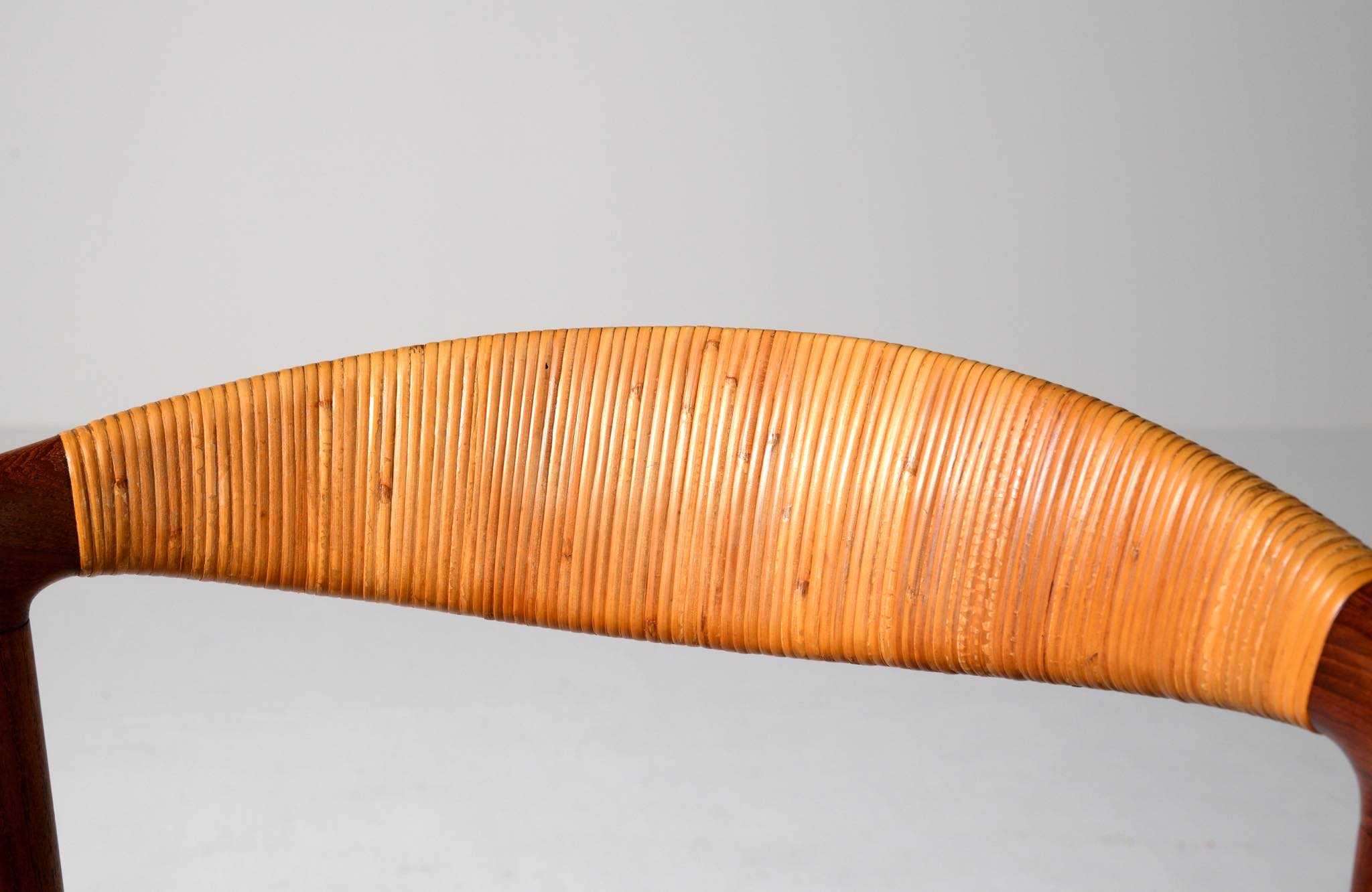 デンマークを代表する家具デザイナーのHans J. Wegner/ハンス・ウェグナーによる、名作椅子JH501、通称 ”The Chair” チーク材xラタンシート、ラタンバックの仕様です。1950年〜60年代頃に作られたものでしょう。タイ国原産と思しき良質なチーク材が用いられており、アームの先端など規則的に現れた木目文様は、恒常的で安定したタイの気候を現しています。背はオリジナル、座はおそらく数年前に張り替えられたものですが、経年により馴染んでくるでしょう。