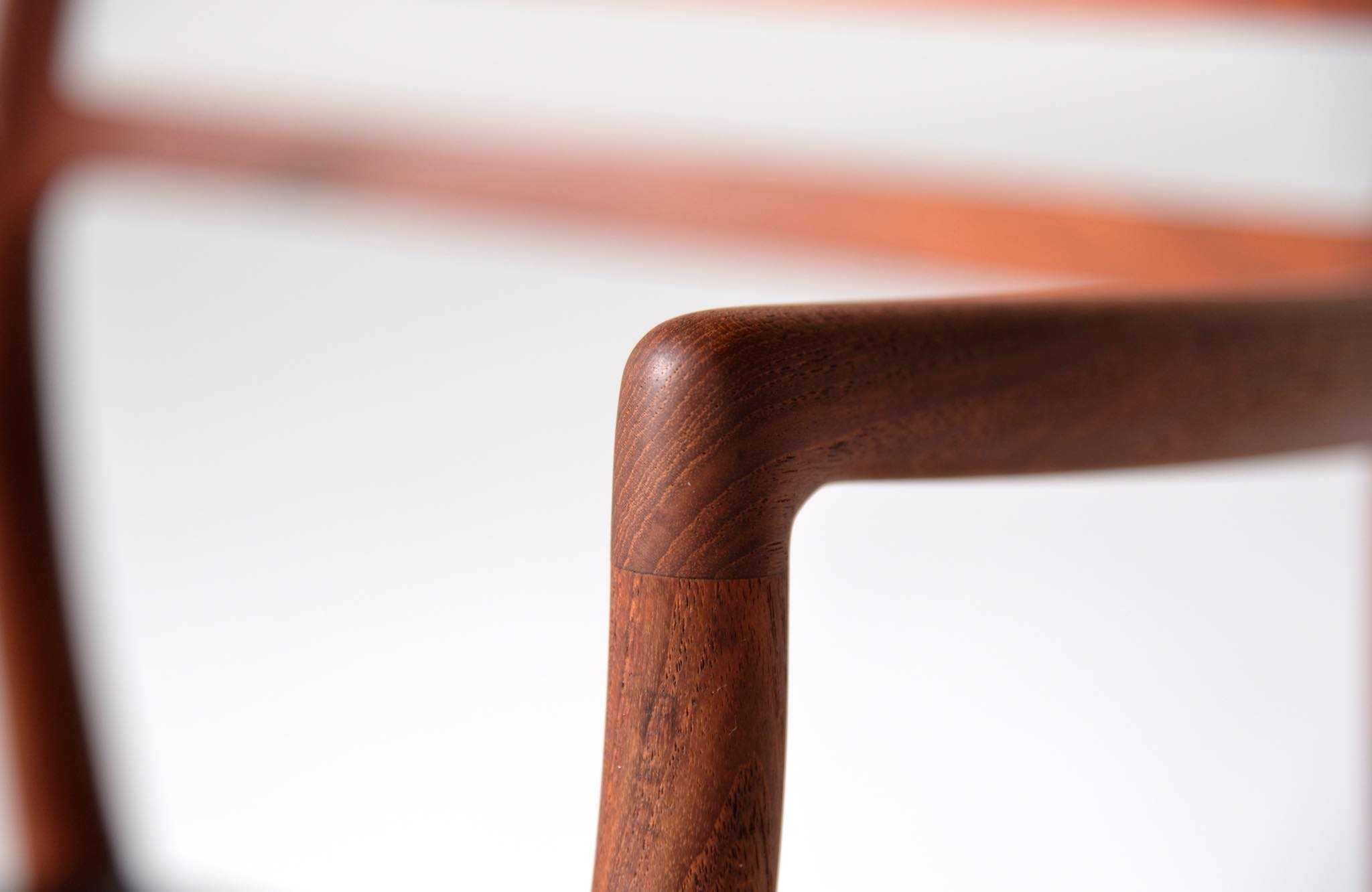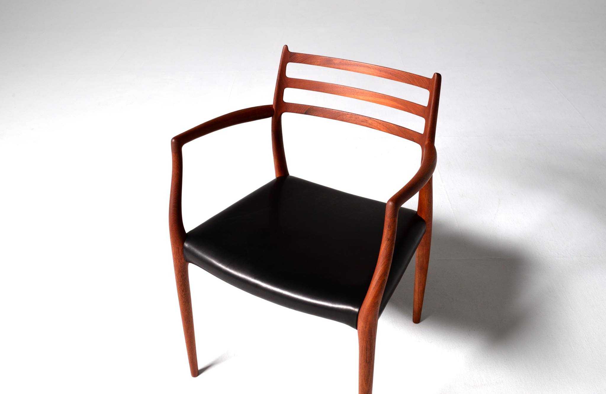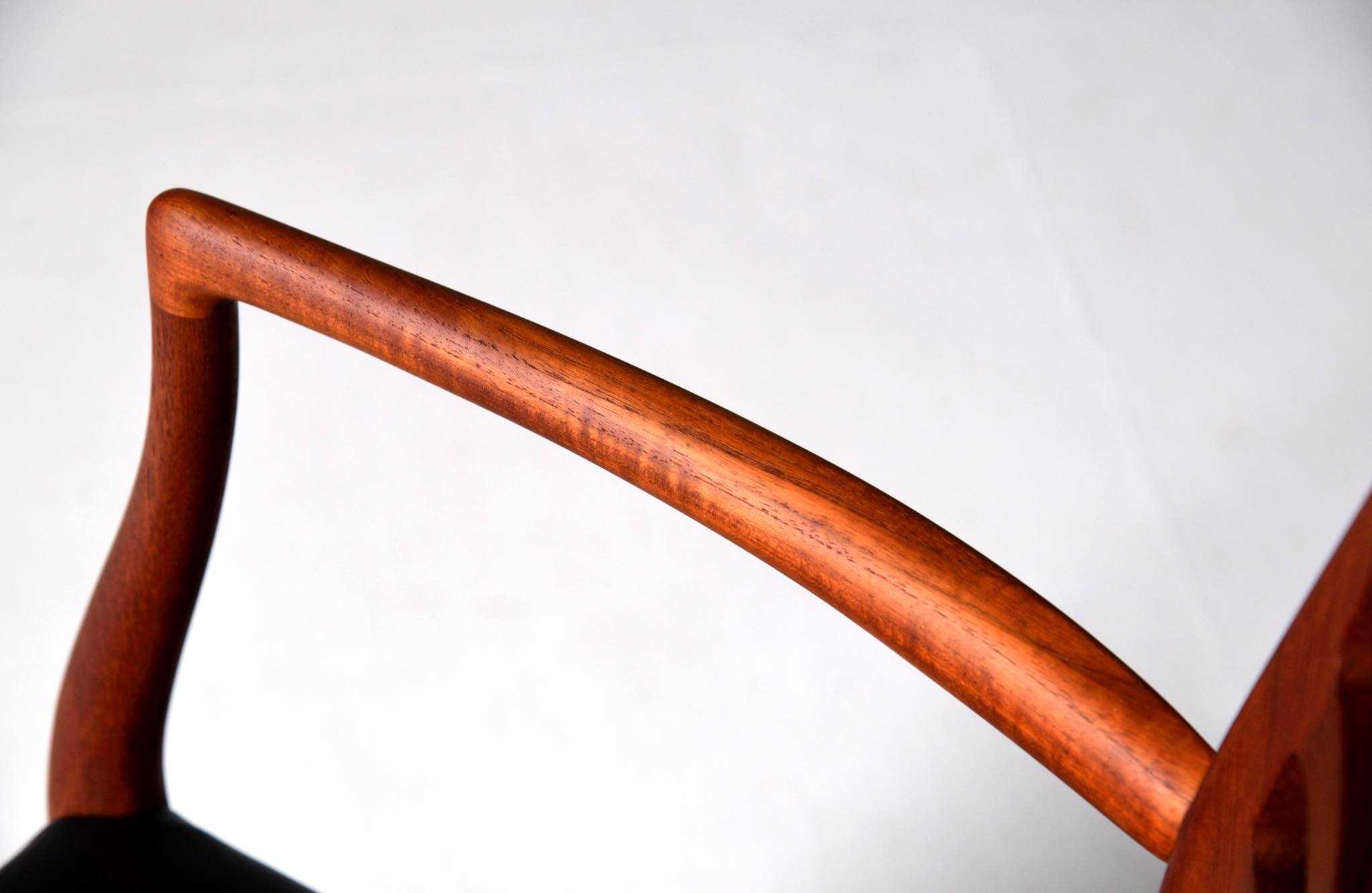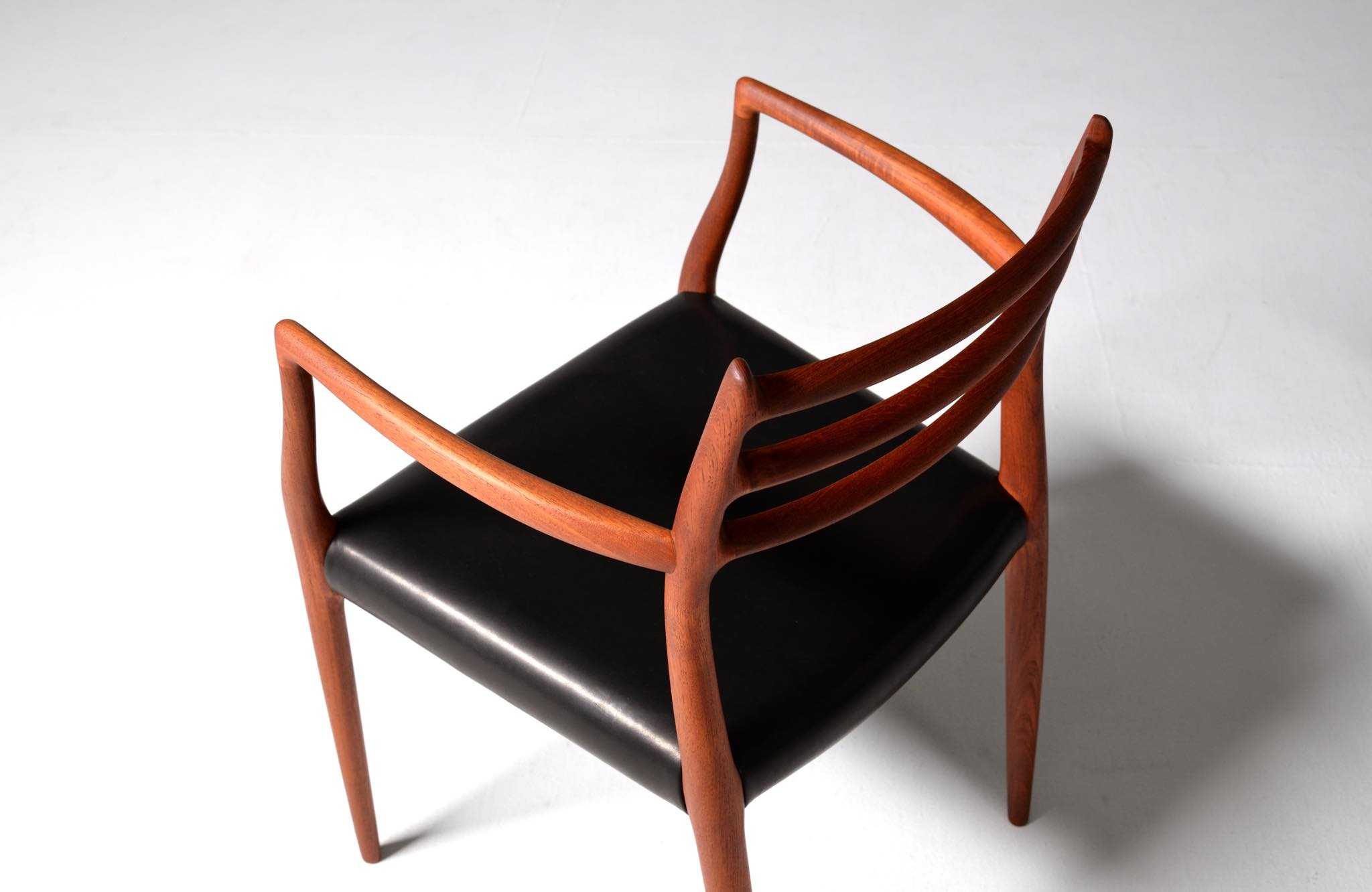 J.L. Møllerの名作椅子 "Model 62" アームチェア、1960年代に作られたものです。タイ国原産と思しき良質な無垢のチーク材を細く削り出されたフレームは天然木ならではの賜物です。シートは黒皮革で張り替えました。