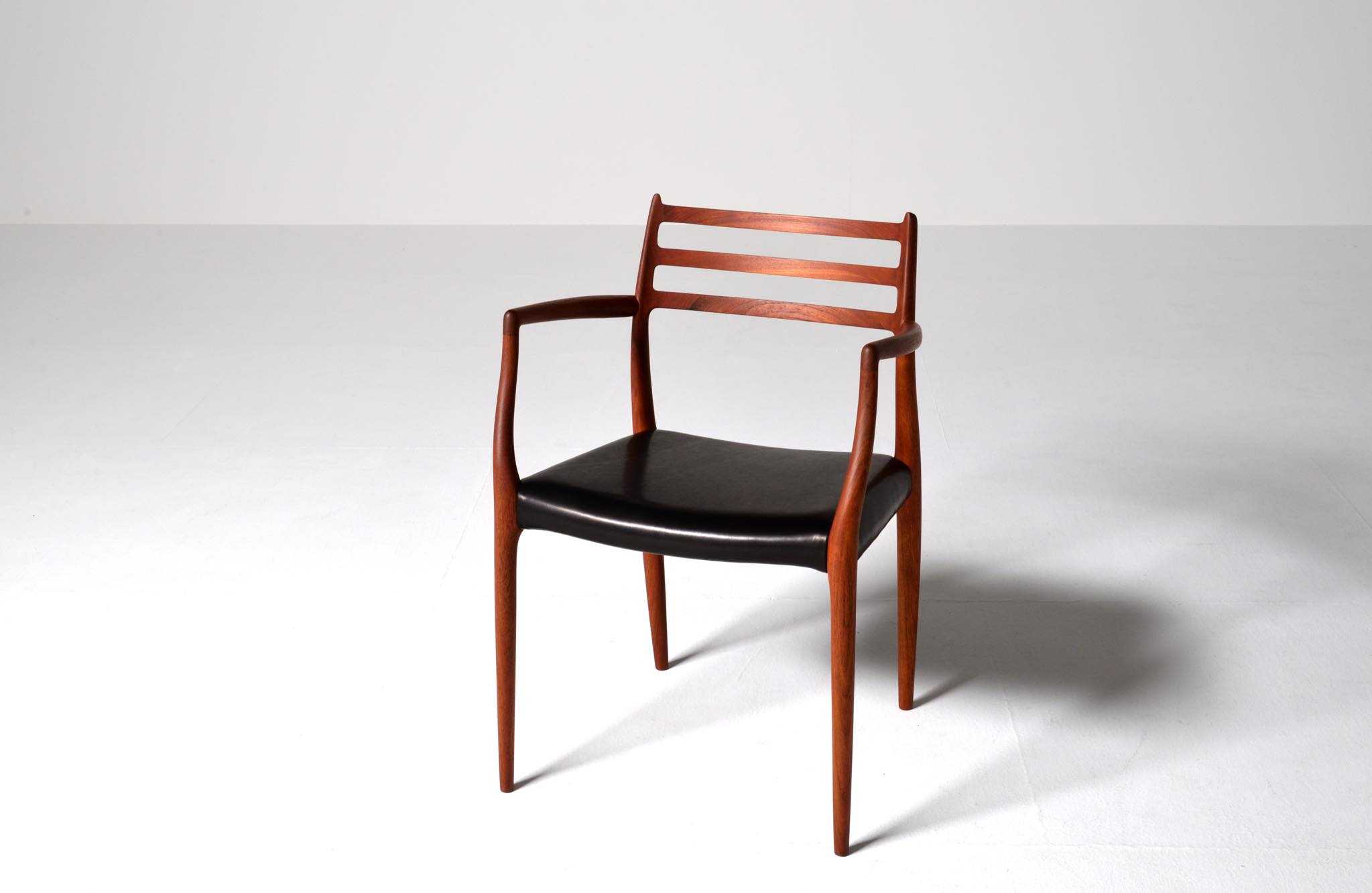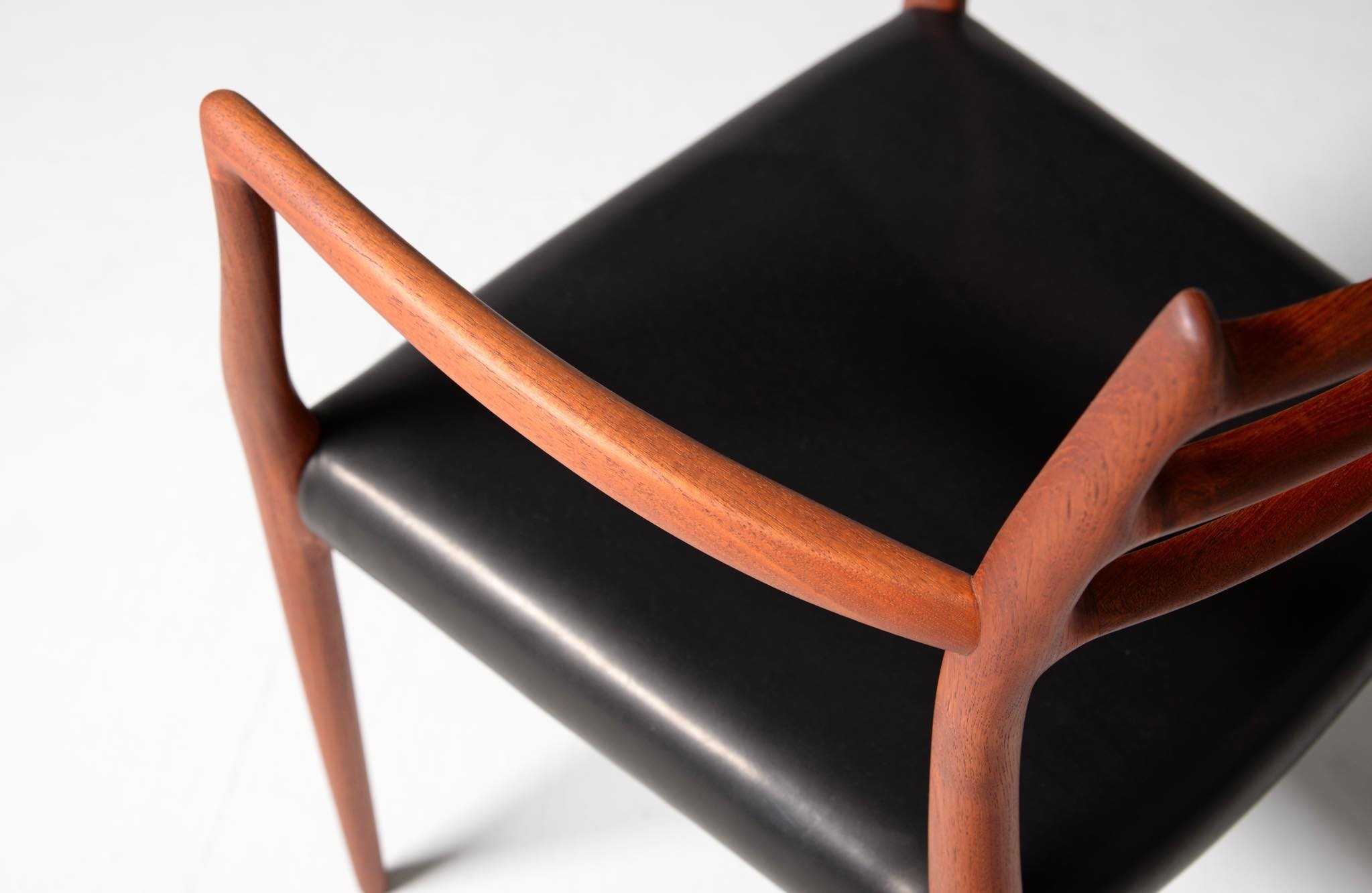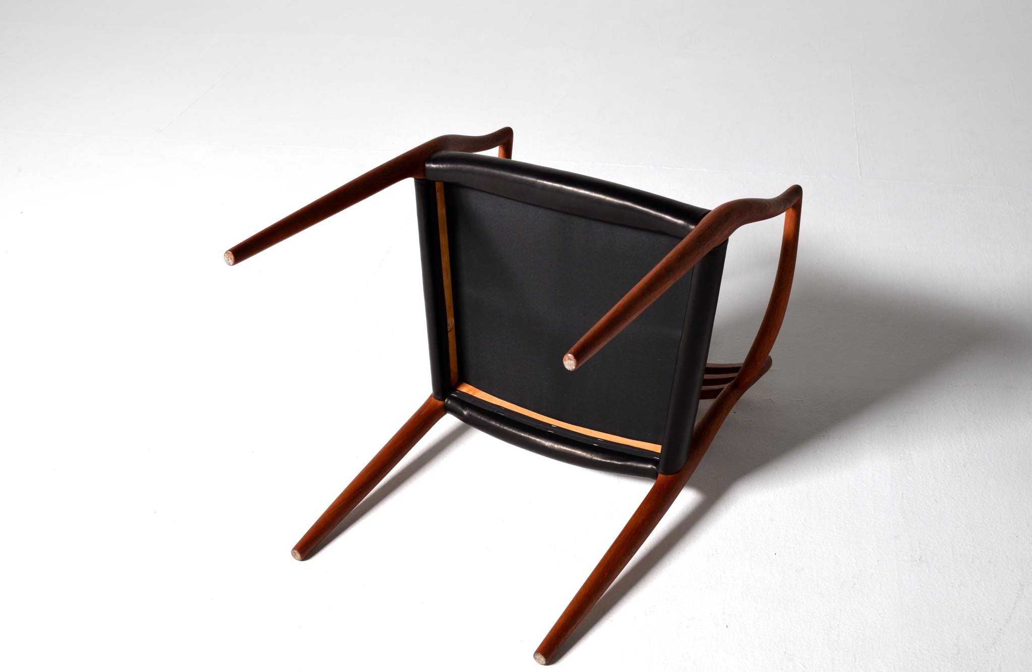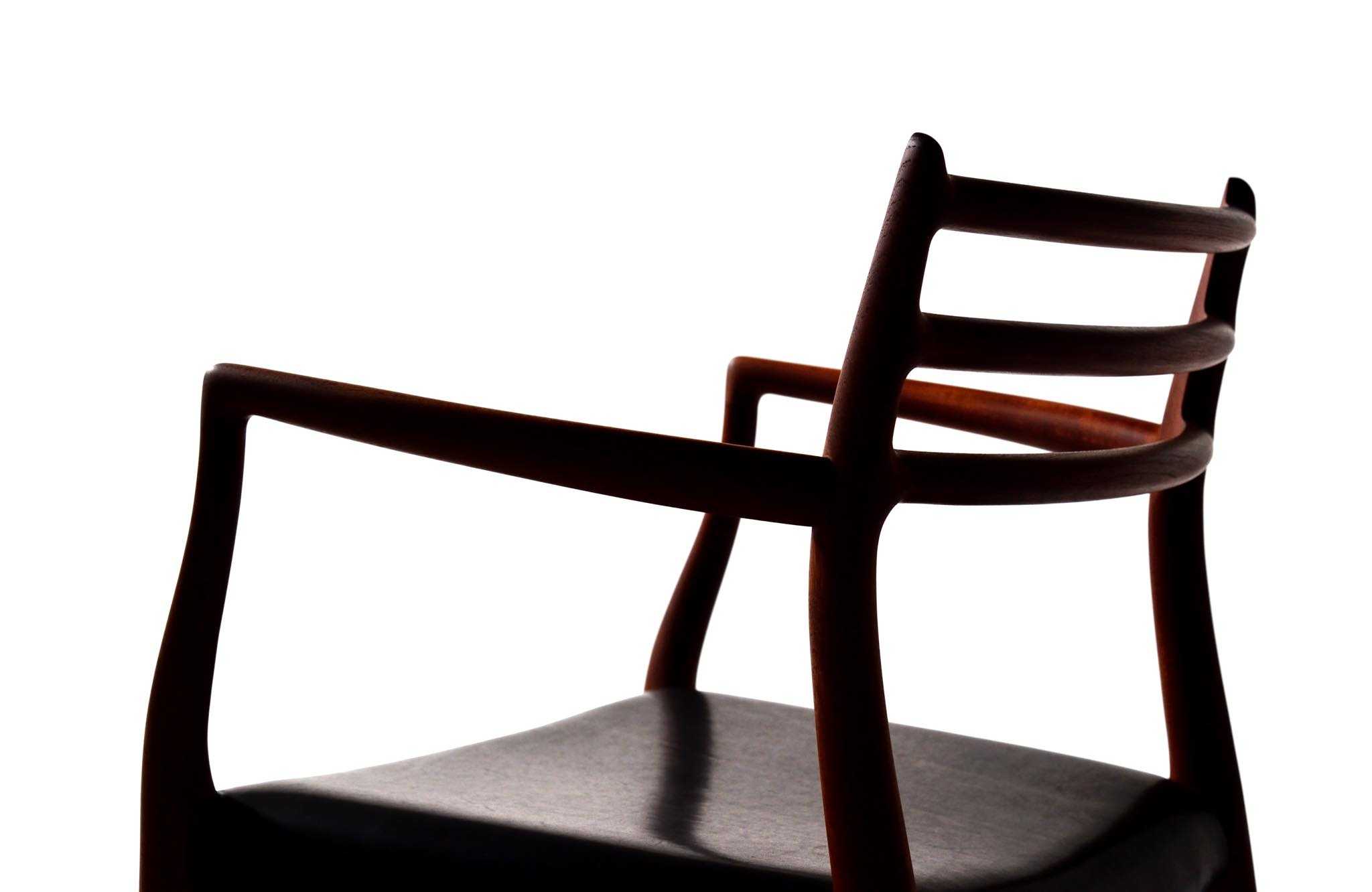 J.L. Møllerの名作椅子 "Model 62" アームチェア、1960年代に作られたものです。タイ国原産と思しき良質な無垢のチーク材を細く削り出されたフレームは天然木ならではの賜物です。シートは黒皮革で張り替えました。