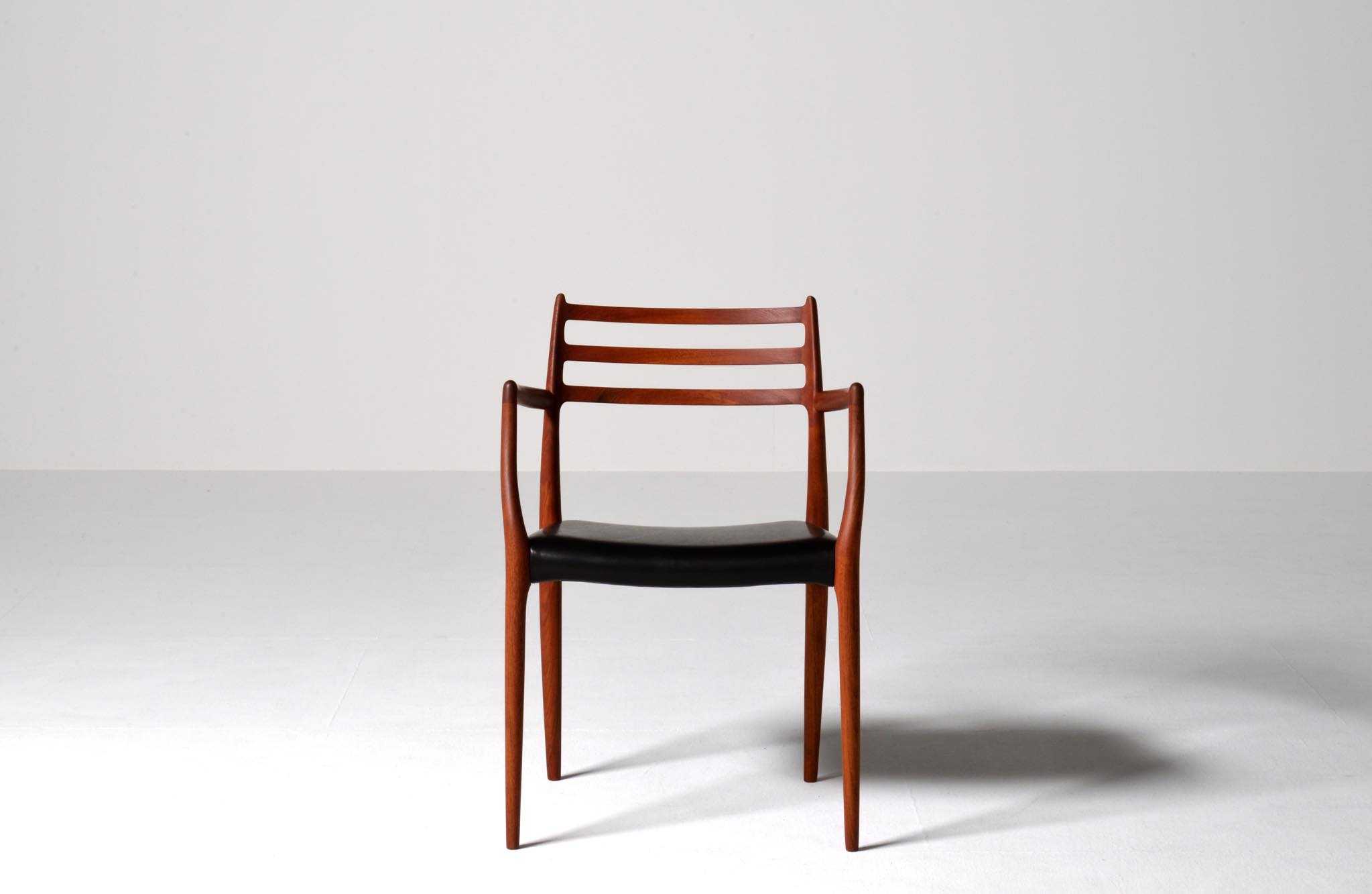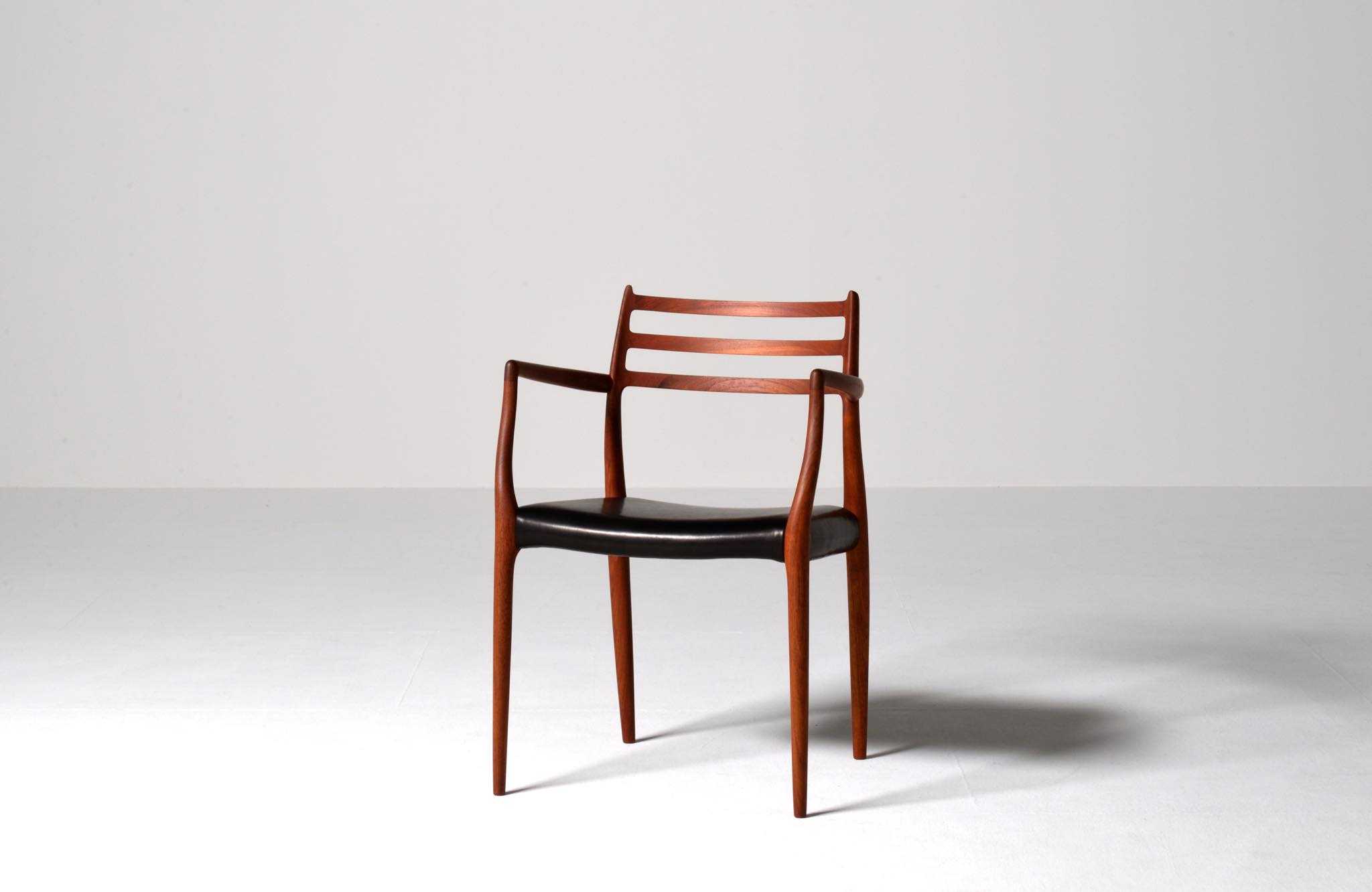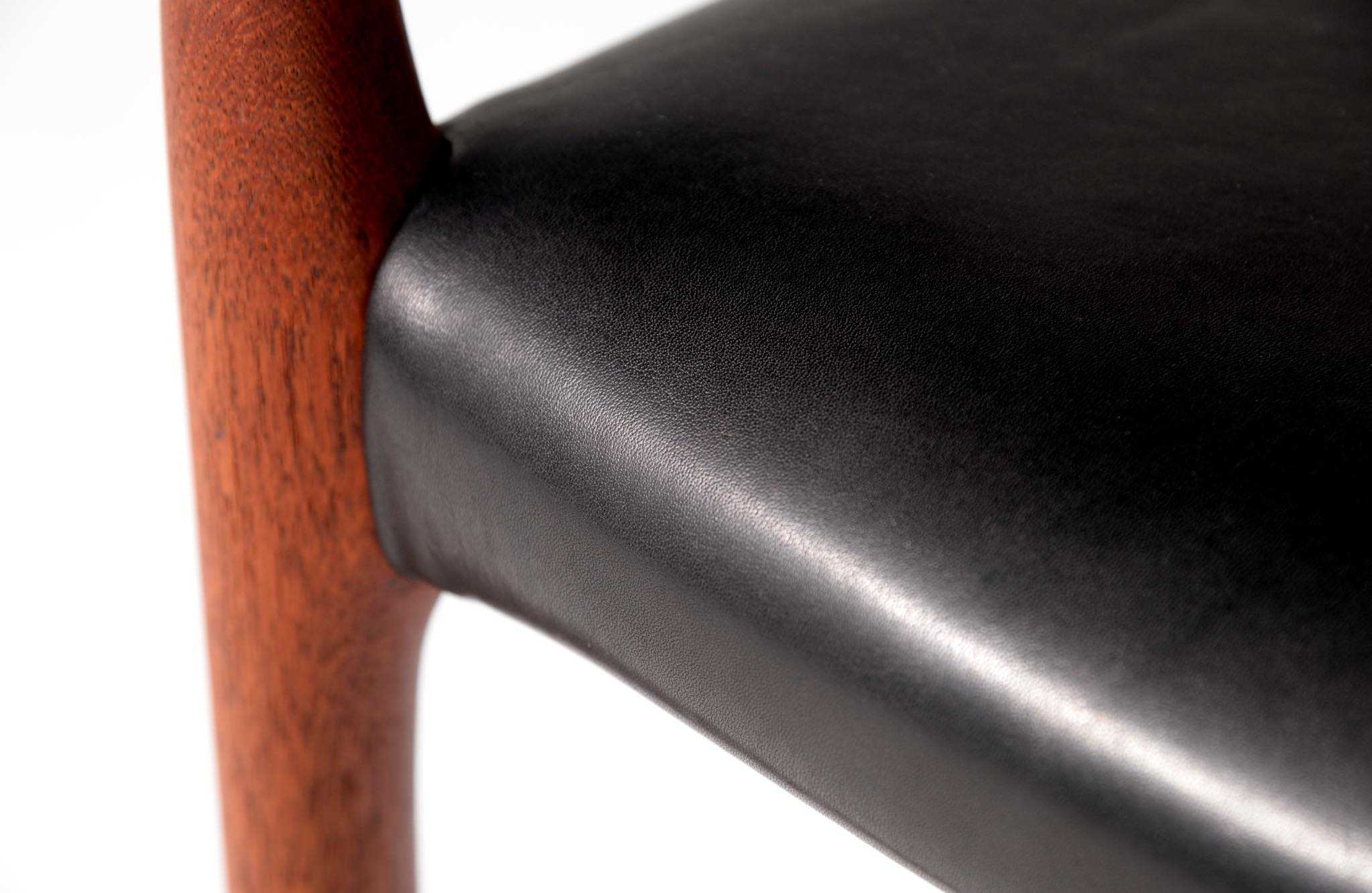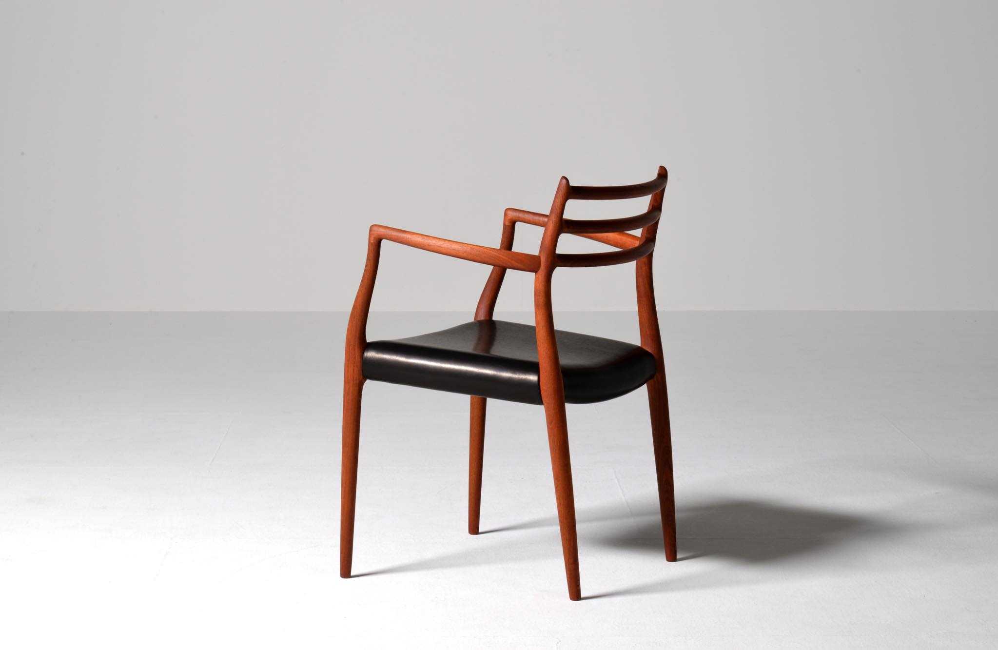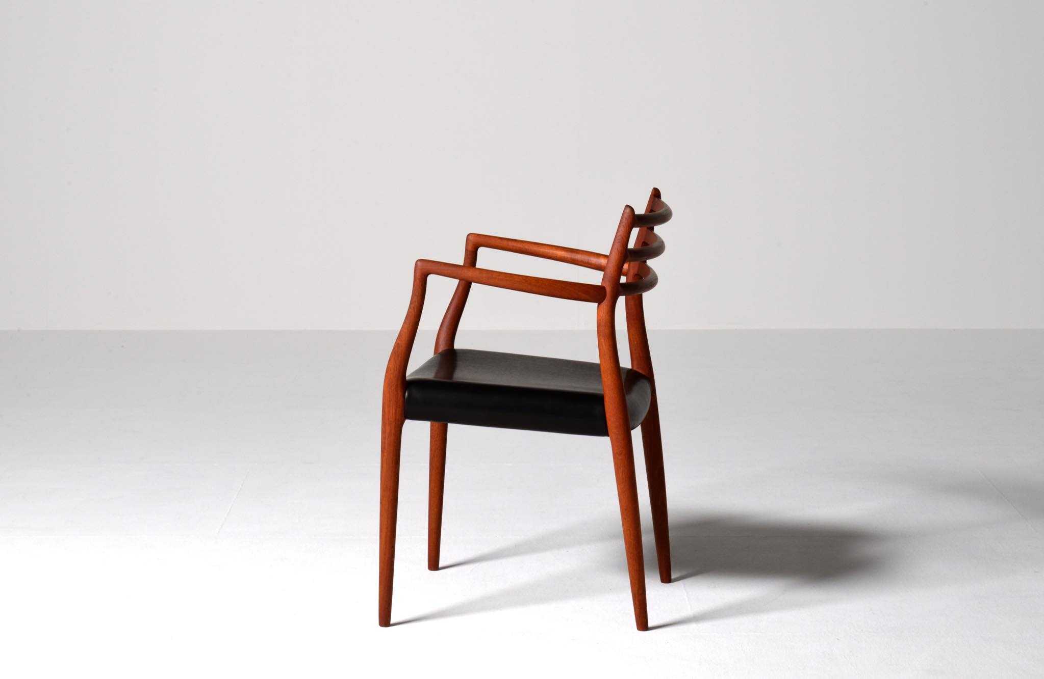 J.L. Møllerの名作椅子 "Model 62" アームチェア、1960年代に作られたものです。タイ国原産と思しき良質な無垢のチーク材を細く削り出されたフレームは天然木ならではの賜物です。シートは黒皮革で張り替えました。