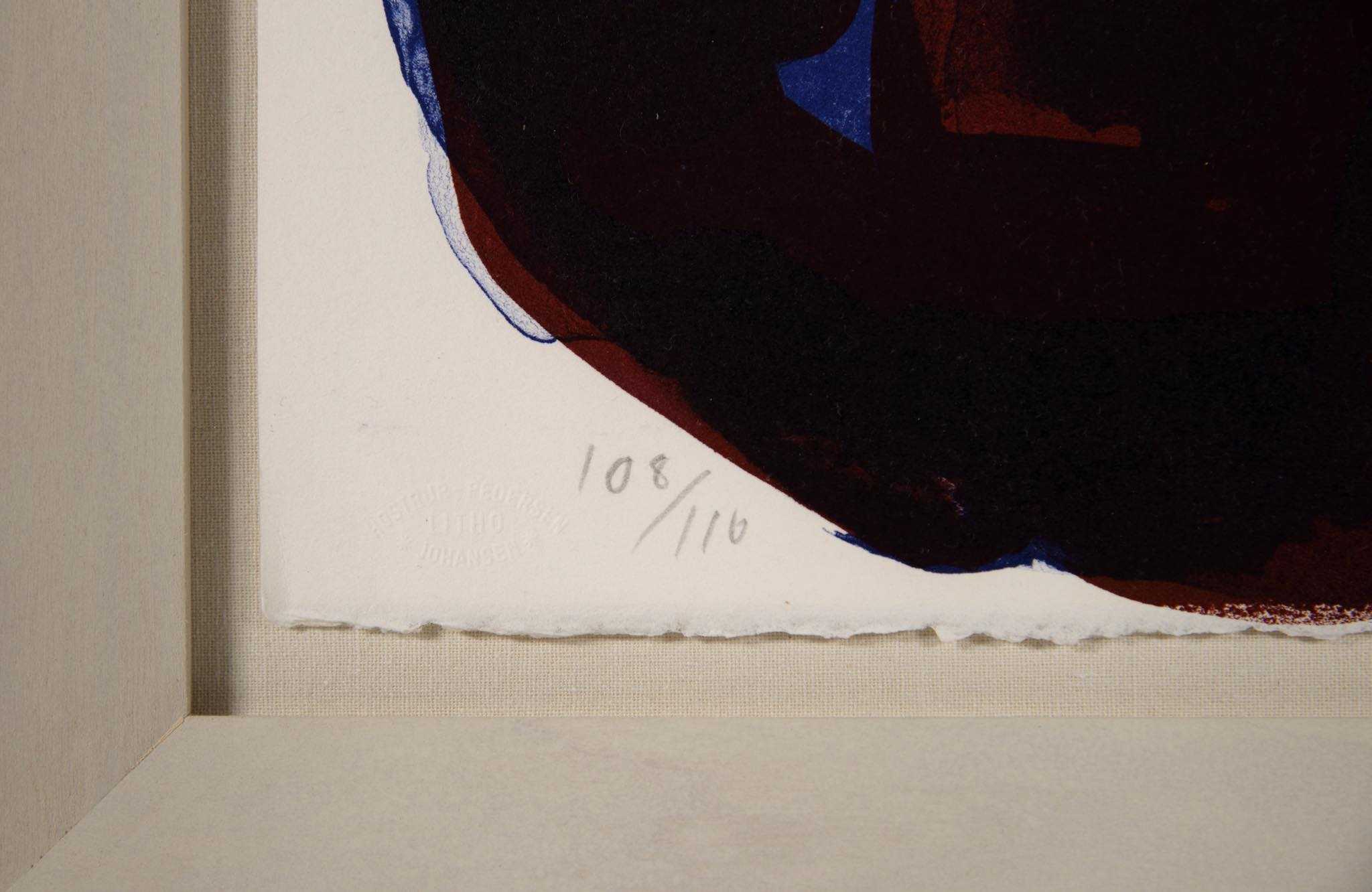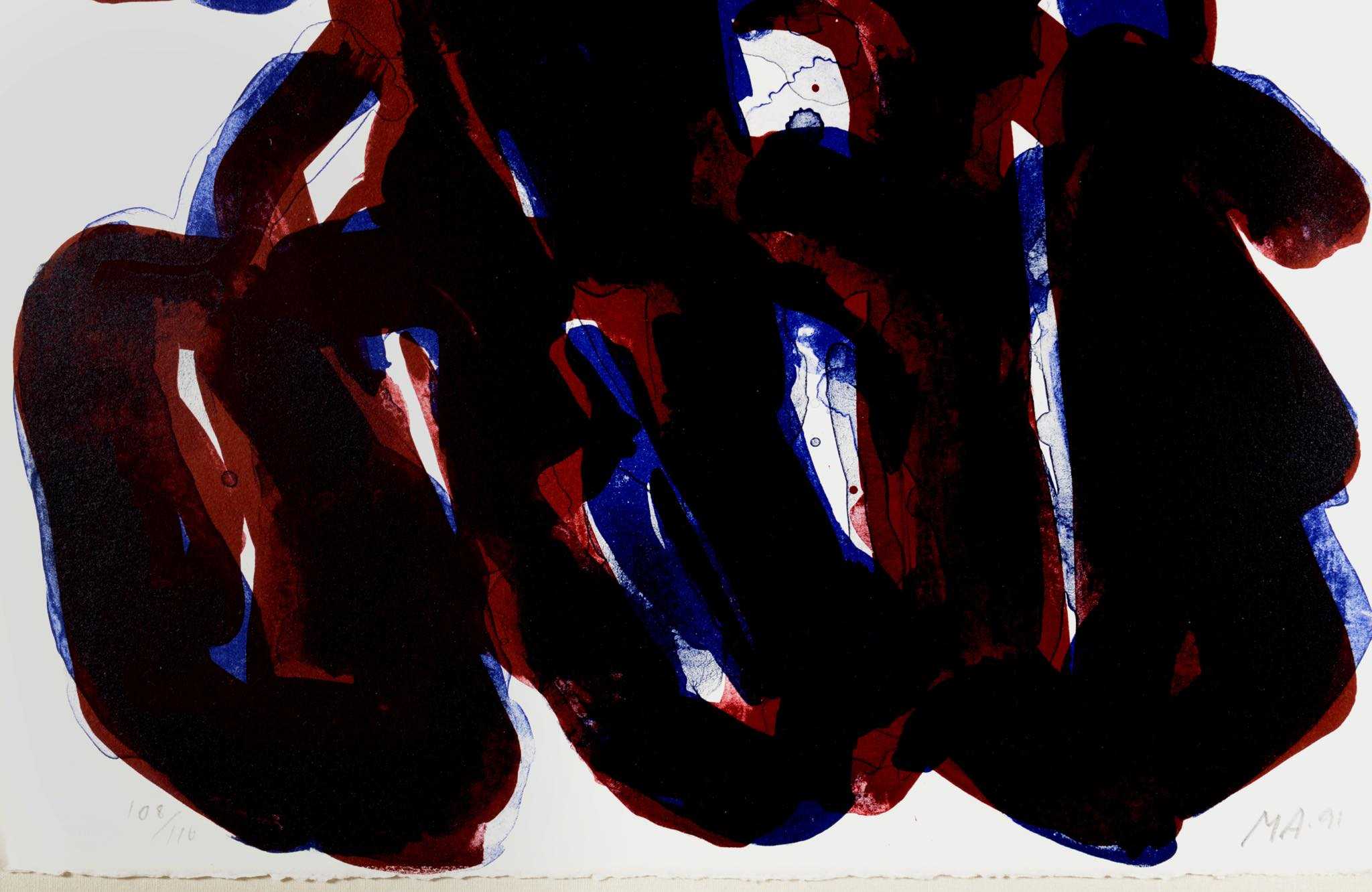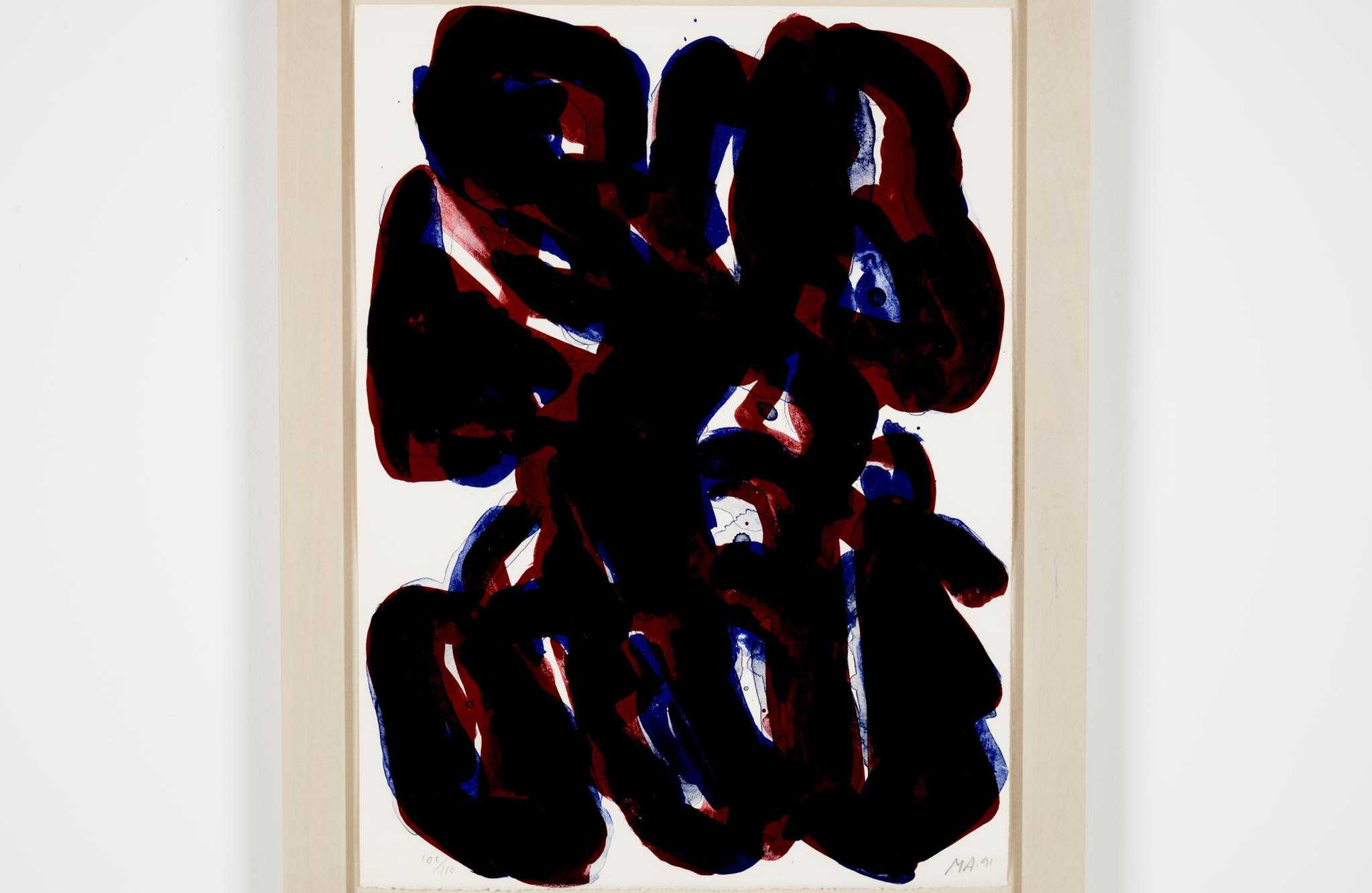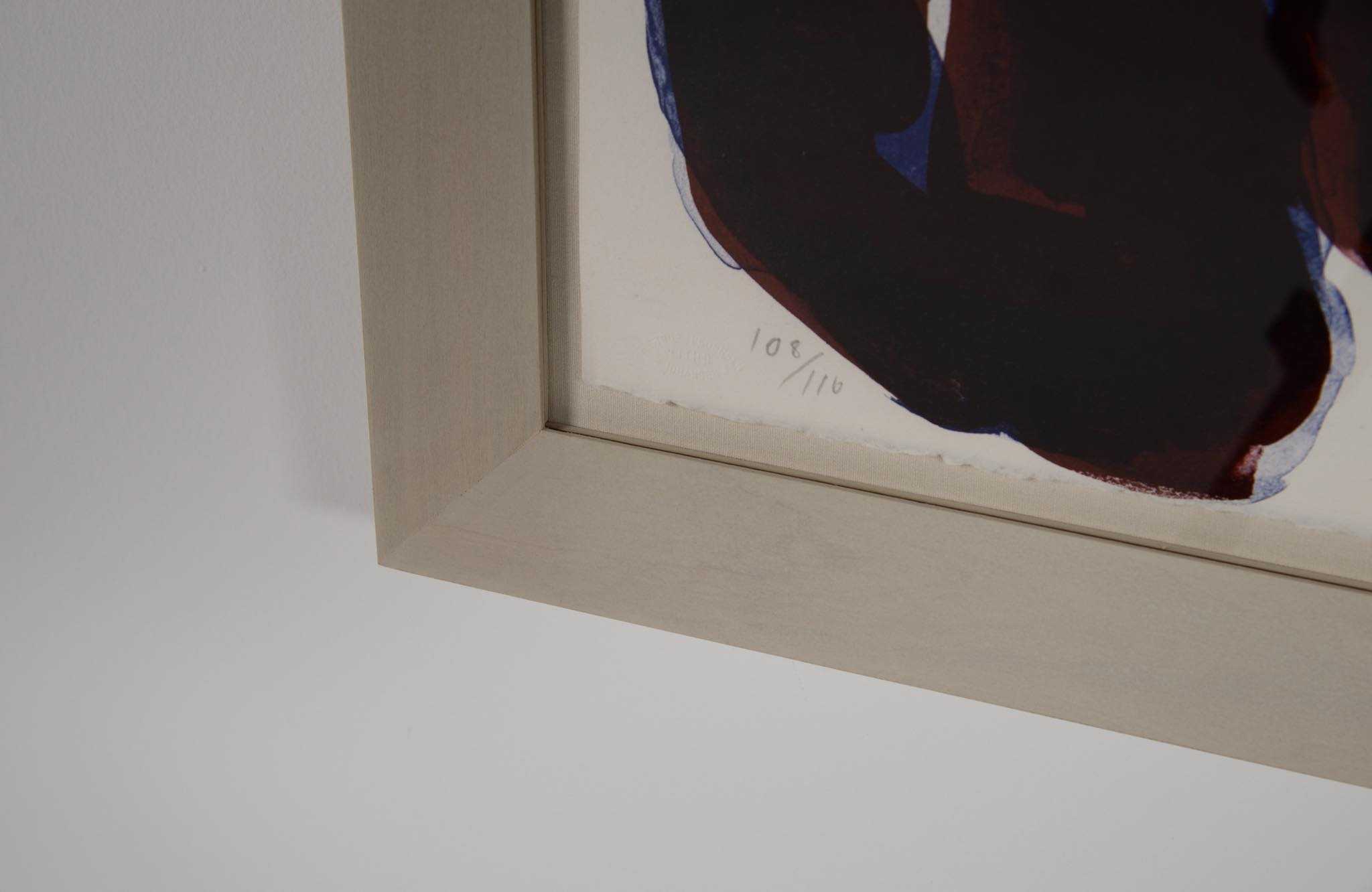 20世紀に活躍したデンマークの芸術家、モーエンス・アナセンによるリトグラフ作品、1991年に制作されたものです。太くダイナミックなストロークで描かれた抽象的な作風は独自の世界観を表現しています。黒色をベースに青色と深い朱赤色を背後に重ねた表現で、存在感のある飾りやすいサイズです。マットな濁白木製フレームで整えました。コントラストの美しい作品です。