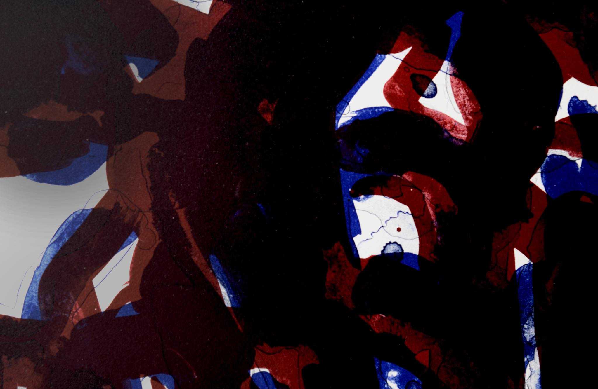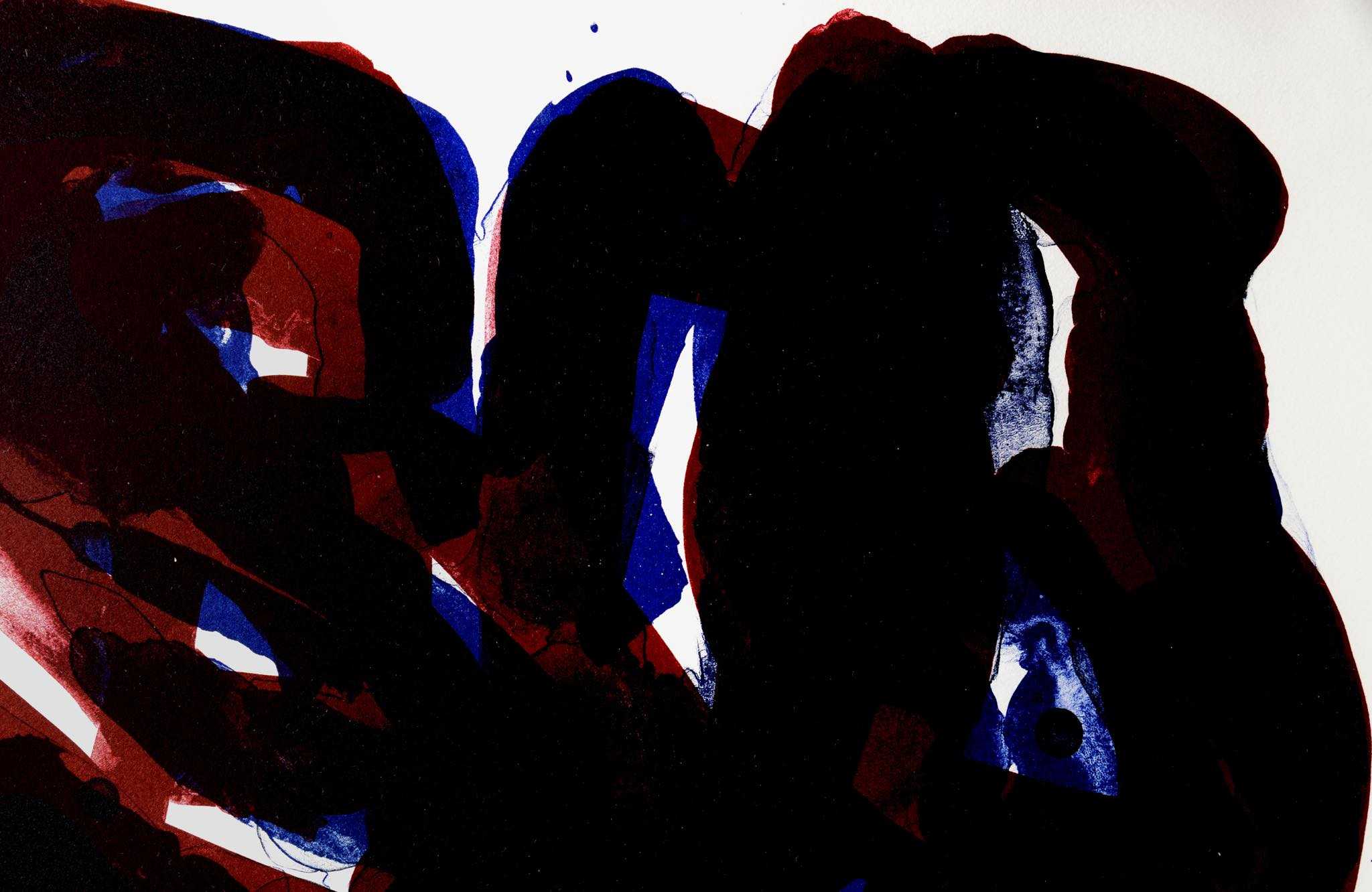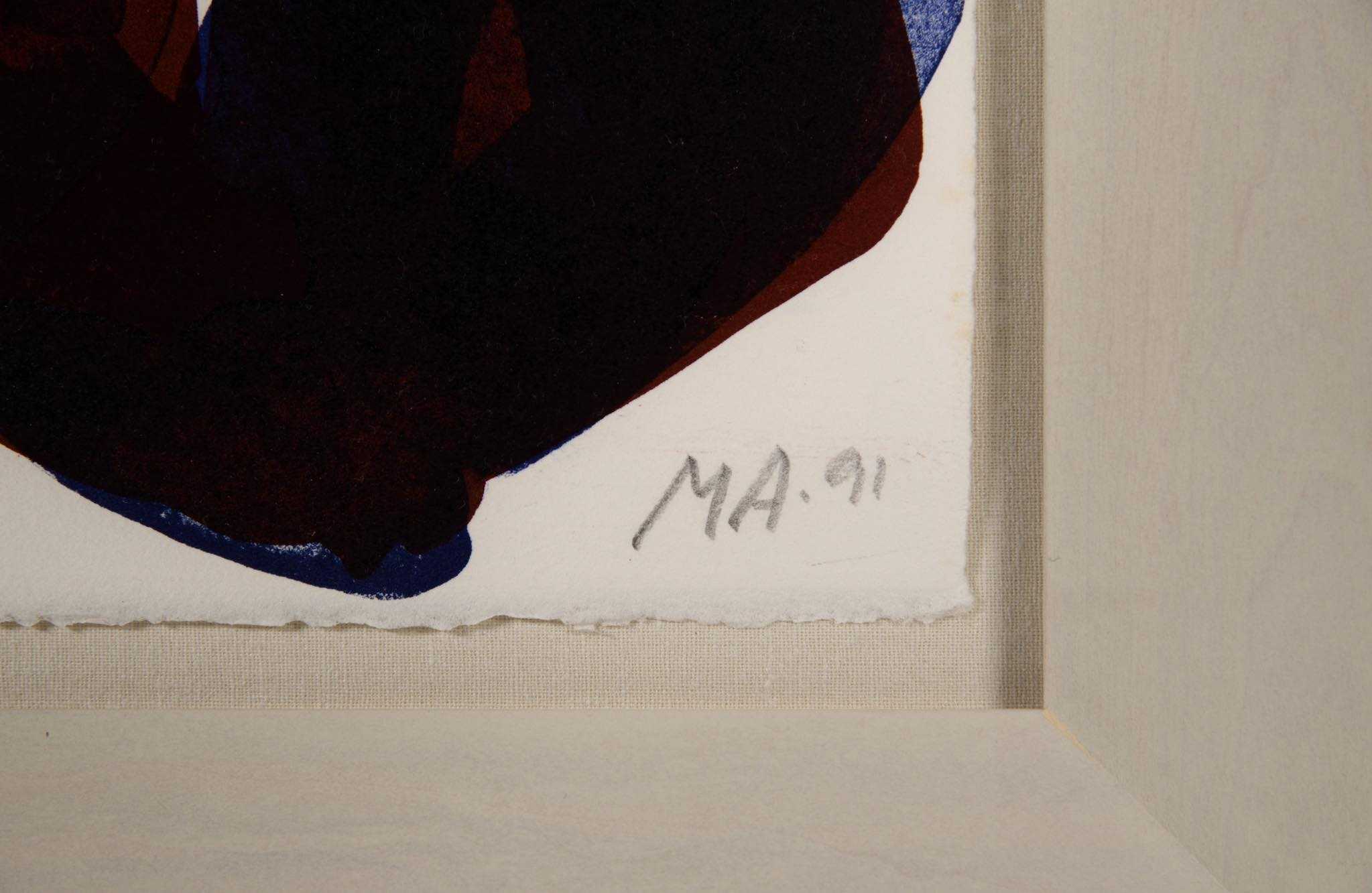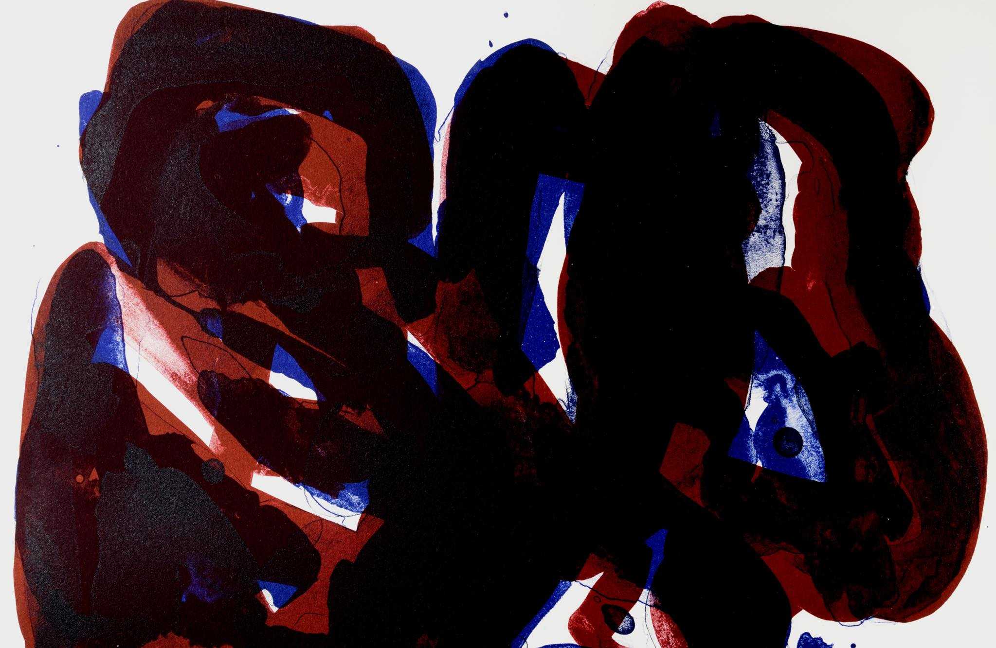20世紀に活躍したデンマークの芸術家、モーエンス・アナセンによるリトグラフ作品、1991年に制作されたものです。太くダイナミックなストロークで描かれた抽象的な作風は独自の世界観を表現しています。黒色をベースに青色と深い朱赤色を背後に重ねた表現で、存在感のある飾りやすいサイズです。マットな濁白木製フレームで整えました。コントラストの美しい作品です。