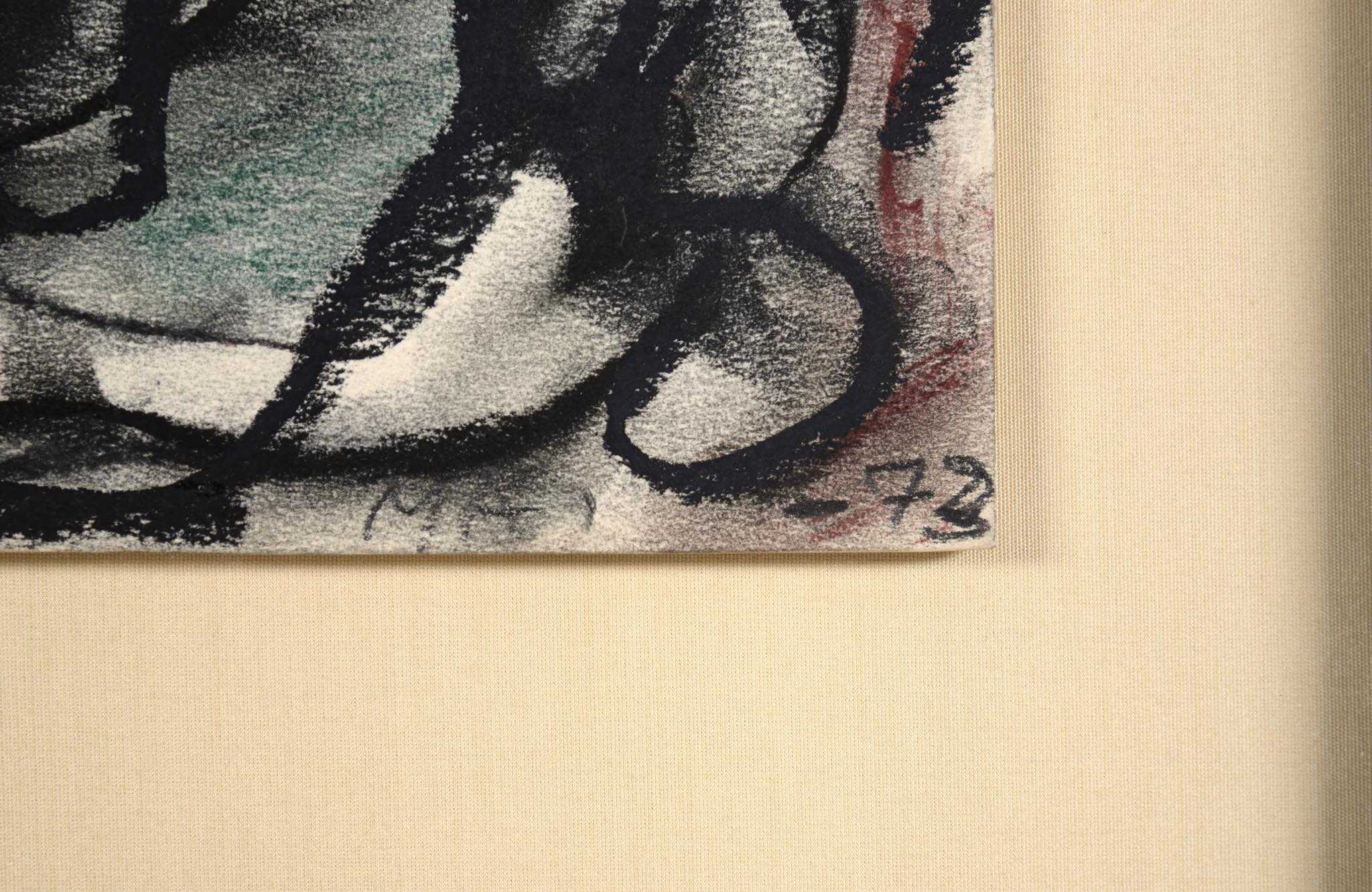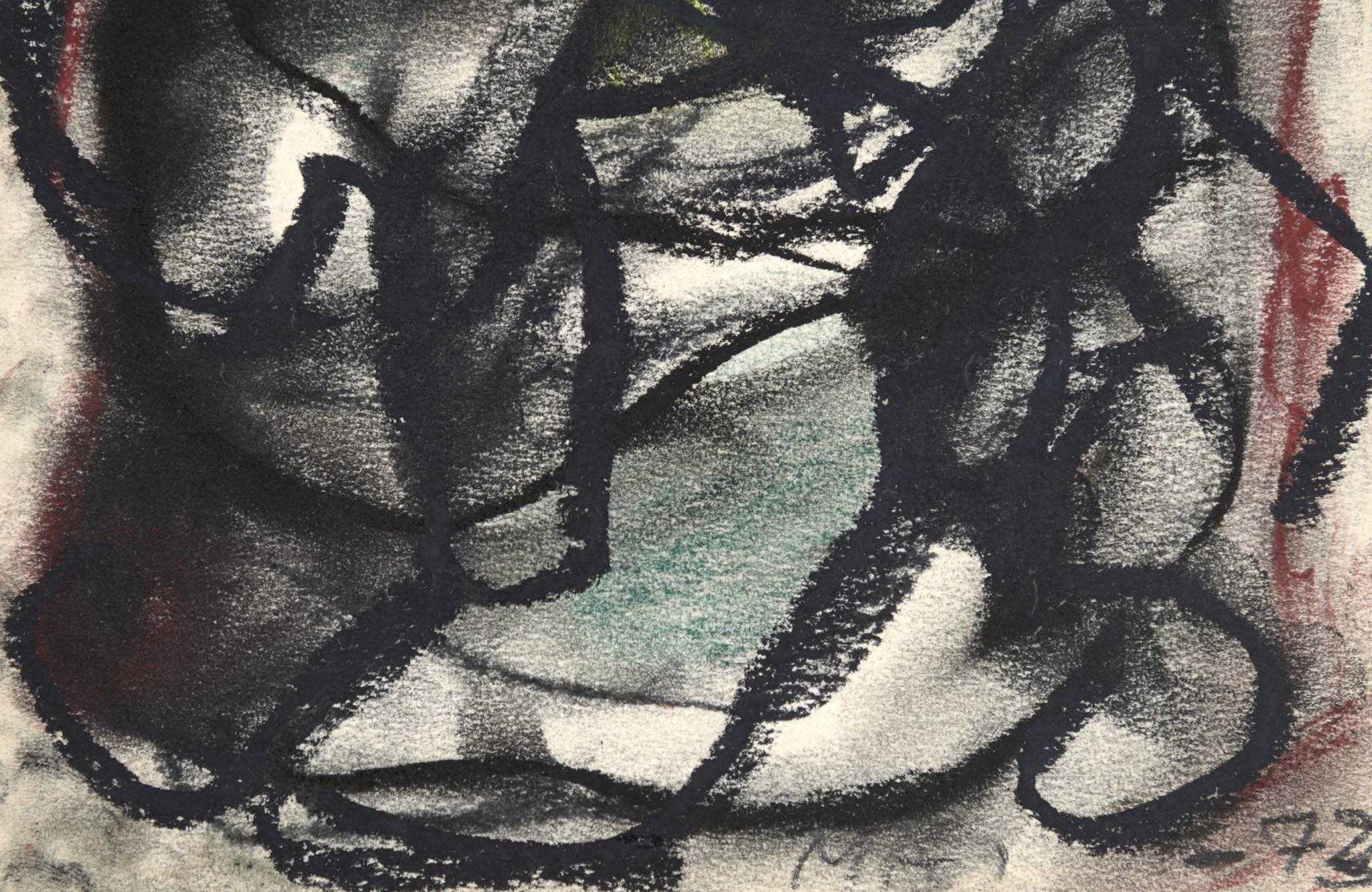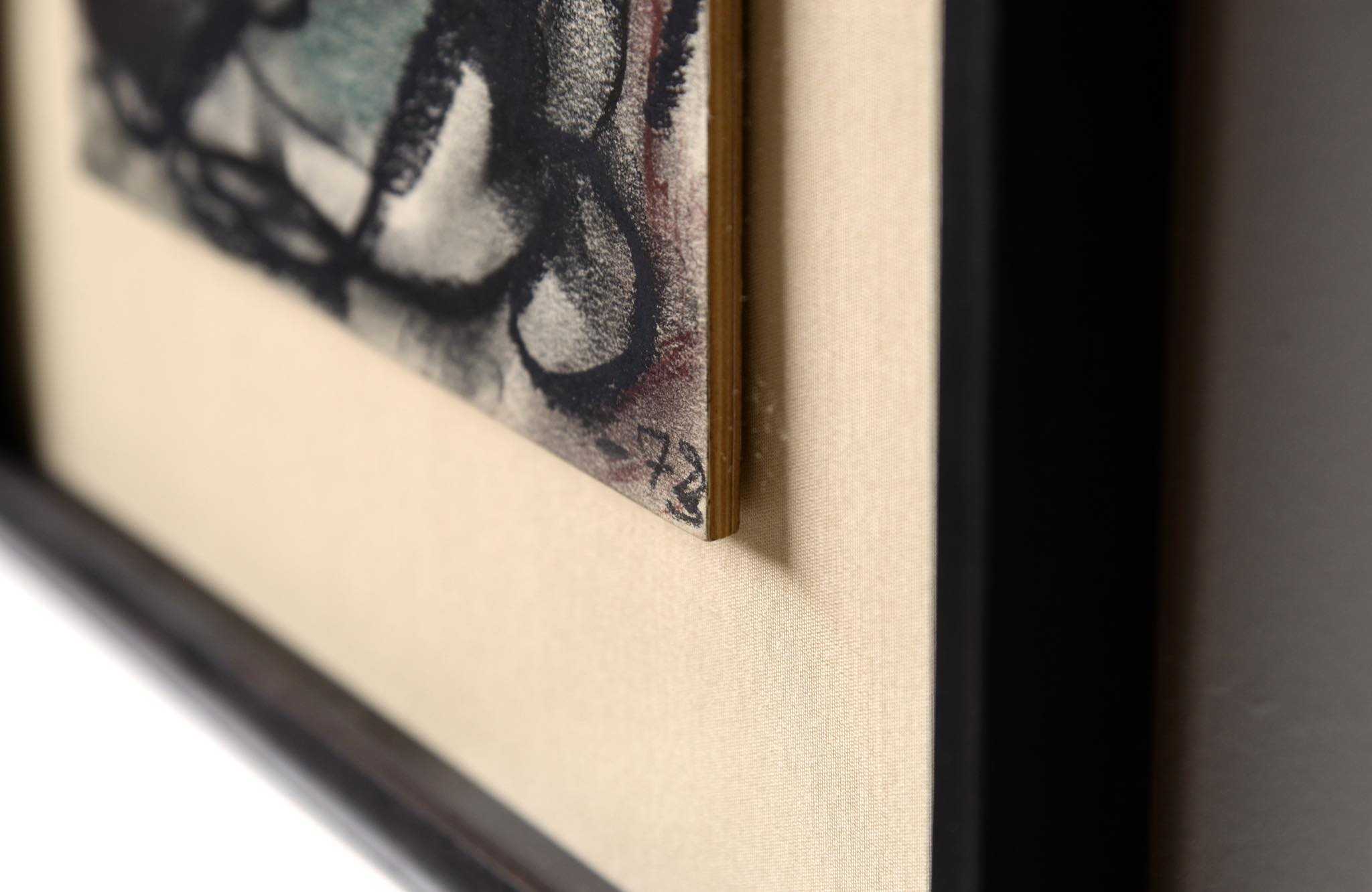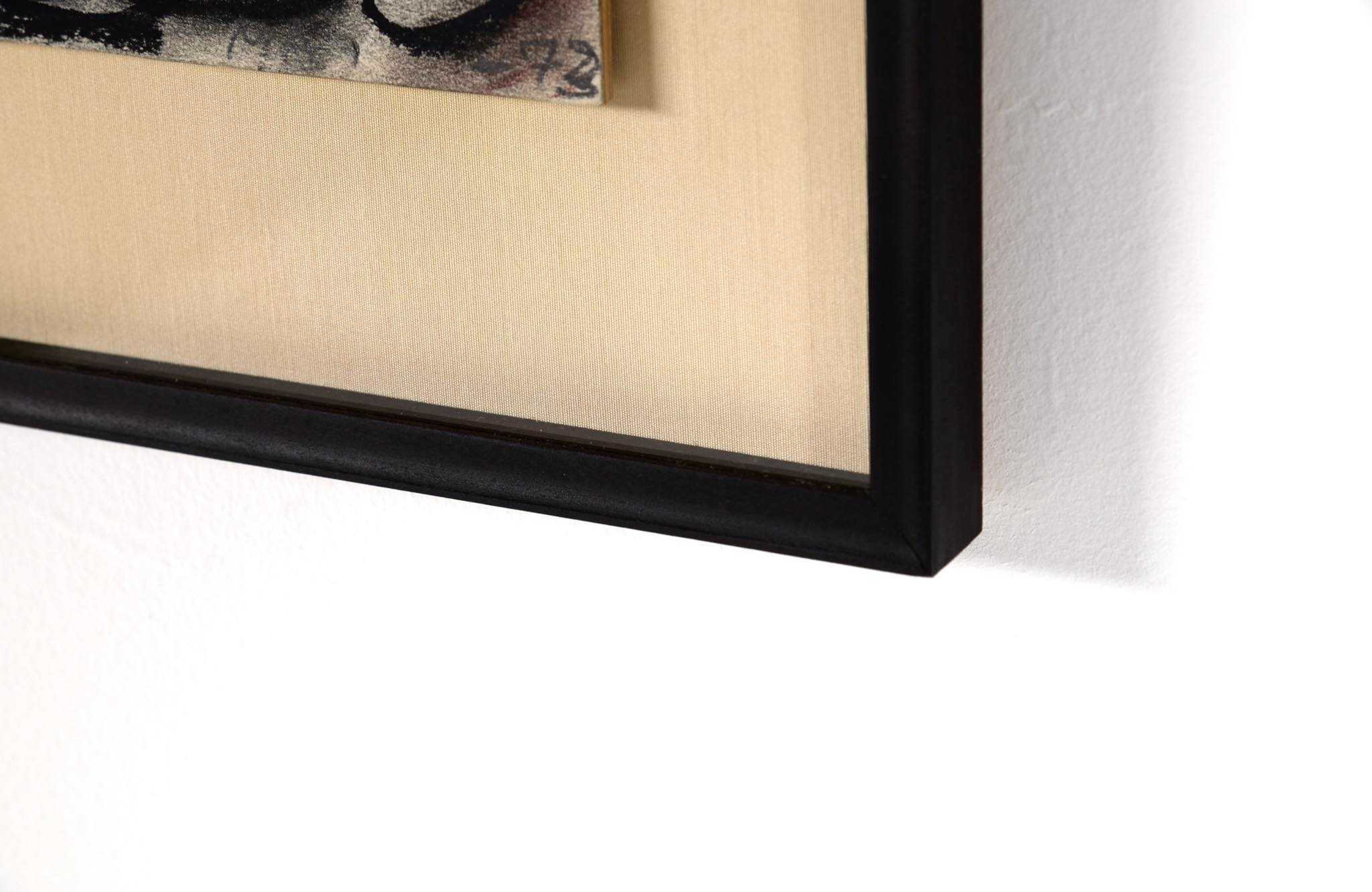 20世紀に活躍したデンマークの芸術家、モーエンス・アナセンによるドローイング、1973年に描かれた作品です。オイルスティックを用いてカードボードに描かれており、モノクロームの強調線の背後に複数のぼかした色を差しています。フレームは新たに誂えました。余白を残さない作風に存在感があります。