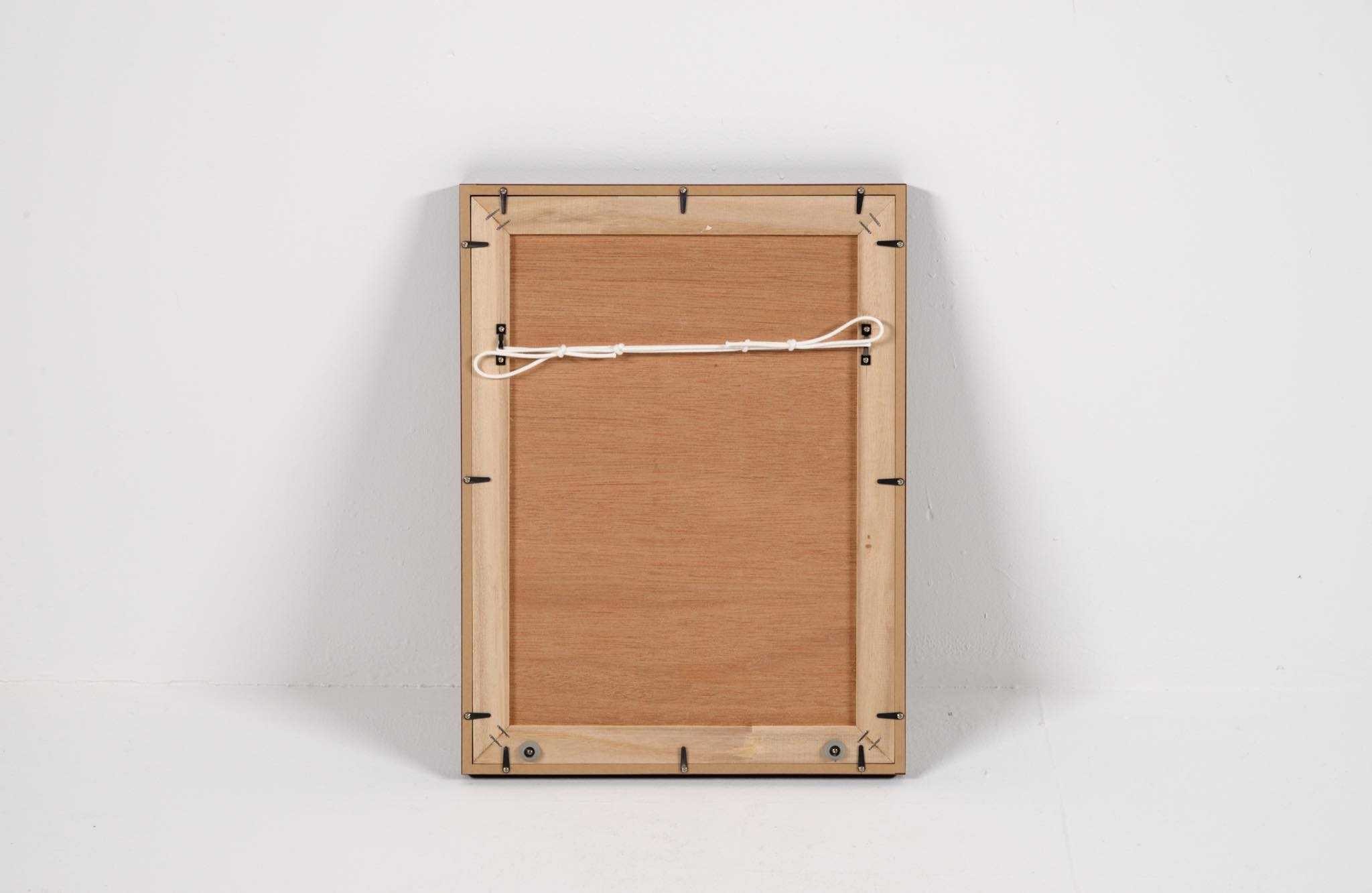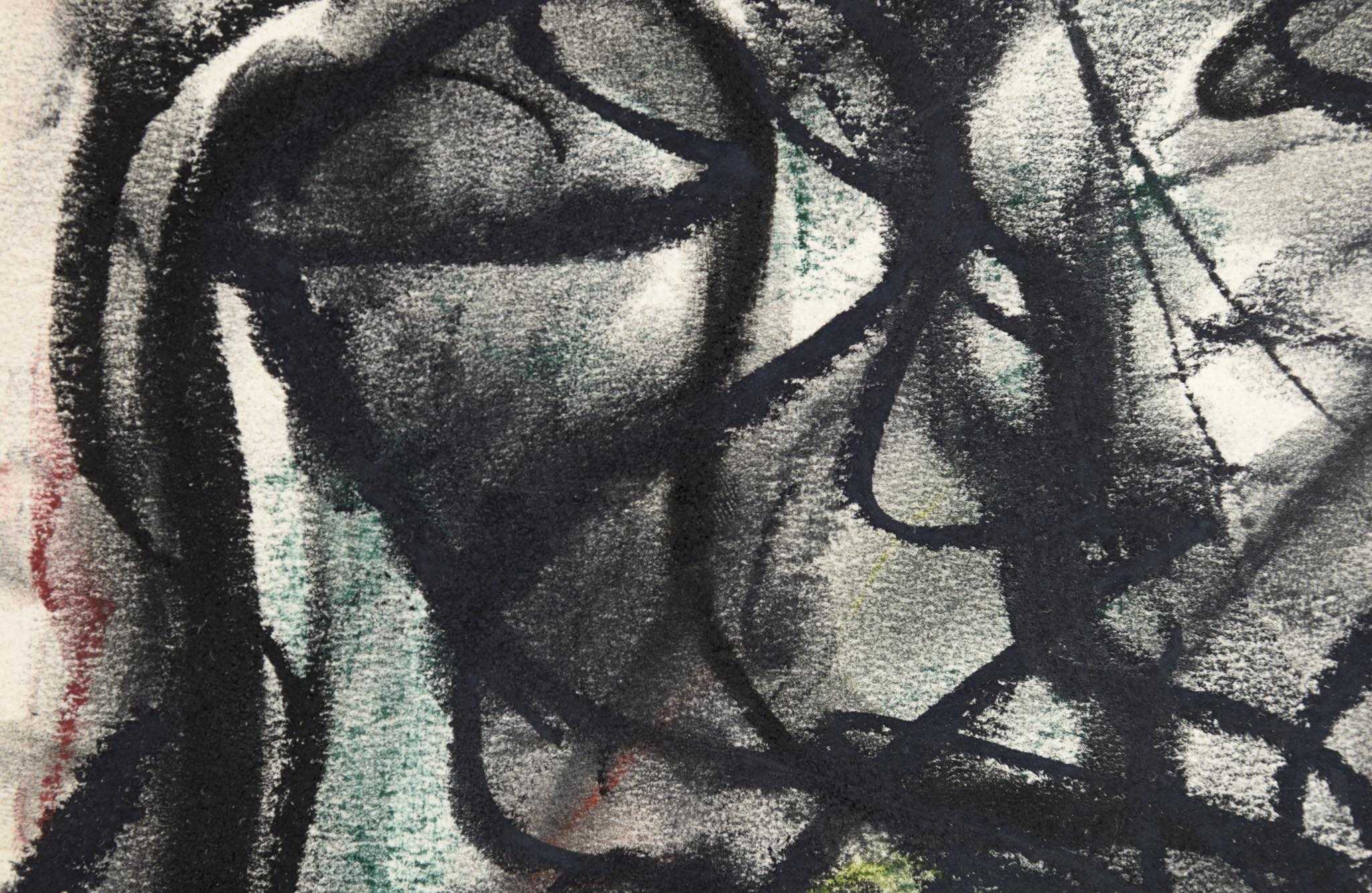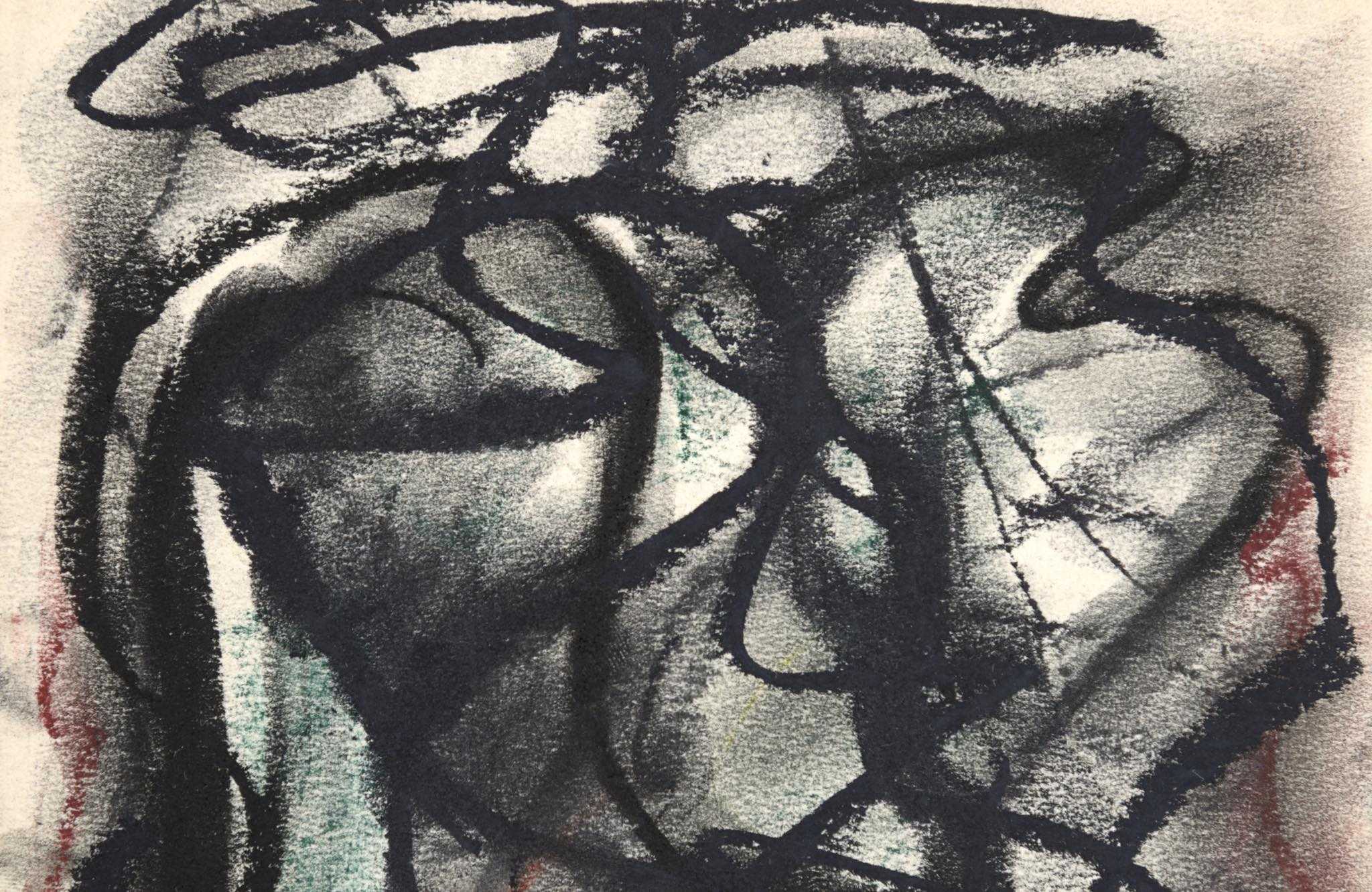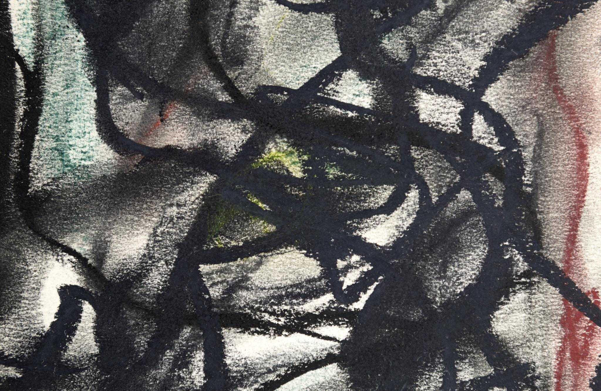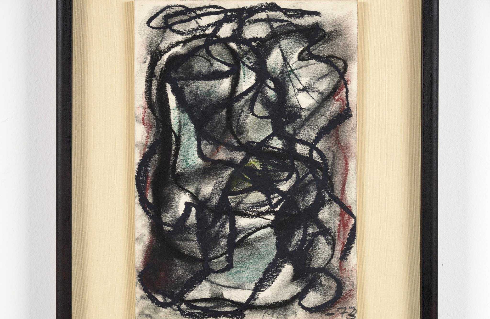 20世紀に活躍したデンマークの芸術家、モーエンス・アナセンによるドローイング、1973年に描かれた作品です。オイルスティックを用いてカードボードに描かれており、モノクロームの強調線の背後に複数のぼかした色を差しています。フレームは新たに誂えました。余白を残さない作風に存在感があります。