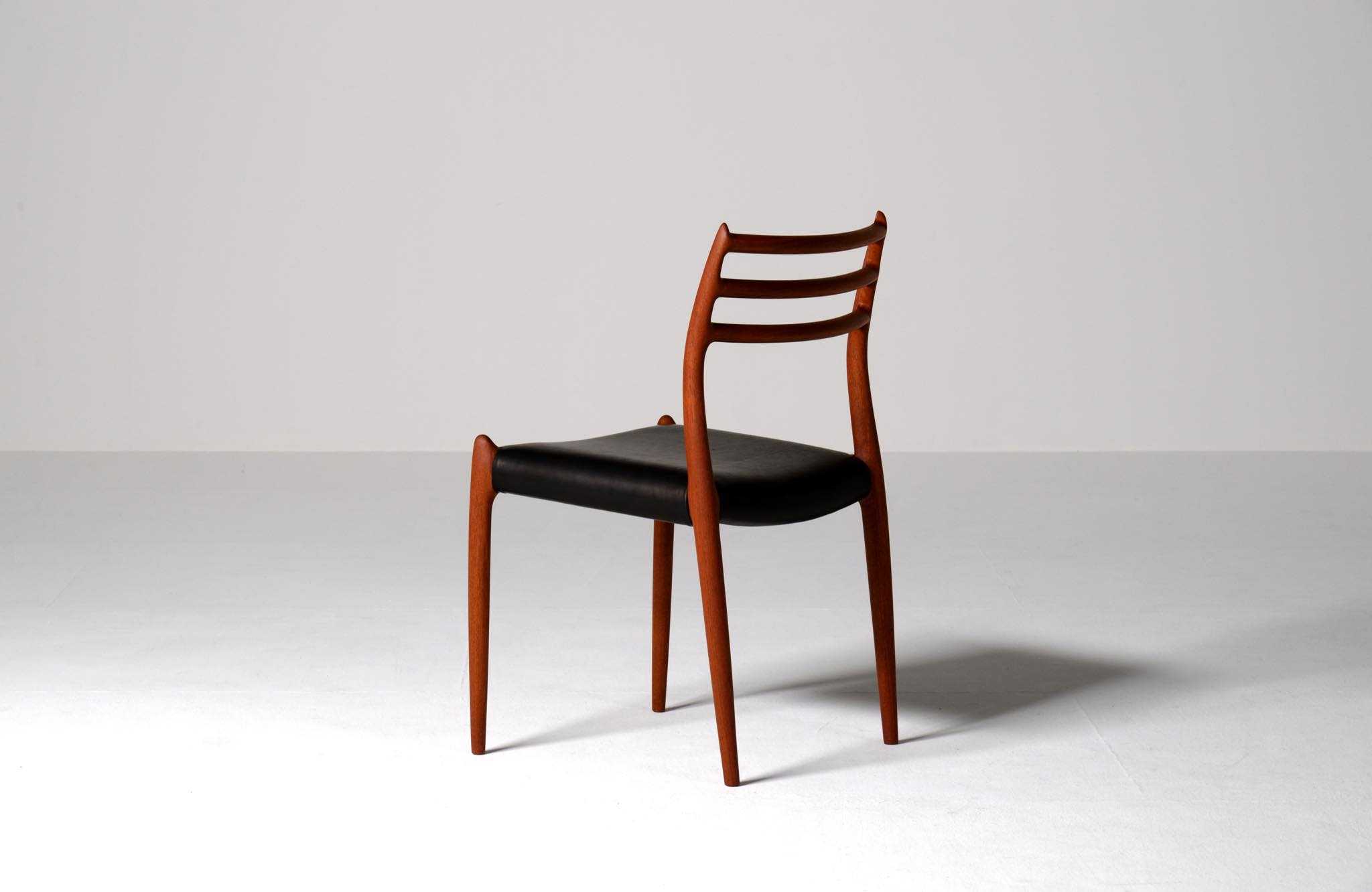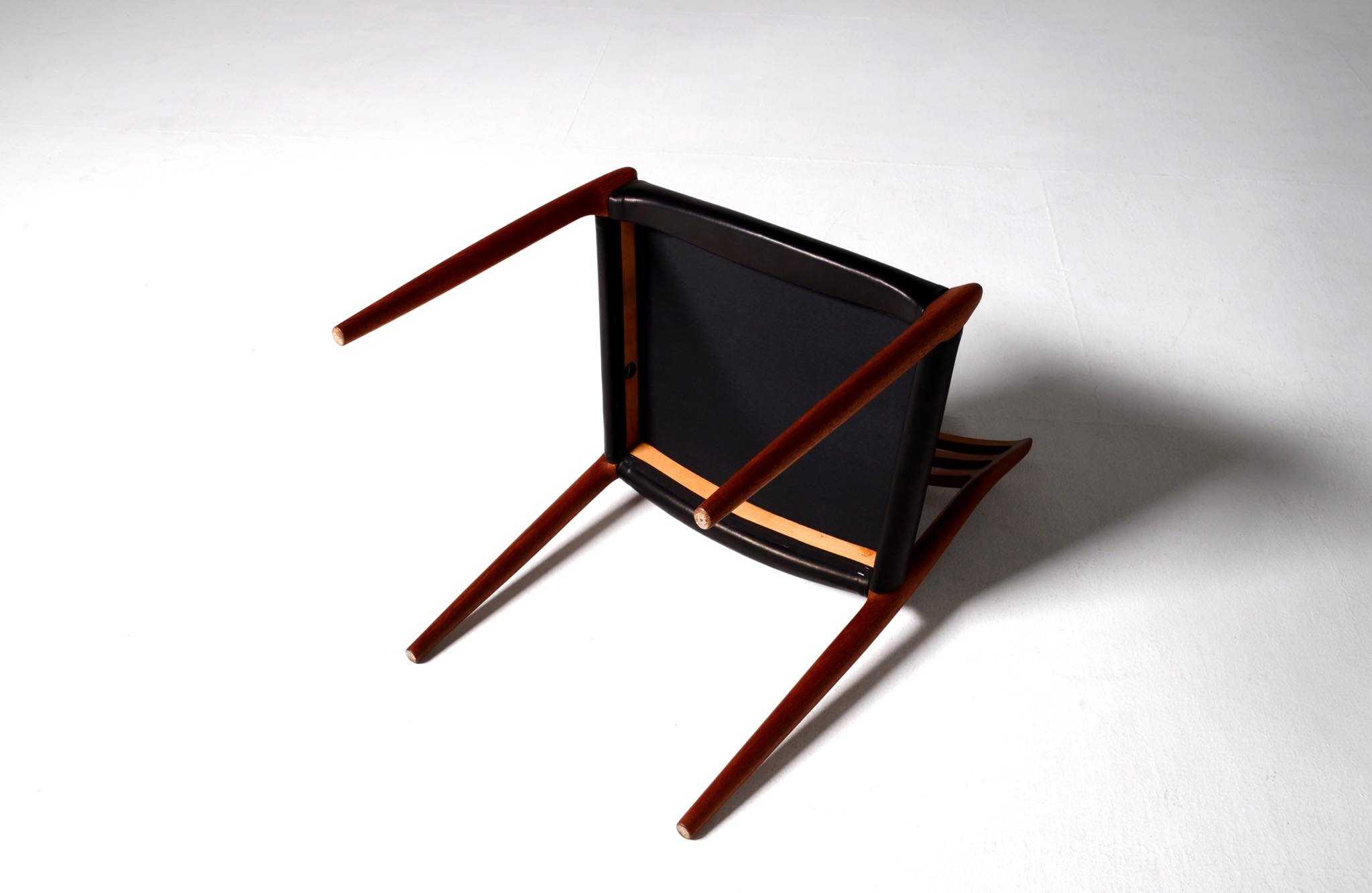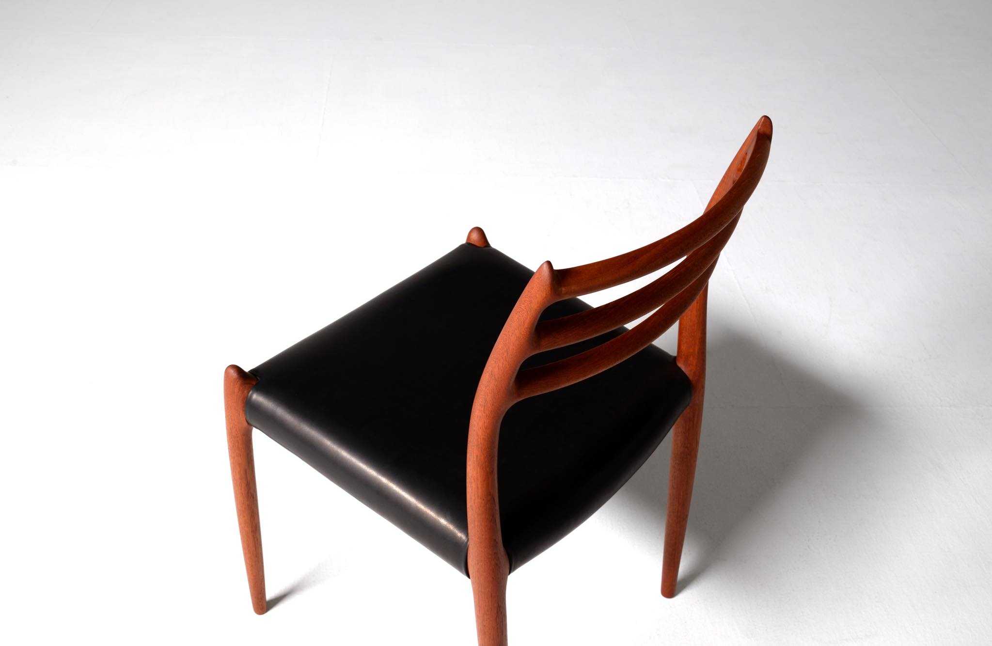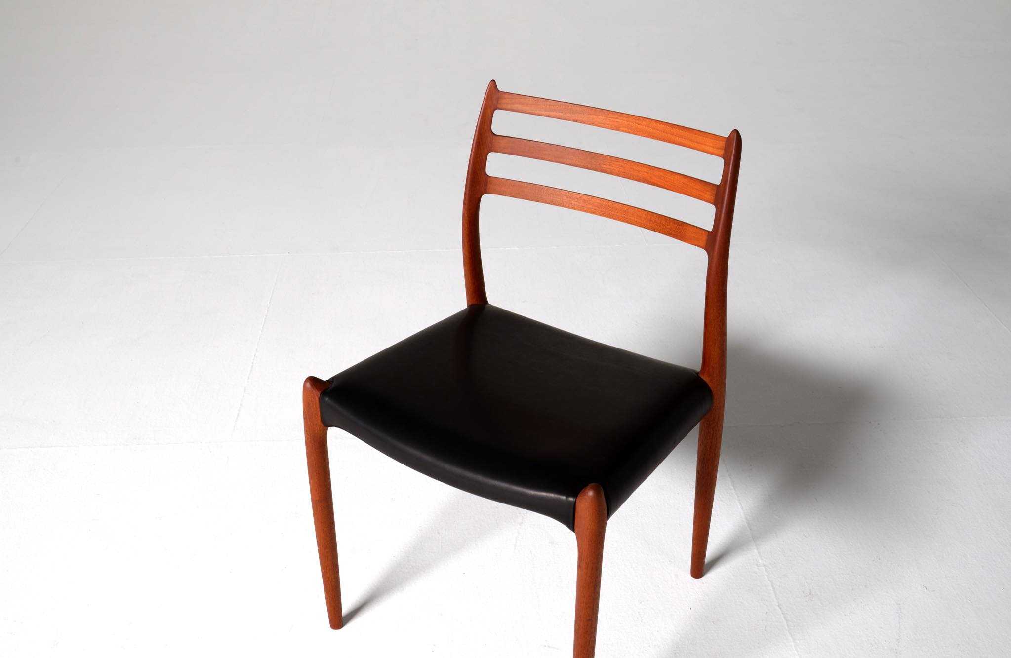 デンマークの家具工房、J.L.Møller/J.L.モラーによるダイニングチェア "model 78" です。創業者のN.O. Moller/ニルス・オット・モラーによってデザインされたモデルで、1960〜80年代頃に作られたものでしょう。良質なチークの天然木が用いられていたこの当時の作品は、木材そのものに強度があったため、現行モデルに比べ細く作られているようです。座面はデンマークのCAMO leather社による黒皮革にて張り替えを行いました。