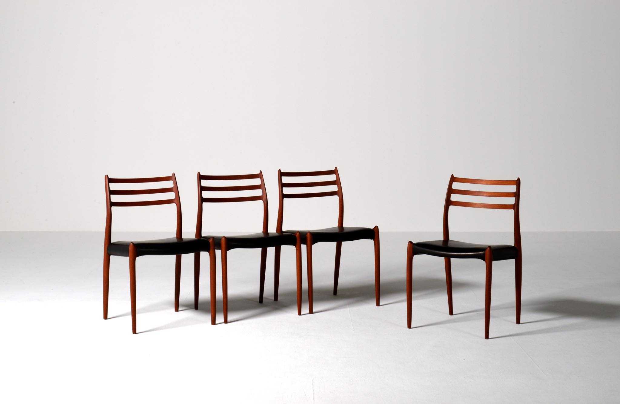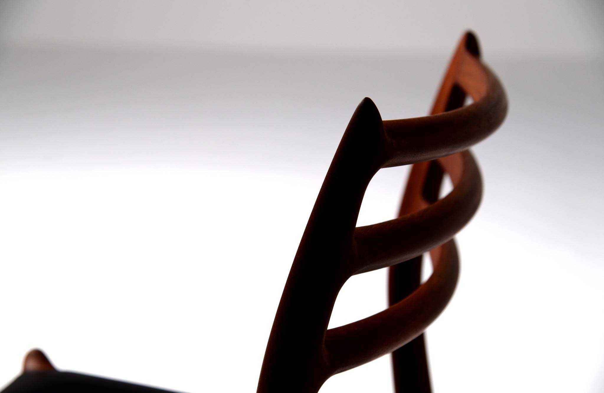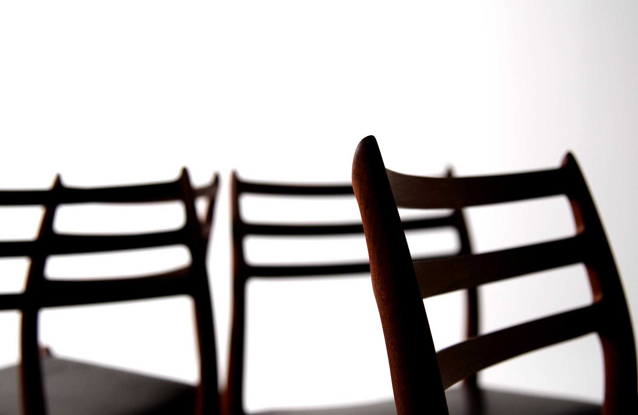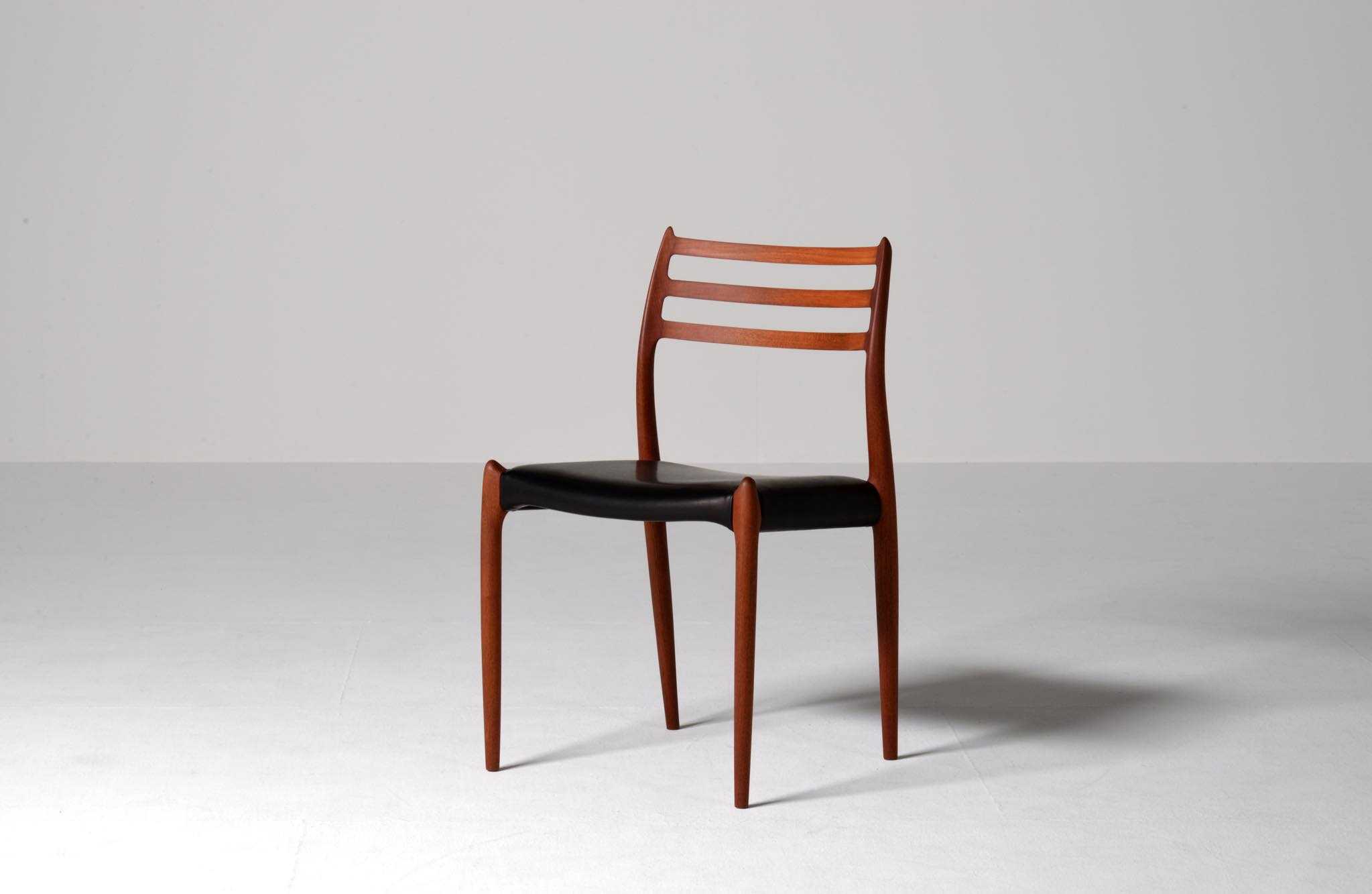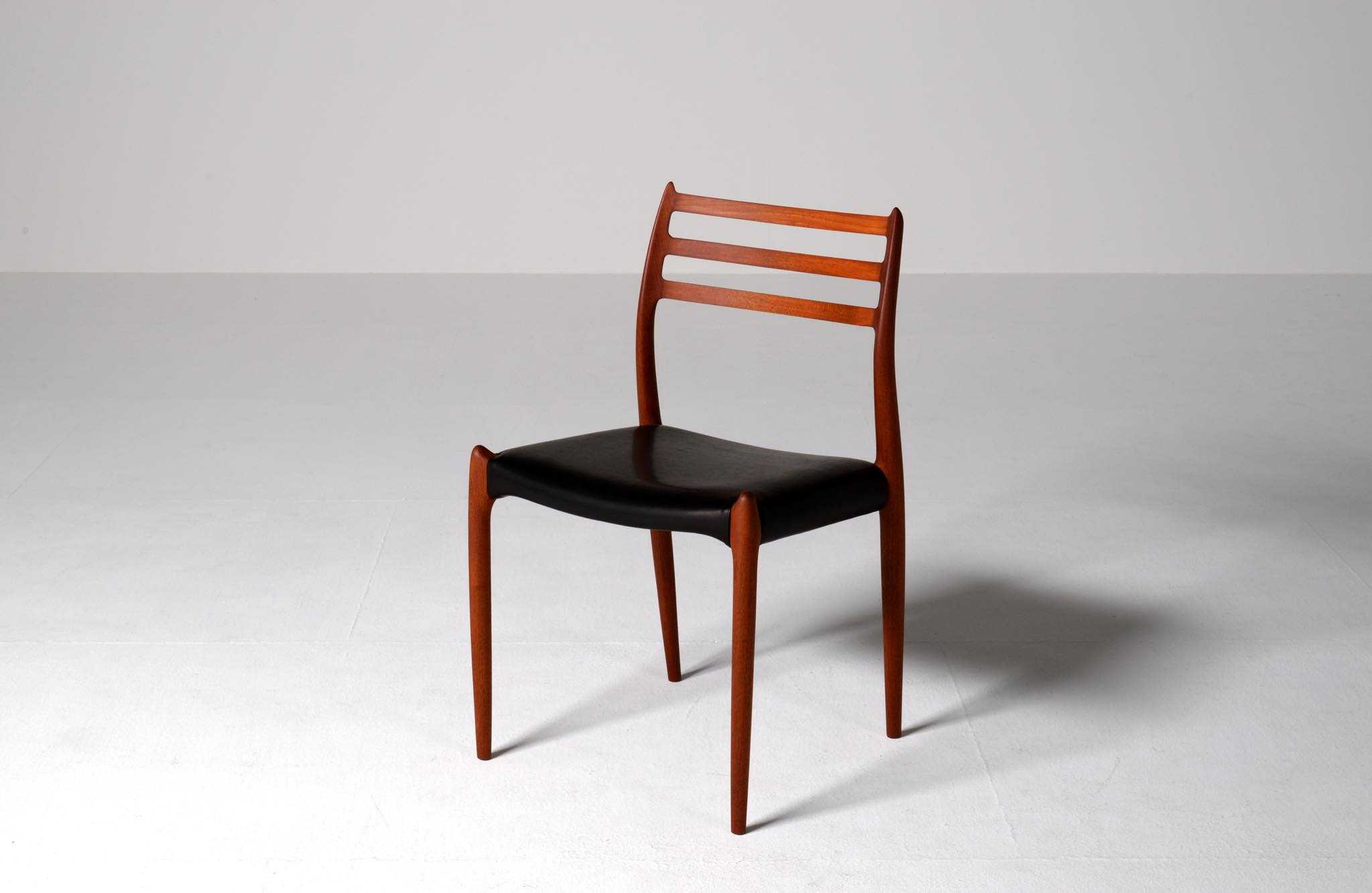 デンマークの家具工房、J.L.Møller/J.L.モラーによるダイニングチェア "model 78" です。創業者のN.O. Moller/ニルス・オット・モラーによってデザインされたモデルで、1960〜80年代頃に作られたものでしょう。良質なチークの天然木が用いられていたこの当時の作品は、木材そのものに強度があったため、現行モデルに比べ細く作られているようです。座面はデンマークのCAMO leather社による黒皮革にて張り替えを行いました。