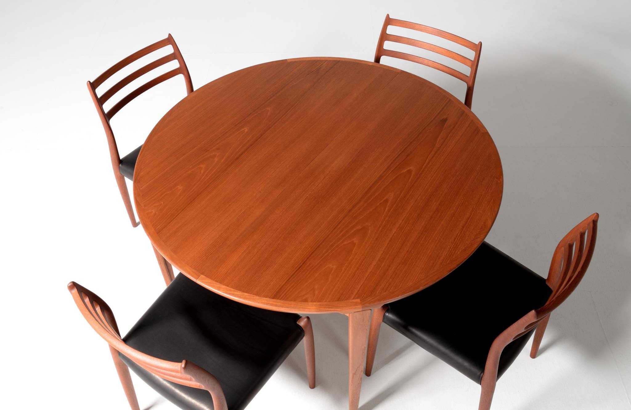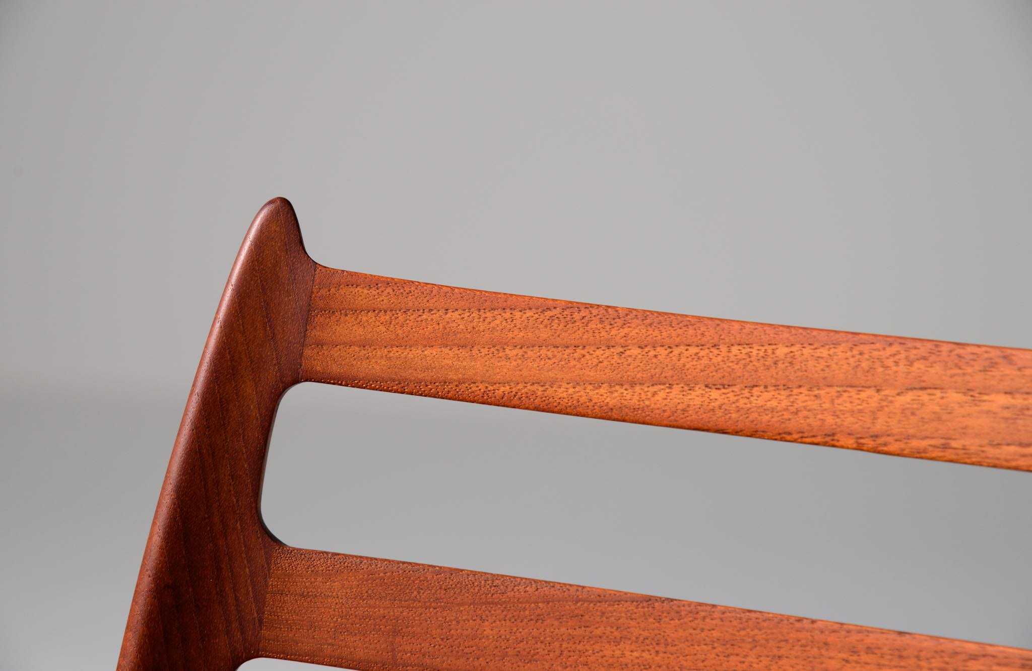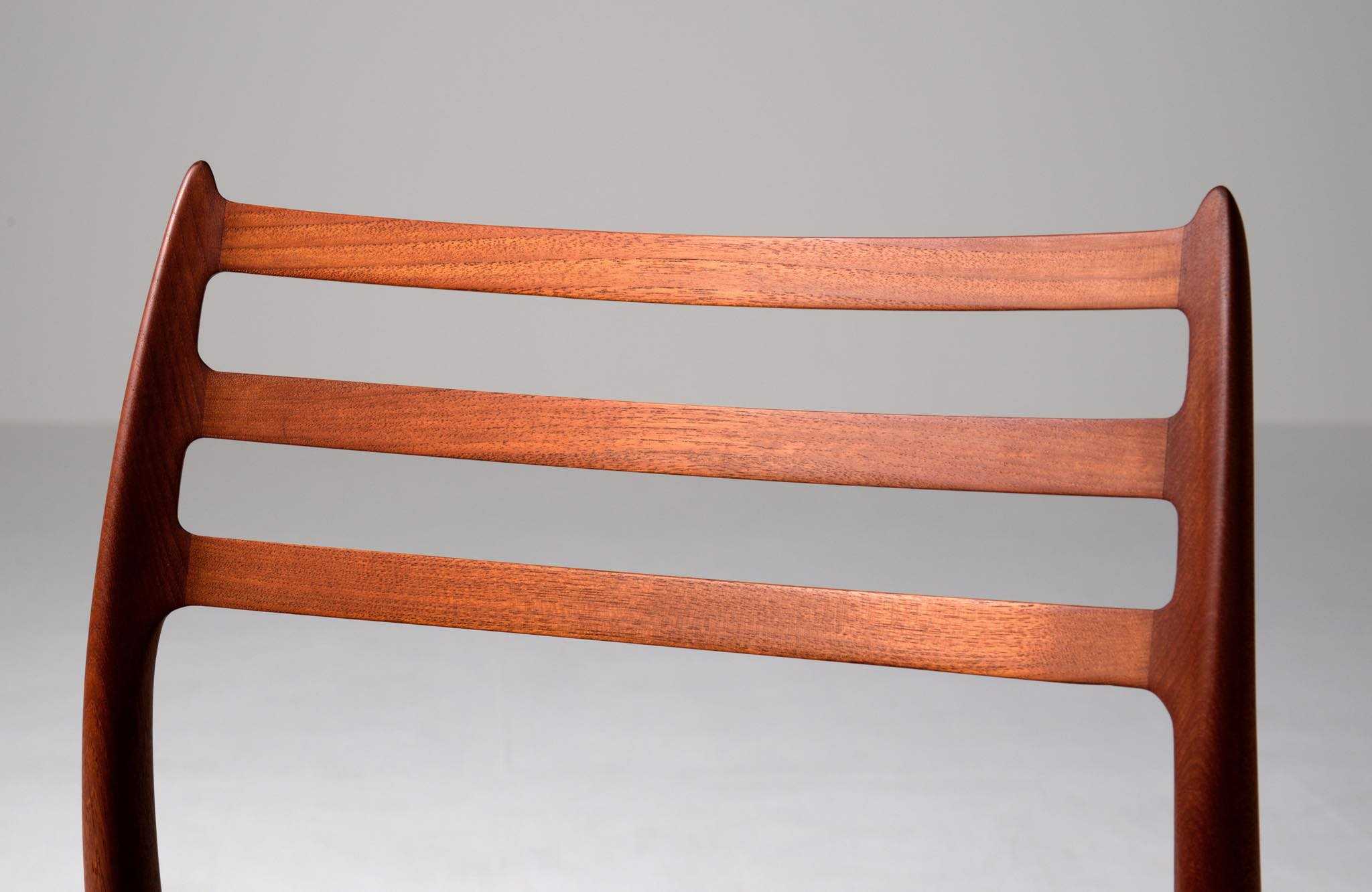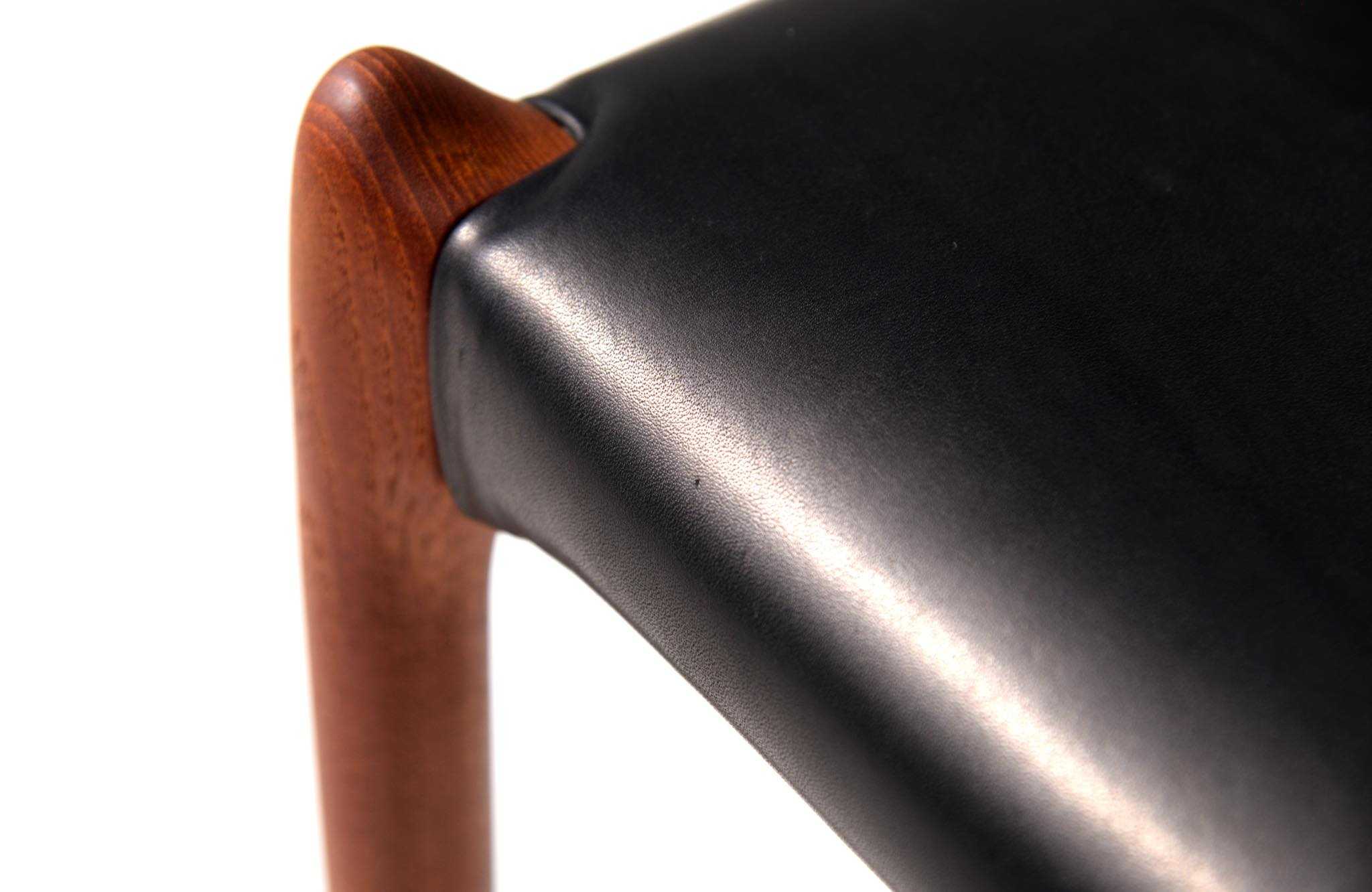 デンマークの家具工房、J.L.Møller/J.L.モラーによるダイニングチェア "model 78" です。創業者のN.O. Moller/ニルス・オット・モラーによってデザインされたモデルで、1960〜80年代頃に作られたものでしょう。良質なチークの天然木が用いられていたこの当時の作品は、木材そのものに強度があったため、現行モデルに比べ細く作られているようです。座面はデンマークのCAMO leather社による黒皮革にて張り替えを行いました。
