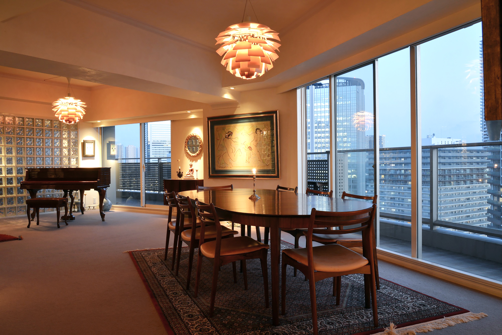 料理研究家の行正り香さんはインテリアにも造詣が深く、デンマーク家具を中心にコーディネートされています。マンションの一室をリノベーションし、その空間にはLED照明は一切使わず、昔ながらの白熱ハロゲン灯のダウンライトを用い、漆喰塗りの天井と壁、フロア一面に敷き詰められた絨毯など、心地よく過ごせる工夫がなされています。ローズウッドのダイニングやサイドボード、オーレ・ヴァンシャーのコーヒーテーブルなどを納品させていただきました。