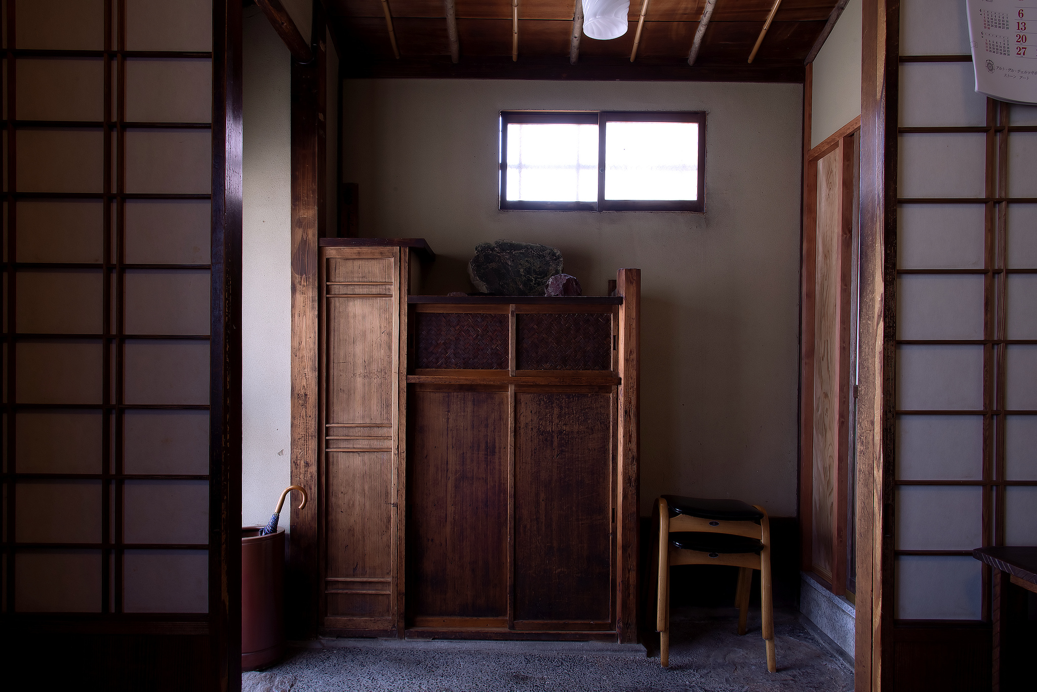 昭和初期に建てられた腰壁のある京町家、なるべく改装を加えず、当時のままの姿を保っています。時間の経過した土壁には須田剋太の書が掛けられ、座敷には音丸耕堂の塗りの座卓にイサム・ノグチの灯り、李朝の棚には時代の陶磁器や工芸品が並びます。奥庭のつくばいには水が張られ、時折、野鳥が水浴びにやってきます。ハンス・ウェグナーによるキューバンマホガニーのチャイナチェア、 J.L. Møllerのmodel78などを納品させていただきました。
