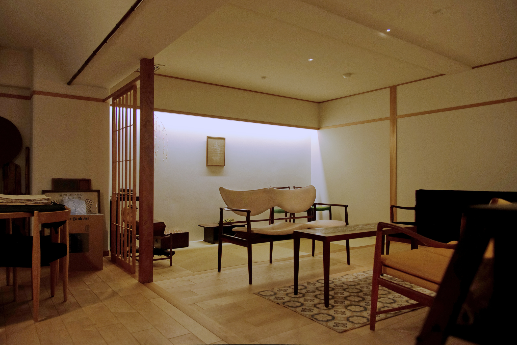 京都縄手通に位置する古美術店/アートギャラリーのSHINYAさんは、明治、大正、昭和、そして現代に至る日本人作家の美術工芸作品 (金工・七宝・漆芸・木竹工) を取り扱っておられます。日本美術を鑑賞する場に、北欧の家具がしっくりと馴染み役立っています。デンマークのデザイナー、ステファン・シュラック・ラーセンのイージーチェア、オーレ・ヴァンシャーのセッティ、トラネケアの寄木のテーブル、 J.L. Møllerなどをお納めさせていただきました。