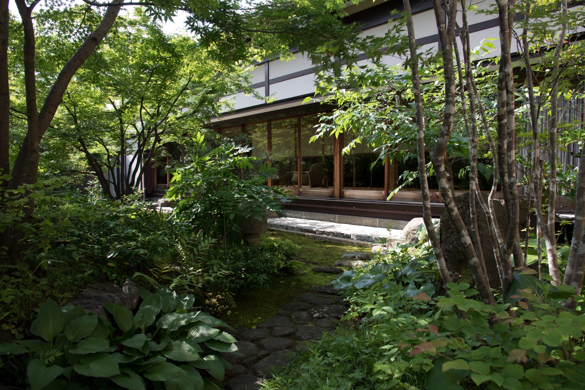 F邸の続き、part4です。近年、お隣の敷地が空いたとのことで、お庭を広くひとつに整え、やや高台となるよう盛土を行いティールームを増築されました。ティールームは文字通り紅茶を嗜んだり、椅子に座ってお茶会を開くための建物です。巨大な一枚ガラスは発注当時は最大級のものだそうで、季節の草花を楽しむお庭が仕切り無しで一望できます。お部屋を軽く仕切るための透かしの可動式パーテーションはご主人がデザインされたもので、軽やかな雰囲気ですが重厚な鋼鉄白色塗装で作られており、宙に舞うような軽快なデザインと重厚な素材との融合が前衛的です。このパーテーションは来客によって開閉されます。お庭の飛び石には奈良大官大寺の礎石が配置され、また、垣根の外の車寄せには、かつて京都の市電に使われていた敷石を敷き詰めるなど、様々な「歴史」を楽しまれています。