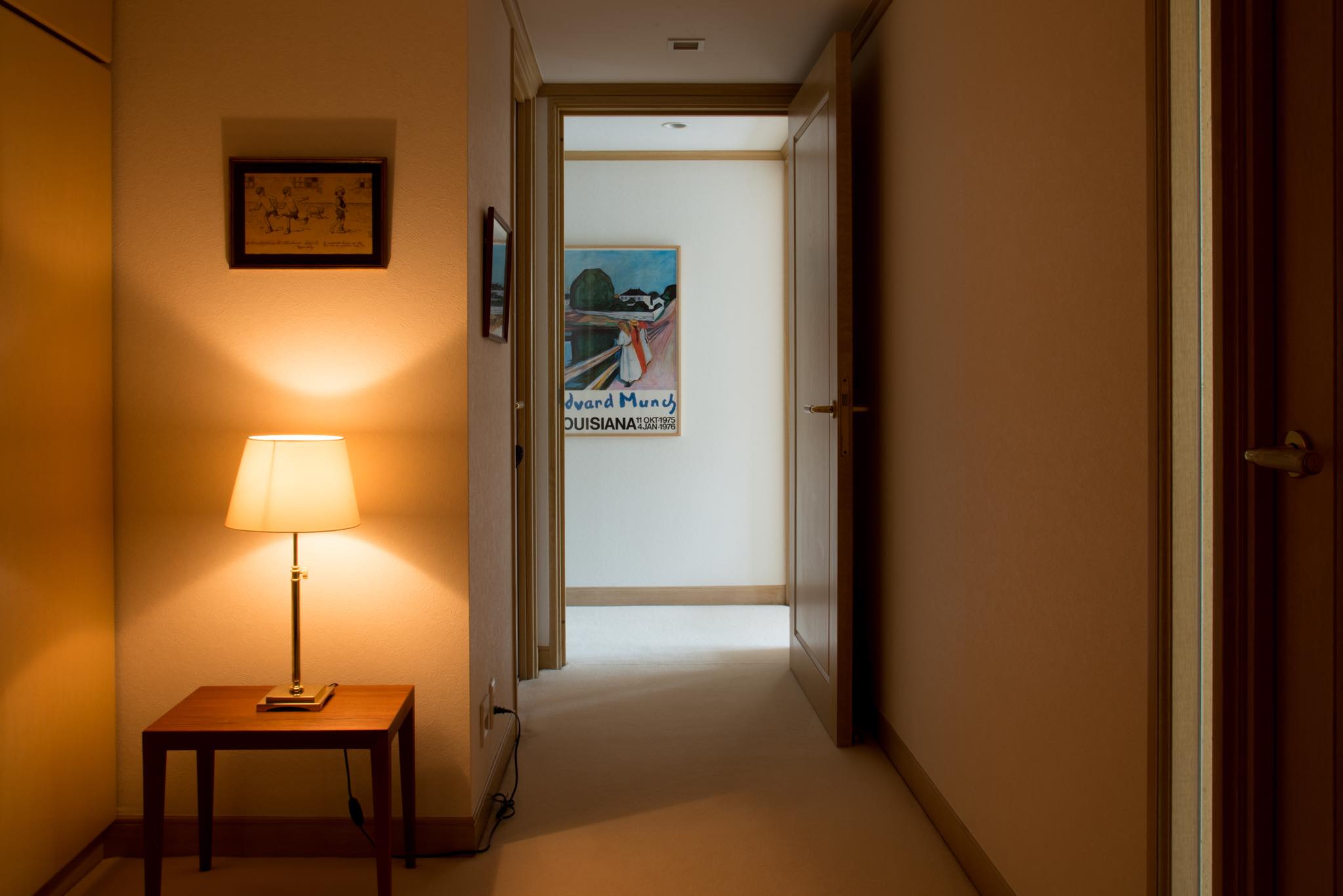 広大な敷地を有する都心のヴィンテージマンション。リビングやダイニングの床面積がとても広く、家具をゆったりと配置し優雅に暮らされています。昨年引越しを検討されたものの、最近建てられたマンションではここまでの広さのお部屋はなかなか見つけられず、そのまま住まわれているそうです。19世紀から20世紀初頭頃に活躍したデンマークの画家、ルイ・モエやソーレン・クリスチャン・ビュルフ、ハンス・スミスなどの古典的な絵画作品をはじめ、アクセル・ベンツェン、アクセル・サルト、スヴェン・サービュ、エレン・クラウセ・ロイルップなど、様々な20世紀前葉期のデンマーク絵画作品をお納めさせて頂きました。また、フリッツ・ヘニングセンのアームチェアやコーア・クリントのデスクなど、こちらも同時代の家具をお使い頂いております。玄関、ダイニング、リビング、寝室、書斎と、それぞれのシーンに合わせて絵画を掛けられ、空間ごとにストーリーが生まれています。安心感を感じさせる重厚な建物は、ゆっくりとした時間が流れているようです。
