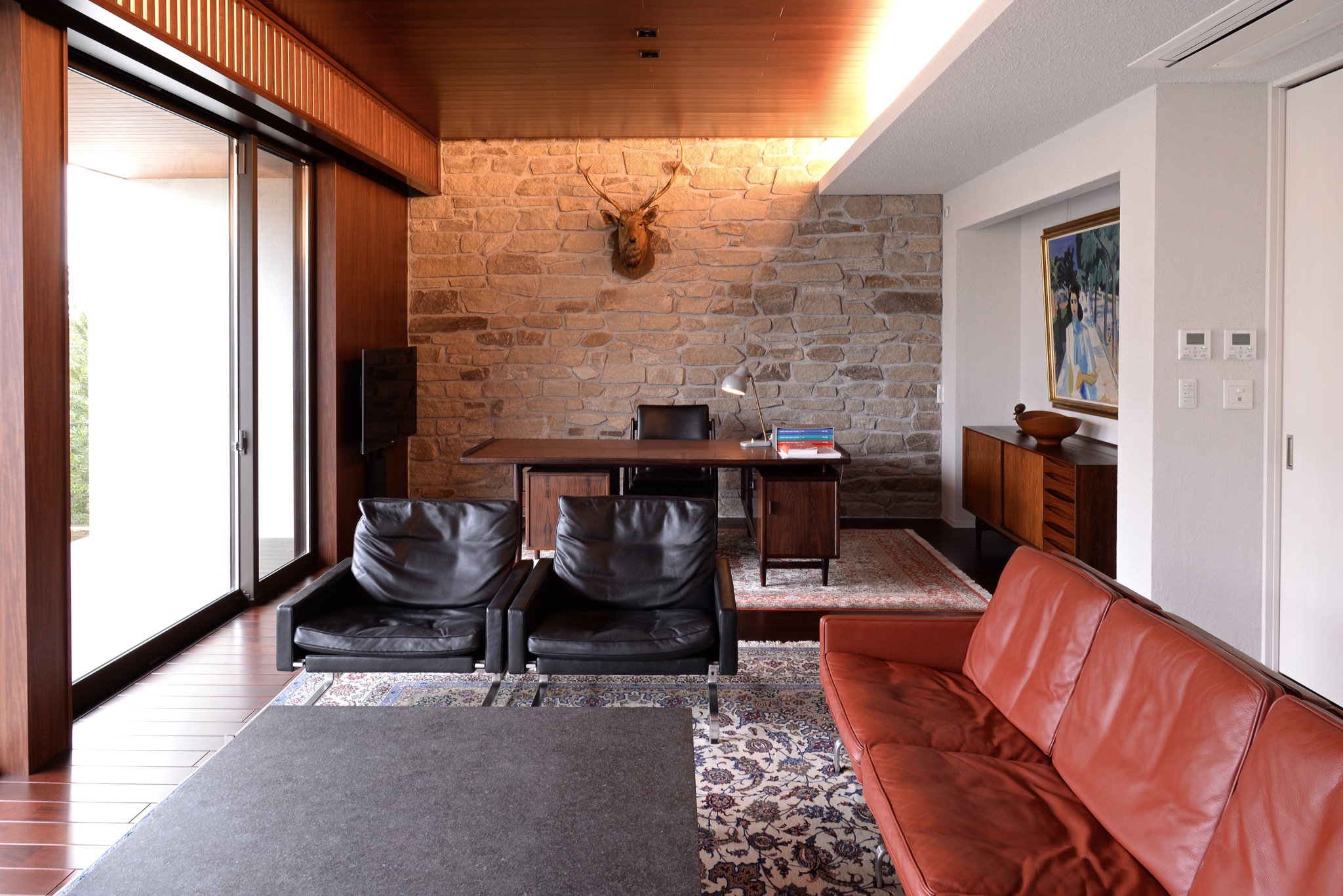 H社の続きです。宮城県の会社さんの応接室に、アクセル・ベンツェンの絵画や、アルネ・ヤコブセンの時計、モーエンス・コッホのシェルフ、ハンス・ウェグナーのオックスチェア、オーレ・ヴァンシャーのアームチェアやワークテーブルなどをお納めさせて頂きました。そのほか、日本が誇る大正時代の氷コップやユンハンスの漆塗りの振子時計、木彫の欄間、大きな鷹の剥製などがコレクションされており、日本文化とデンマークの家具工芸とが共鳴した見応えのある空間となっています。