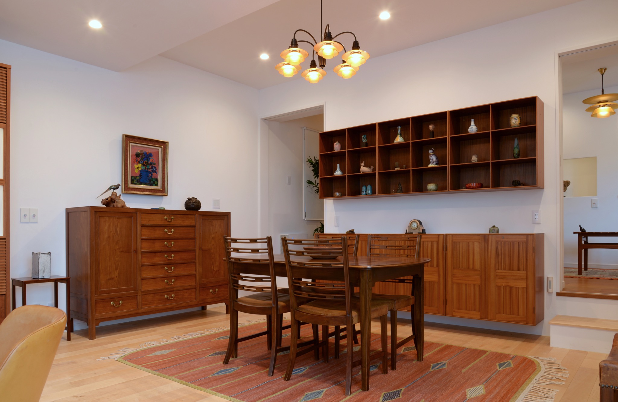 I 邸の続き、part2です。内装を全てリフォームしたコレクションルームには、世界の美術品や工芸品を陳列できるよう、大きめの棚を設えています。唐時代の壺や、ルーシー・リーのボウル、明治時代の七宝の一輪挿し、中東からの出土品、李朝の瓶子など、古今東西様々な美術工芸品が並びます。オーレ・ヴァンシャーのダイニングや、イップ・コフォド・ラーセンのエリザベスチェア、ポール・ヘニングセンのPHランプ、スヴェン・ハマスホイのベースなどをお納めさせて頂きました。