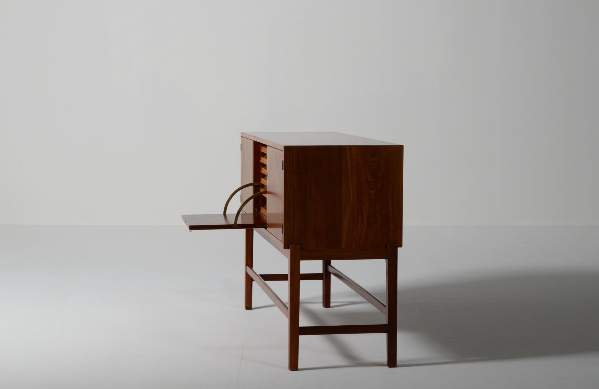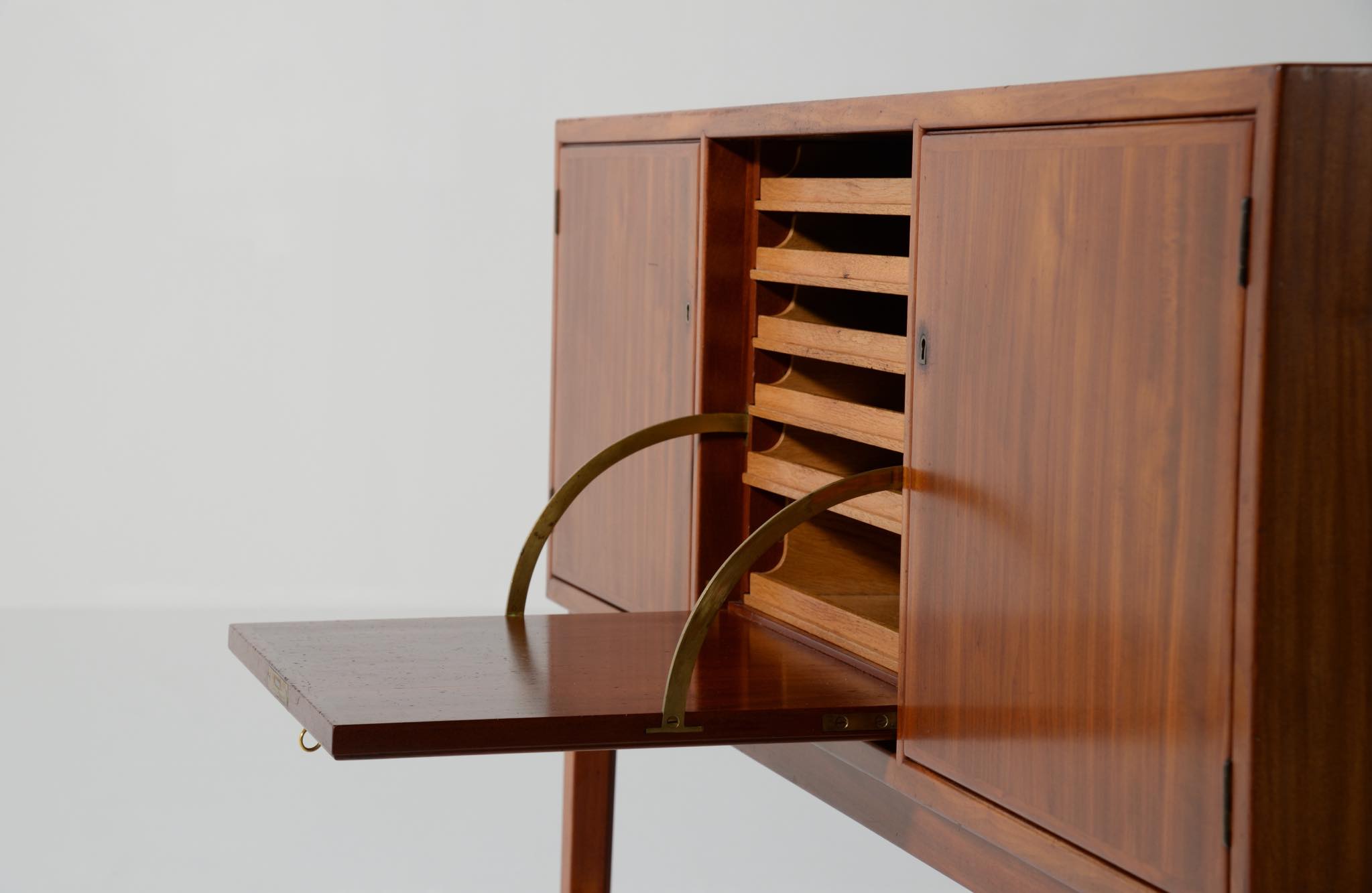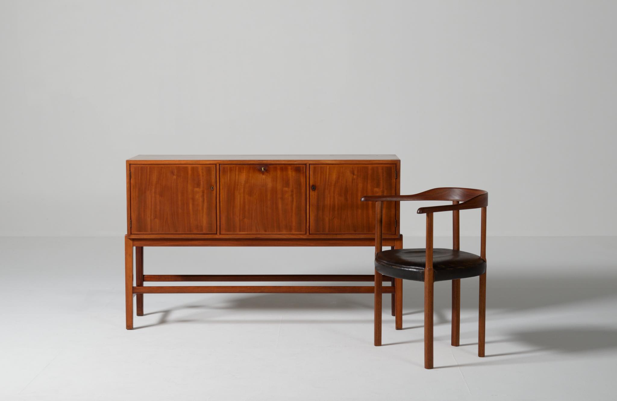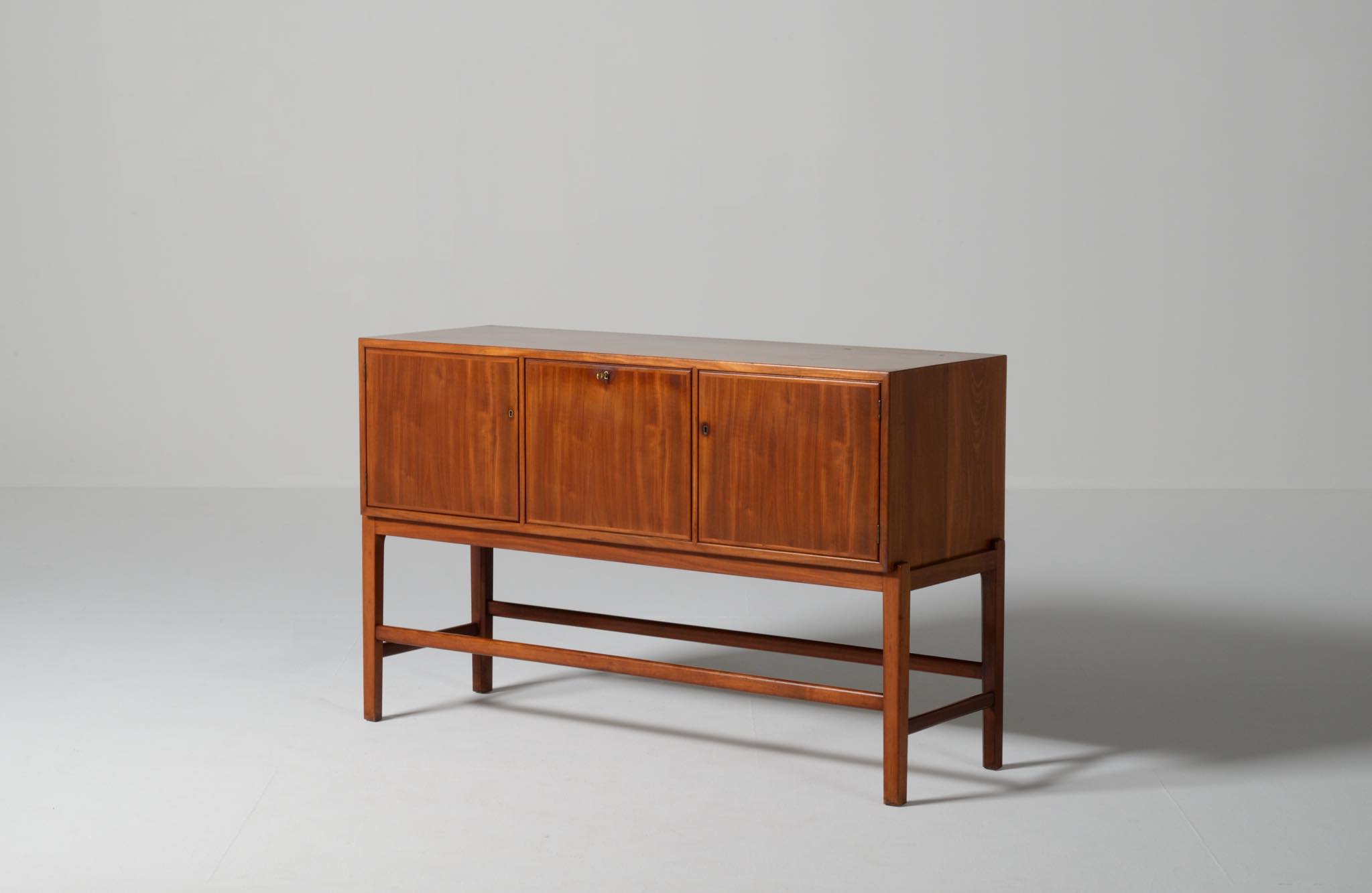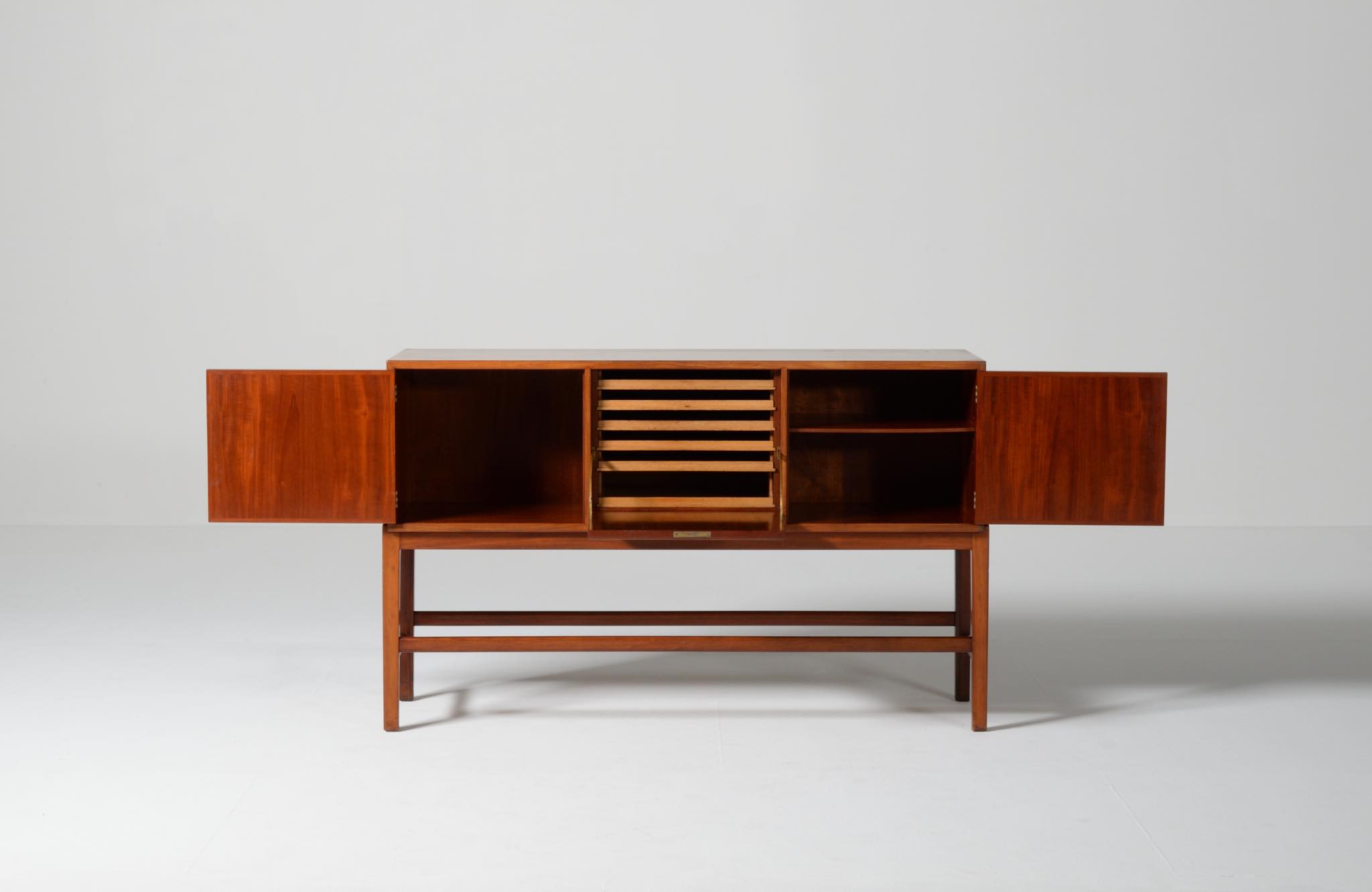 デンマークの名匠、Jacob Kjær/ヤコブ・ケアによるデザインとされるコンソールキャビネットです。小振りなサイズ感のもので、カトラリー等を収納したものと思われます。本体はキューバンマホガニー材、内部のトレイ機能の抽斗はオーク材、厚みのある真鍮金具が用いられています。使い込まれたようで、古傷等見られますが、コンディションは良好です。