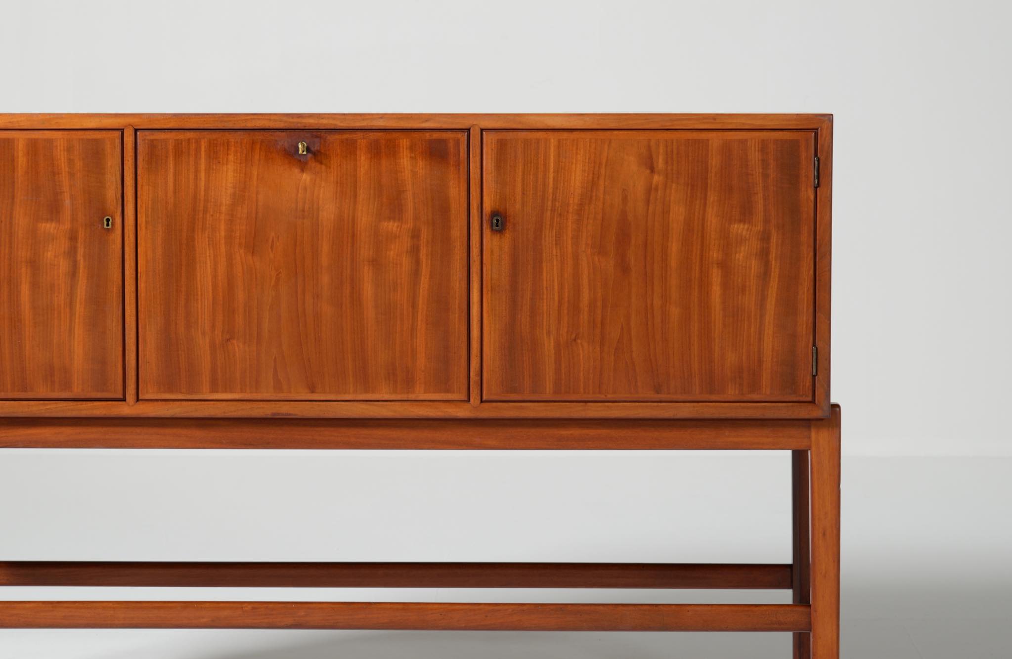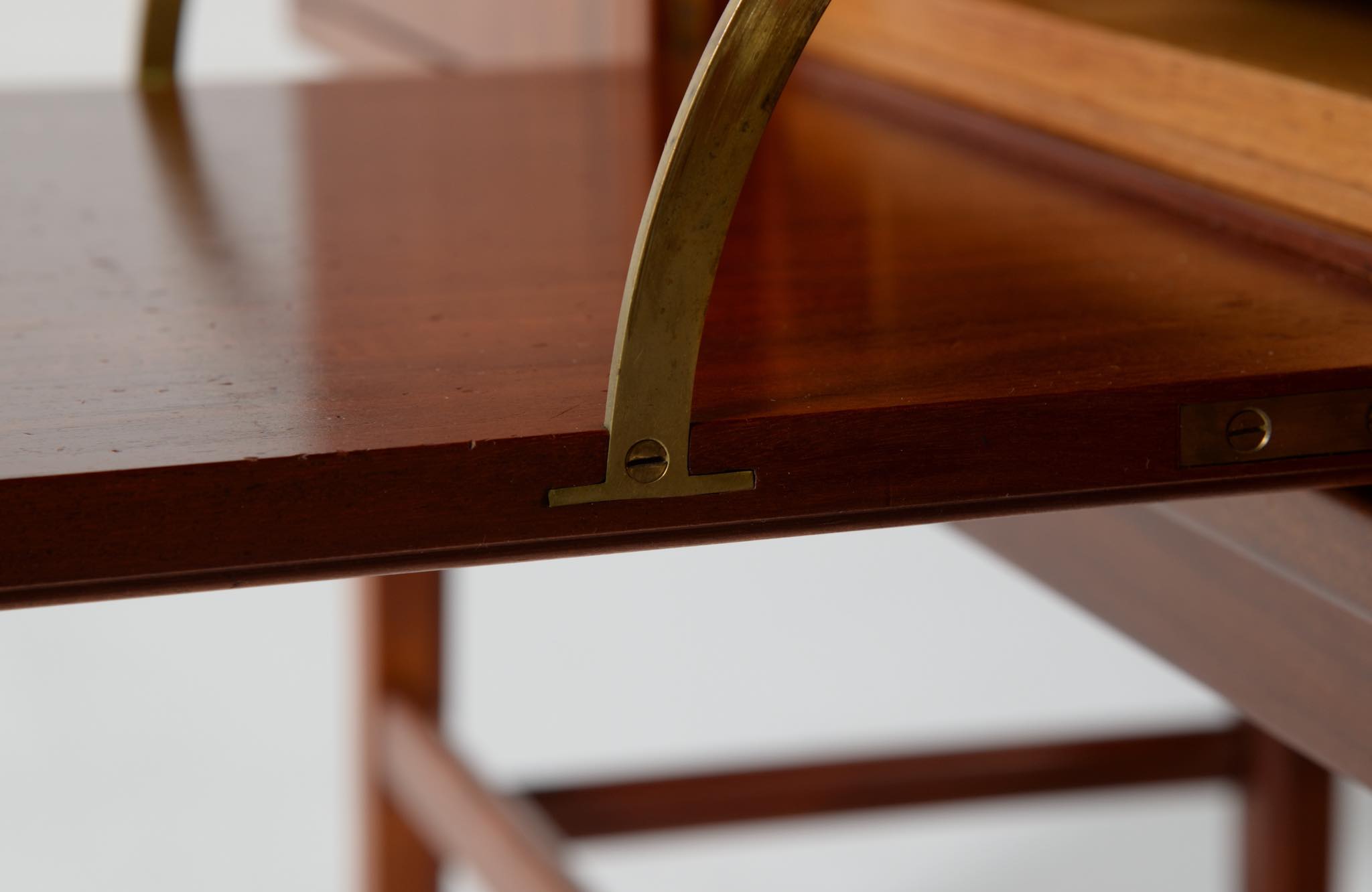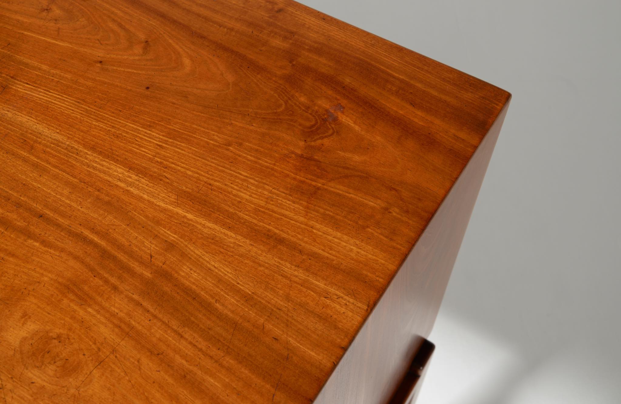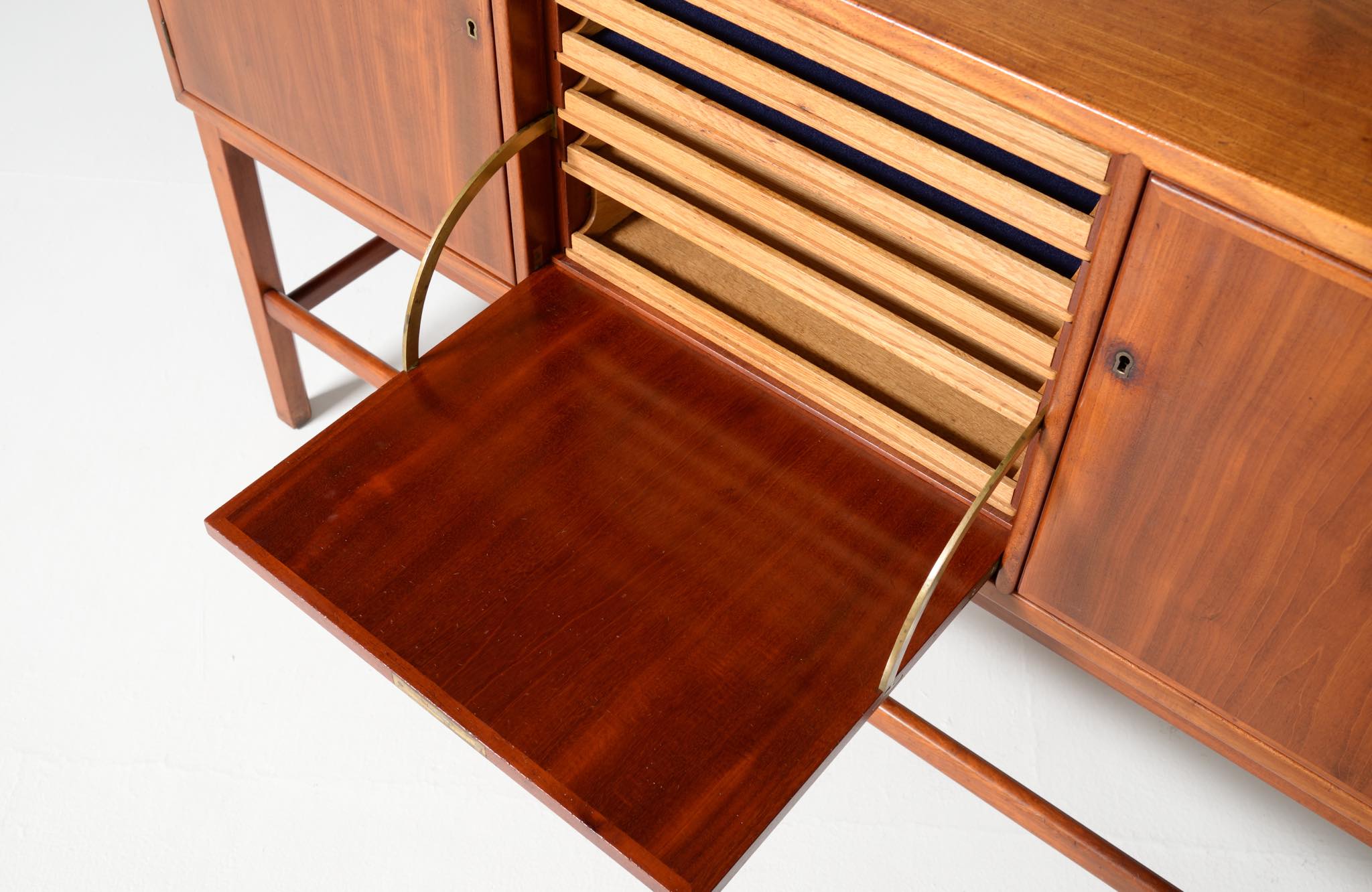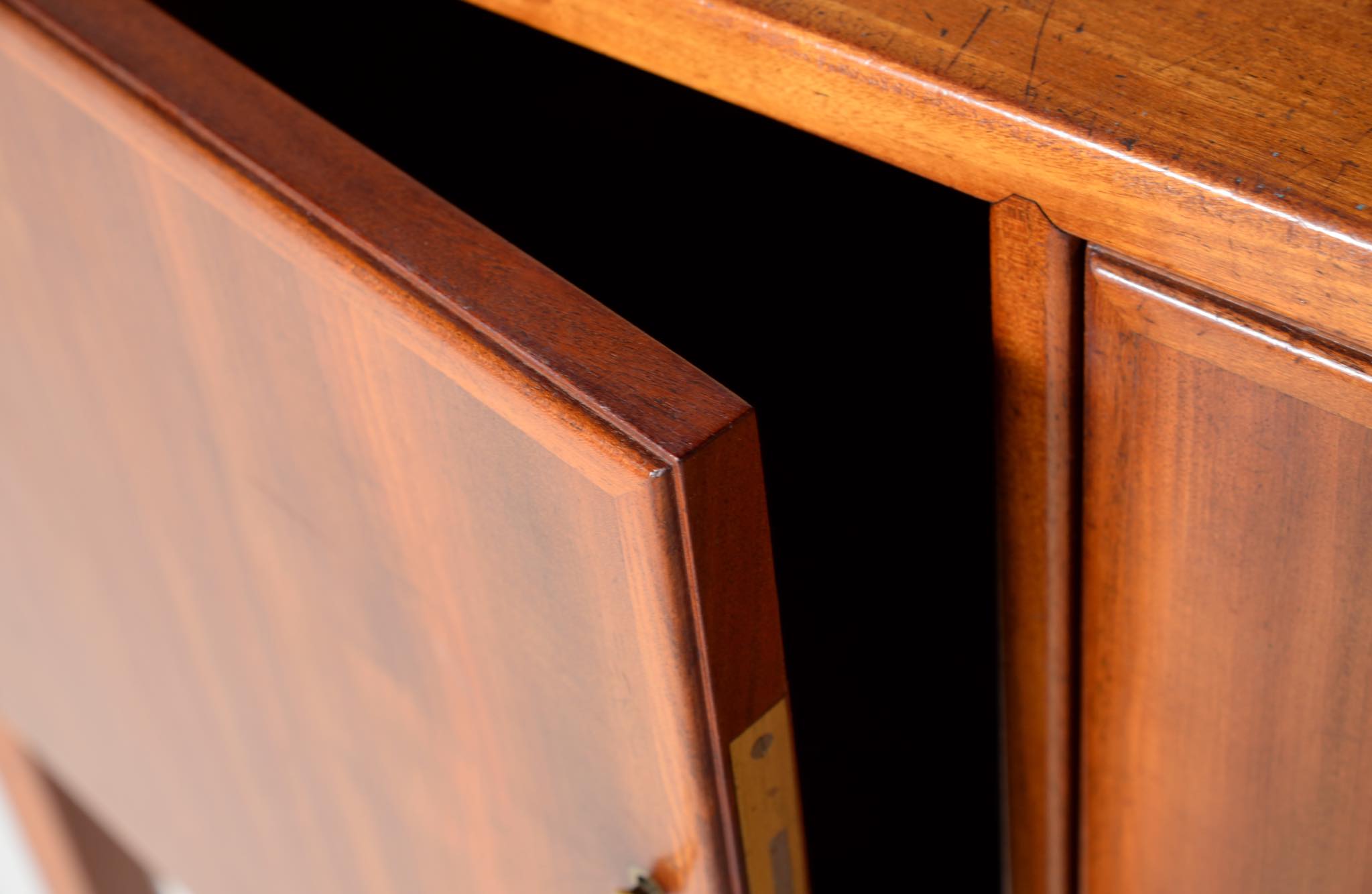 デンマークの名匠、Jacob Kjær/ヤコブ・ケアによるデザインとされるコンソールキャビネットです。小振りなサイズ感のもので、カトラリー等を収納したものと思われます。本体はキューバンマホガニー材、内部のトレイ機能の抽斗はオーク材、厚みのある真鍮金具が用いられています。使い込まれたようで、古傷等見られますが、コンディションは良好です。