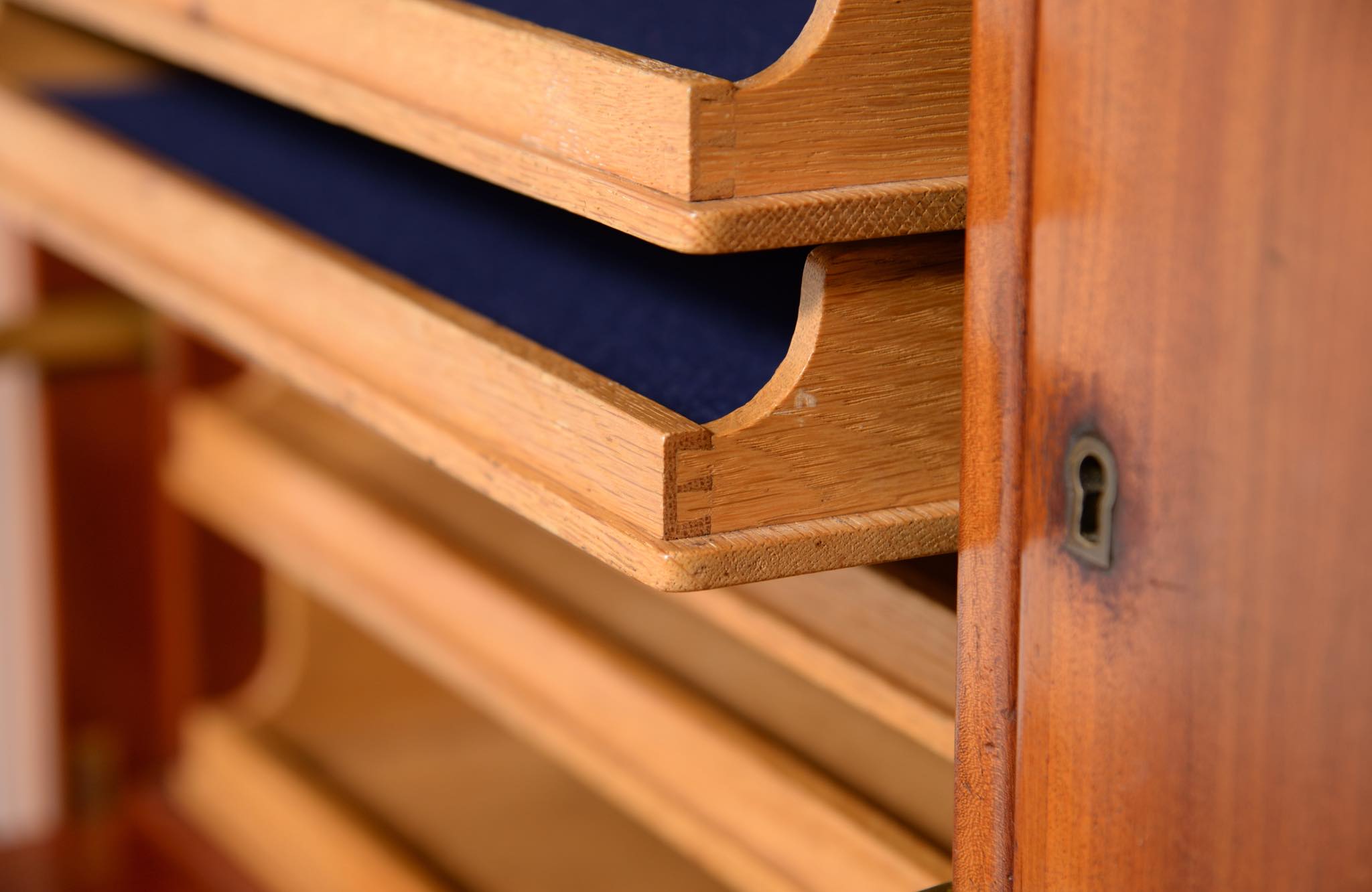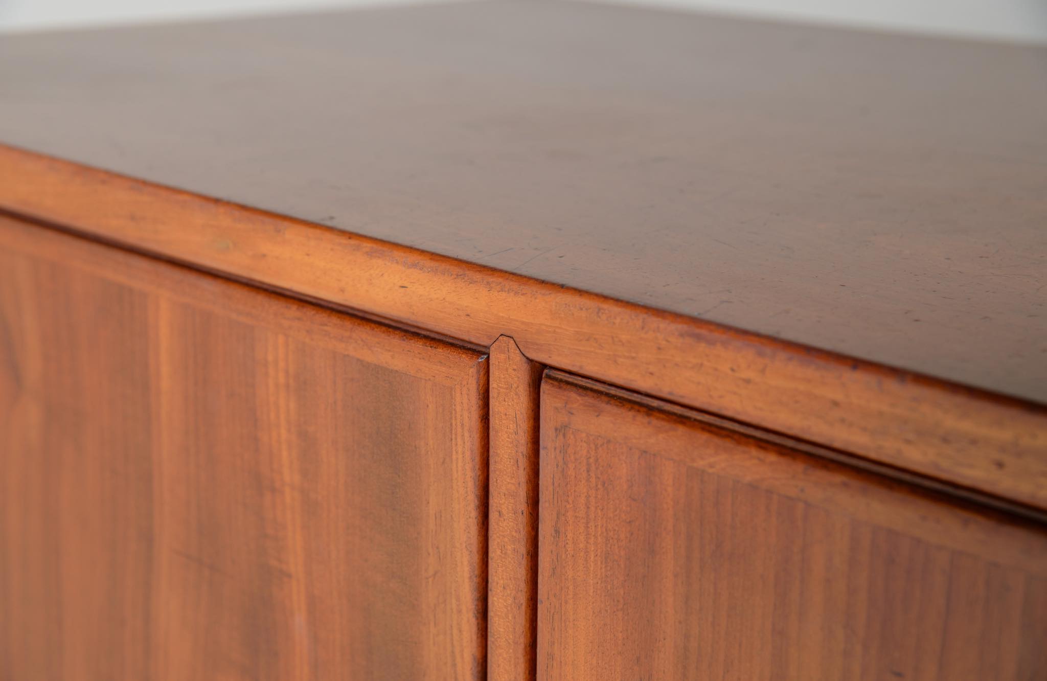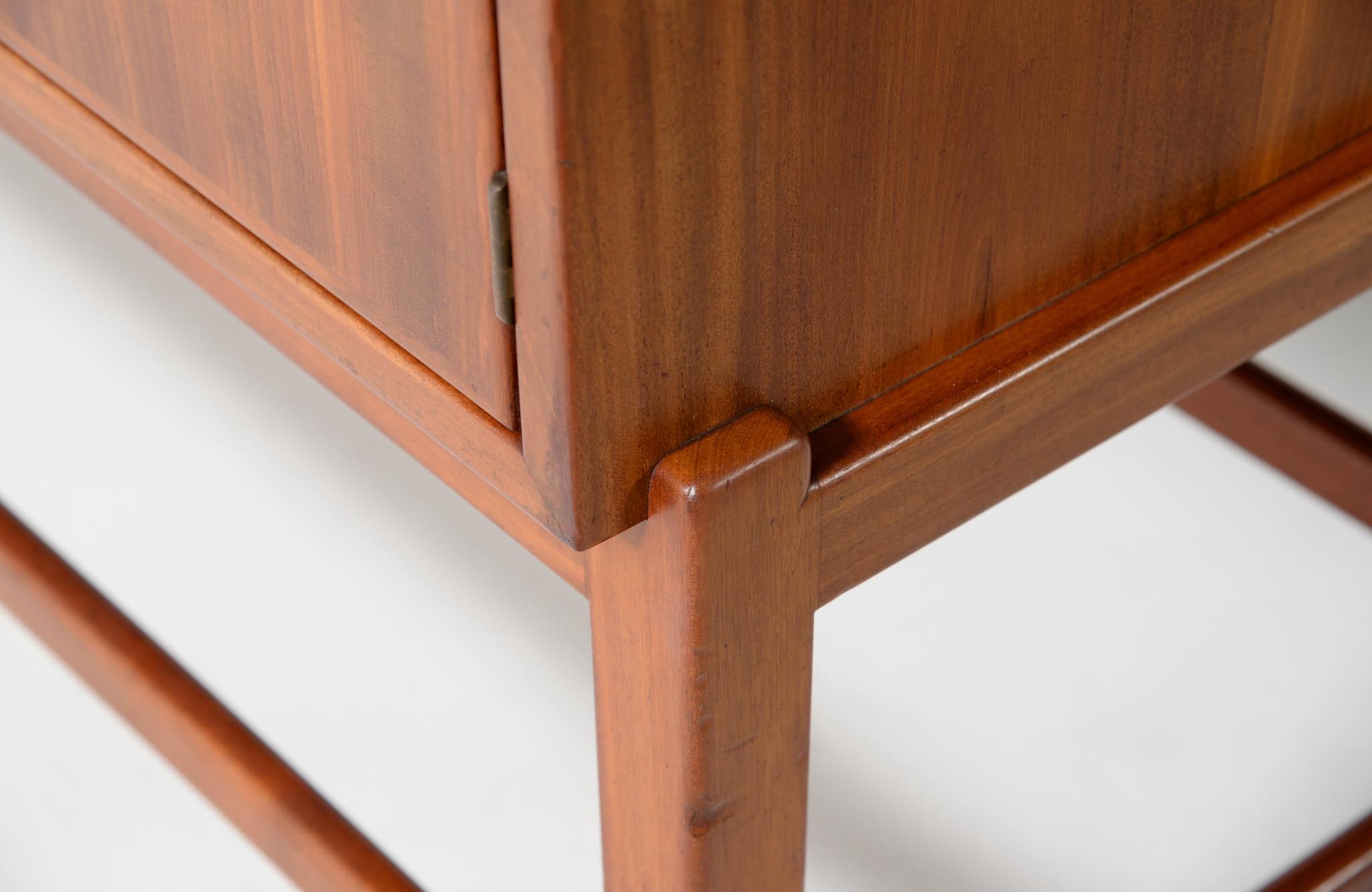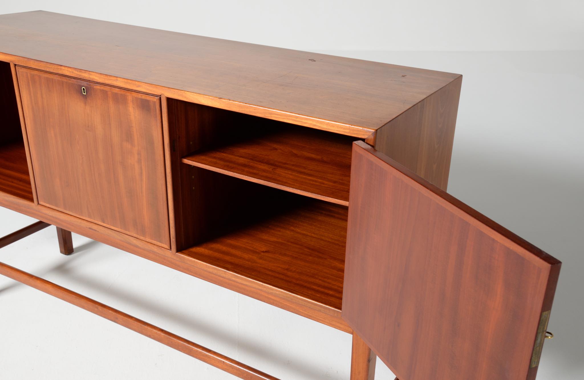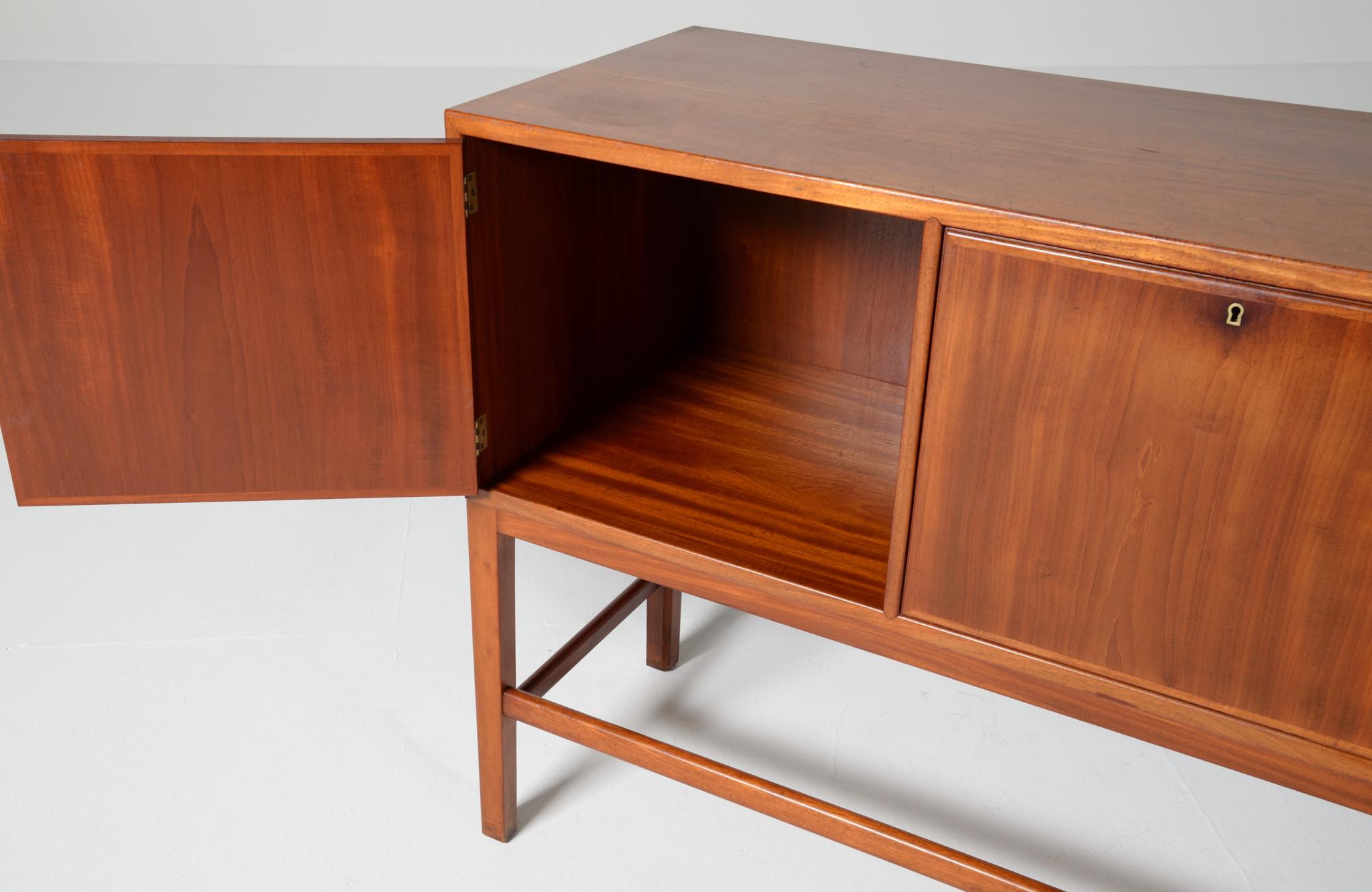 デンマークの名匠、Jacob Kjær/ヤコブ・ケアによるデザインとされるコンソールキャビネットです。小振りなサイズ感のもので、カトラリー等を収納したものと思われます。本体はキューバンマホガニー材、内部のトレイ機能の抽斗はオーク材、厚みのある真鍮金具が用いられています。使い込まれたようで、古傷等見られますが、コンディションは良好です。