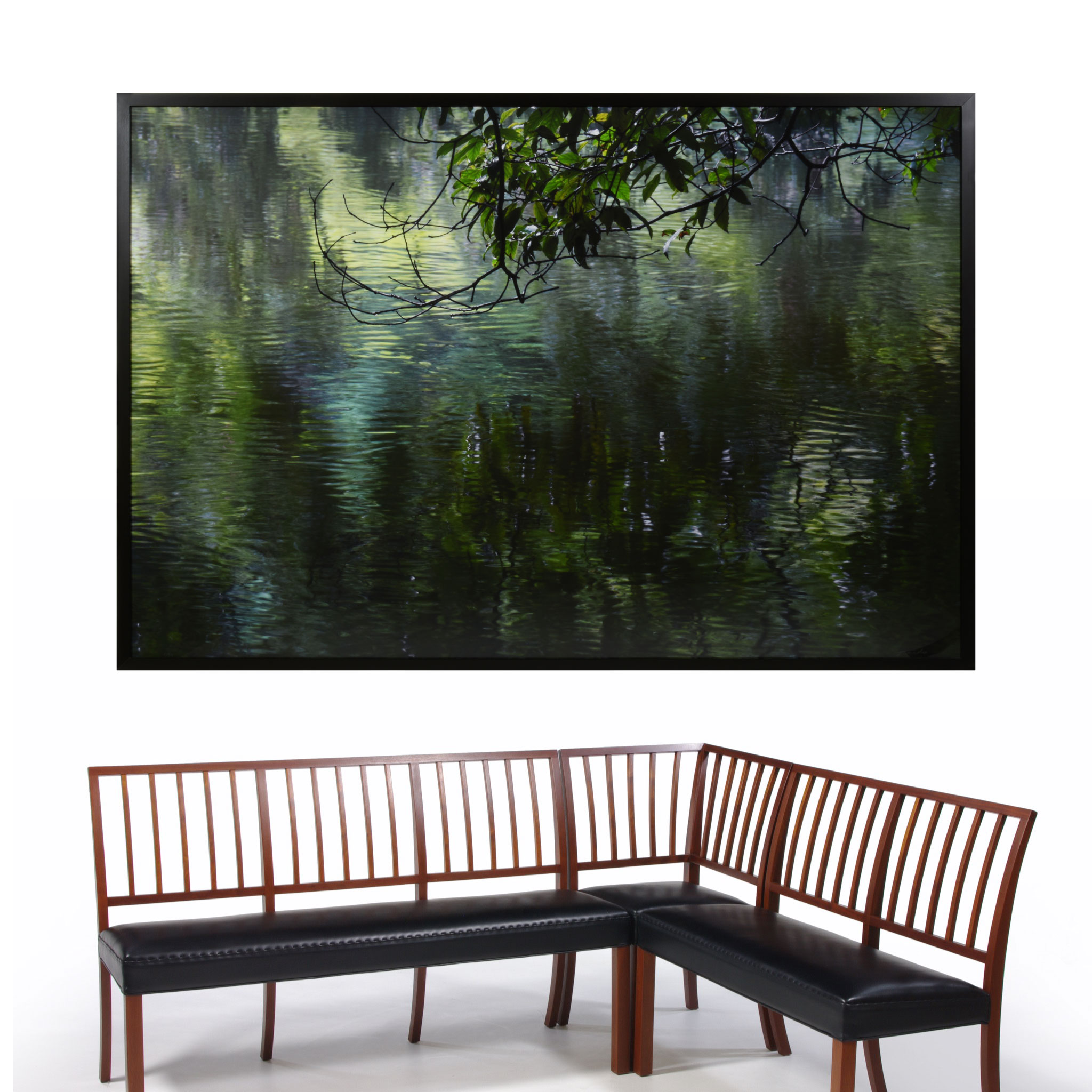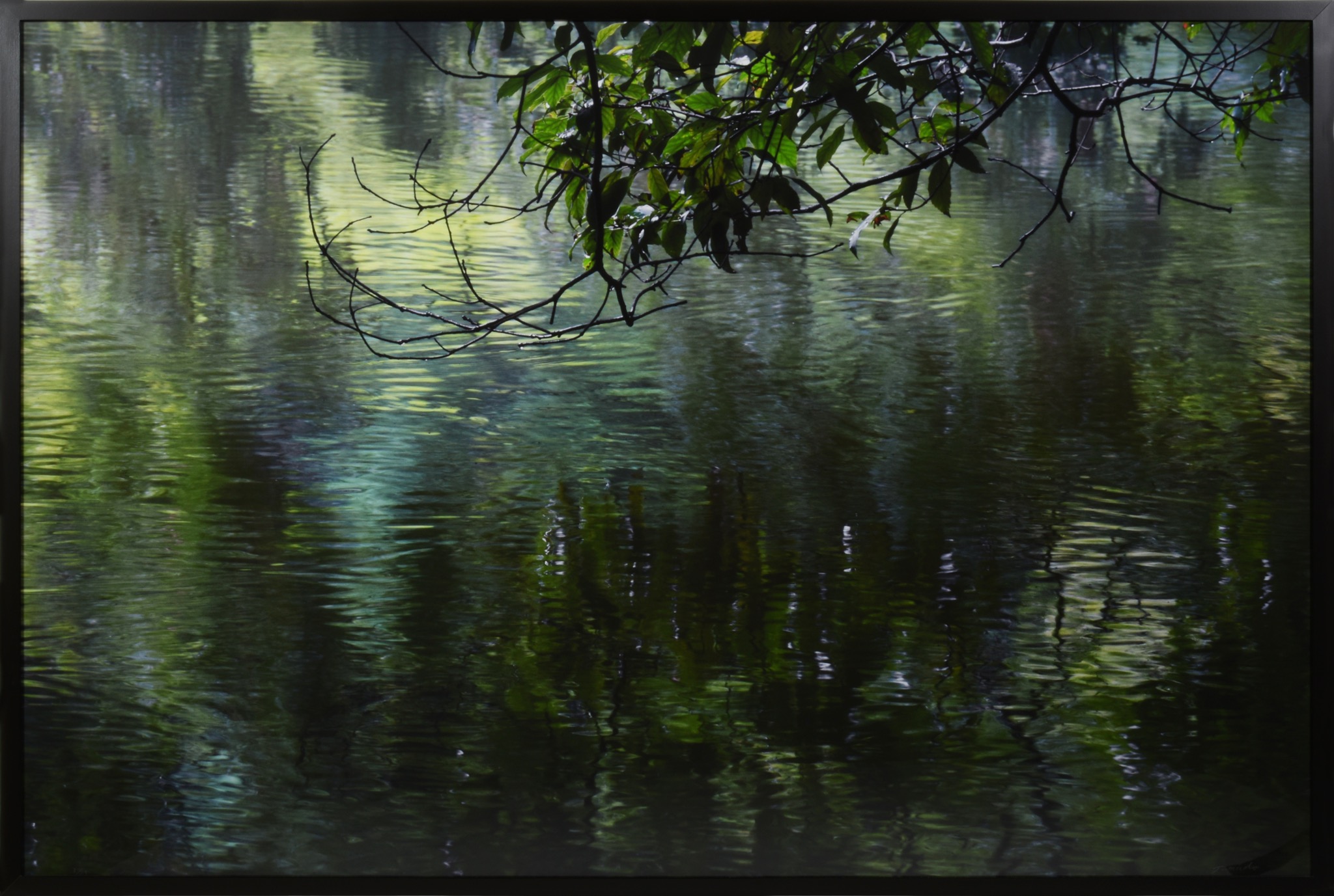 写真家、六田知弘/Tomohiro Mudaによる、日本最古とされる高鴨神社の「池」を写したカラー写真作品です。高鴨神社は六田さんの故郷、奈良県御所市(ごせし)に位置し、六田さんが市からの依頼を受け、御所の各所を撮り歩いた時の一枚で、太古の気配を残す高鴨神社の池に差し掛かった際、それまで降っていた雨がやみ、陽が池に差し始めた瞬間を捉えたものです。こちらのサンプルは154x104cmという大きなサイズで額装しました。額装サイズ、31×40 cmから150×225 cmまで、いくつかのサイズでのお作りが可能ですので空間に合わせてご検討ください。マットの有無は六田さんによって相応しい方が選ばれています。