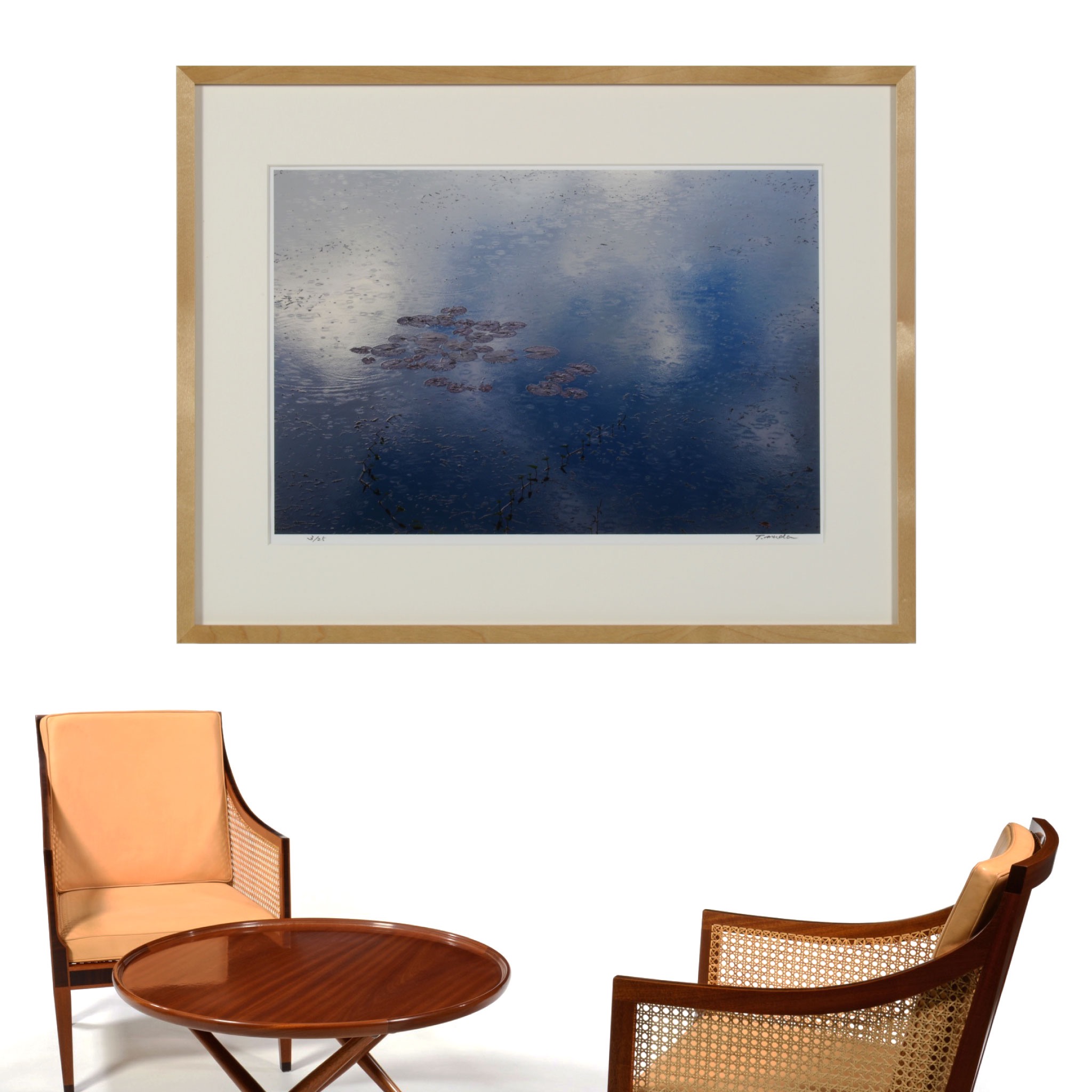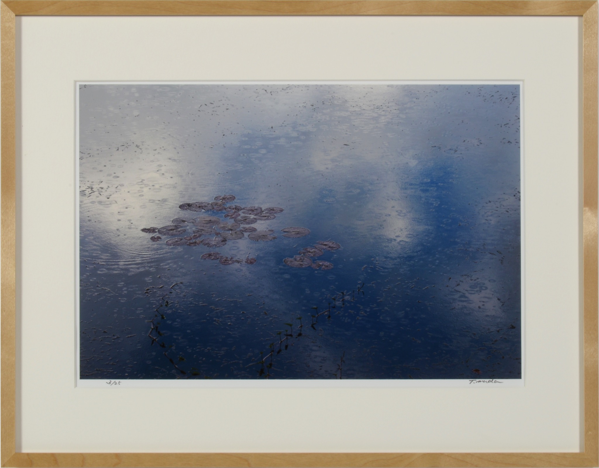写真家、六田知弘/Tomohiro Mudaによる、水面に蓮の葉が浮かぶカンボジアの「池」を写したカラー写真作品です。青空の広がるアンコール遺跡群を撮った後、次の目的地へ向かう途中、この池にさしかかり、ちょうどそのタイミングで天気雨に見舞われたそうです。こちらのサンプルは53x43cmで額装しました。額装サイズ、31×40 cmから150×225 cmまで、いくつかのサイズでのお作りが可能ですので空間に合わせてご検討ください。マットの有無は六田さんによって相応しい方が選ばれています。