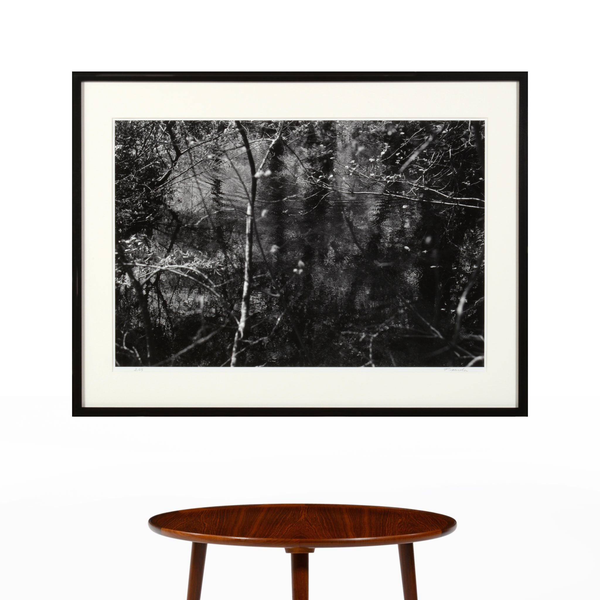 写真家、六田知弘/Tomohiro Mudaによるモノクロ写真作品です。フランスからスペイン北部のサンティアゴ・デ・コンポステーラ大聖堂を目指し、サンチィアゴ巡礼路を歩いていた際に出会った小川の「川面」を写したものです。この日は花曇りのお天気で、歩くうちに小川のせせらぎが聞こえてきたそうです。こちらは75x57cmで額装しました。額装サイズ、31×40 cmから150×225 cmまで、いくつかのサイズでのお作りが可能ですので空間に合わせてご検討ください。マットの有無は六田さんによって相応しい方が選ばれています。