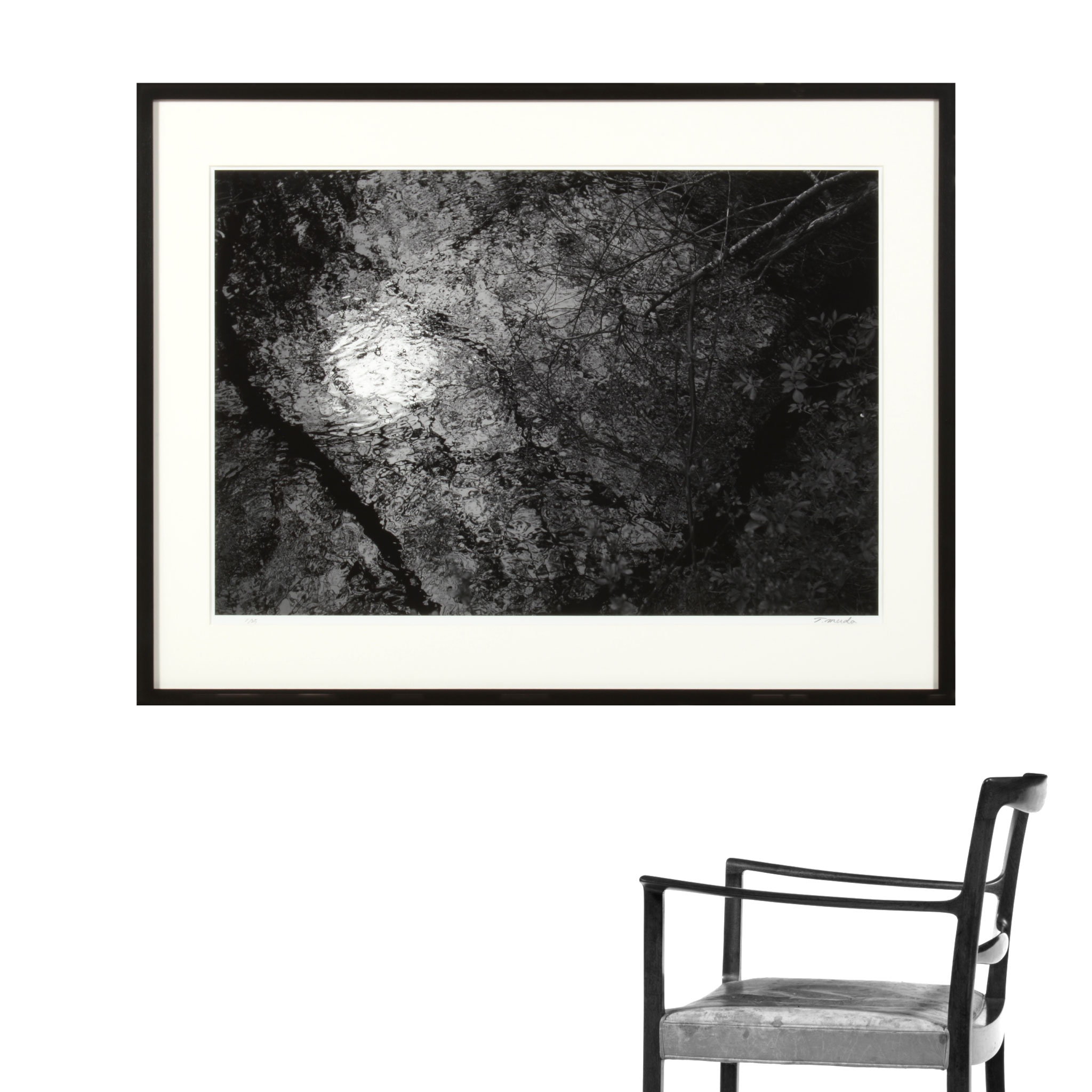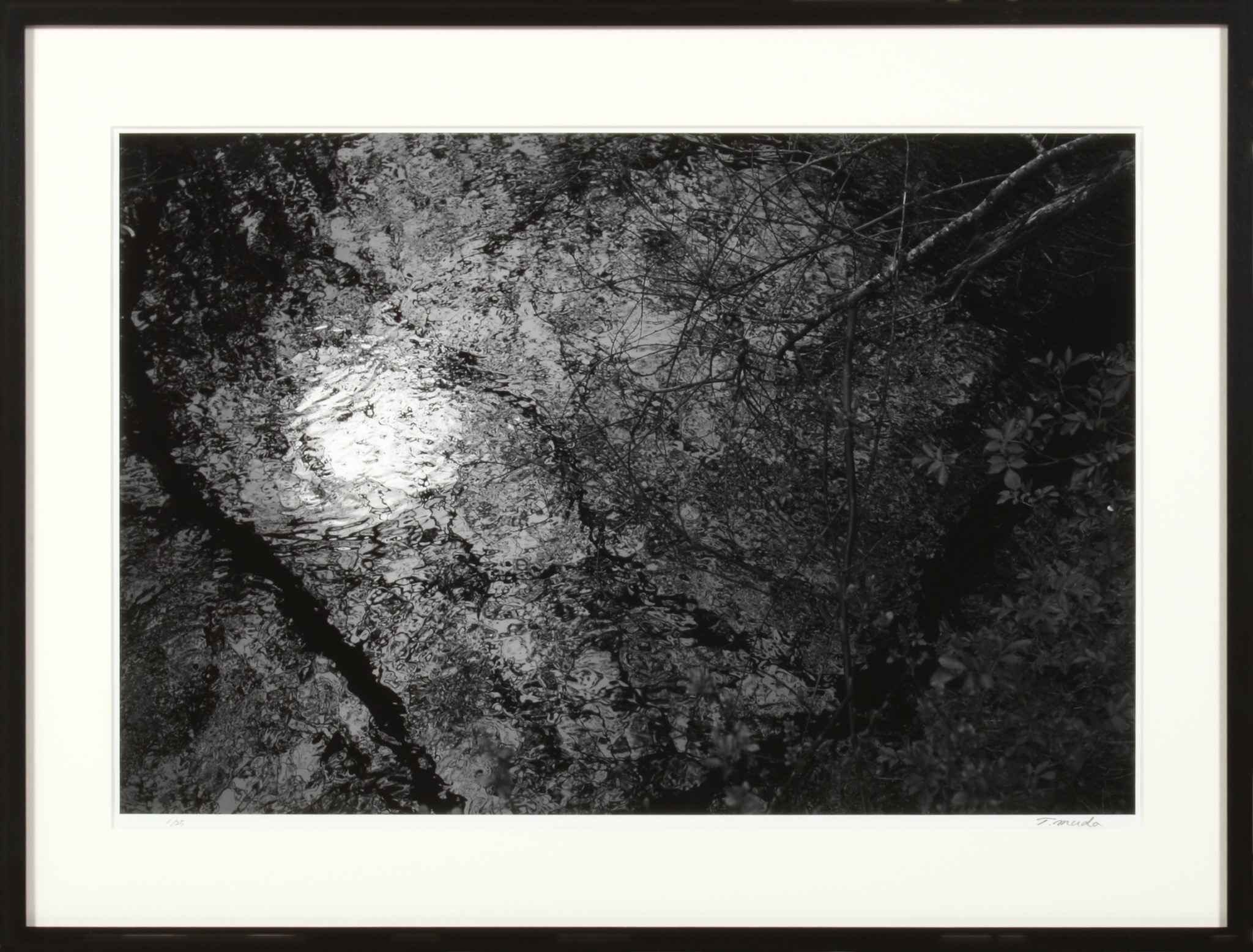 写真家、六田知弘/Tomohiro Mudaによるモノクロ写真作品です。フランスからスペイン北部のサンティアゴ・デ・コンポステーラ大聖堂を目指し、サンチィアゴ巡礼路を歩いていた際に出会った小川の「川面」を写したものです。この日は花曇りのお天気で、歩くうちに小川のせせらぎが聞こえてきたそうです。こちらのサンプルは75x57cmで額装しました。額装サイズ、31×40 cmから150×225 cmまで、いくつかのサイズでのお作りが可能ですので空間に合わせてご検討ください。マットの有無は六田さんによって相応しい方が選ばれています。