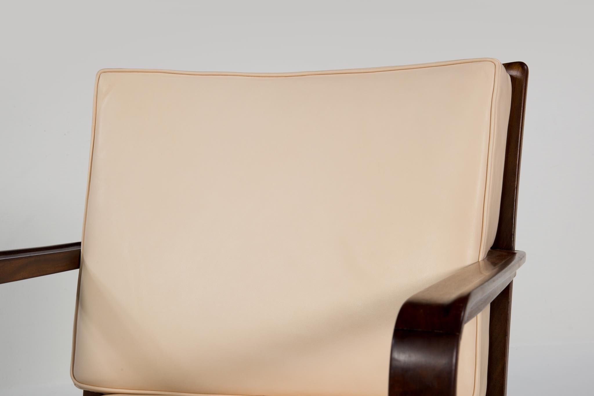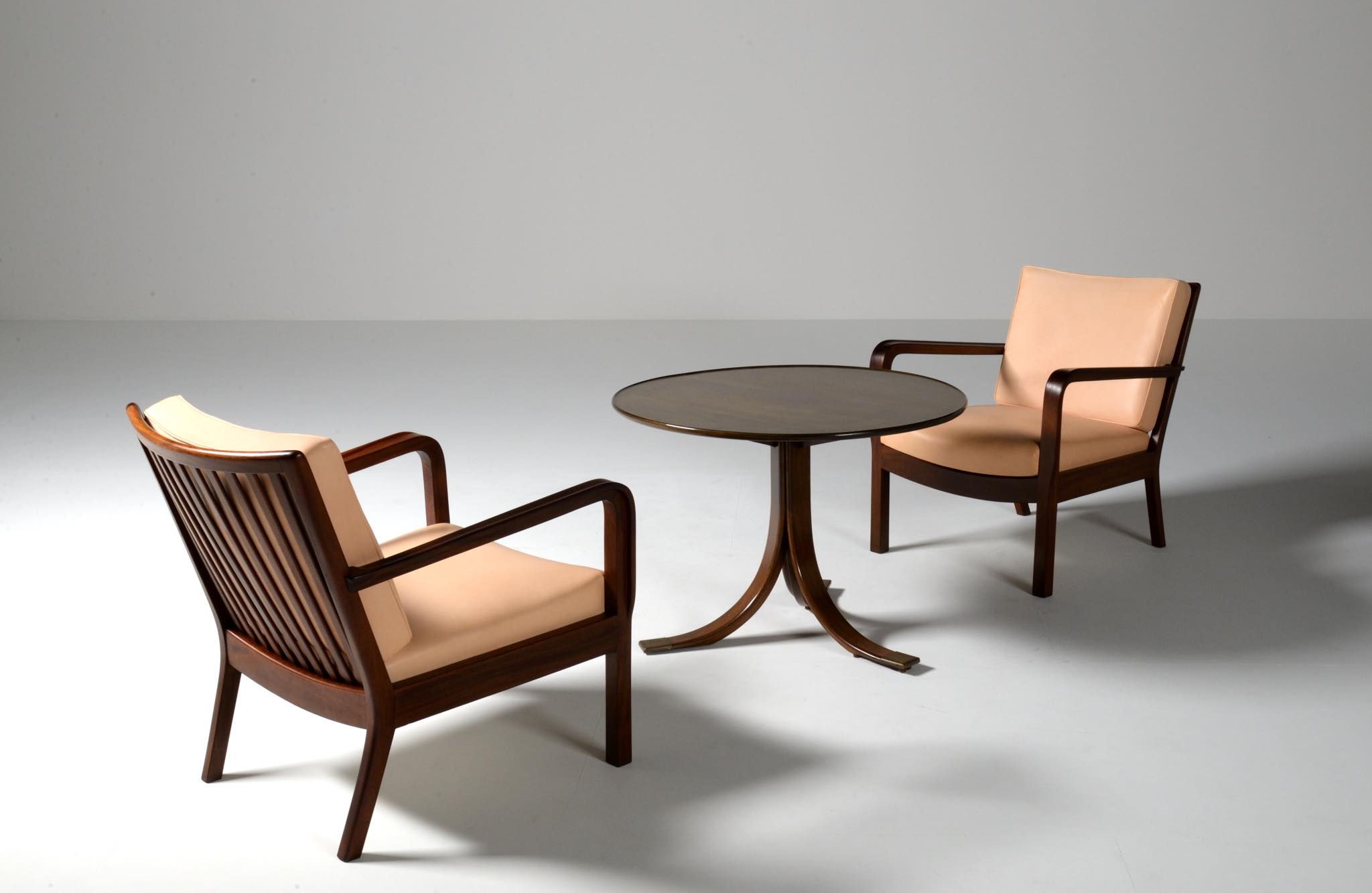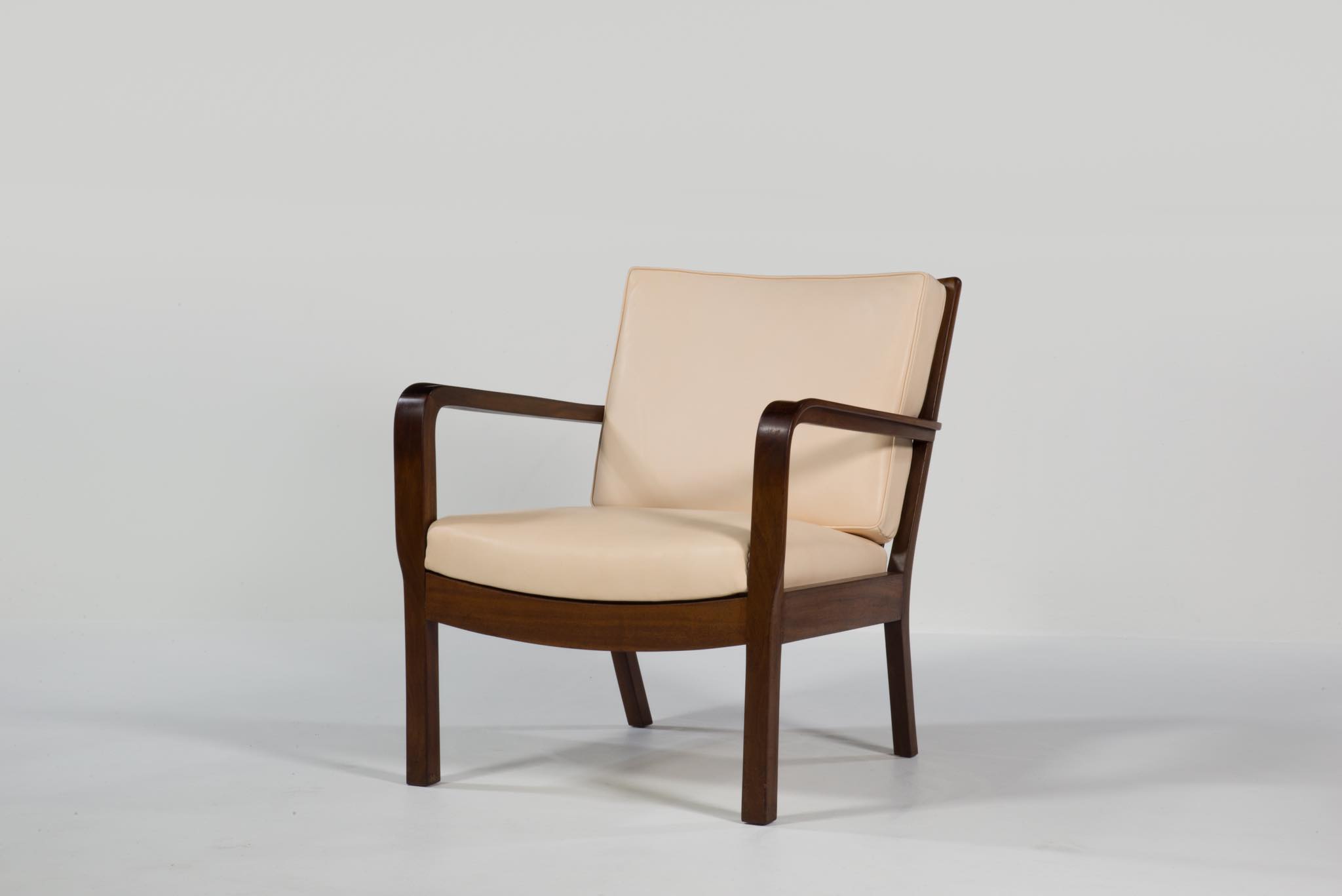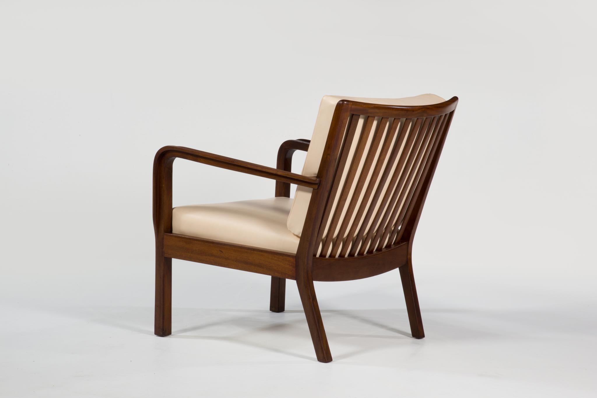 デンマークを代表する建築家、Vilhelm Lauritzen/ヴィルヘルム・ラウリッツェンの兄弟の為に作られたイージーチェアです。デザインはラウリッツェン事務所に勤めていた頃のEdvard Kindt Larsen/エドワード・キンド・ラーセンによるものと云われており、キャビネットメーカーのGustav Bertelsen/グフタフ・ベルテルセンによって作られた椅子で、コペンハーゲン郊外のヘレルップ、Tuborgvej79番地に建てられたラウリッツェン兄弟の邸宅にこのモデルが置かれていたことが1929年の資料で確認できます。フレームは上質なキューバンマホガニー材で作られており、材の持つ特有の奥ゆかしさが感じられます。シートは古く傷みが見られたため、新たにソーレンセンレザー社の上質なヌメ革”ヴェゲタル”で張り替えました。フレームに古い補修が見られますが、緩みなど不安感はなくしっかりしています。こちらはペアでの販売となります。