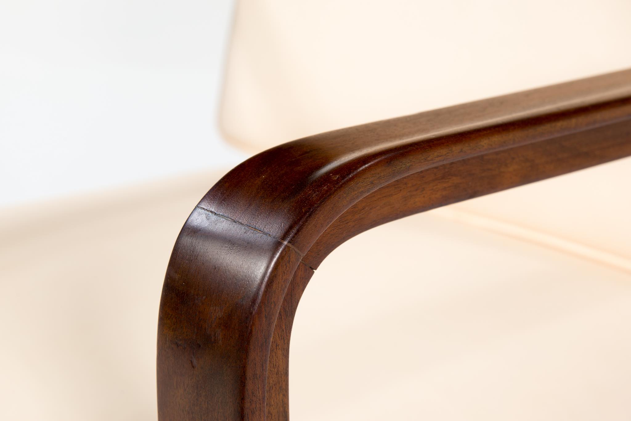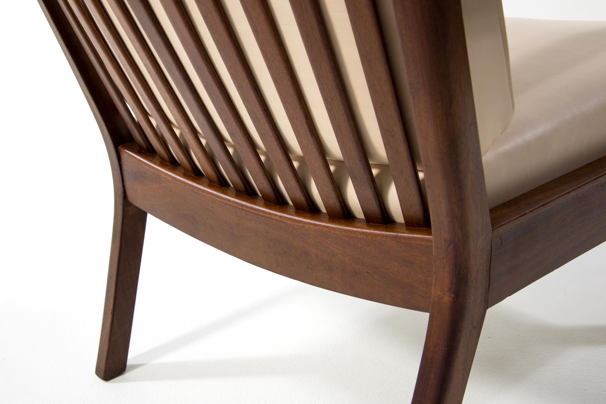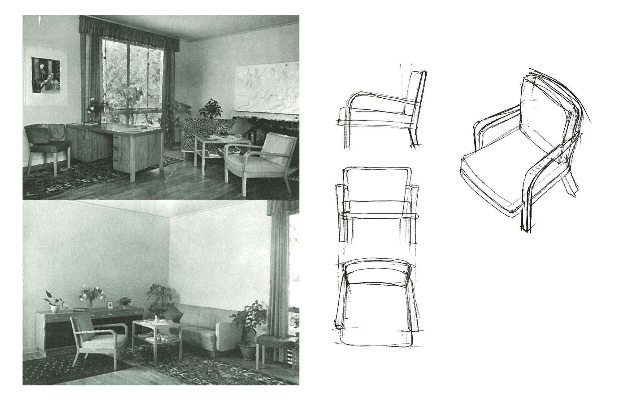 デンマークを代表する建築家、Vilhelm Lauritzen/ヴィルヘルム・ラウリッツェンの兄弟の為に作られたイージーチェアです。デザインはラウリッツェン事務所に勤めていた頃のEdvard Kindt Larsen/エドワード・キンド・ラーセンによるものと云われており、キャビネットメーカーのGustav Bertelsen/グフタフ・ベルテルセンによって作られた椅子で、コペンハーゲン郊外のヘレルップ、Tuborgvej79番地に建てられたラウリッツェン兄弟の邸宅にこのモデルが置かれていたことが1929年の資料で確認できます。フレームは上質なキューバンマホガニー材で作られており、材の持つ特有の奥ゆかしさが感じられます。シートは古く傷みが見られたため、新たにソーレンセンレザー社の上質なヌメ革”ヴェゲタル”で張り替えました。フレームに古い補修が見られますが、緩みなど不安感はなくしっかりしています。こちらはペアでの販売となります。