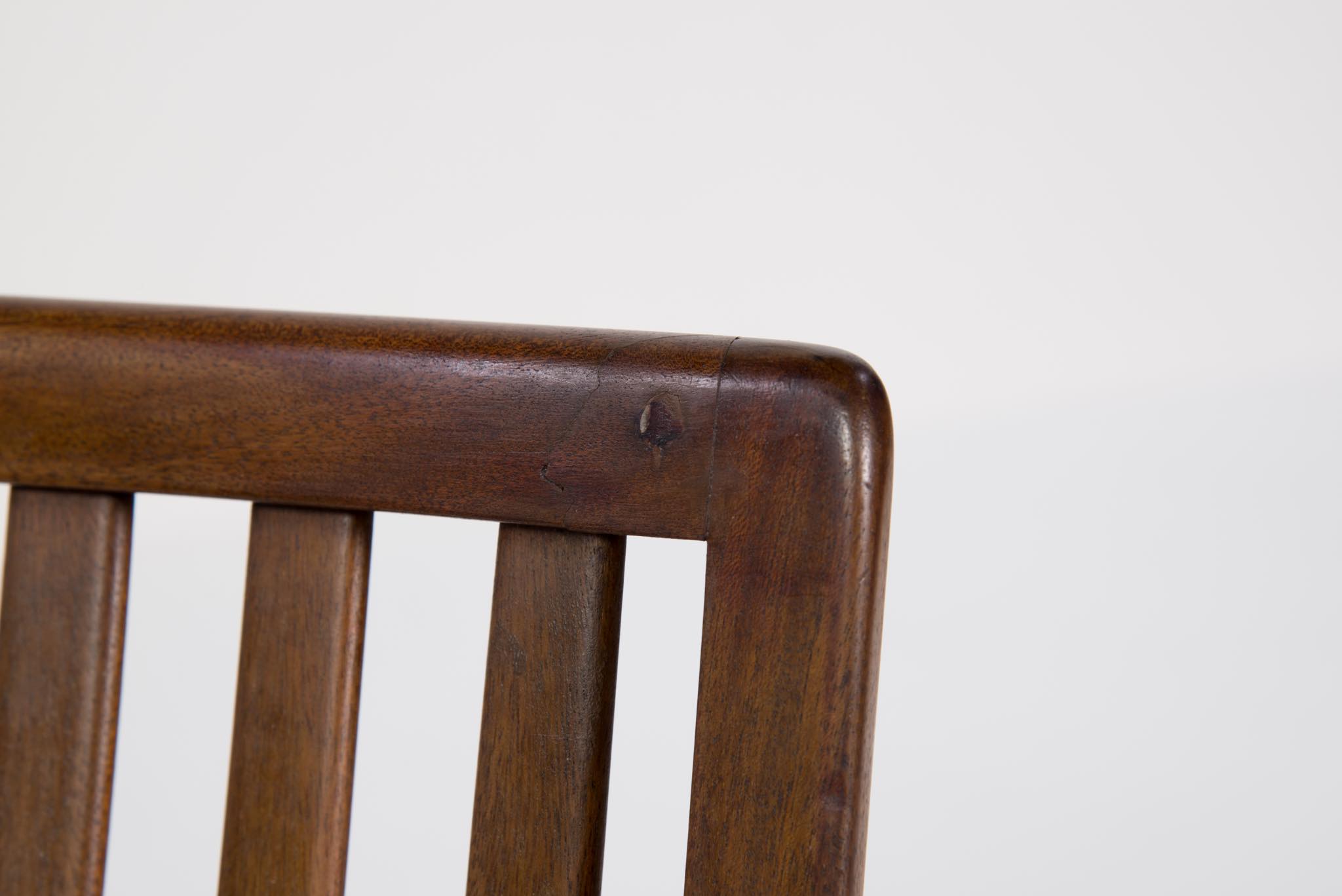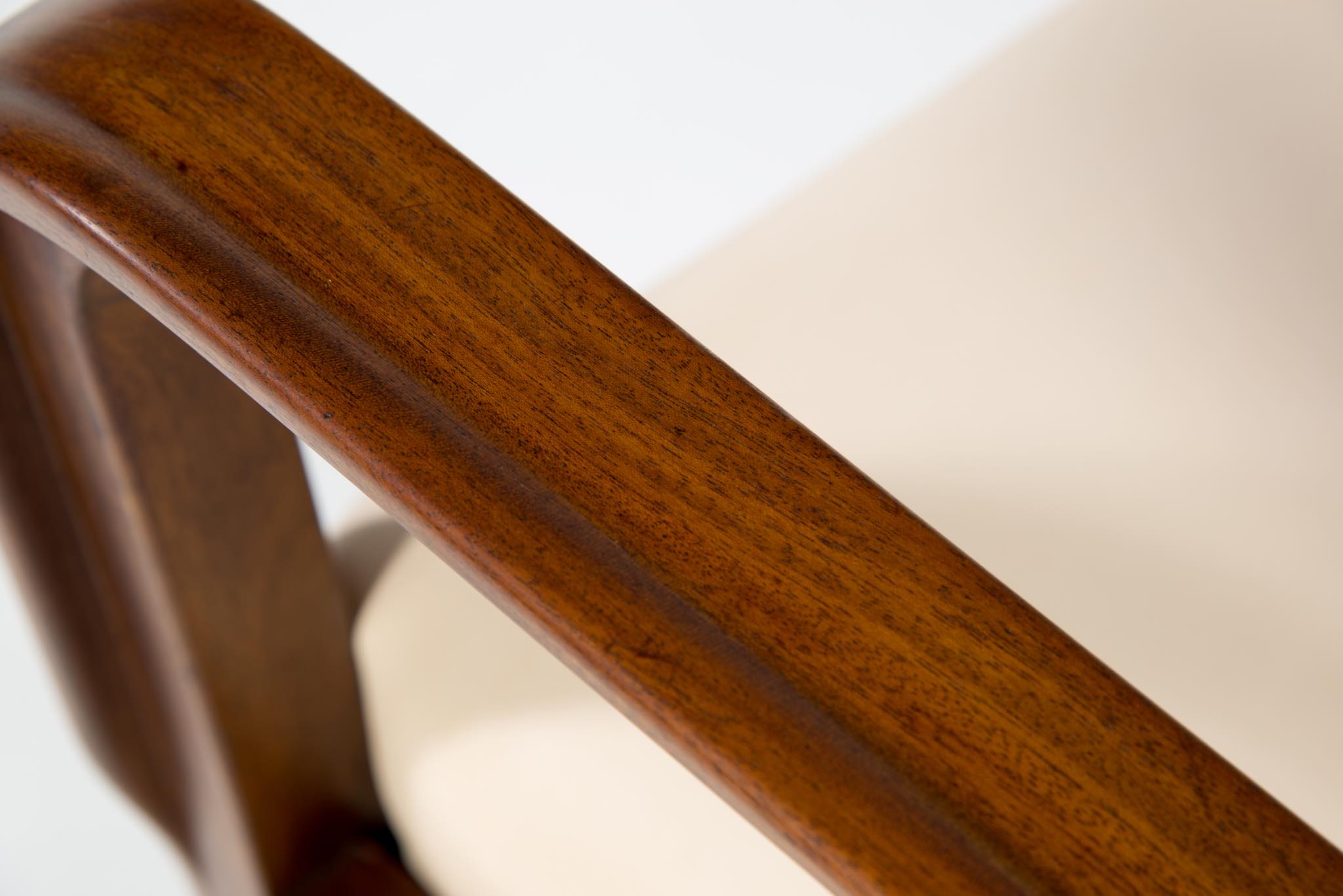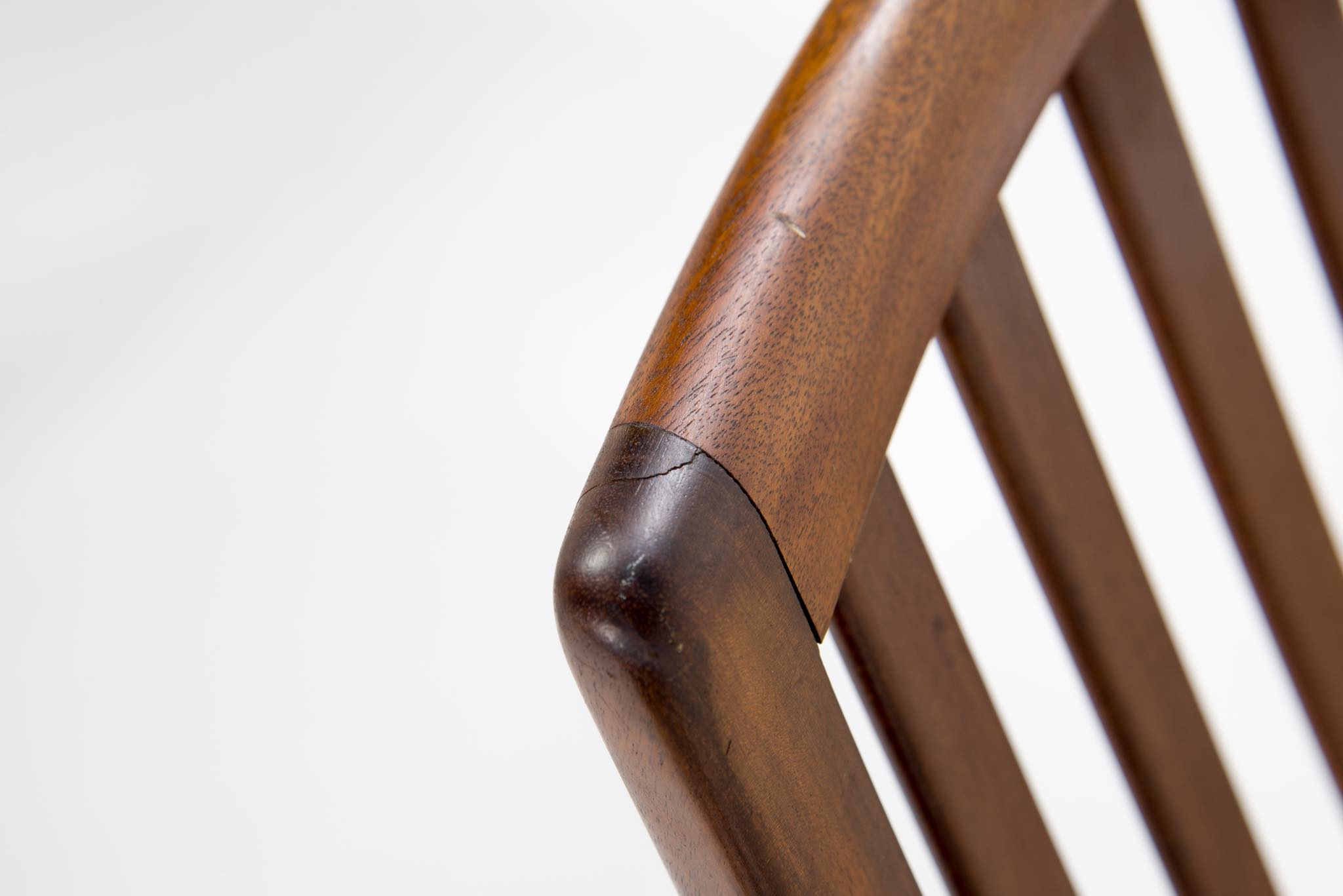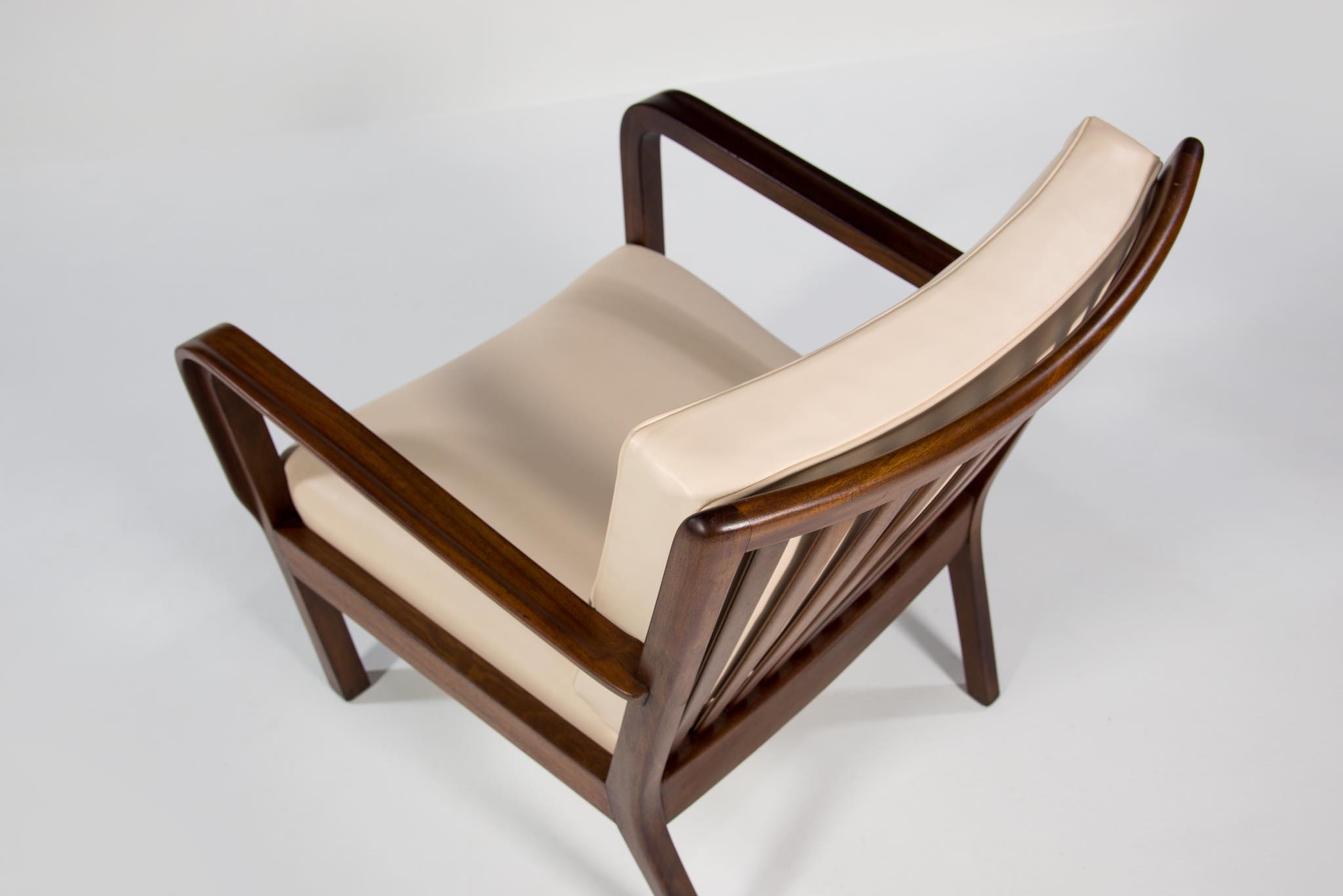 デンマークを代表する建築家、Vilhelm Lauritzen/ヴィルヘルム・ラウリッツェンの兄弟の為に作られたイージーチェアです。デザインはラウリッツェン事務所に勤めていた頃のEdvard Kindt Larsen/エドワード・キンド・ラーセンによるものと云われており、キャビネットメーカーのGustav Bertelsen/グフタフ・ベルテルセンによって作られた椅子で、コペンハーゲン郊外のヘレルップ、Tuborgvej79番地に建てられたラウリッツェン兄弟の邸宅にこのモデルが置かれていたことが1929年の資料で確認できます。フレームは上質なキューバンマホガニー材で作られており、材の持つ特有の奥ゆかしさが感じられます。シートは古く傷みが見られたため、新たにソーレンセンレザー社の上質なヌメ革”ヴェゲタル”で張り替えました。フレームに古い補修が見られますが、緩みなど不安感はなくしっかりしています。こちらはペアでの販売となります。