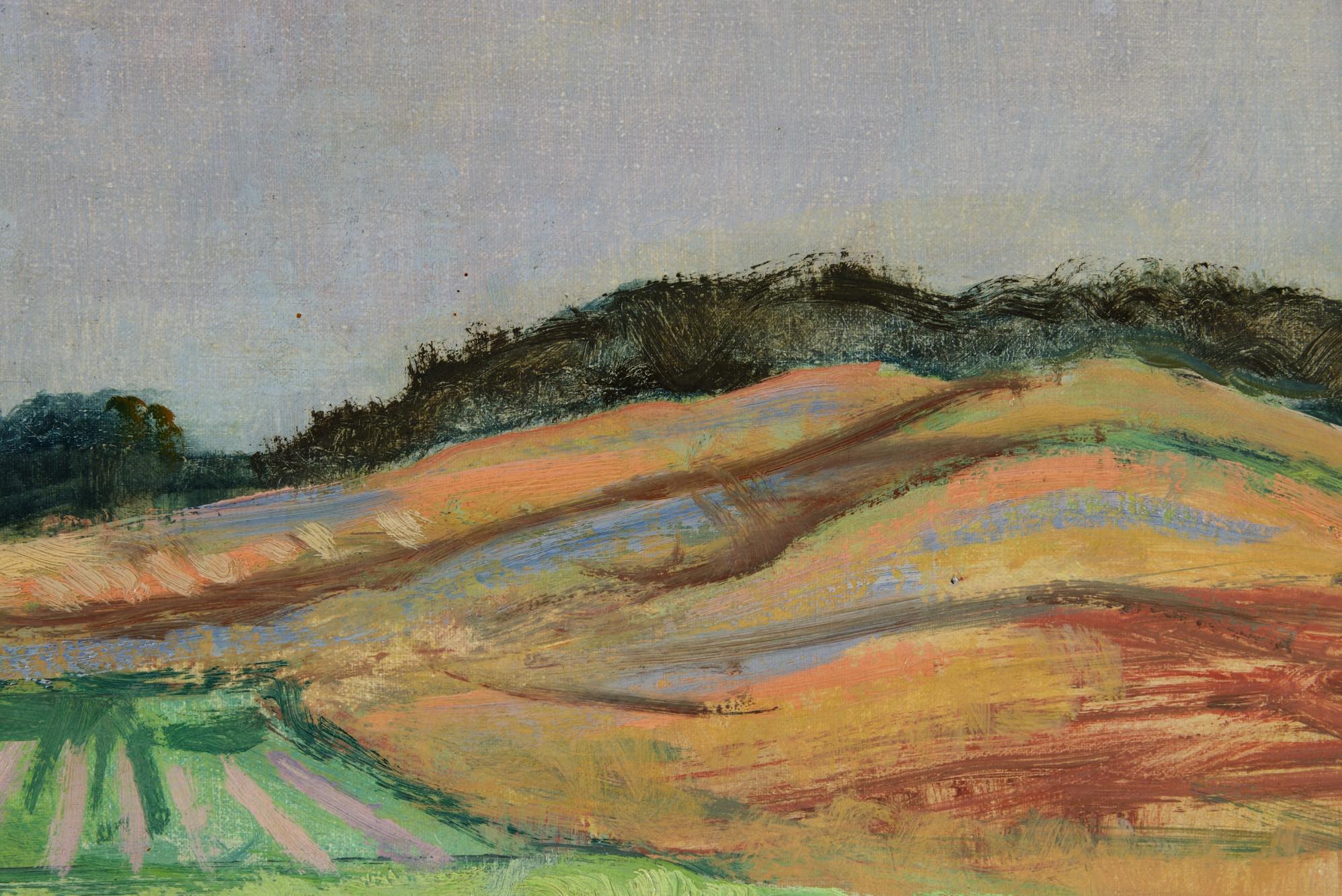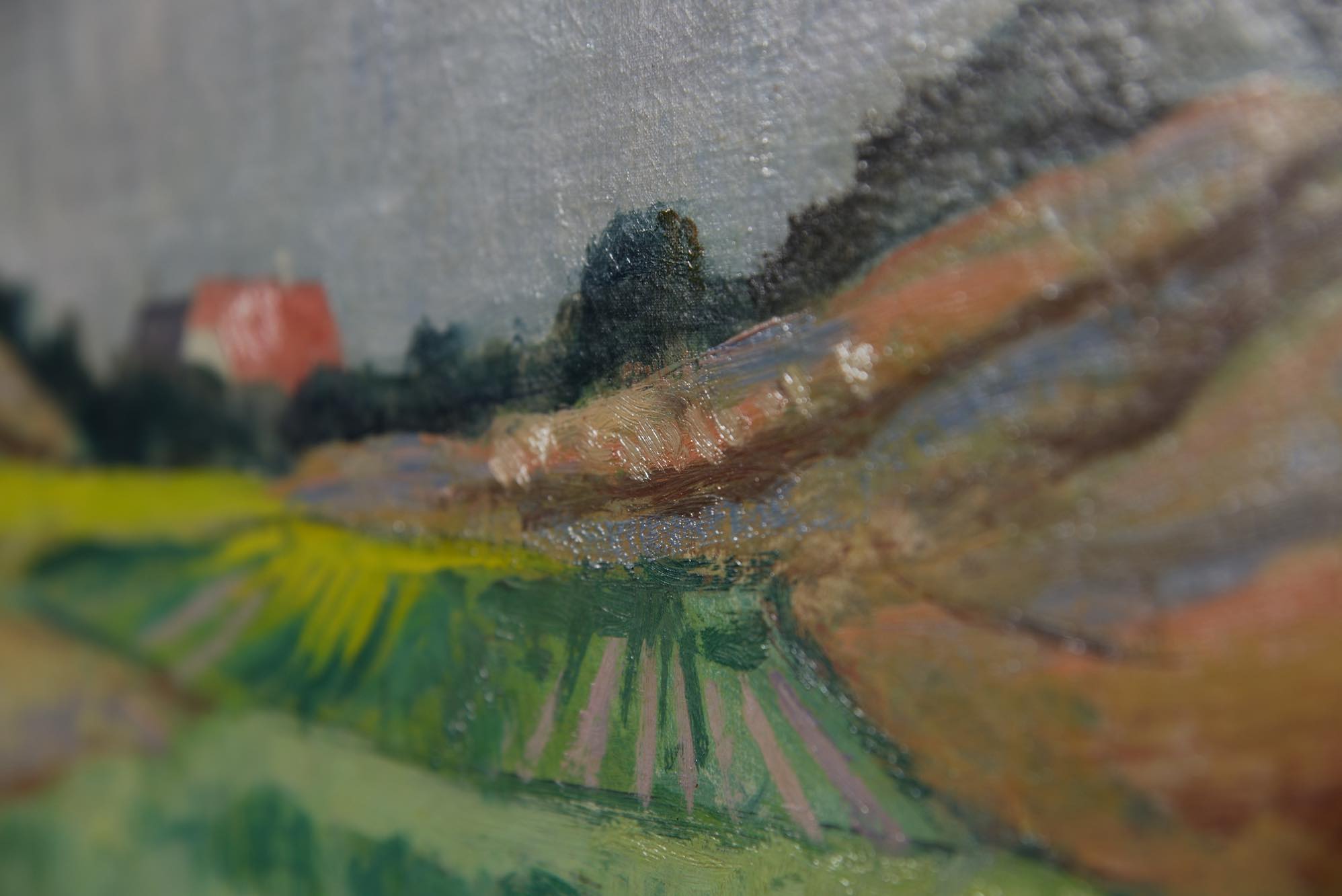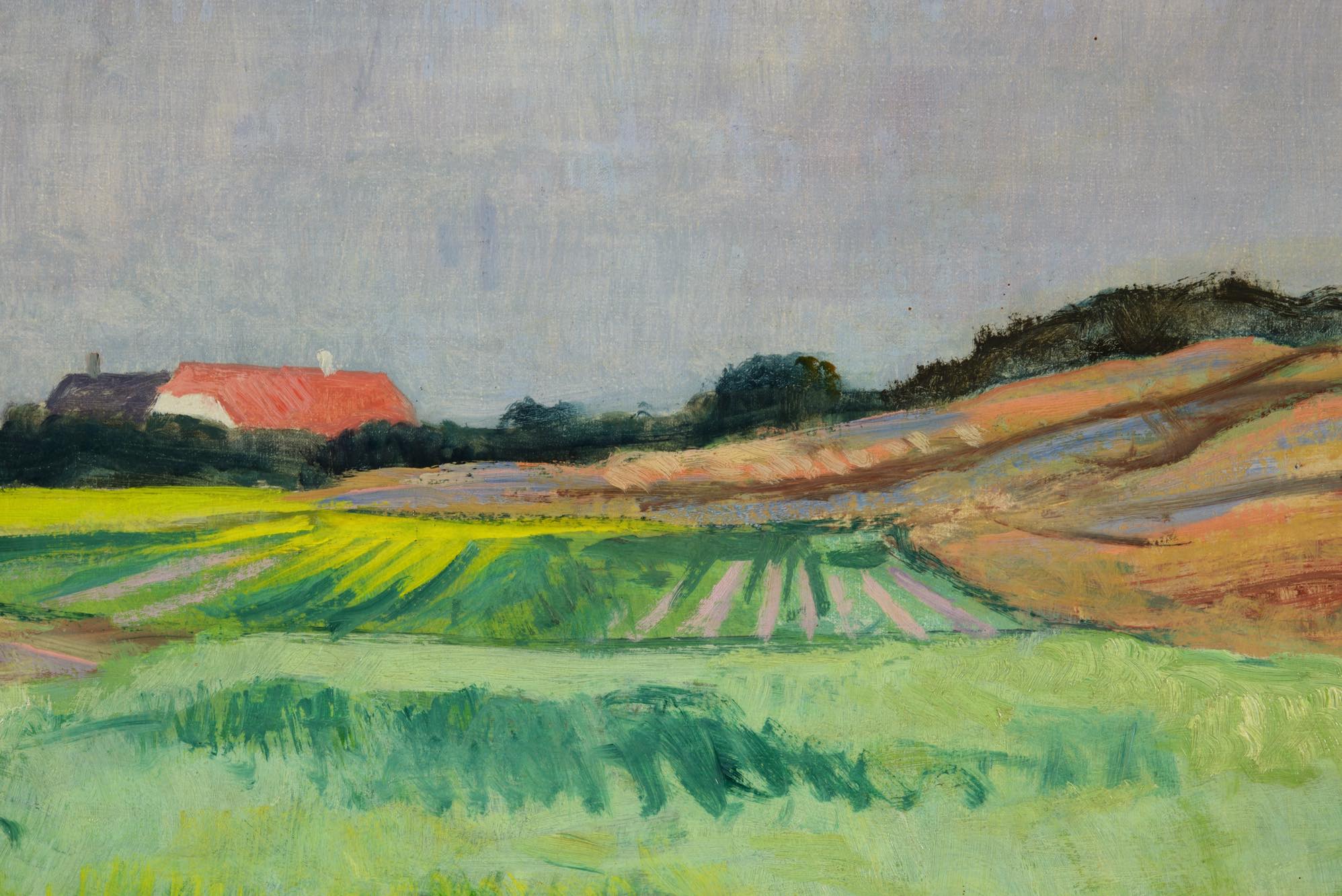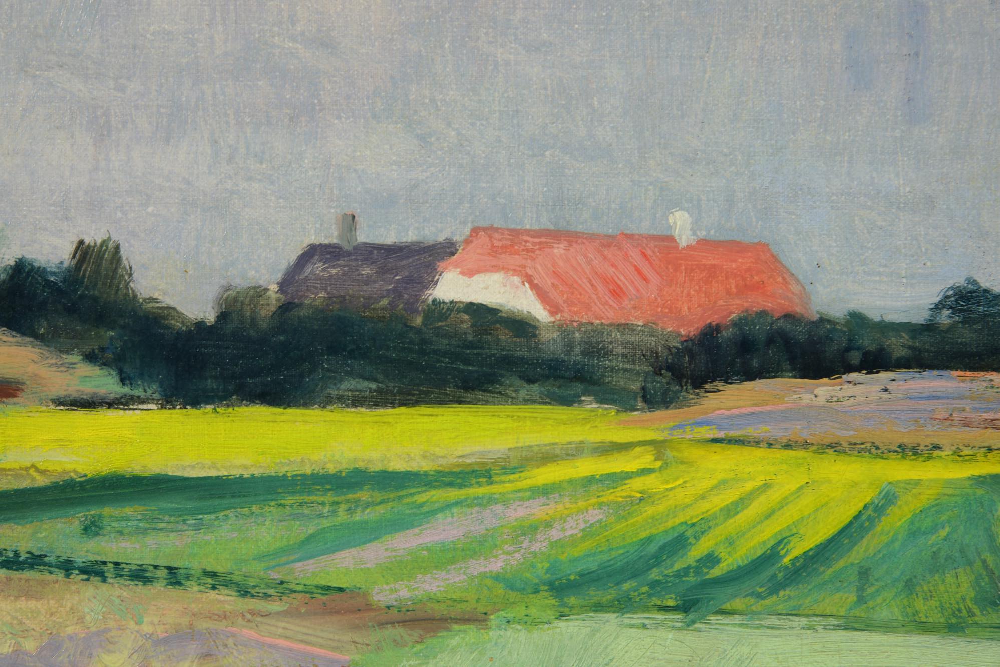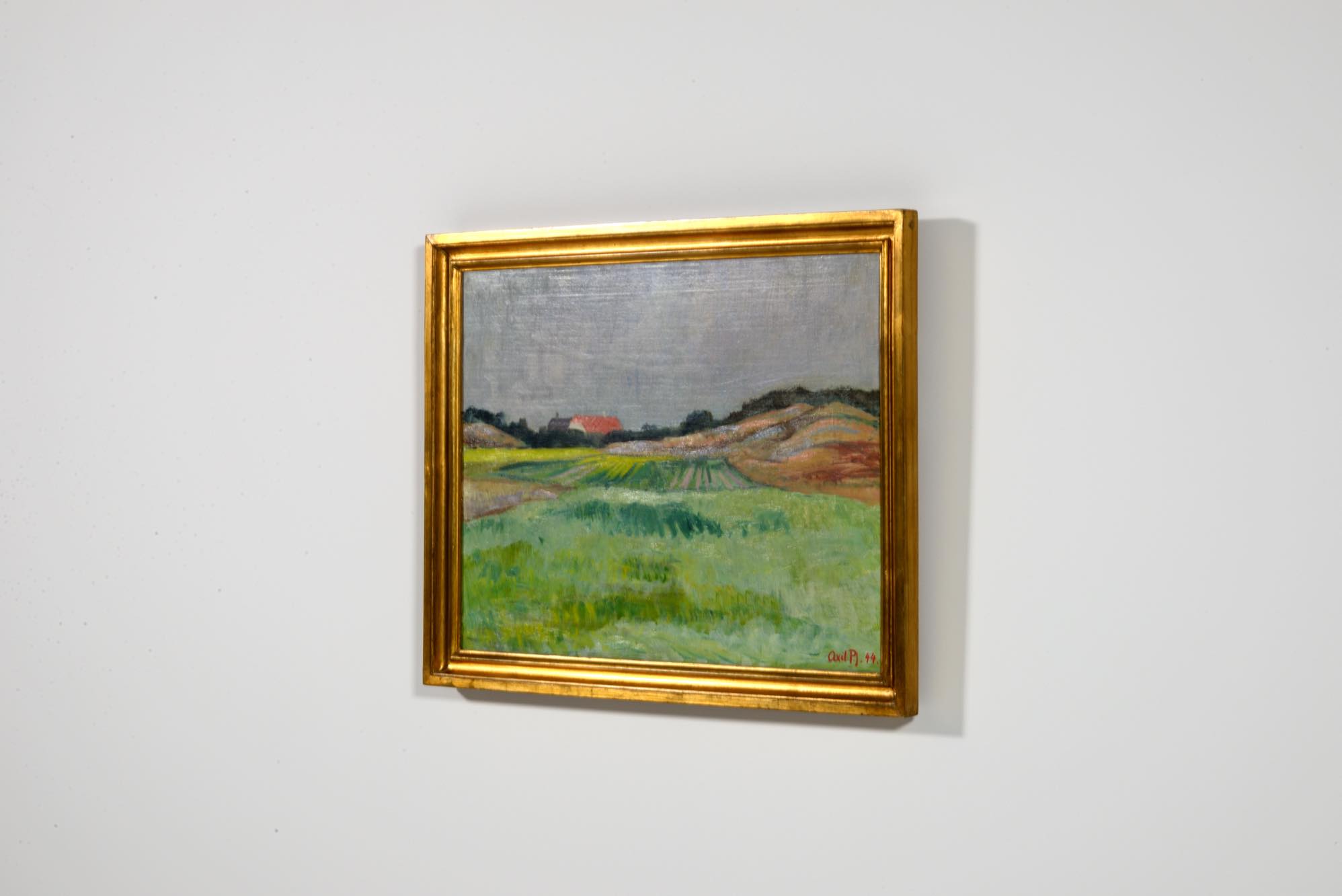 デンマークの画家、Axel Peder Jensen/アクセル・ペダー・イェンセンによる風景画油彩作品です。菜の花の咲く田園風景が独自のタッチで描かれています。金箔のフレームはオリジナルで、コンディションは良好です。原題のない作品には便宜上当店でタイトルを設定しております。