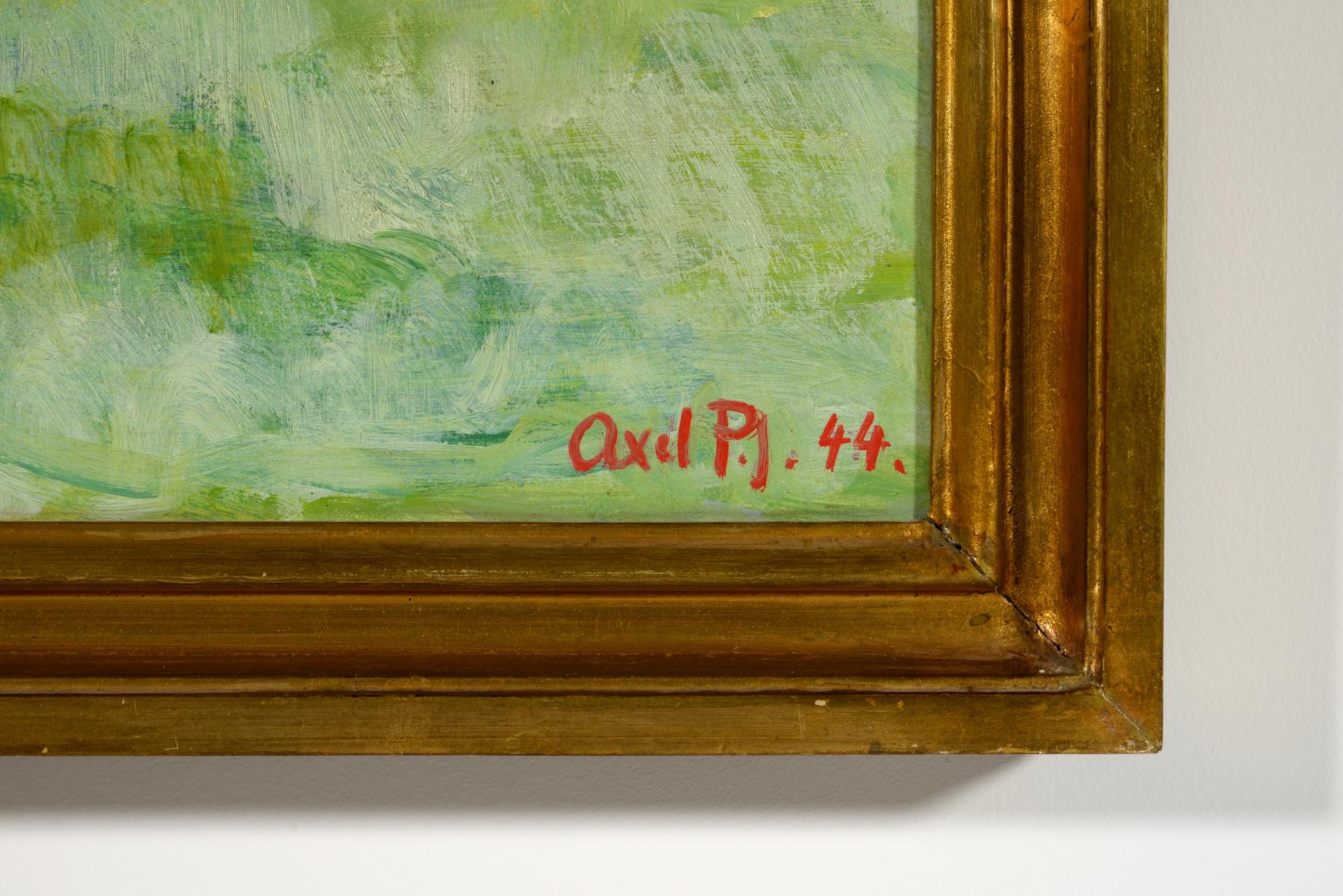 アクセル・ペダー・イェンセンは、デンマークのフュン島出身の画家で、1903年よりオールボーの技術学校にて学んだ後、1908年より巨匠ヨハン・ロードに学びます。静物画の他、季節の移り変わりやその光景、風、変わりゆく天気などを捉えた素朴な風景画を好んで描きました。