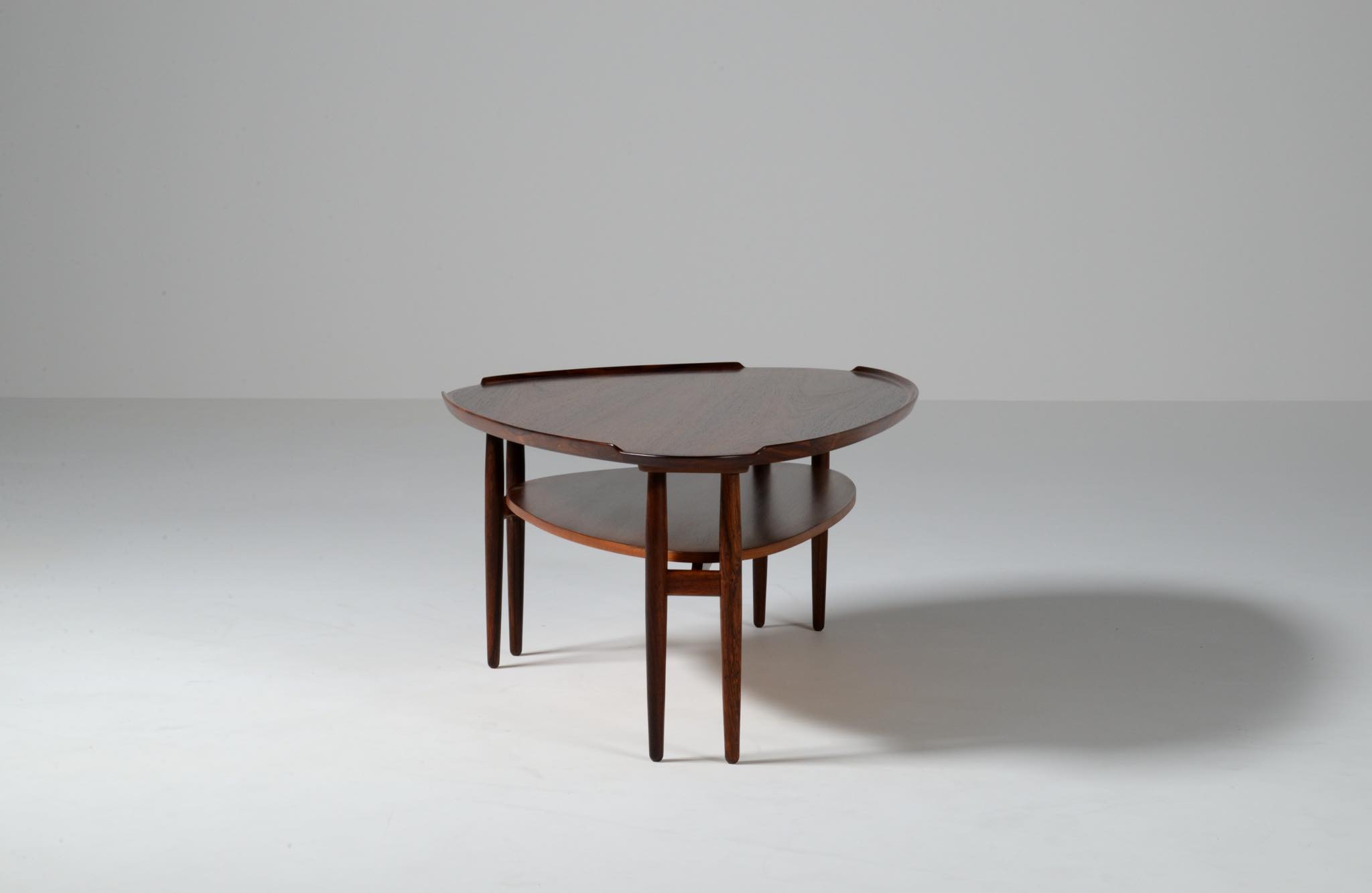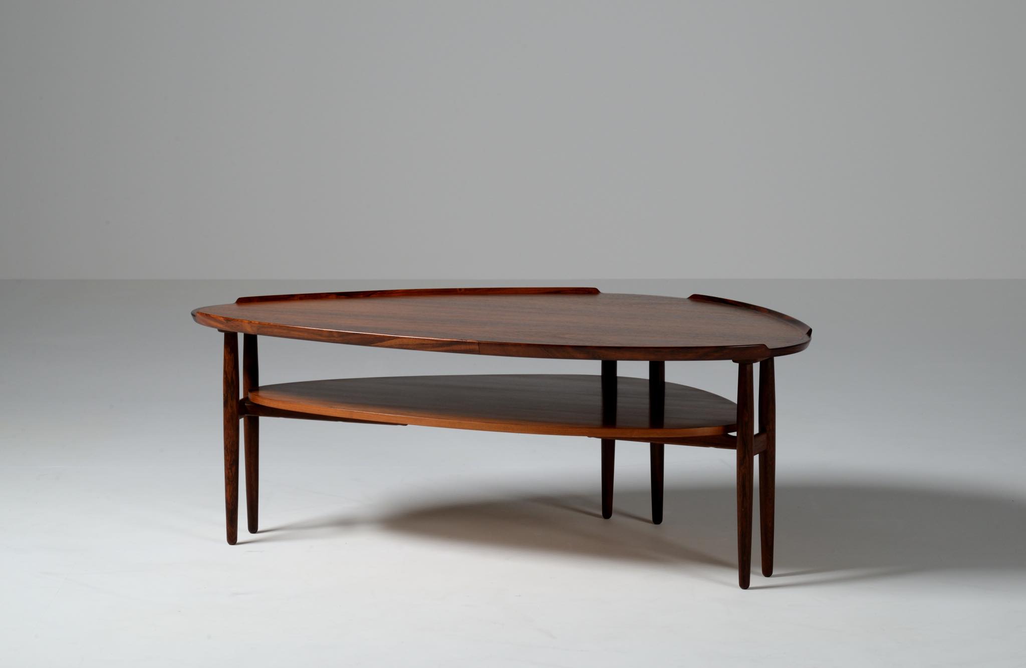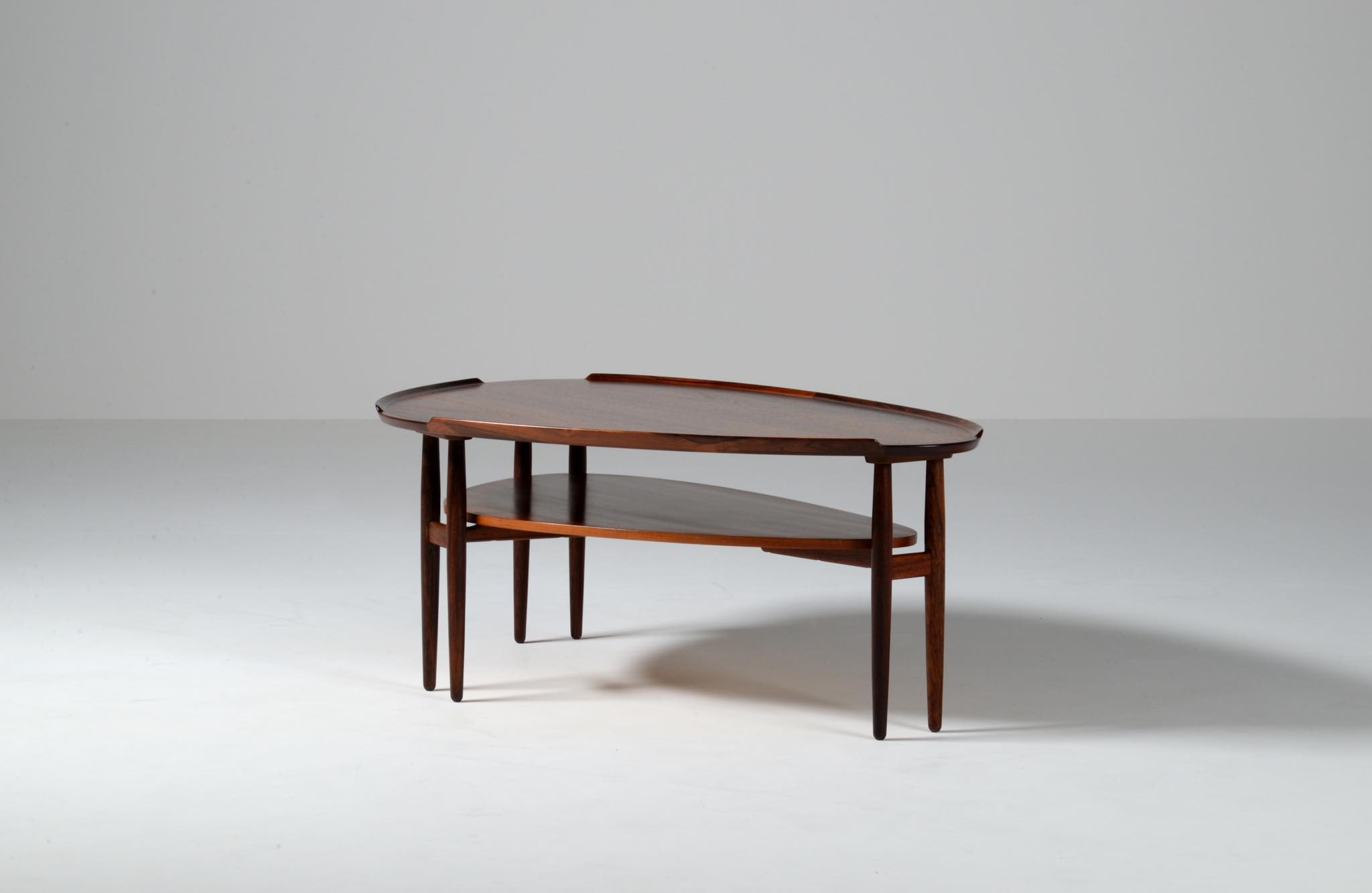 1950~60年代に活躍したデンマークを代表するデザイナー、Arne Vodder/アルネ・ヴォッダーによるコーヒーテーブルです。キドニー型の天板に6本の脚が備わった特徴的なデザインのテーブルで、良質なローズウッド材が用いられています。あまり目立ちませんが天板にタバコの焦げが見られます。目立つふたつの黒点は木目の節です。コンディションは良好です。