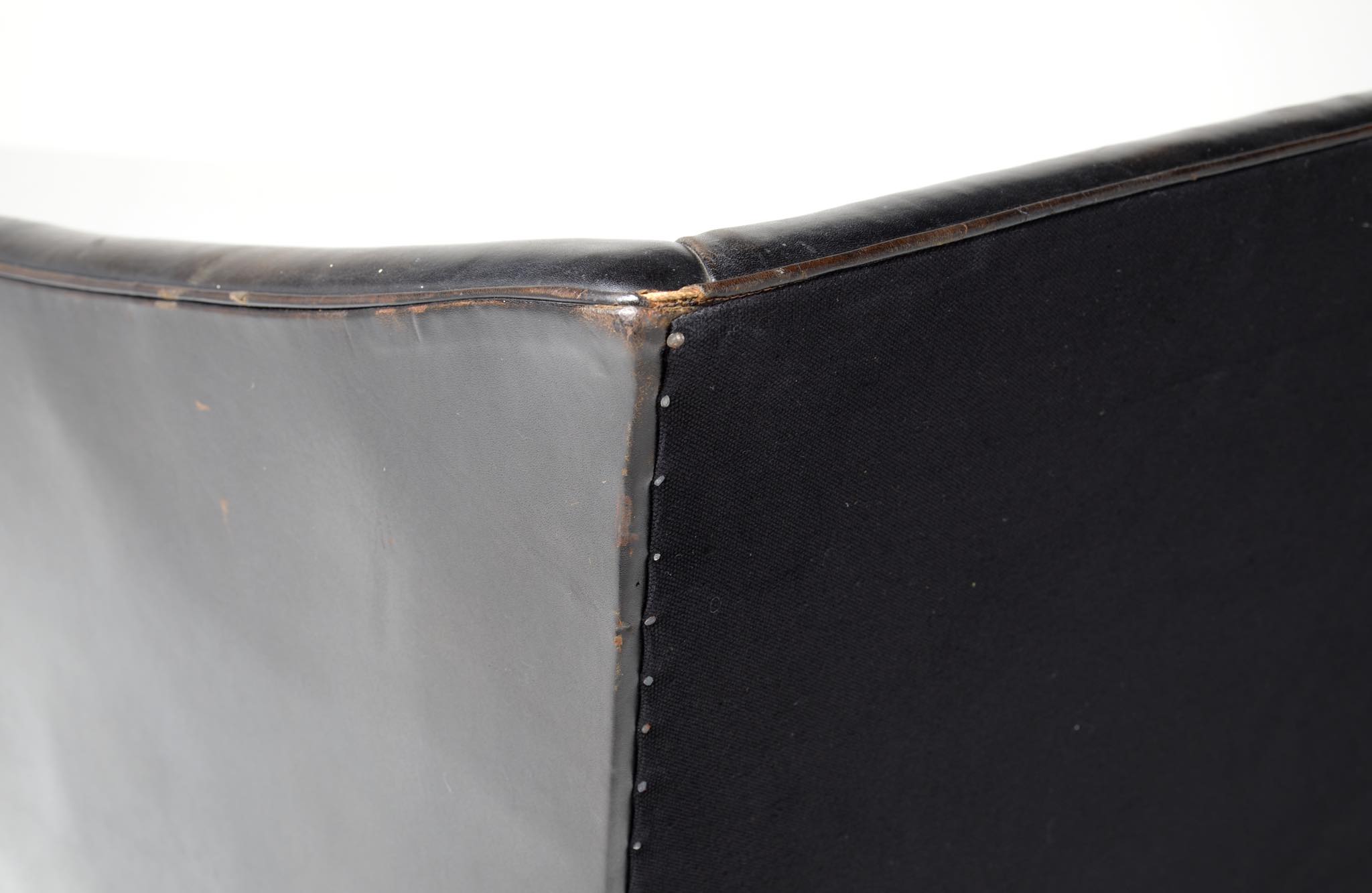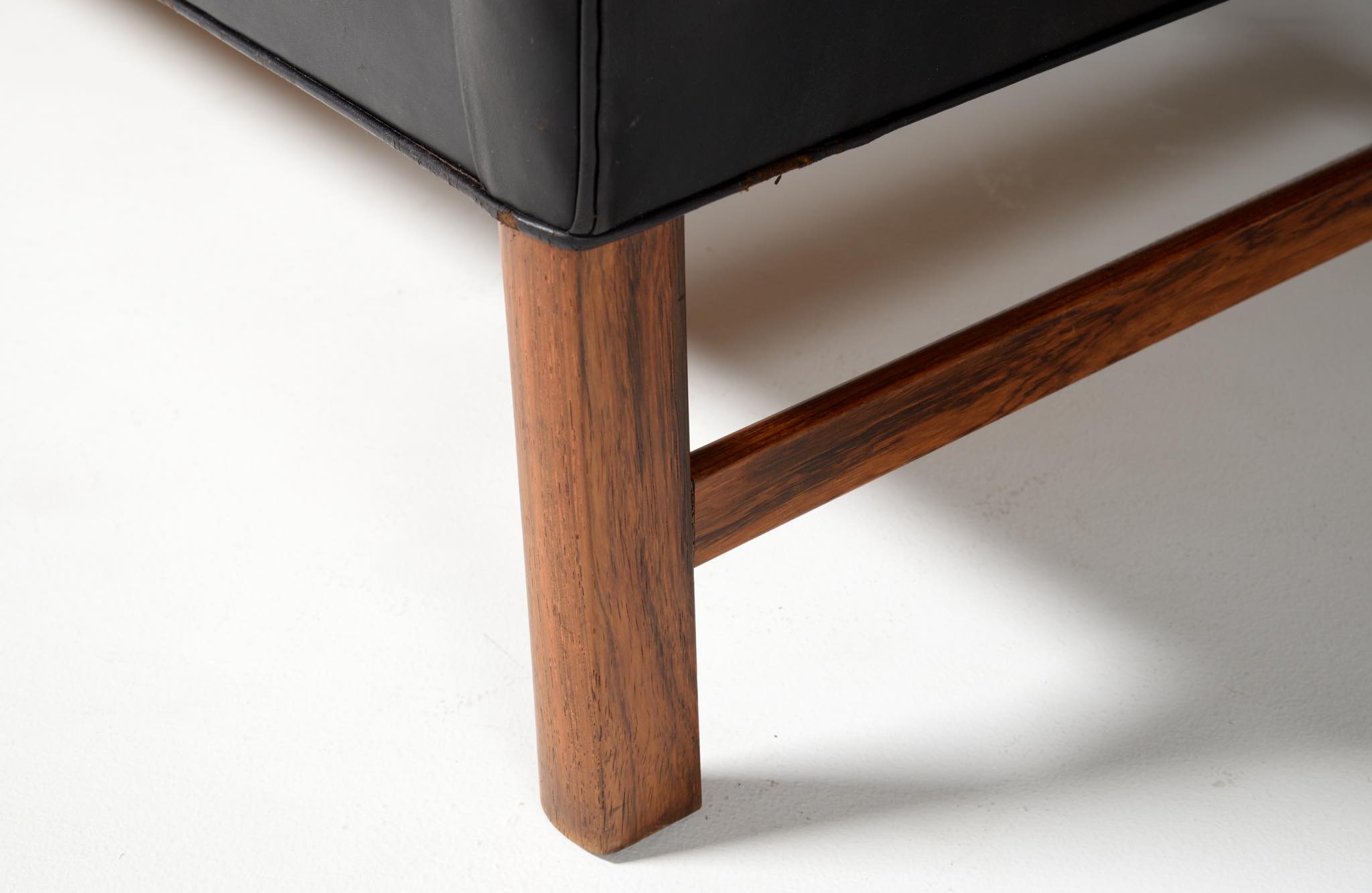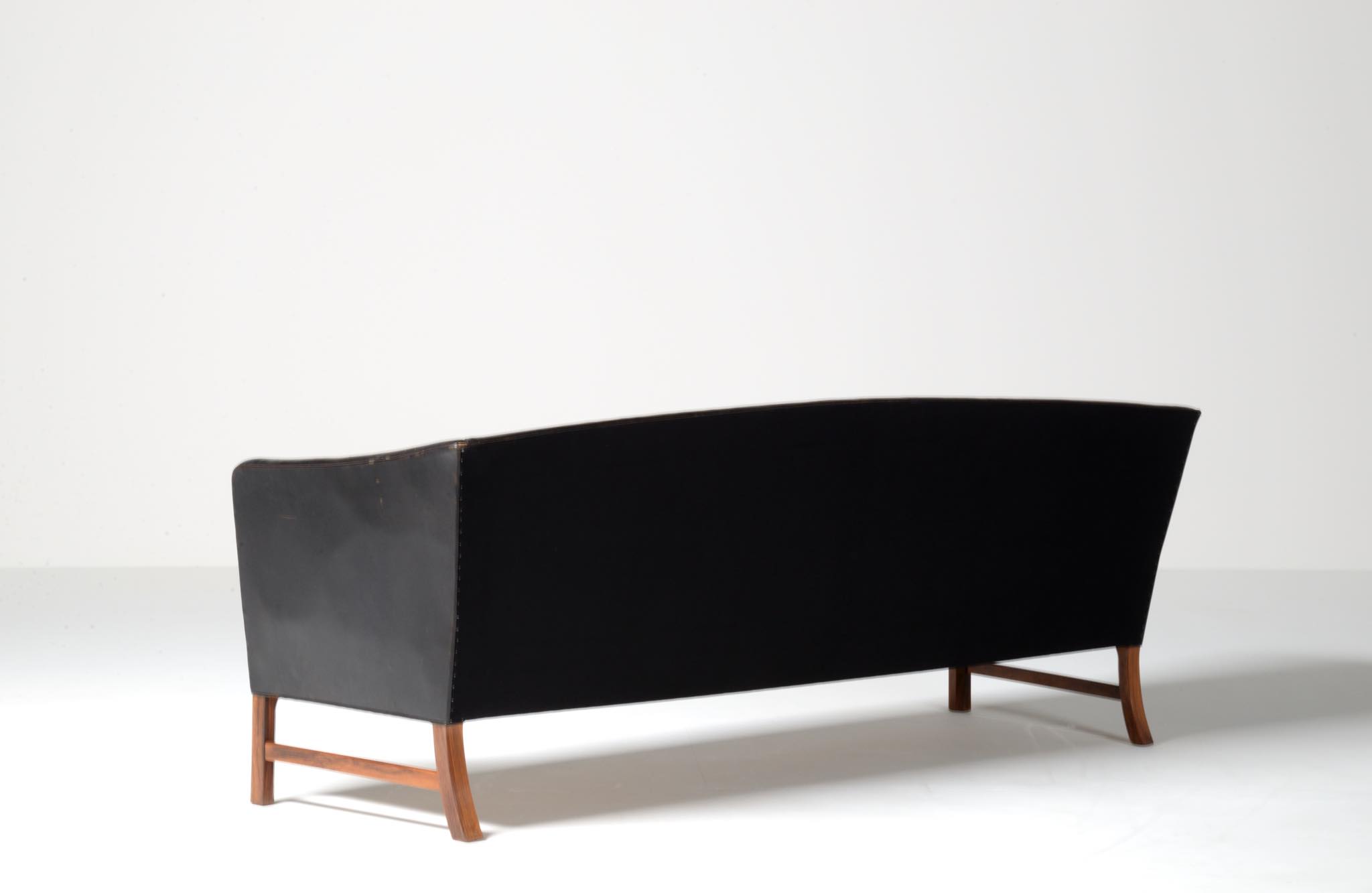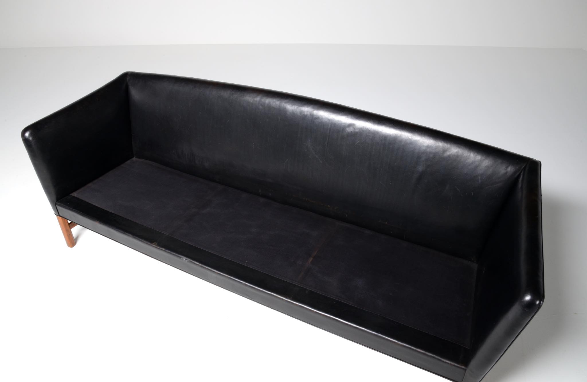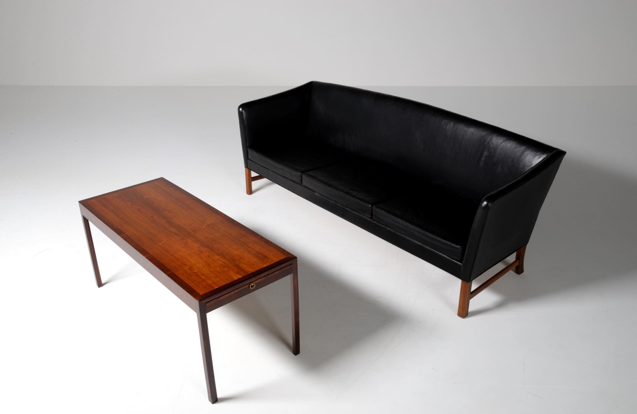 デンマークを代表する家具デザイナー、Ole Wanscher/オーレ・ヴァンシャーによるソファです。ヴァンシャーの良質なプロダクトを手がけた名工 A.J.イヴァーセン工房によって1960年代頃に作られたもので、脚にはブラジリアンローズウッド材が用いられています。シートはオリジナルのようで、使い込まれた皮革が馴染んでいます。フリースタンディング(独立設置型)ではなく背面は布張りでしたが、生地に傷みが見られたため黒の厚手のキャンバスにて張り替えました。座面の皮革に小さな破れがあります。