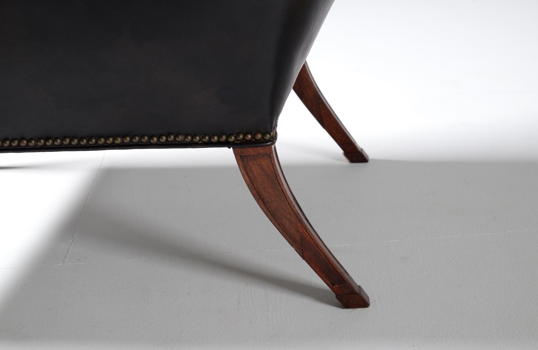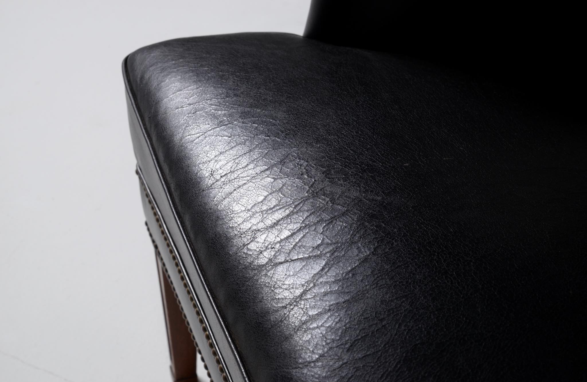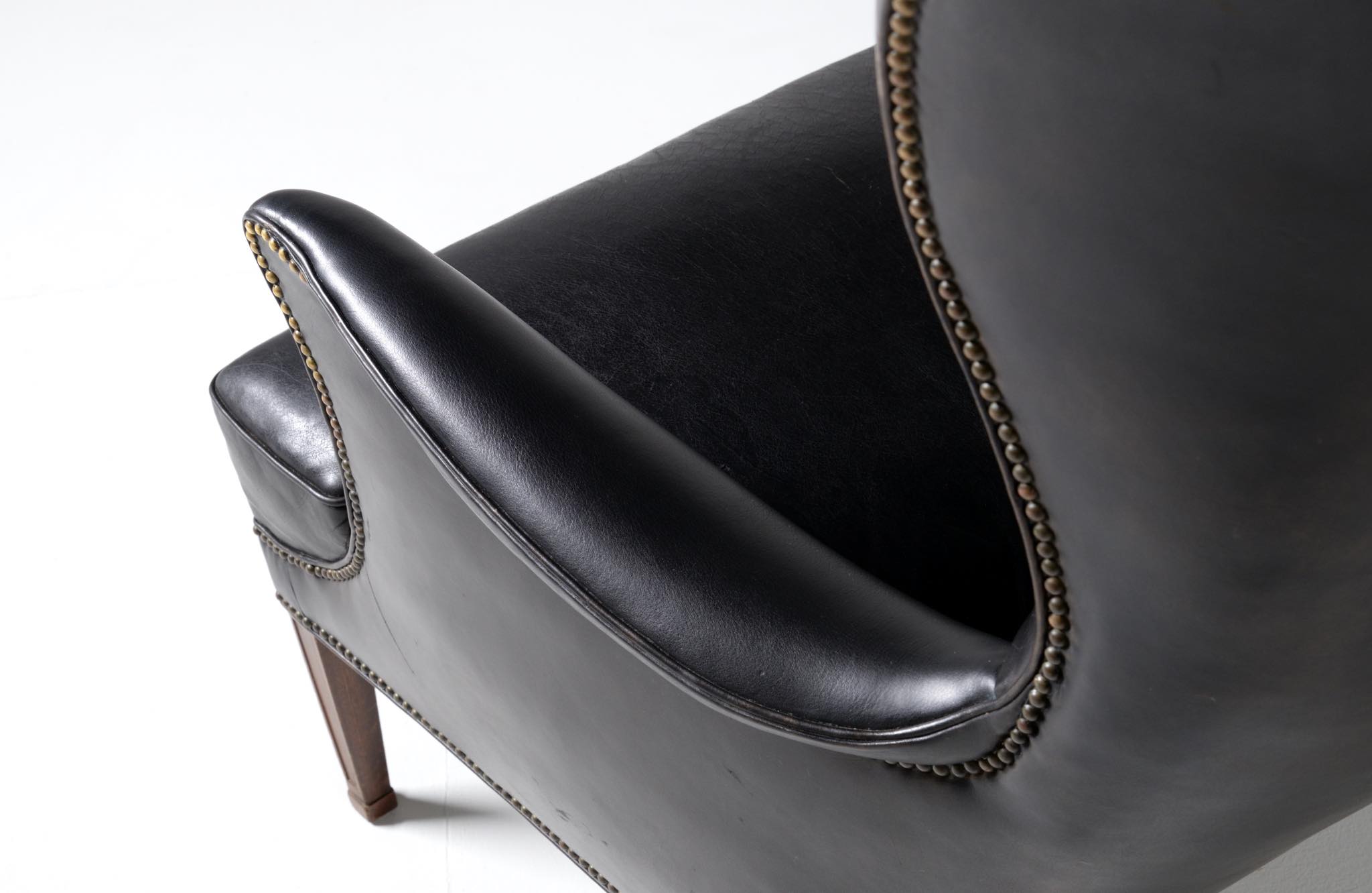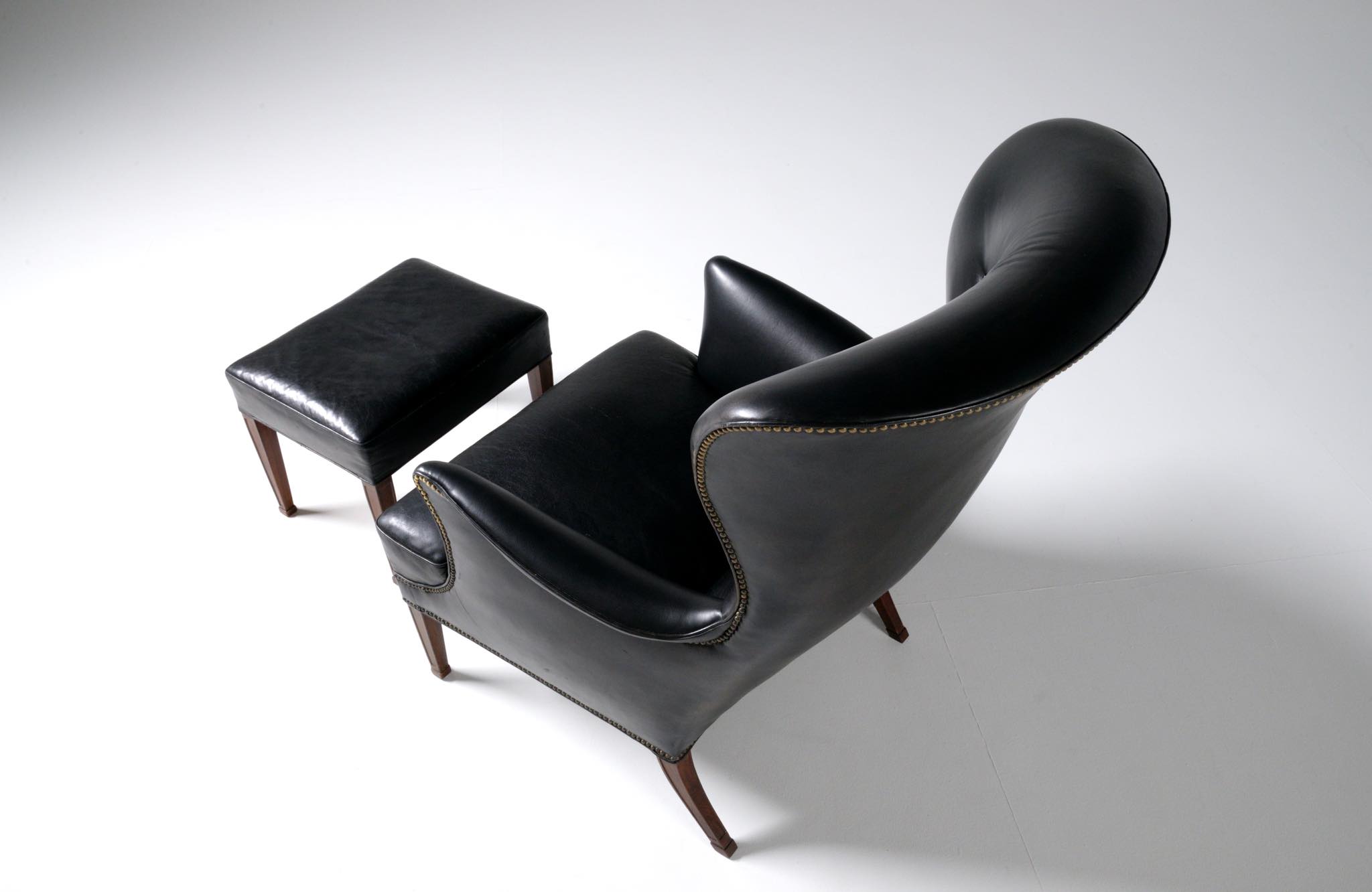 20世紀に於けるデンマーク家具デザインの礎を築いたデザイナー兼キャビネットメーカーの Frits Henningsen/フリッツ・ヘニングセンによる ”Heritage/ヘリテイジ” イージーチェアとスツールのセットです。1930年代に発表されたもので、このセットもその当時作られたものでしょう。優雅な曲線を描いたデザインが特徴的なモデルで、19世紀初頭にフランスで流行したアンピール様式がデザインコンセプトとなっています。脚はマホガニー材が用いられており、皮革は当時のオリジナルと思われます。特筆すべきダメージの無いヴィンテージコンディションとなり、古格を誇っています。