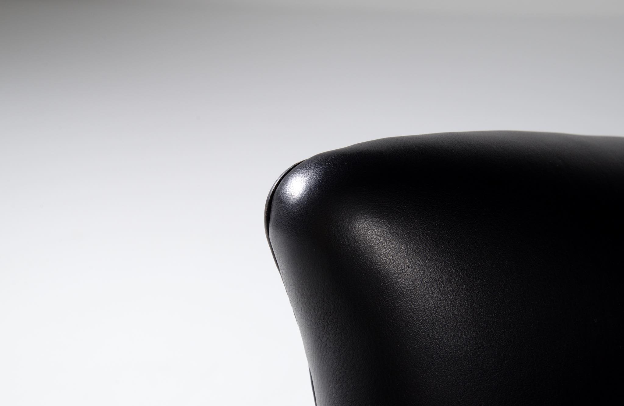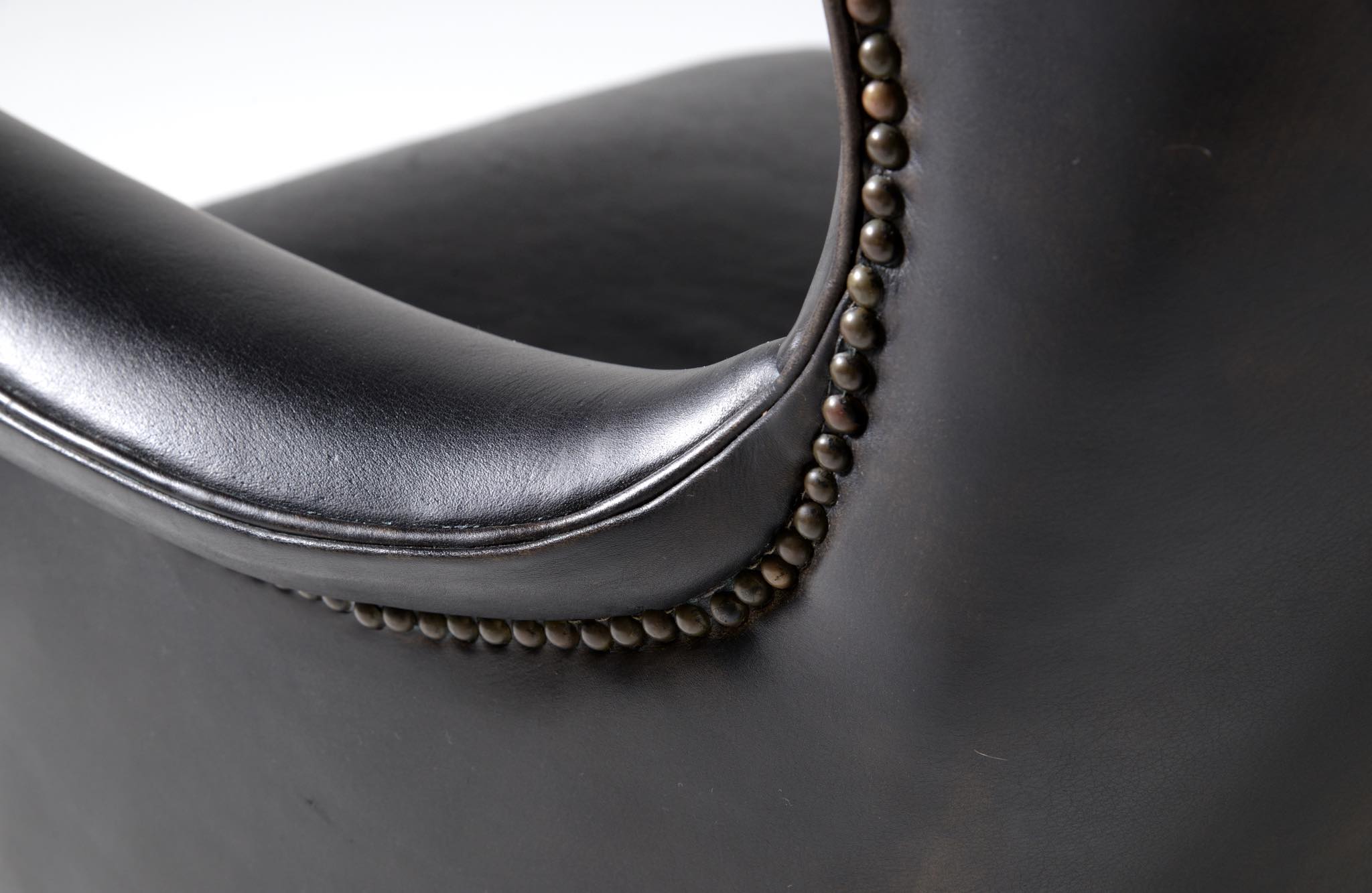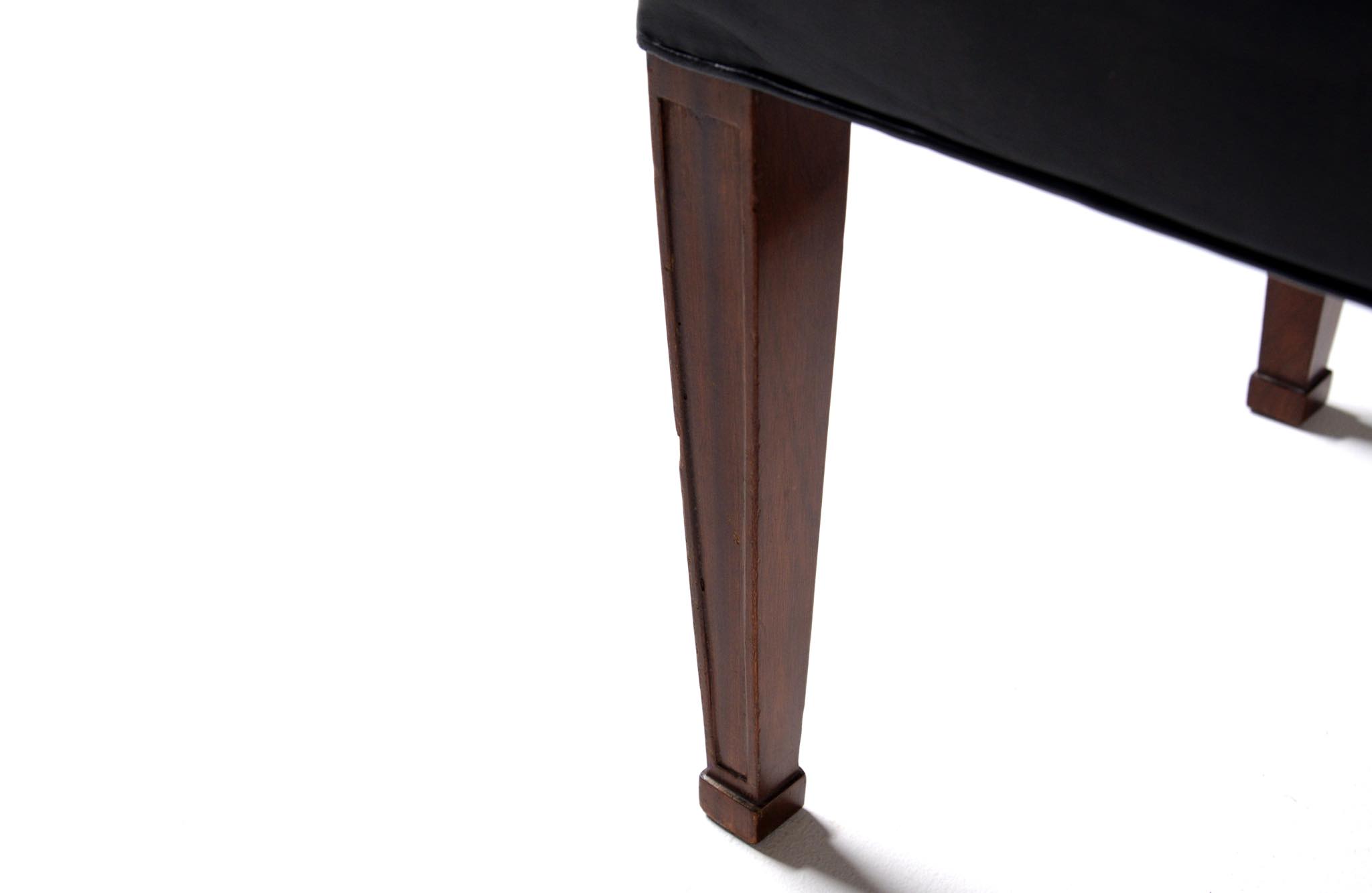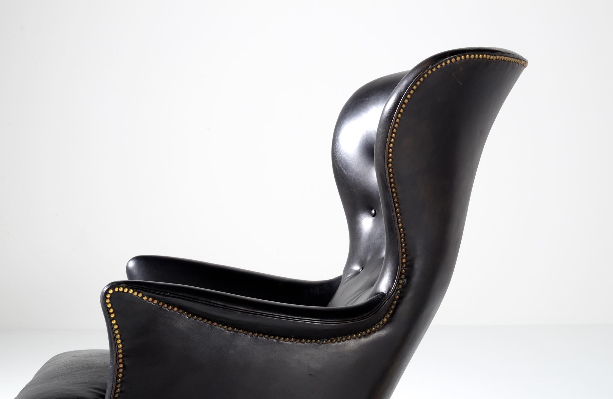 20世紀に於けるデンマーク家具デザインの礎を築いたデザイナー兼キャビネットメーカーの Frits Henningsen/フリッツ・ヘニングセンによる ”Heritage/ヘリテイジ” イージーチェアとスツールのセットです。1930年代に発表されたもので、このセットもその当時作られたものでしょう。優雅な曲線を描いたデザインが特徴的なモデルで、19世紀初頭にフランスで流行したアンピール様式がデザインコンセプトとなっています。脚はマホガニー材が用いられており、皮革は当時のオリジナルと思われます。特筆すべきダメージの無いヴィンテージコンディションとなり、古格を誇っています。