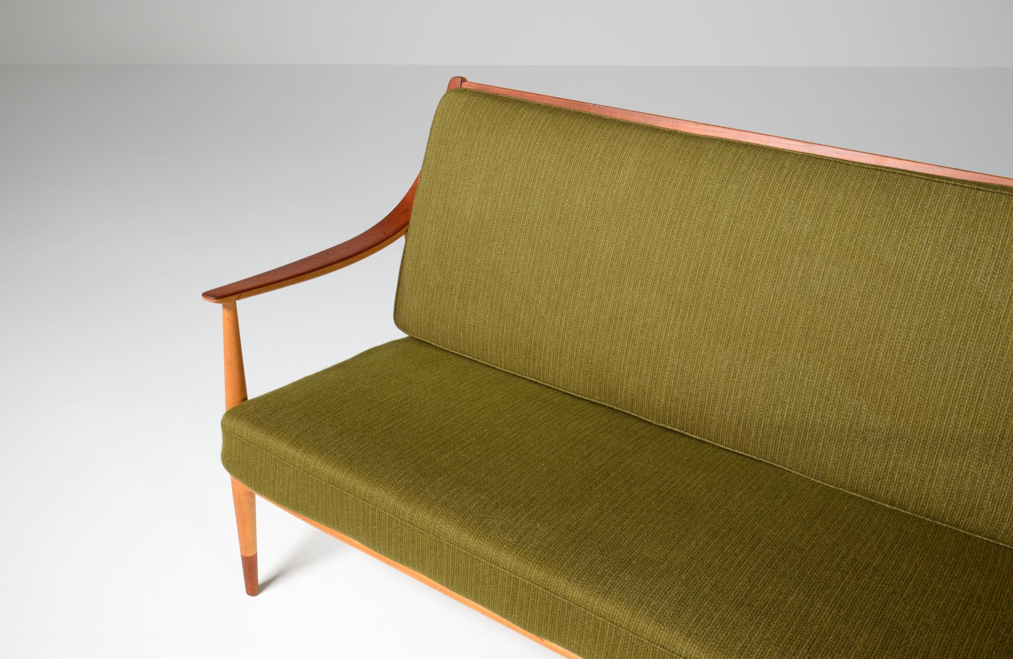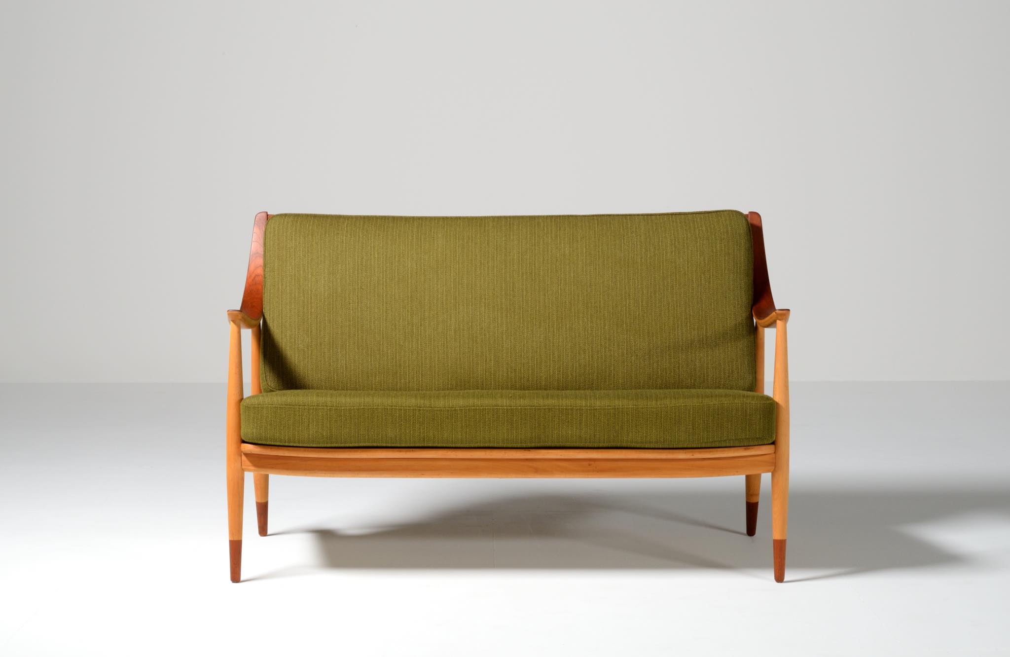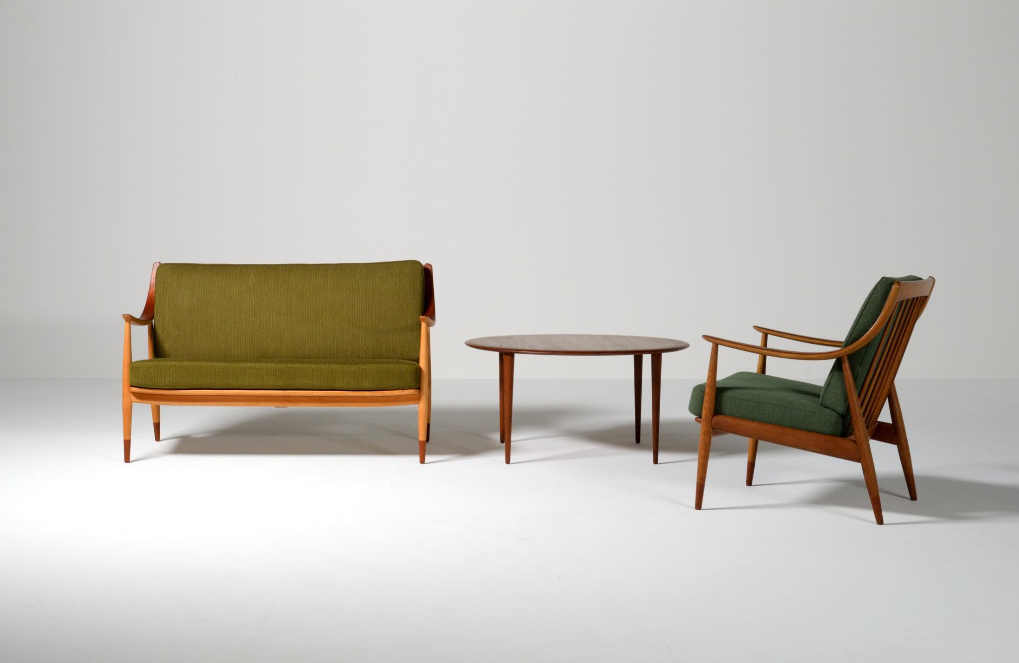 1950年代に活躍したデンマークのデザイナーユニット、Peter Hvidt/ピーター・ヴィッツとOrla Mølgaard Nielsen/オルラ・ミュルゴー・ニールセンによるセッティです。その当時に作られたものでしょう。笠木やアームの表面にチーク材が用いられており、本体はビーチ材となります。大きく弧を描いたアームレストは時代の流行を反映しています。クッション内部にスプリングが内包されており、座りやすい椅子です。コンディションにつきましては概ね良好ですが、小傷等がございますので写真下のコメントをご覧ください。ファブリックは当時のオリジナルのようで、時代感があり良い雰囲気です。専門職によるクリーニングを施しましたが、張り替えも可能ですのでご相談ください。