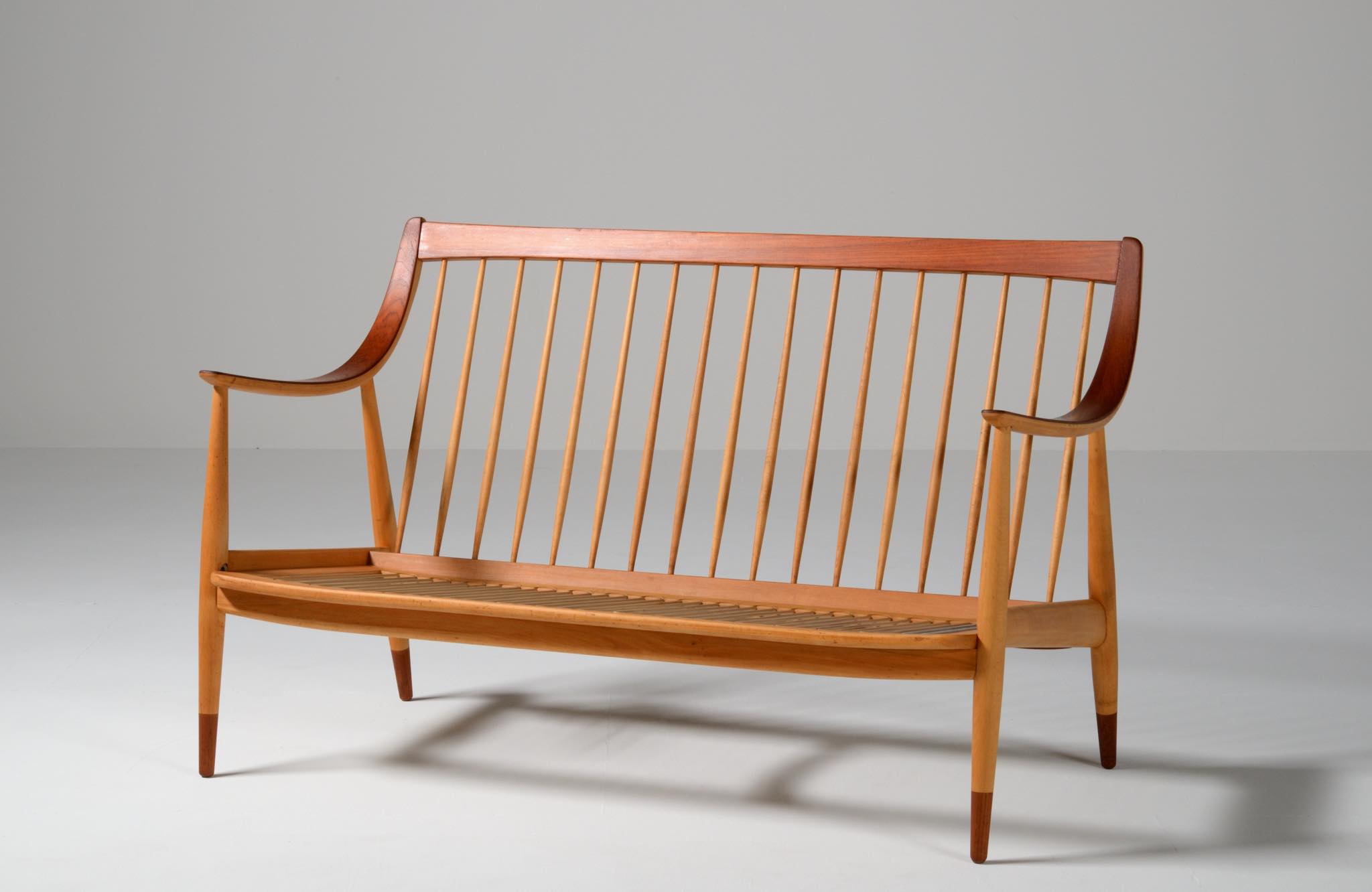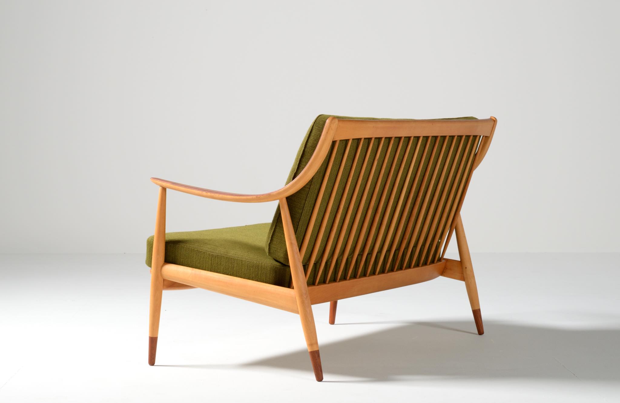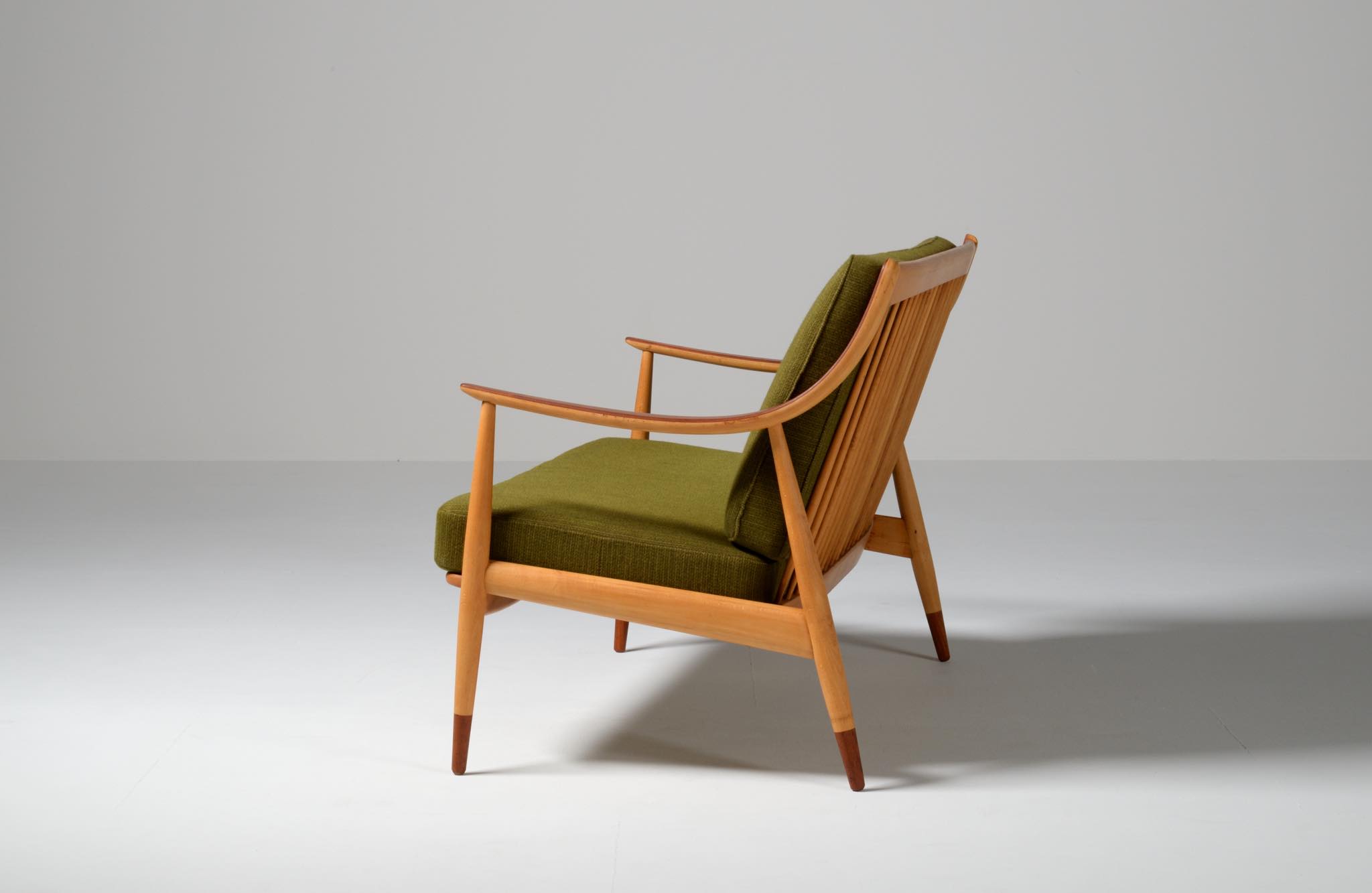 新鋭デザイナーの Peter Hvidt(1916-1986)と、熟練デザイナー兼設計士の Orla Mølgaard-Nielsen(1907-1993)は、互いの長所を生かした協力関係を築き、1944年に設計事務所を設立しました。1947年、後に主要なアイコンとなる「AX」チェア(Fritz Hansen製)を発表。この椅子は、当時としてはデンマーク初の「積層合板」を採用し、量産化の第一歩を踏み出したモデルです。 一方で、彼らは突き板を用いることが主流の1950~60年代に、あえて「無垢材」を用いた家具設計も行い、高級家具からコントラクト製品まで手がけ、国内外の需要を獲得しました。彼らによる家具デザインは総数256品目にも及ぶとされています。